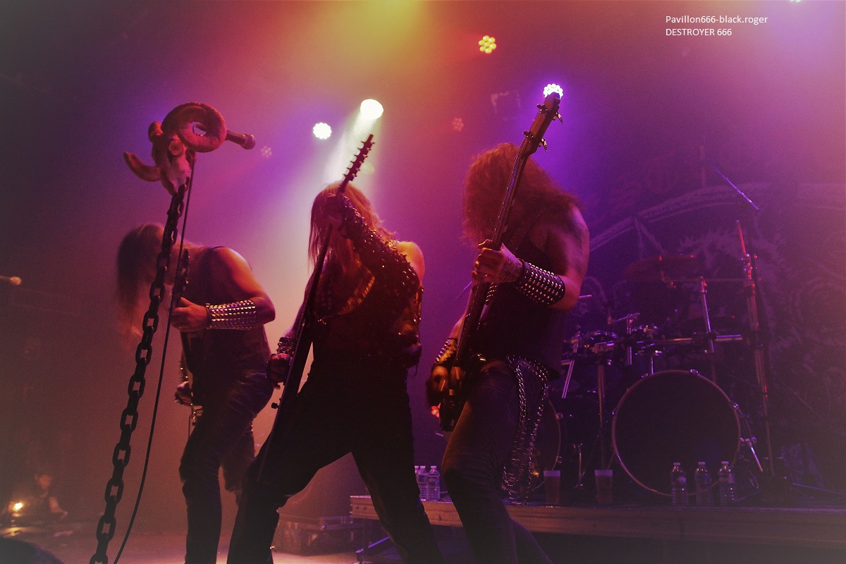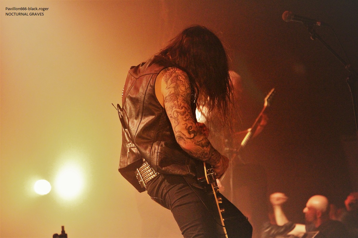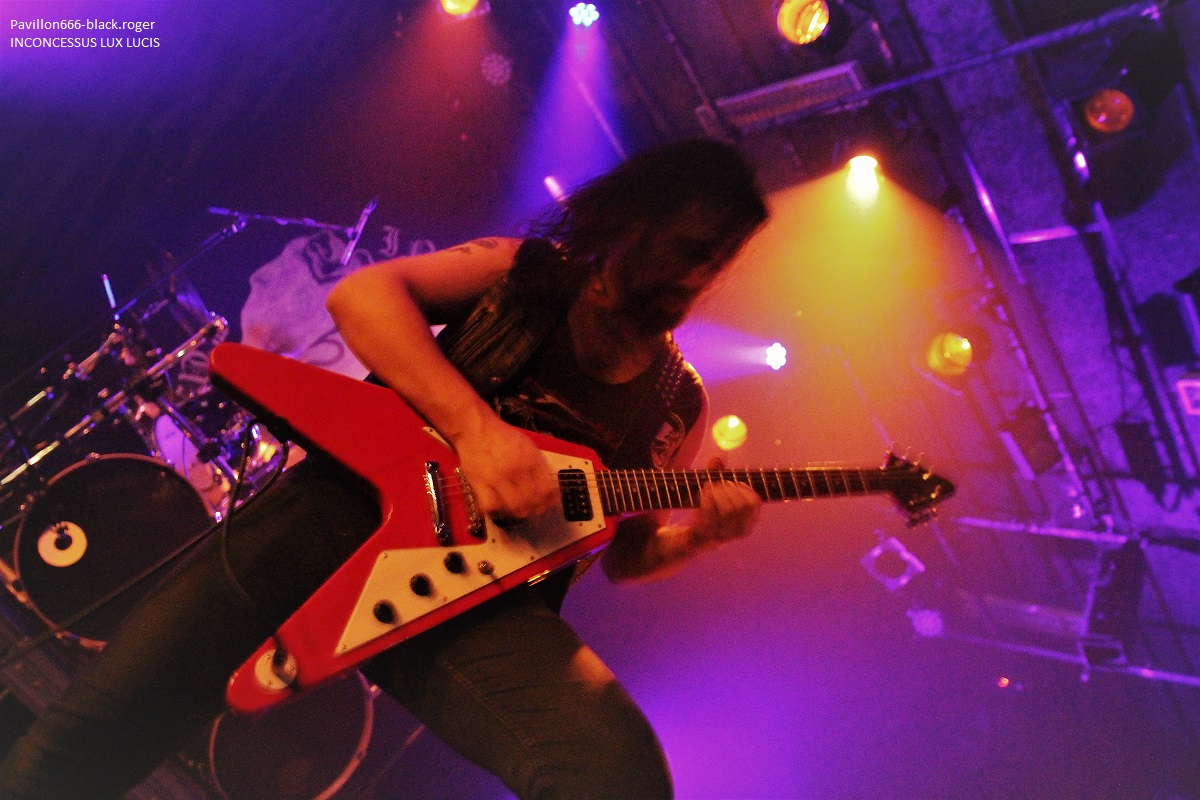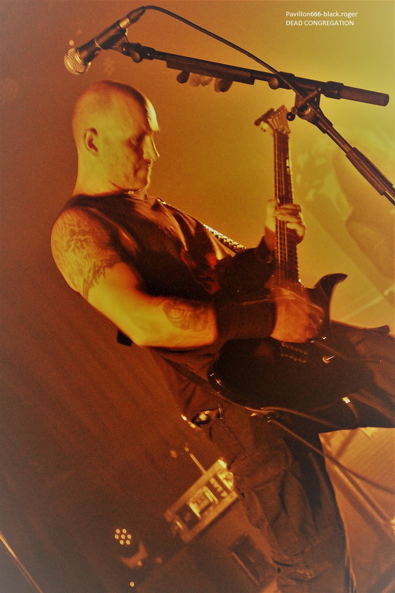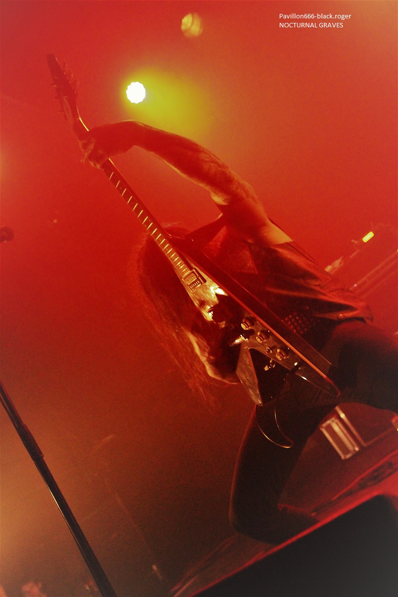 Les concerts au CCO démarrant tôt en général, timing serré oblige, c’est donc à 19 heures 15 que le trio british INCONCESSUS LUX LUCIS lance les hostilités. Au menu du black/thrash à la Venom (oups !) avec une pointe de fucking rock n’roll sauvage à la Motörhead cela ne s’invente pas ! Formé en 2006 ce groupe possède trois albums et semble avoir une maîtrise de la scène acquise de longue date rien qu’à voir la démonstration en live de leurs compositions. Comme dit plus haut, avec ces Anglais le black est sauvage, bien dans la lignée des groupes de la « perfide Albion » tout simplement. Nous en prenons donc plein la « g…le », mais au final on arrive quand même à se lasser au bout d’un moment car trop souvent leurs titres se suivent…et se ressemblent nous offrant donc une certaine linéarité lassante, voilà c’est dit, la suite SVP ! La suite se nomme NOCTURNAL GRAVES et là nous allons vraiment déguster dans tous les sens du terme avec leur death/thrash/black « holocaust » de haute volée, aargh ! Comme ses compatriotes de Destroyer 666, Nocturnal Graves ne fait pas dans la dentelle depuis trois albums dont le fameux « from the bloodline of cain » qui avait mis tous les « potets » dans le rouge et réalisé dans une certaine urgence à tout détruire. Depuis, le groupe a un peu « levé le pied » mais si quelques mid-tempos sont introduit c’est pour mieux faire passer la pilule d’une hargne bien perceptible en live. Comme ce soir à Lyon où le public a largement apprécié et même plus encore. Avec les Grecs de DEAD CONGREGATION nous allons vraiment rentrer dans une musique de cimetière, lourde, pesante, aux ambiances morbides affichés, du death-metal pur jus de cercueil pourrait-on dire. Mais si les chevaux métalliques tirant le corbillard avancent à pas lents, ils ne renient pas cependant à s’emballer et échapper au contrôle de l’équipage dans des vitesses brutes de décoffrage faisant hurler les instruments qui soutiennent une voix morbide et blasphématoire. Bref, Dead Congregation porte haut et fort depuis quinze ans la couleur noire du pur death- metal qui lui va si bien. Les puristes ont donc apprécié ce soir, quant aux autres… On ne présente plus DESTROYER 666 qui depuis 25 ans maintenant et 6 enregistrements vient régulièrement détruire ce qu’il nous reste de neurones. Les Australiens sont toujours aussi furieux en live inutile de résister nous allons apprécier à sa juste valeur ce black-thrash peut-être un tantinet vintage mais qui s’enorgueillit de rester fidèle à cette « furiosité » old-school qui nous avait explosé la cervelle dans les 80’s. Ici les riffs sont propulsés à tirs rendus ne laissant que peu de passage aux soli malsains et vénéneux. Bien entendu leur thrash sans limite prend des allures occultes et morbides pour ce côté black sous-jacent. Alors destroyer 666 détruit tout sur son passage (pléonasme !) et la puissance de feu est incommensurable faisant sortir le public de ses « gonds » pour des exploits physiques sauvages cela va de soi. Et ce dès les premiers envois comme « Wildfire », « breed apart », « call of the wild », « traitor » » et « wargod », qui nous collent contre les murs. Une petite heure de violence jouissive et puis s’en vont. Dommage, nous en aurions bien repris une louche de cette sauce piquante distillée dans nos « cages à miel » ce soir, mais bon ! Alors à une autre fois, groupe vu en live « x » fois en ce qui me concerne, mais toujours au top niveau d’une brutalité incontrôlée. Bravo à cette formation fidèle à elle-même et insensible aux sirènes de la modernité pour notre plus grand plaisir de « défonce » musicale d’une efficacité redoutable. Merci Sounds Like Hell productions pour cette soirée métallique en diable qui a fait du bien à nous métalleux extrêmes invétérés. Merci bien entendu aux 4 formations en lice, et merci au public pour l’ambiance instaurée. |