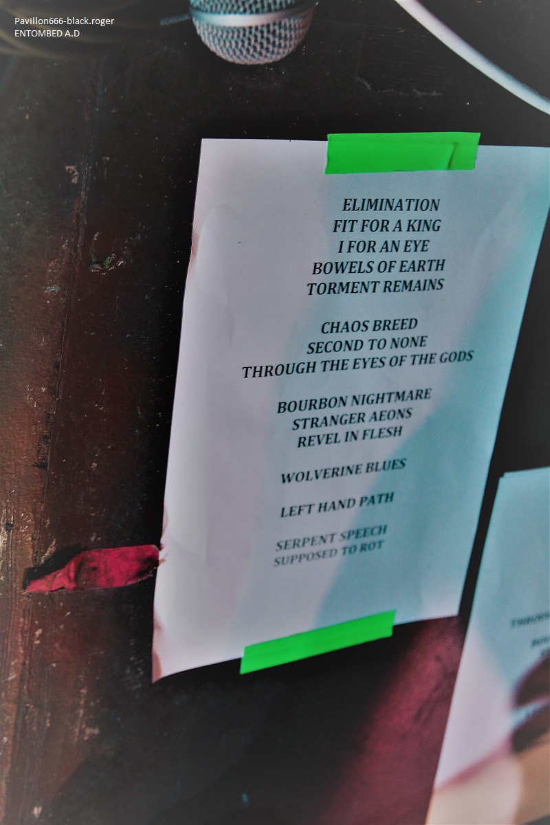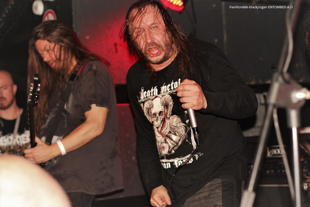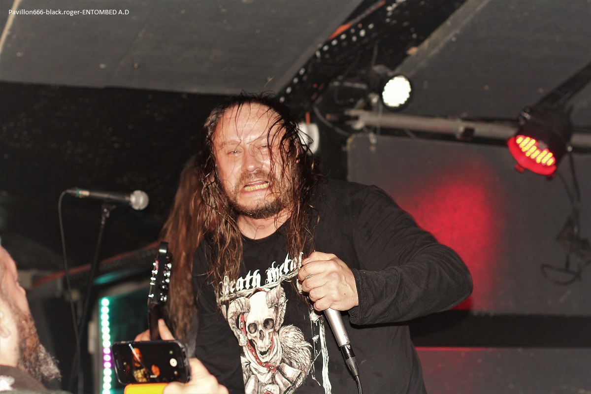 A peine le temps d’avaler une « overkill » maison, qu’il me faut aller devant la scène où viennent de lancer le son les jeunes Danois de BAEST, il est 19heures 20 et ça démarre fort. Leur death/thrash influencé par notamment Entombed (ça ne s’invente pas) et autre Bloodbath, va nous mettre illico dans l’ambiance mortelle de la soirée. D’autant plus qu’en live cette formation ne manque pas d’humour, sait tenir la scène avec notamment un frontman allant « chatouiller » le public et un guitariste faisant le spectacle non-stop. Mais leurs compositions restent quand même violentes et « groovy » ne négligeant pas des aventures plus modernes, leur death n’étant pa, figé dans le temps. Ce soir ils défendent leur nouveau méfait (le second) intitulé « venenum » qui nous démontre qu’au Danemark on peut être sauvages, menaçants et vicieux dans le domaine du metal extrême. Alors ce soir leur démonstration fut concluante et nous avons aimé leur set implacable dans ce style qui leur va si bien. Quelques « déménagements » de scène plus tard, le décorum sanguinolent installé nous informe que nos Belges préférés ABORTED vont nous faire rentrer dans leur « archaïc abattoir » (sic). Svencho a la frite ce soir (facile celle-là !) et les autres musiciens du groupe aussi cela va de soi. Depuis 1995 (et 10 albums) ces maitres du death/gore/grind/hardcore nous inondent la matière grise à l’aide de « chairs » musicales en putréfaction. Swencho arpente de long en large la scène nous faisant profiter de toute une gamme de « growls » de cimetière, les guitaristes nous font profiter, eux, de riffs « lame de rasoir » », le bassiste fait gronder les grosses cordes de son instrument et le batteur est carrément épileptique, aargh ! Bon, vous allez me dire leur death-metal bien gras sonne assez classique, mais en y ajoutant de subtiles variations venues des chambres froides de la morgue, leur metal extrême « gorisant » prend tout de suite une autre tournure en nous rendant « accros » à leurs compositions qui varient les plaisirs putrides. Bref, dans l’assistance les cercueils s’entrechoquent, pardon les participants s’agitent à qui mieux-mieux, comment résister aux envois puissants qui vous tombent dessus (comme la vérole sur le bas clergé), vous ne voyez pas le rapport, moi non plus mais comment traduire ce qui se passe lors d’un concert donné par Aborted ? En tous cas ce soir nous avons dégusté dans tous les sens du terme comme je le dis assez souvent lorsque le show est brulant, ce qui fus le cas dans un Rock n’Eat en sueur et chaleur évidemment. Set-list en photo. En attendant l’installation du groupe suivant, je me remémorai la première fois où j’ai pu participer à un concert d’ENTOMBED, c’était en 1994 au Rail Théâtre de Lyon, et leur set m’avait fortement marqué l’esprit. Je pense donc à beaucoup d’autres participants qui ce soir sont « collés » contre la scène attendant l’arrivée sur les planches, là devant nous des Suédois pères d’un certain death puissant devenu par la suite plutôt death n’roll. Pour la petite histoire, Entombed est devenu Entombed A.D à la suite de tracasserie administrative à propos du nom de groupe. Et ce soir, il ne reste que L.G. Petrov et Olle Dahlstedt du « feu » Entombed des débuts. Un LG Petrov au regard malicieux qui va transcender le show avec ses « jeunes » musiciens et acolytes (je n’ai pas dit alcooliques !). Le troisième album enregistré sous le vocable Entombe A.D, intitulé « bowels of earth » nous démontre que la formation n’a rien perdu de son accroche c’est un fait avec toujours ce « son » Entombed reconnaissable entre mille. Ce soir nous aurons droits a des titres de ce nouvel opus qui a poussé encore une fois le groupe à reprendre la route pour une tournée appelée « Hell over Europe III ». Mais beaucoup de fans présents ici ce soir attendaient aussi des titres légendaires d’Entombed, alors « left and path » et « volverine blues » ont été lâchés en pâture au public évidemment, ambiance ! Cette ambiance, parlons-en, inutile de vous faire un dessin, ce fus pure folie dans le pit avec une assistance complètement déchainée du début jusqu’à la fin du show pour ce concert qui restera gravé dans nos mémoires et pour longtemps, incroyable et énorme tout simplement, un concert coup de cœur, un concert d’anthologie, vous m’avez compris ! Set-list en photo. Que rajouter de plus en guise de conclusion ? Rien tout simplement, à part les remerciements habituels aux groupes, au RNE et au public pour l’ambiance bien entendu. |