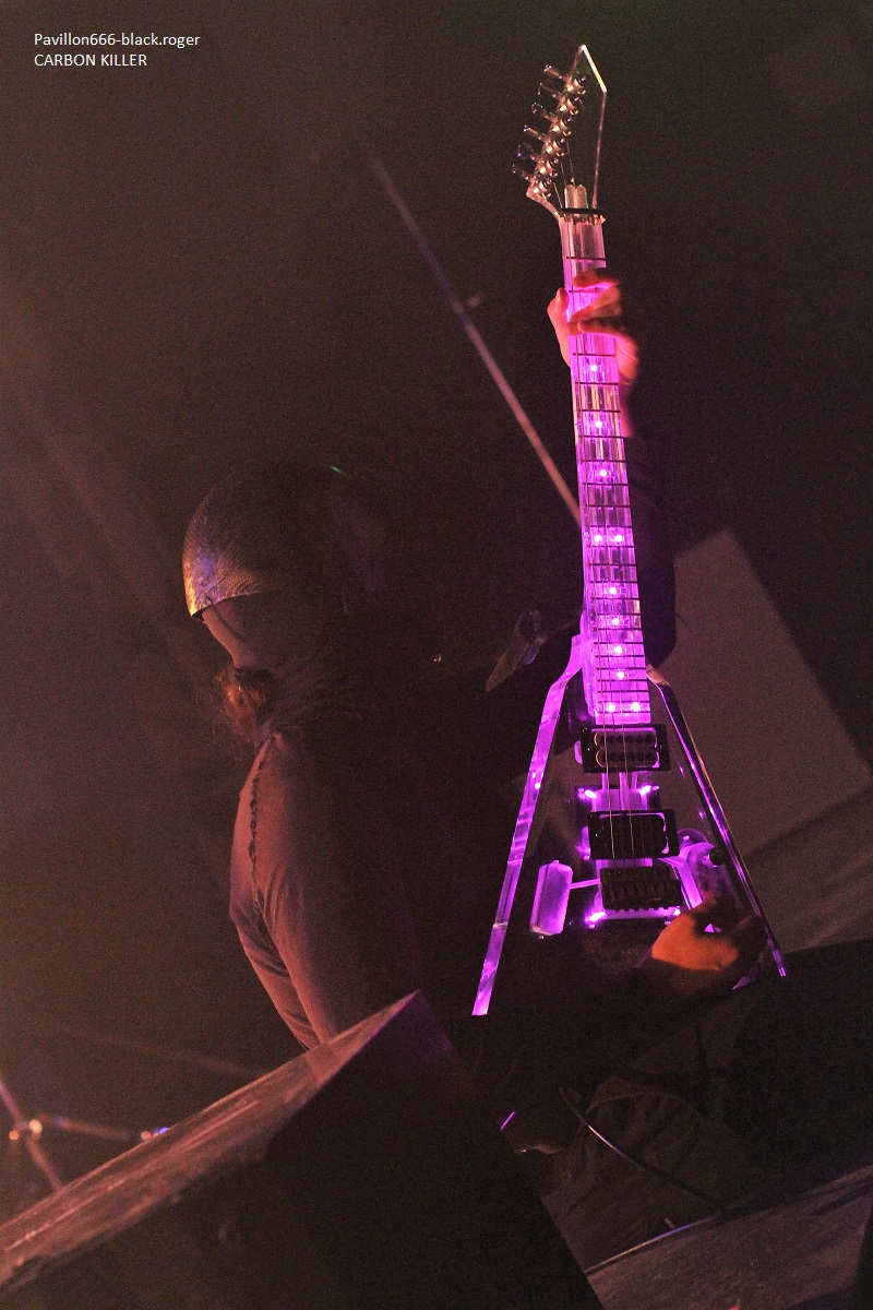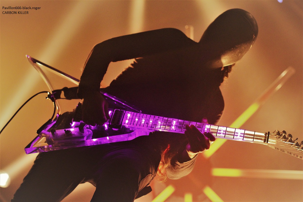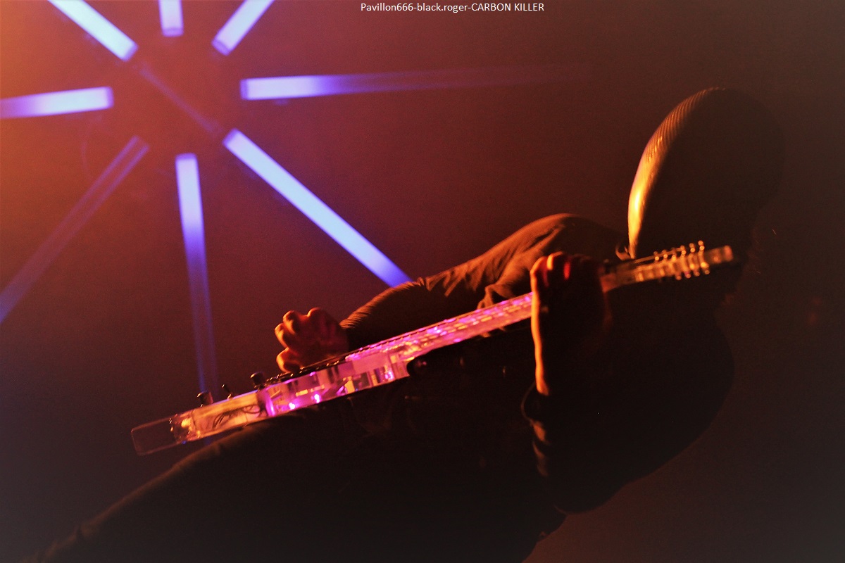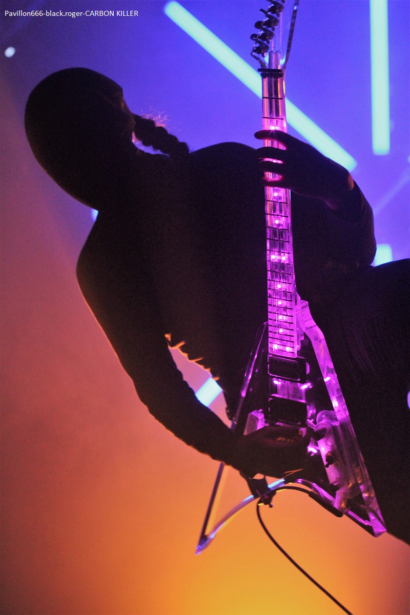 Les membres de CARBON KILLER venus de nulle-part, de Bordeaux en fait, avancent masqués dans leur démarche sombre éclairés seulement par des néons aveuglants.