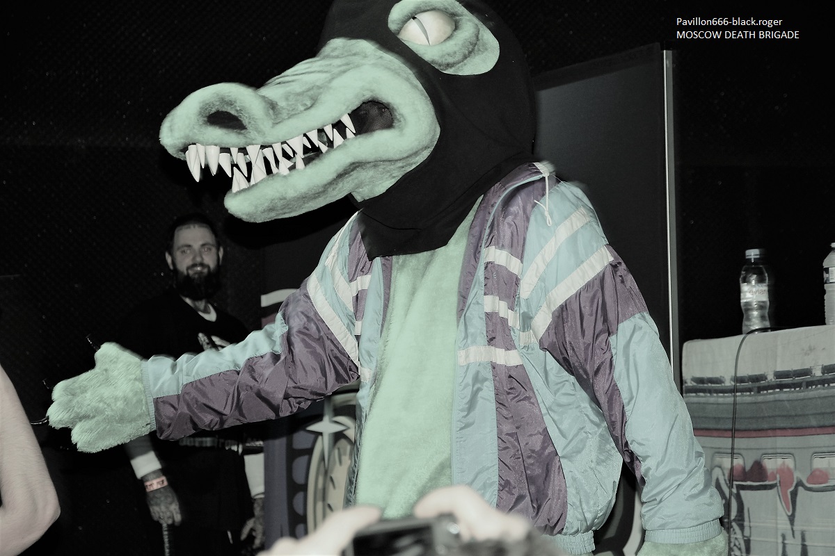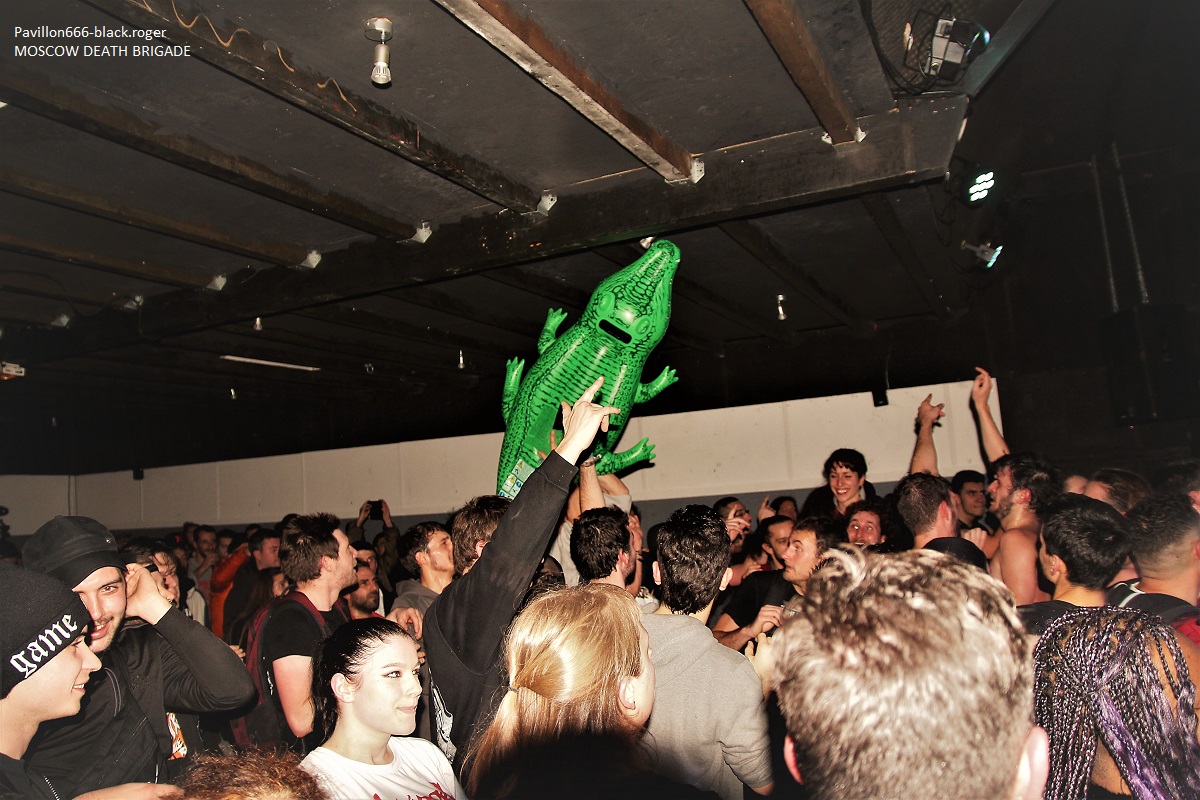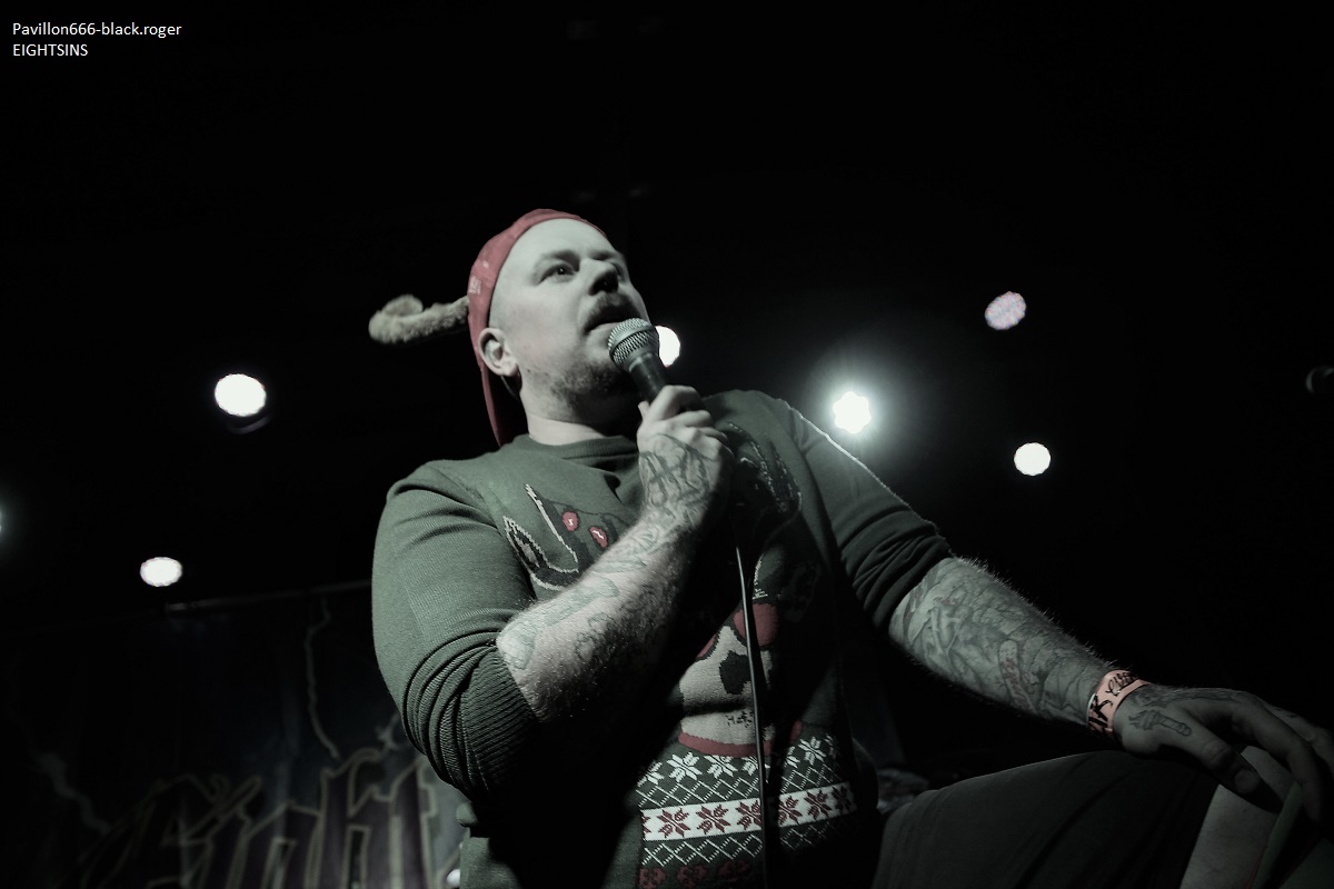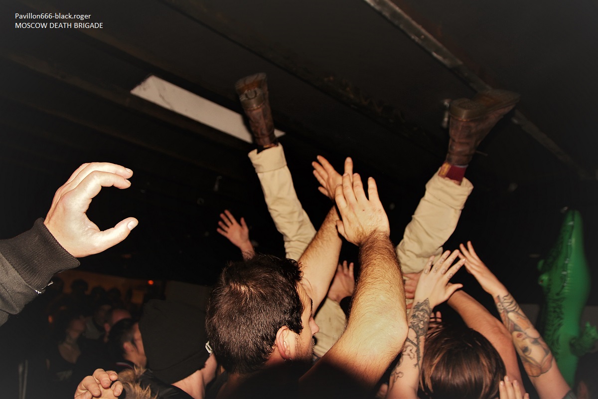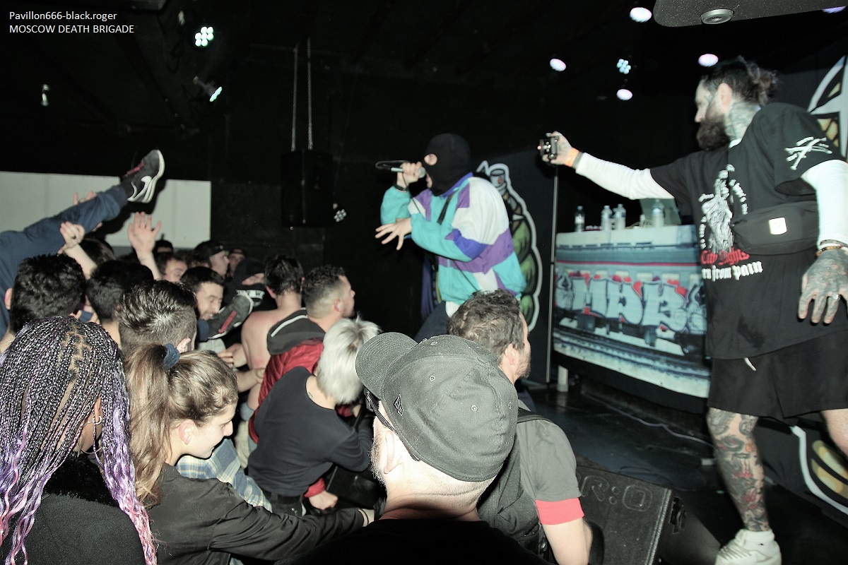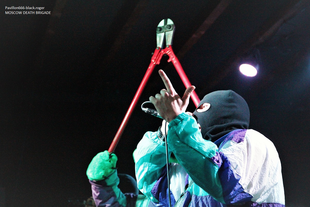 Bon, alors le ton hardcore est donné par les locaux de SHITSTORM, quatuor formé par des rescapés de combos lyonnais réunis par le old-school qui arrache, qui décape, qui fout la « merde » quoi ! Le niveau est bon on s’en doute avec ces vieux renards naviguant sur les eaux troubles du punk sans complexe, du hardcore en rut et fleurant bon l’odeur (shit) du thrash en fusion et non pas en confusion. Bref, ça envoie sans compromis, sans fausses notes (ah bon) et sans faux semblant, idéal pour ouvrir cette soirée fumante qui promet d’être chaude dans tous les sens du terme. Merci les gars vous revenez quand vous voulez ! Le père Noël est déjà passé au Warmaudio et a donné en coulisse de bien beaux bonnets aux membres de EIGHT SINS qui ne sont pas venus ici ce soir pour rigoler (si, un peu quand même !), mais pour nous coller contre les murs du Warm’ à l’aide de brûlots thrashcore évidemment. On ne présente plus ce quatuor légendaire (si, si !) qui depuis plus de 10 ans et trois albums sous leurs petits bras défraient la chronique après leurs passages dans les salles régionales et même plus loin (Hellfest), où ils répandent la « terror » influencés par notamment Madball, vous voyez ce que je veux dire ? Non, et bien allez dans leurs concerts comme celui de, ce soir ou ces musicos sont en forme, et Loïc en bon père « no hell » d’un soir s’amuse avec le public (qui a dit comme d’habitude ?). Mais rassure-vous il « aboie » toujours aussi fort et les riffs guitaristiques sont toujours meurtriers soutenus par une rythmique en béton armé. Mais que vois-je tout d’un coup, un second père Noël qui vient pousser la chansonnette en duo (ou duel) sur un titre afin de varier les plaisirs en live ! C’est la fête, ambiance ! Bon Eight Sins n’a pas déçu ce soir car la surprise est souvent de mise avec cette formation qui sait toujours mener la danse, celle du hardcore cqfd, alors on aime tout simplement. Changement de décor sur scène avec la venue tant attendue de MOSCOW DEATH BRIGADE, des « crocodiles » de Moscou qui ont la langue bien pendue pour dénoncer, se rebeller sur un ton agressif avec en arrière-plan des machines, des synthés afin de soutenir les propos de nos Moscovites en cagoules dans une mouvance anarchiste tout simplement. Bien qu’en activité depuis plus de dix années notamment dans le « street art » la formation n’a délivré qu’un véritable album intitulé « bolt cutter », traduisez des pinces coupantes afin de couper les barbelés existantes entre notamment les « chapelles » musicales du punk, du rap, du hardcore, de la techno, de l‘électro ou autres démarches subversives issues de la rue. Leurs clips sont parlants, les textes enregistrés aussi, mais c’est surtout en live que Moscow Death Brigade fait sa « fiesta » et c’est donc la « fiesta » ce soir dans un Warmaudio en mouvements perpétuels, en stage-diving, en sueur, en chaleur (sic), en pogos, en circle-pit, en ce que vous voulez quoi, ce soir c’est la liberté d’expression. C’est le défoulement de tout un public concerné et motivé reprenant les refrains distillés et ce fus tout simplement énorme, la « quecla dans la chetron » en langage « street punk/verlan ». Résultat, coup de cœur indiscutable de la part de votre chroniqueur de Pavillon666, amen ! Merci à tous, organisateurs, artistes, musiciens, Warmaudio et à toi public qui a en quelque sorte transcendé cette soirée hors du temps et de l’espace. |