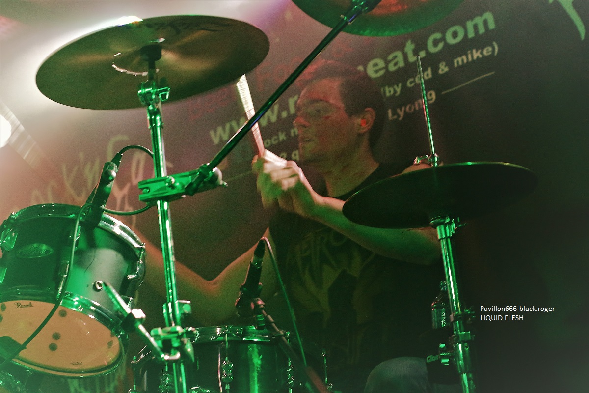 Ce trio se nomme LIQUID FLESH et nous allons être spontanément liquéfiés pour un bon moment Car avec eux inutile de chercher des envois techniques et alambiqués, ici on navigue sur une mer crasseuse et old-school avec le regard qui tue du frontman. Pas le temps de respirer entre les titres, ça décoiffe non-stop, ça claque comme un fouet métallique, ça vous défonce les « cages à miel », tout ça proprement, sans faux plis, sans compromis.