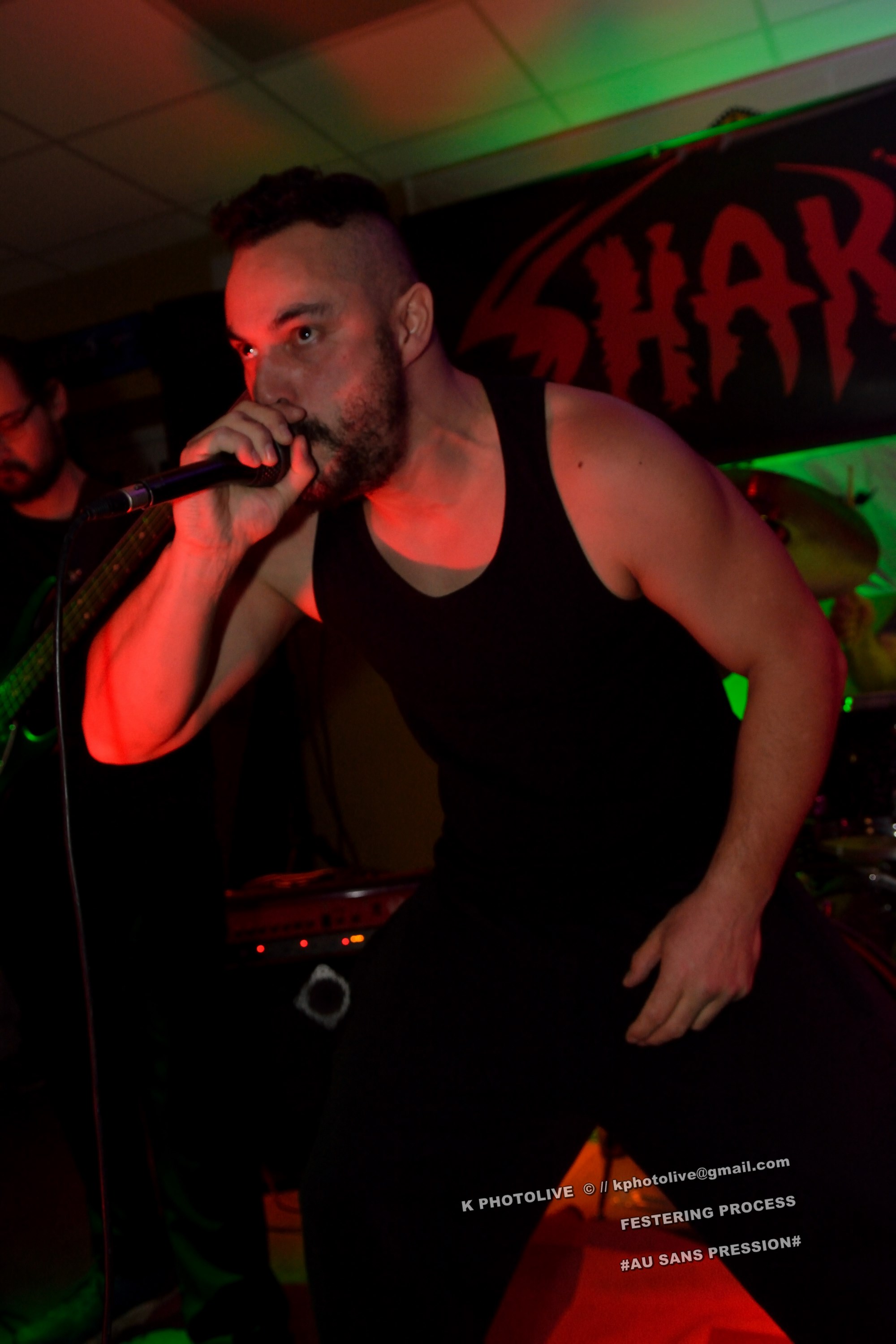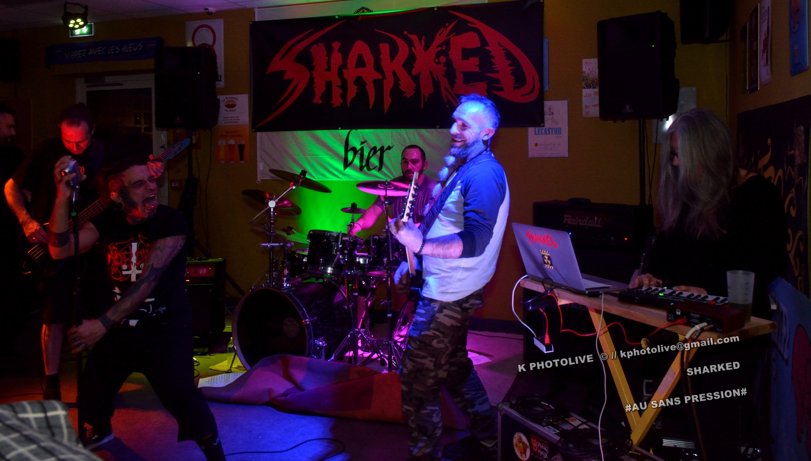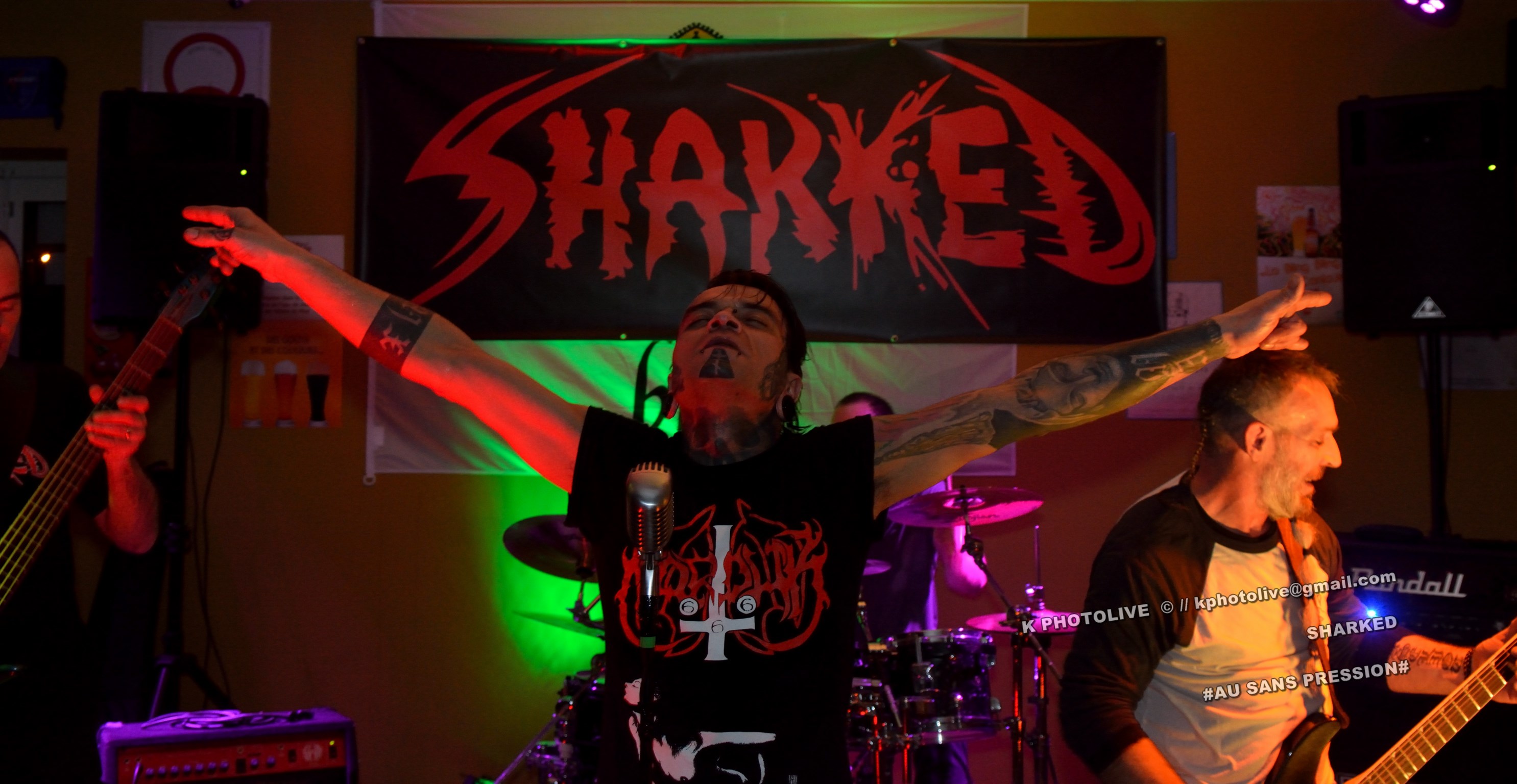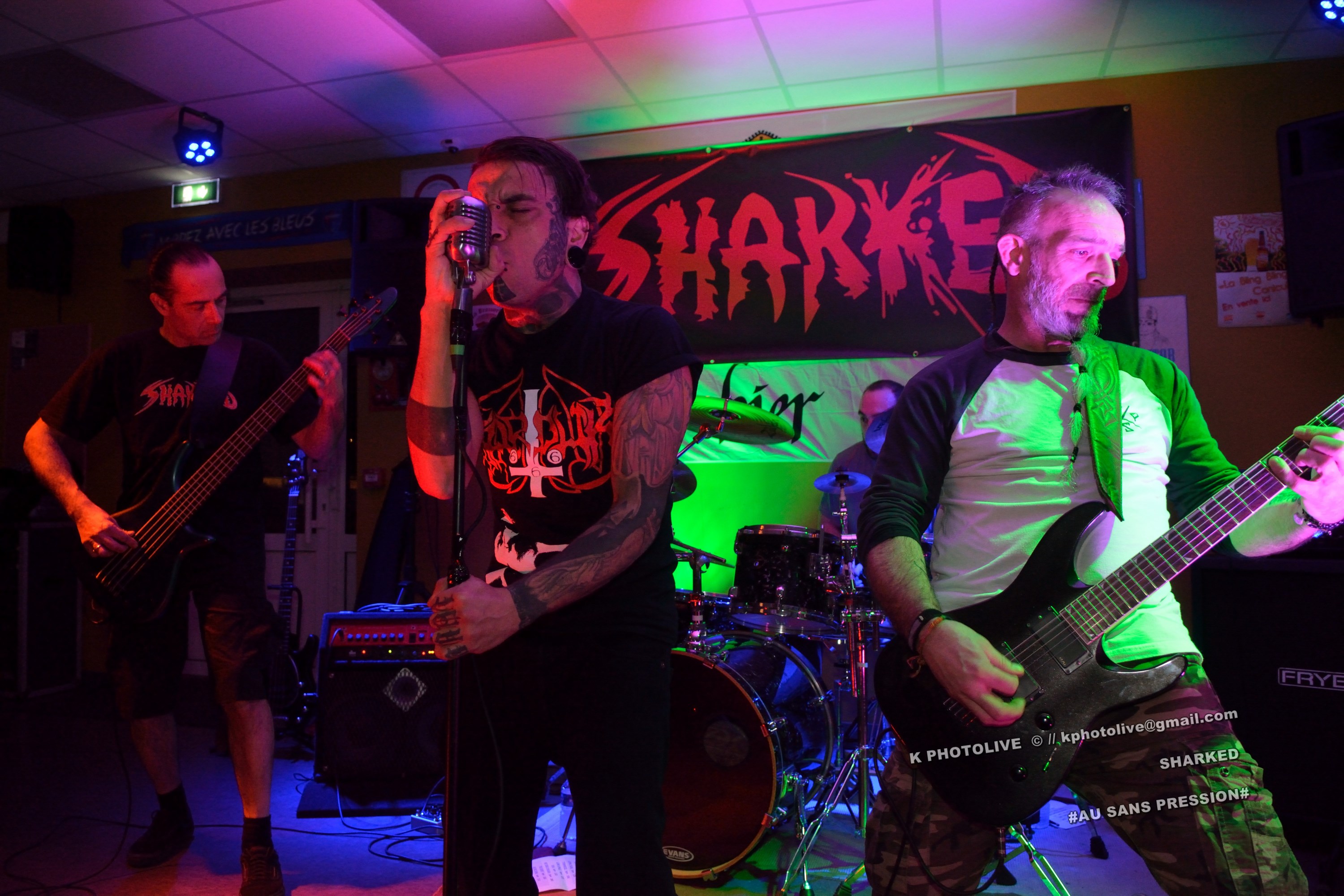 Qui a osé prétendre que le rock metal n’était pas apprécié dans cette région de l’Ain qui s’appelle le Bugey ? Ignorance ! Citons le Sylak, le Leym’fest, Rock’infrat !, et ajoutons-y, pour faire bonne mesure, un modeste bar à bières, discrètement situé à Ambérieu-en-Bugey, la « cité cheminote ». Si, il y a des métalleux dans cette ville et dans les communes rurales avoisinantes, la preuve en est que, ce vendredi soir, le Sans Pression affiche complet. Deux groupes de « musique extrême », comme on dit pudiquement, auront réussi à attirer des dizaines d’amateurs de brutal/death et de grindcore dans cet établissement dont la notoriété s’affirme rapidement. Un public majoritairement masculin, une ambiance conviviale et chaleureuse, parfois virile, autour des deux groupes qui vont animer la soirée, à savoir les Lyonnais de SHARKED et leurs potes de FESTERING PROCESS qui viennent en voisins du Nord-Isère.