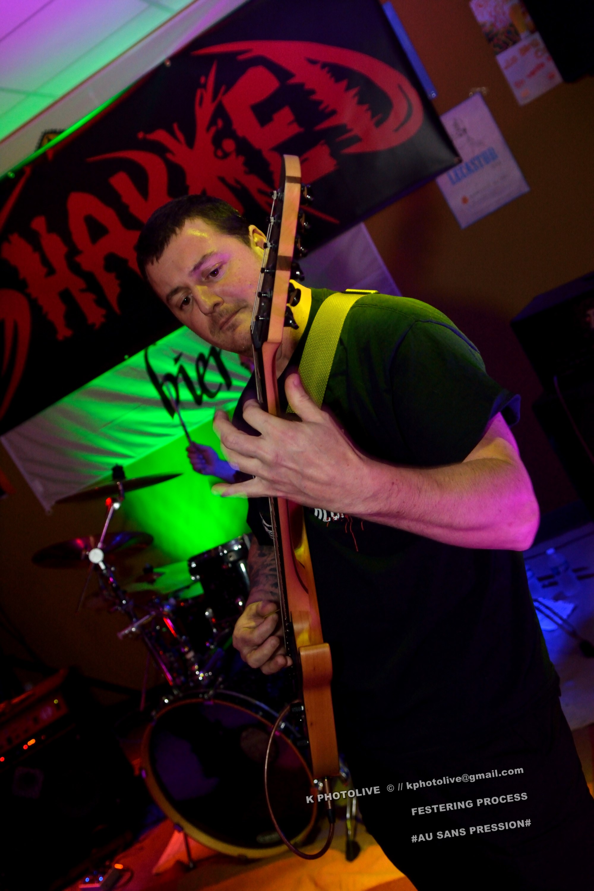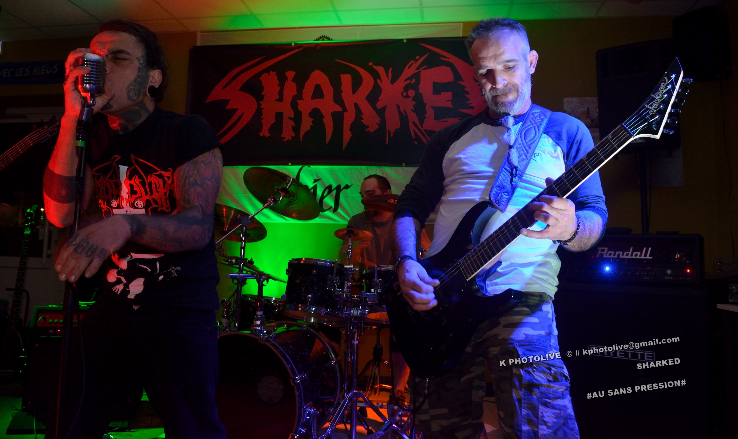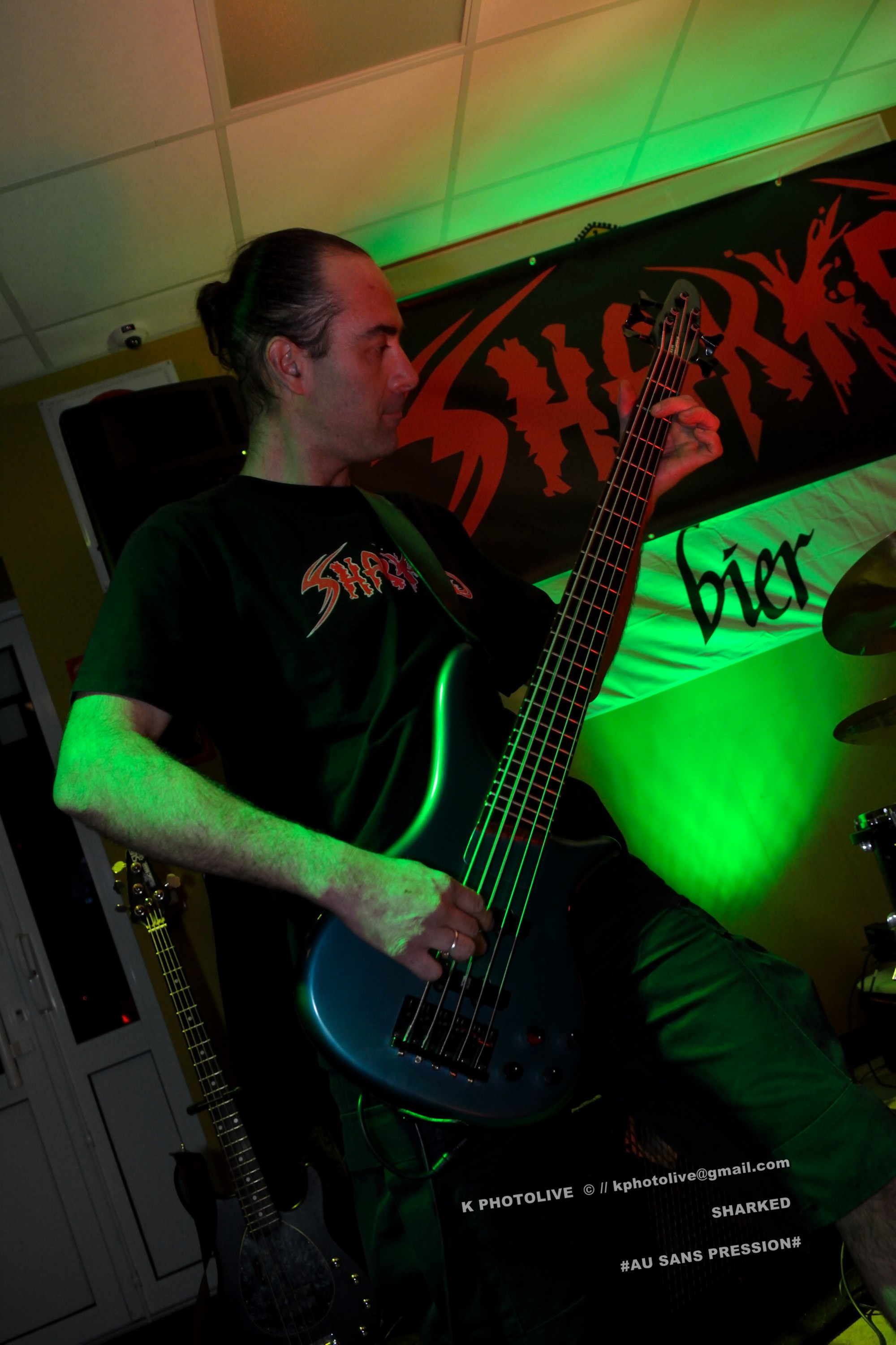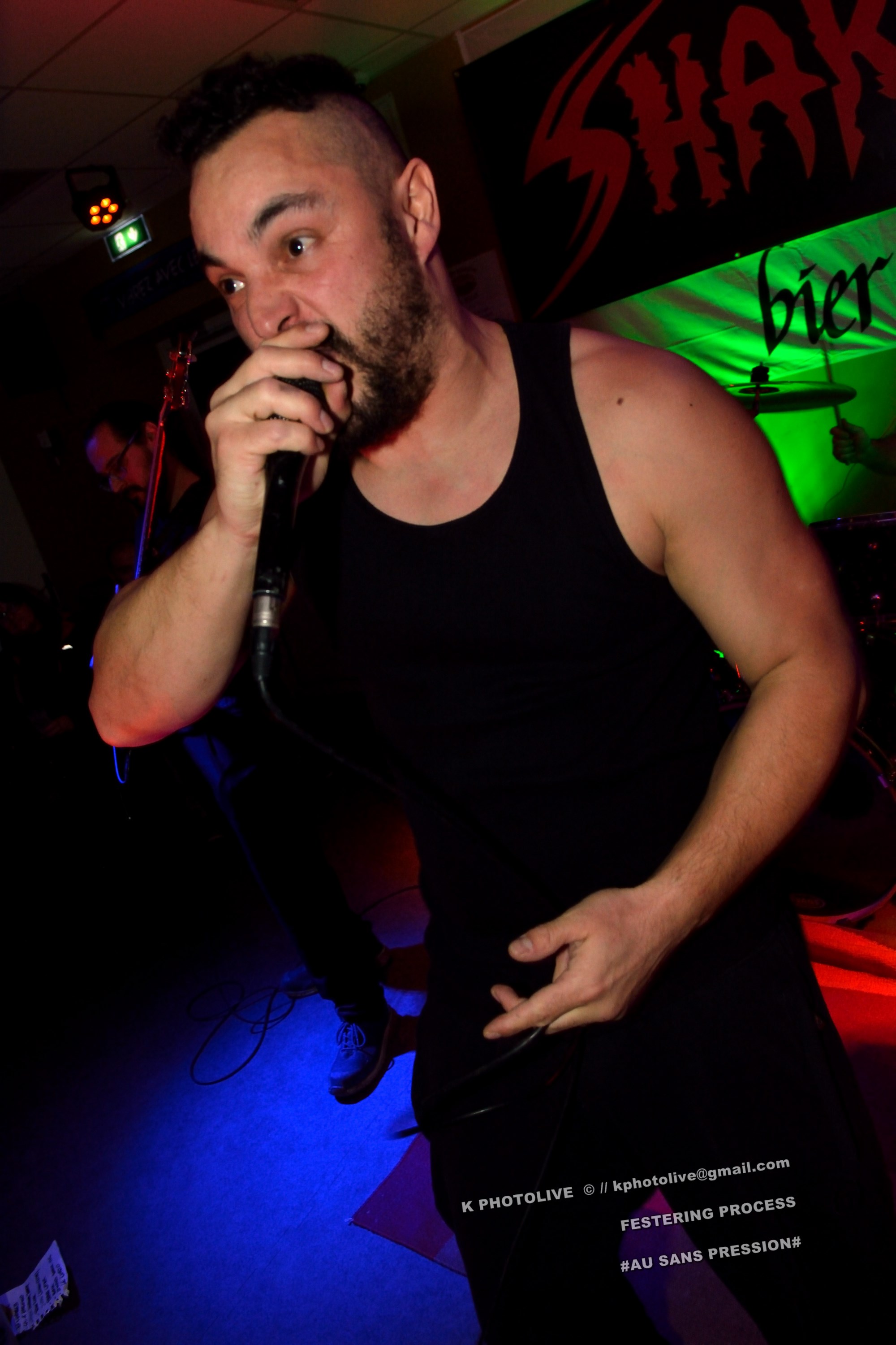 Qui a osé prétendre que le rock metal n’était pas apprécié dans cette région de l’Ain qui s’appelle le Bugey ? Ignorance ! Citons le Sylak, le Leym’fest, Rock’infrat !, et ajoutons-y, pour faire bonne mesure, un modeste bar à bières, discrètement situé à Ambérieu-en-Bugey, la « cité cheminote ». Si, il y a des métalleux dans cette ville et dans les communes rurales avoisinantes, la preuve en est que, ce vendredi soir, le Sans Pression affiche complet. Deux groupes de « musique extrême », comme on dit pudiquement, auront réussi à attirer des dizaines d’amateurs de brutal/death et de grindcore dans cet établissement dont la notoriété s’affirme rapidement. Un public majoritairement masculin, une ambiance conviviale et chaleureuse, parfois virile, autour des deux groupes qui vont animer la soirée, à savoir les Lyonnais de SHARKED et leurs potes de FESTERING PROCESS qui viennent en voisins du Nord-Isère.