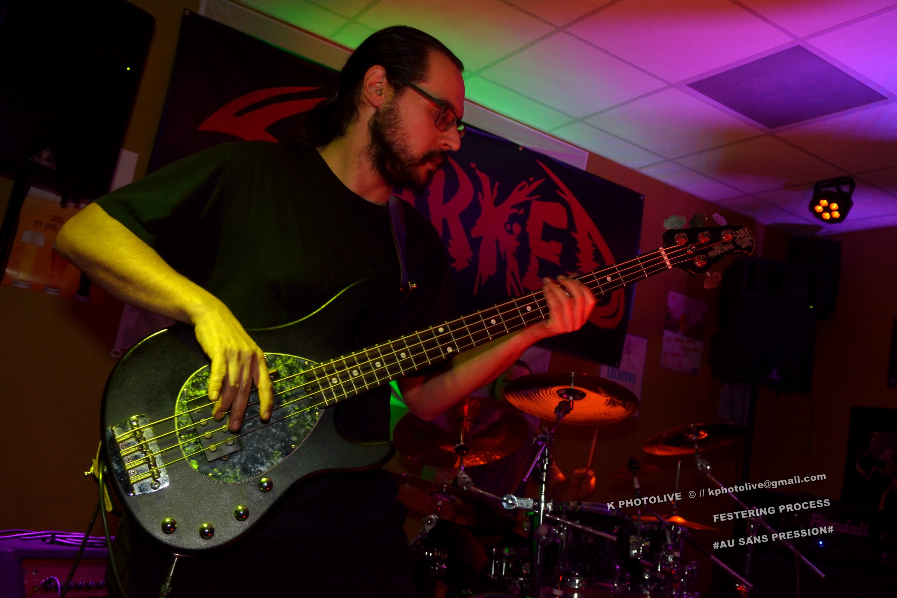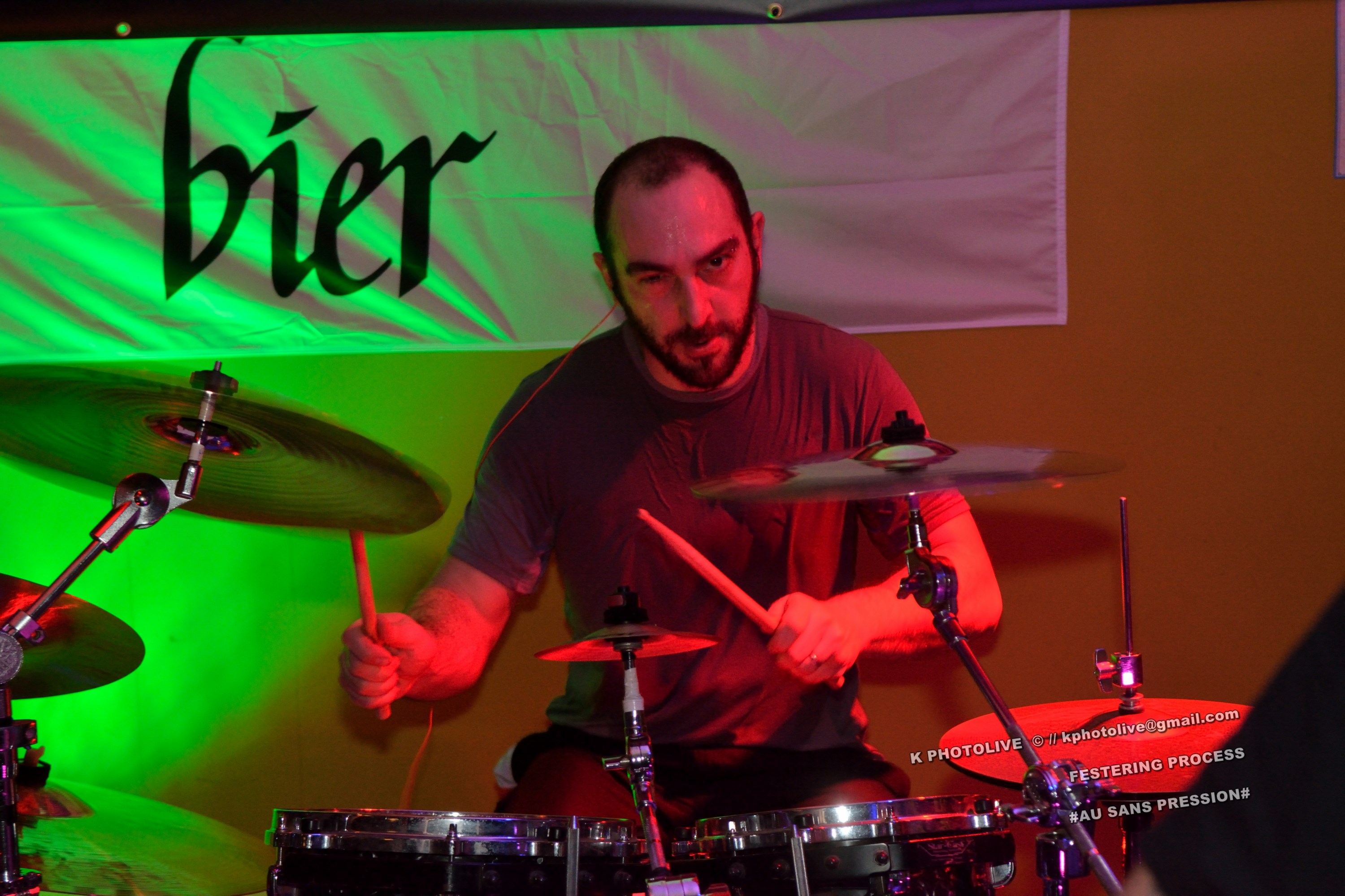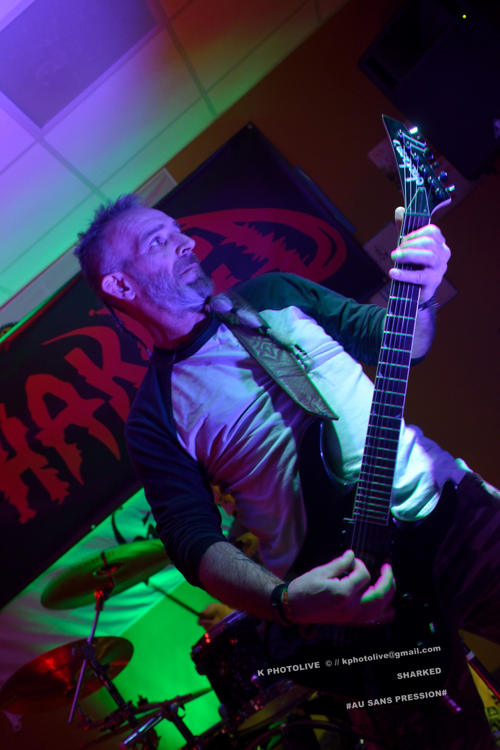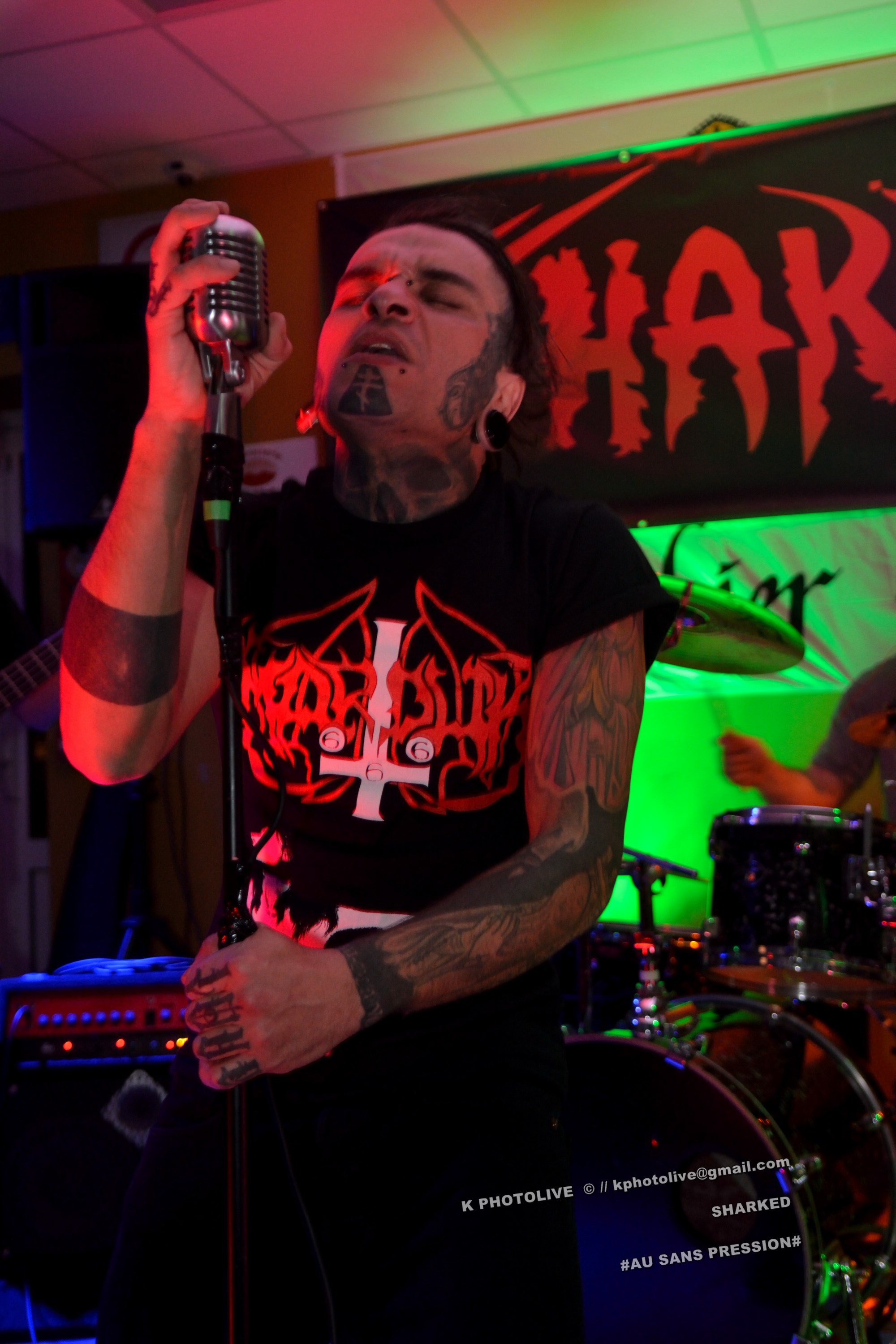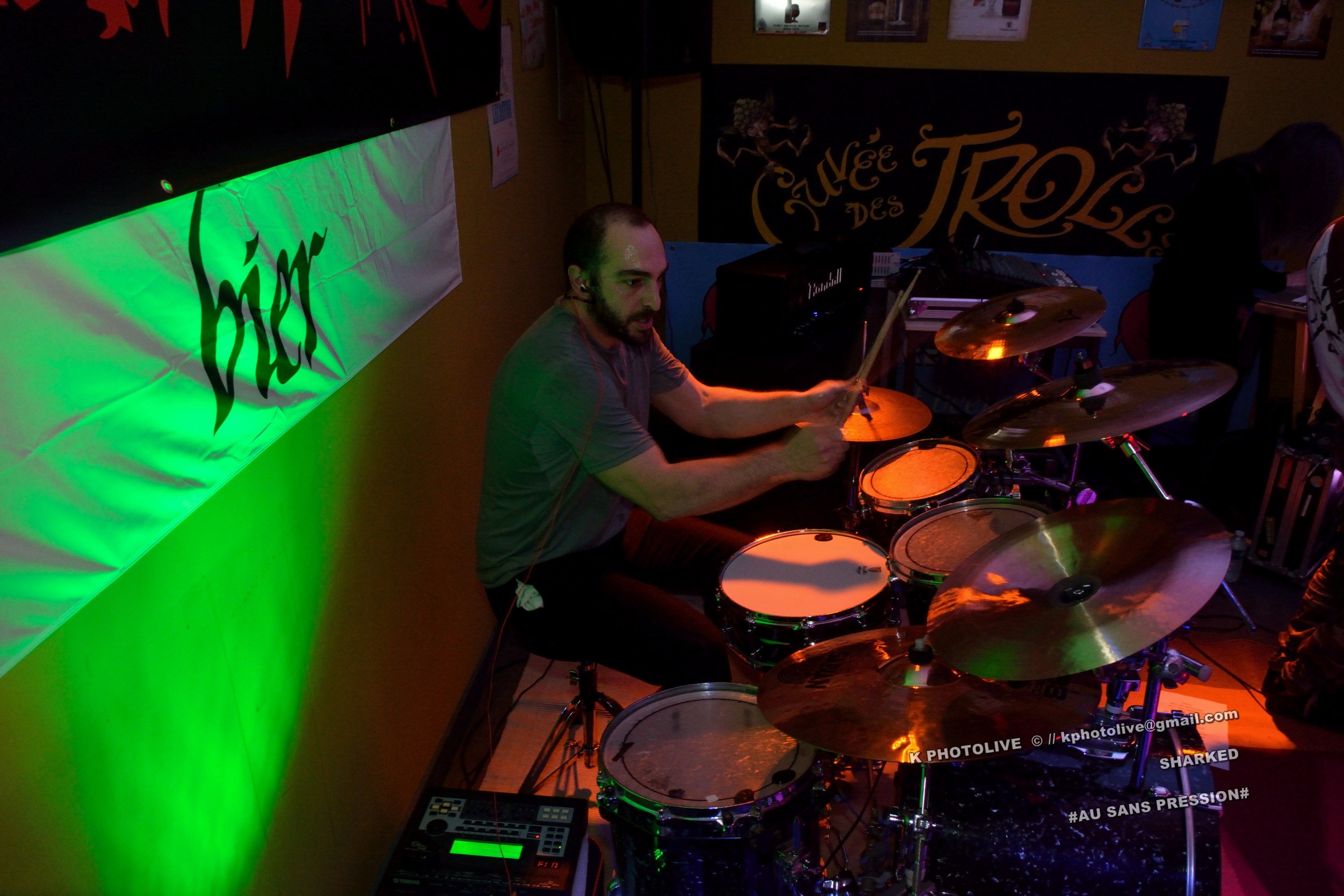 Qui a osé prétendre que le rock metal n’était pas apprécié dans cette région de l’Ain qui s’appelle le Bugey ? Ignorance ! Citons le Sylak, le Leym’fest, Rock’infrat !, et ajoutons-y, pour faire bonne mesure, un modeste bar à bières, discrètement situé à Ambérieu-en-Bugey, la « cité cheminote ». Si, il y a des métalleux dans cette ville et dans les communes rurales avoisinantes, la preuve en est que, ce vendredi soir, le Sans Pression affiche complet. Deux groupes de « musique extrême », comme on dit pudiquement, auront réussi à attirer des dizaines d’amateurs de brutal/death et de grindcore dans cet établissement dont la notoriété s’affirme rapidement. Un public majoritairement masculin, une ambiance conviviale et chaleureuse, parfois virile, autour des deux groupes qui vont animer la soirée, à savoir les Lyonnais de SHARKED et leurs potes de FESTERING PROCESS qui viennent en voisins du Nord-Isère.