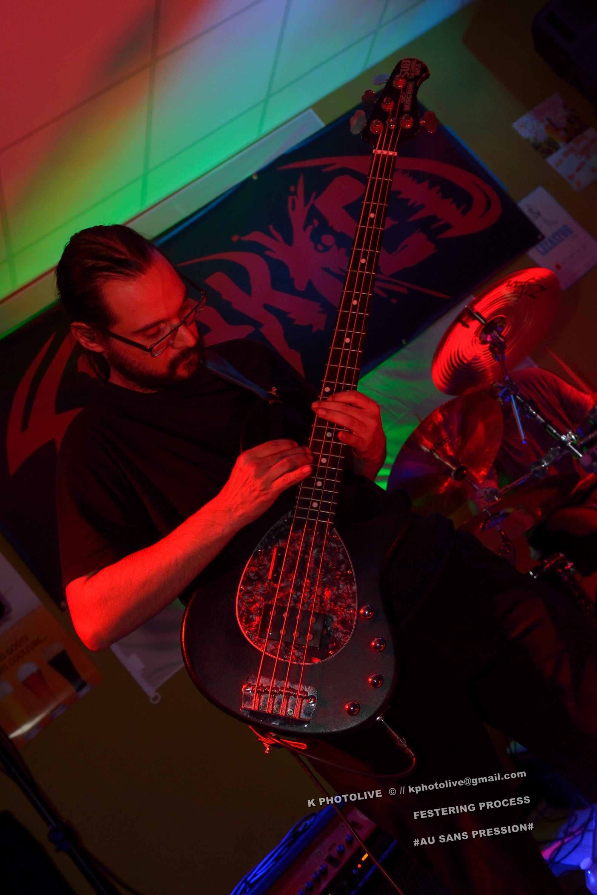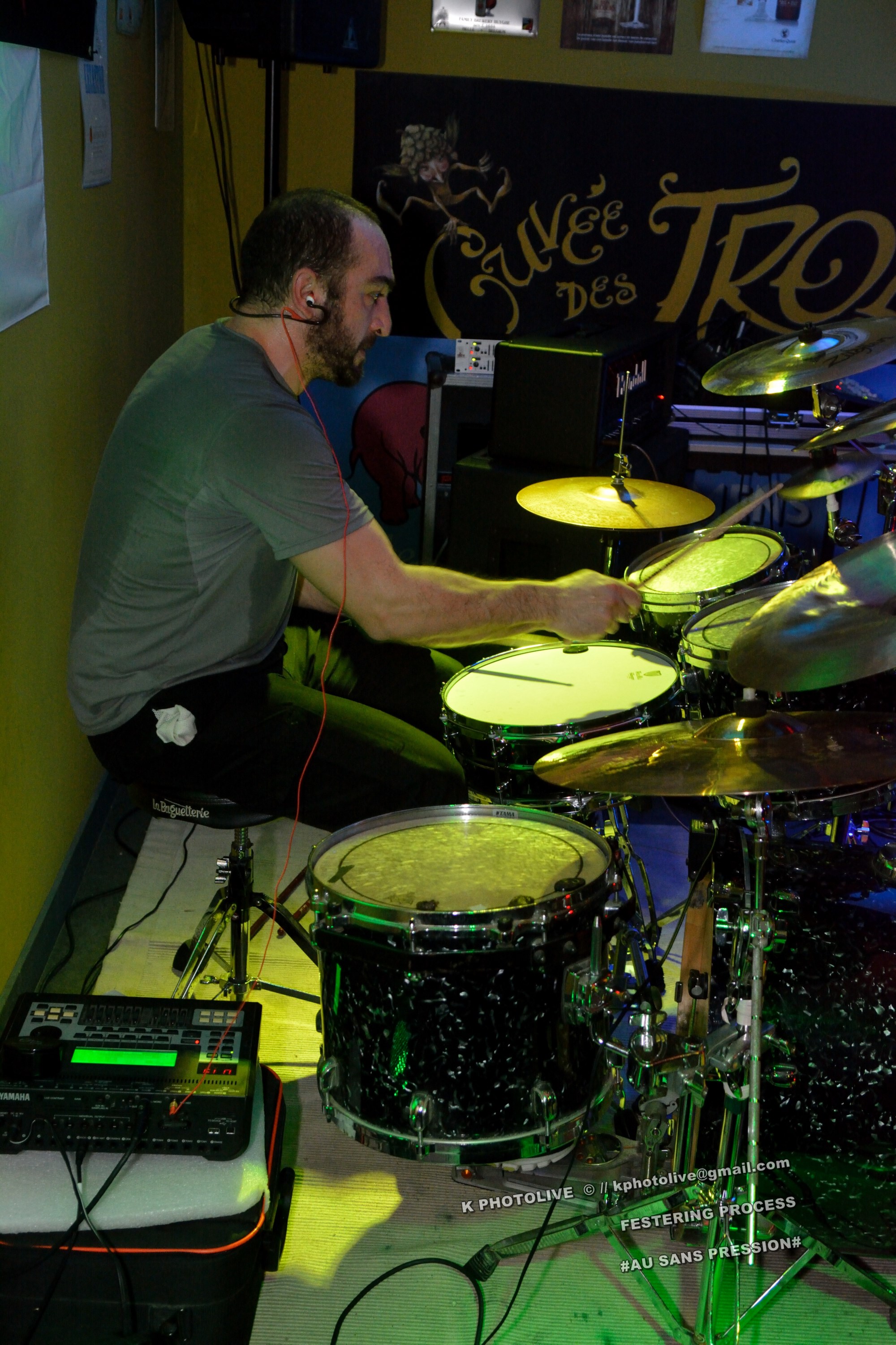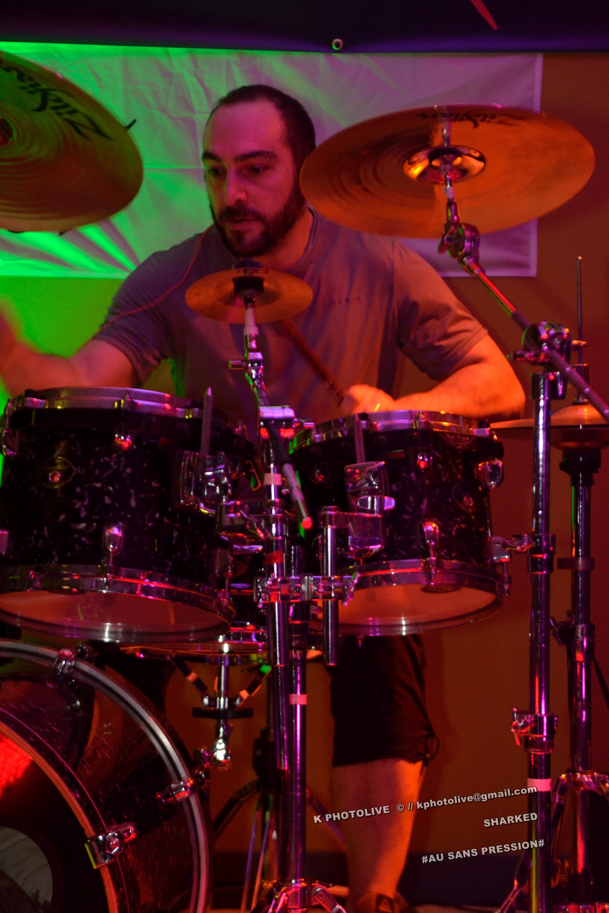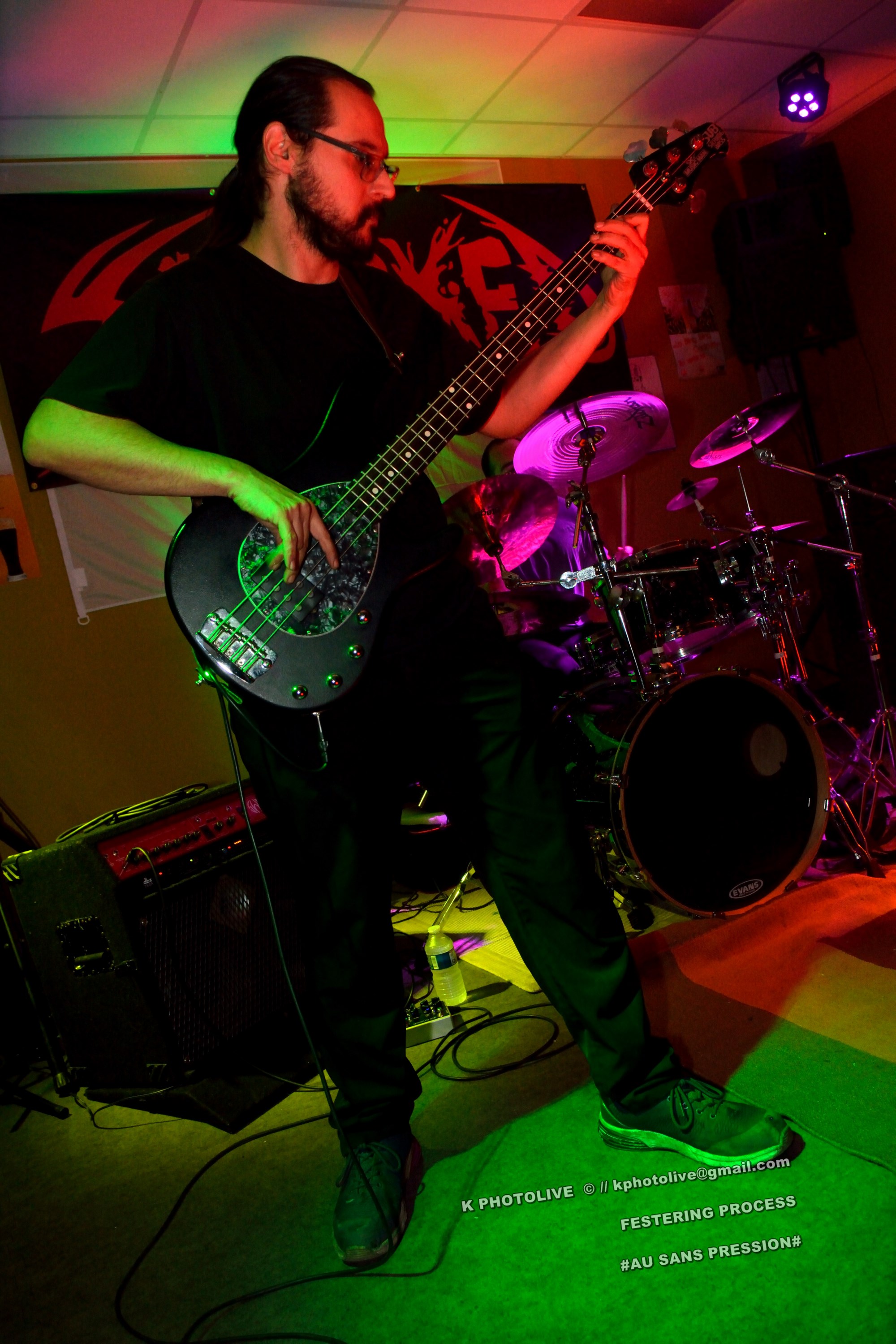 Qui a osé prétendre que le rock metal n’était pas apprécié dans cette région de l’Ain qui s’appelle le Bugey ? Ignorance ! Citons le Sylak, le Leym’fest, Rock’infrat !, et ajoutons-y, pour faire bonne mesure, un modeste bar à bières, discrètement situé à Ambérieu-en-Bugey, la « cité cheminote ». Si, il y a des métalleux dans cette ville et dans les communes rurales avoisinantes, la preuve en est que, ce vendredi soir, le Sans Pression affiche complet. Deux groupes de « musique extrême », comme on dit pudiquement, auront réussi à attirer des dizaines d’amateurs de brutal/death et de grindcore dans cet établissement dont la notoriété s’affirme rapidement. Un public majoritairement masculin, une ambiance conviviale et chaleureuse, parfois virile, autour des deux groupes qui vont animer la soirée, à savoir les Lyonnais de SHARKED et leurs potes de FESTERING PROCESS qui viennent en voisins du Nord-Isère.