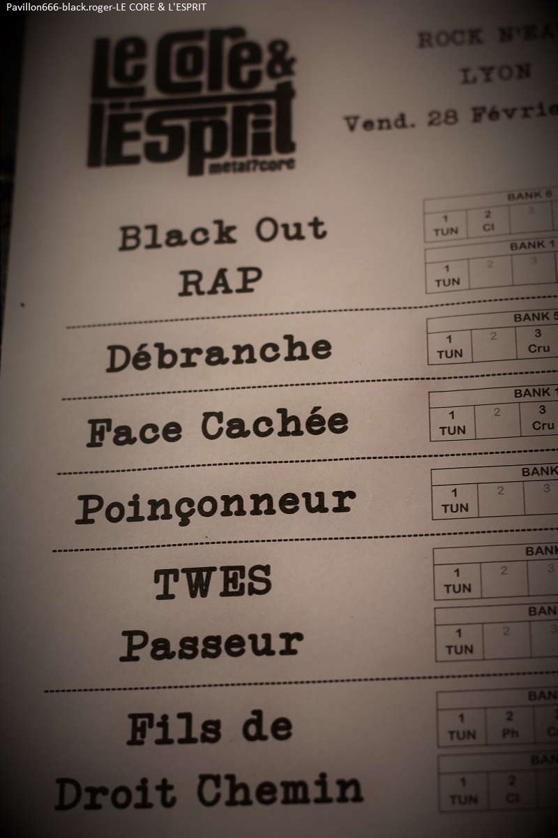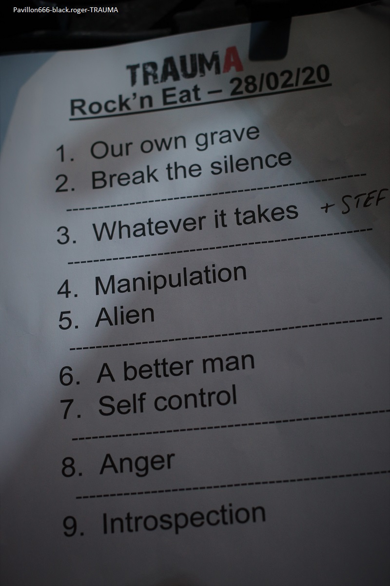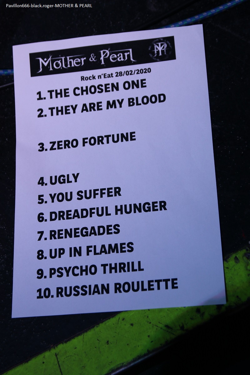 Avec un nom de groupe pareil, LE CORE & L’ESRIT, le chant dans la langue de Molière est de rigueur. Pari risqué donc, mais nos amis musiciens de Lorraine font parler la poudre dans une démarche proche de celle de Lofofora, le mot est lâché ! Les vocaux se veulent changeant, les textes aussi, des textes « engagés », mot par trop usité mais bon. A milieu du set la reprise « poinçonneur », de Gainsbourg à la sauce metalcore donne le ton de ce quintette qui ne se fixe aucune limite en fait et ose les textes en français, ce n’est pas facile, mais ils ont l’air d’y croire. Alors bonne route les gars, vous valez le détour dans ce monde de brutes, ne lâchez rien ! Set-list en photo. C’est avec plaisir que nous retrouvons TRAUMA en live avec au menu une certaine agressivité metal/hardcore. Voici donc la voix modulée du chanteur bien remarquée, les guitares aux cordes affutées comme des lames de rasoir, la basse grondante en fond d’écran et la batterie soutenant l’édifice à bout de baguettes, puissante comme on aime. Trauma sait instaurer la bonne ambiance c’est un fait, mais ce soir sur le 3ème titre de leur set-list, un guest fait irruption ; il s’agit de Stef (Butcher Of Mississippi) et la température va monter d’un cran. Ces temps-ci durant les sets de concerts au RNE de plus en plus de « guest » font leur apparition j’ai remarqué, effet de mode ? Peut-être, en tous cas c’est fort de café, l’idée est bonne Trauma a donc enflammé le RNE ce vendredi et c’est tant mieux, bravo les gars vous revenez quand vous voulez ! Set-list en photo. Avec MOTHER & PEARL la température ne va pas retomber vous vous en doutez bien même si le frontman aura un peu de mal à « remonter les bretelles » du public au début de la prestation. Mais Mother & Pearl en a vu d’autres et bientôt tout repart en « live » le chanteur allant « chatouiller » l’assistance qui n’attendais que ça connaissant nos musicos. Ce soir un nouveau (jeune) batteur est derrière les futs et va apporter une dose de « sang neuf » à la formation, aargh ! Alors ça va « blaster » dans la chaumière du RNE avec nos amis Lyonnais (qui a dit comme d’habitude ?) Nous pouvons dire que Mother & Pearl à le « thrash au core » et c’est vrai, pas de répit ce soir, et hop pour terminer, le fameux titre « russian roulette » met tout le monde d’accord avec deux « guest » bien entendu ! Set-list en photo. Au final, des groupes contents d’avoir pu s’éclater en live, une assistance comblée ayant « la banane ». Alors merci à tous, musiciens, Rock n’Eat et public pour ce moment fort passé ensemble dans l’underground lyonnais. |