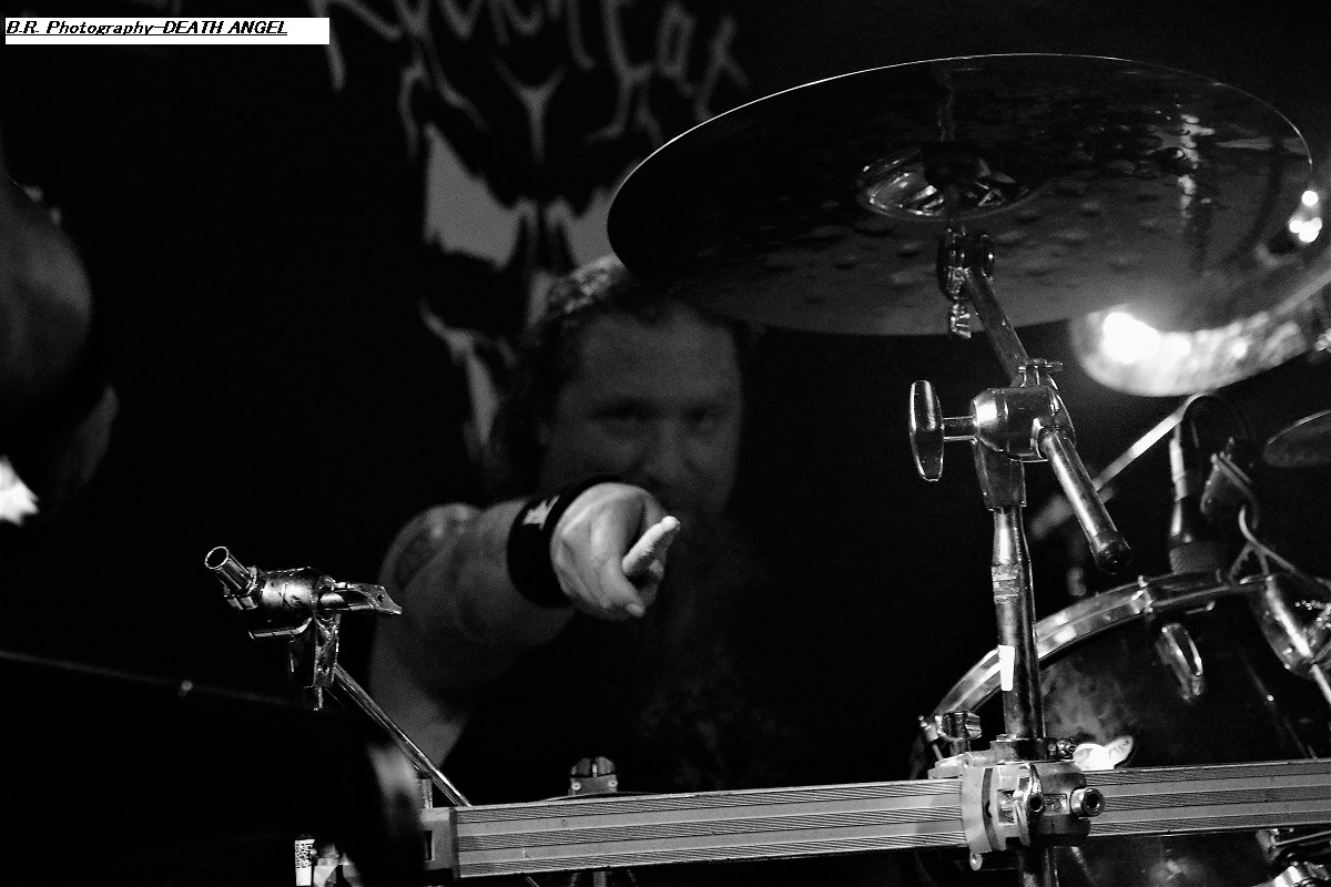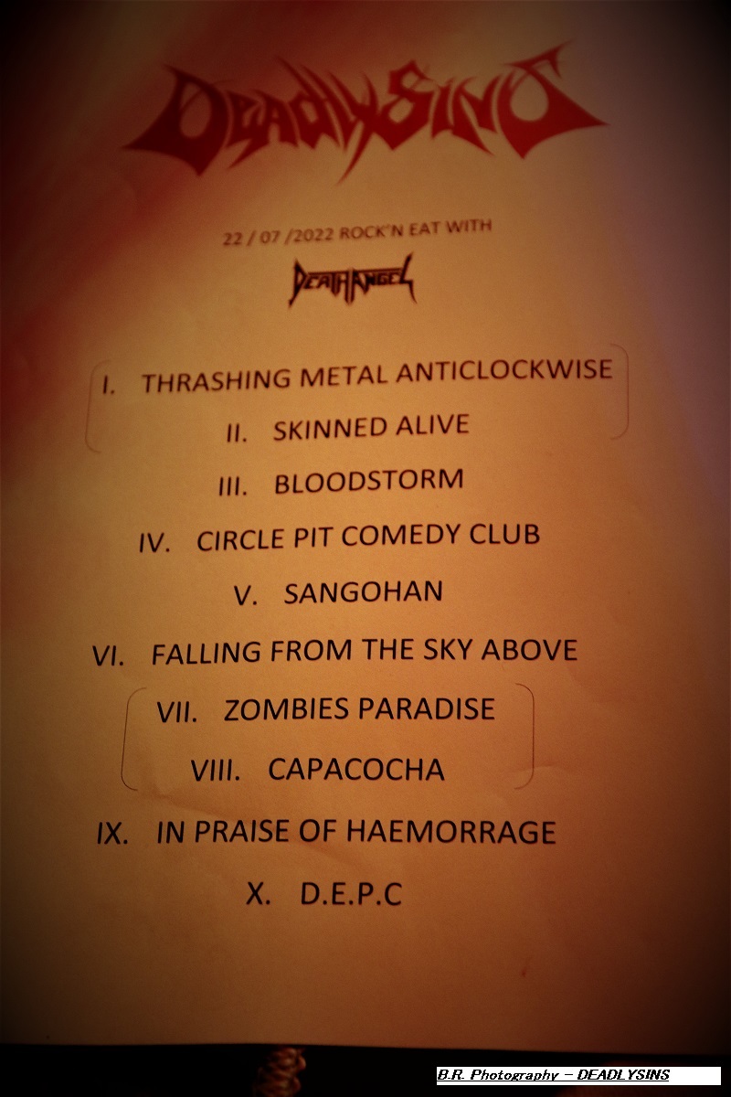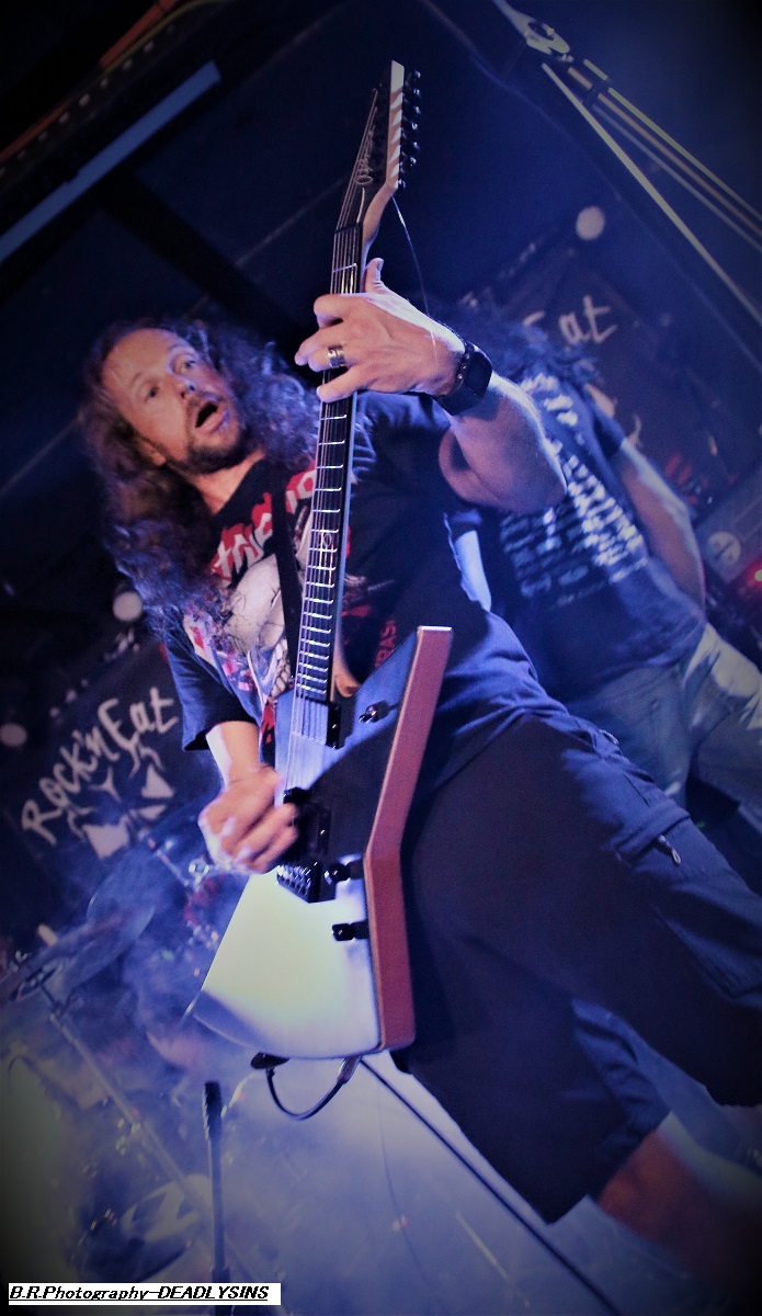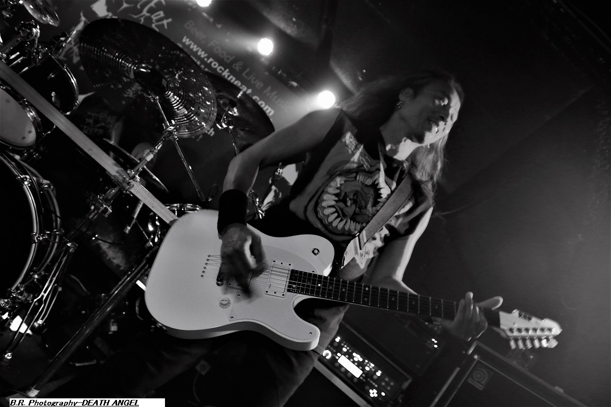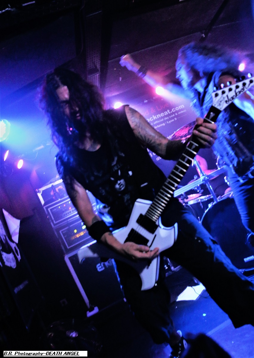 Mais avant leur set, nous avons pu apprécier la prestation des Lyonnais DEADLYSINS remontés à block ce soir et qui nous ont mis sdans le bain (de sueur ?) sans préambule, sans faux semblant, old-school peut-être mais efficace à 100%, paf ! Ensuite nous avons eu droit à la prestation musclée de nos cousins Germains FATEFUL FINALITY, groupe qui accompagne Death Angel sur la tournée, ce soir étant leur seconde date. La tension est montée d’un cran dans le public, la chalmeur aussi ! Leur set fut brutal, rapide, intense dans un registre thrash aux touches modernes mais implacable de puissance de feu, aargh ! La pression continue de monter de plusieurs crans, la température devenant caniculaire devant la scène avec l’arrivée devant nous des Californiens de DEATH ANGEL. Et là, dès le premier titre, tout part en live, garez-vous car ça va être une tuerie carrément ! Et l’on a dégusté dans tous les sens du terme avec ce thrash sans concession et des musiciens au top niveau avec aussi un Mark Osegueda sympathique serrant les mains durant le set (dont la mienne), sympa quoi Bref, Death Angel est toujours placé à un très haut niveau et nous a écrasé tout simplement, mais avec doigté SVP, ! Merci aux groupes, merci au public pour l’ambiance instaurée et bien entendu merci au Rock n,Eat qui nous propose des menus metal/rock de choix. |