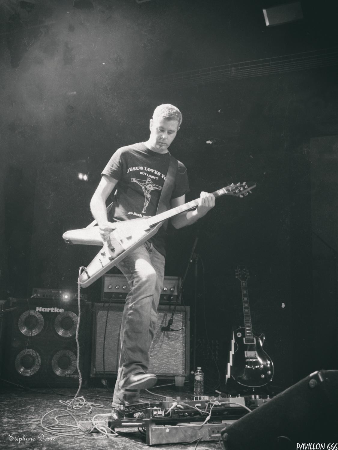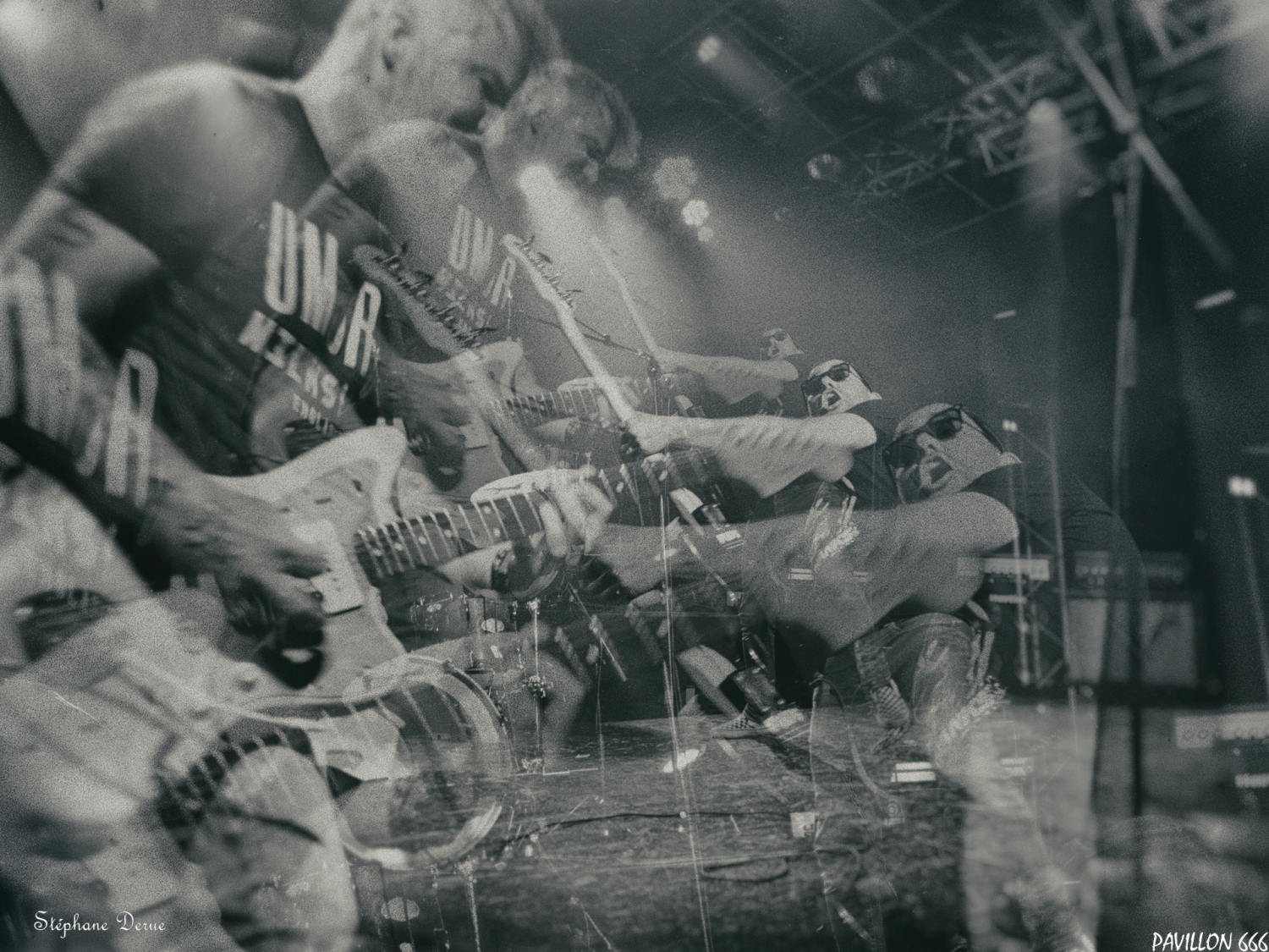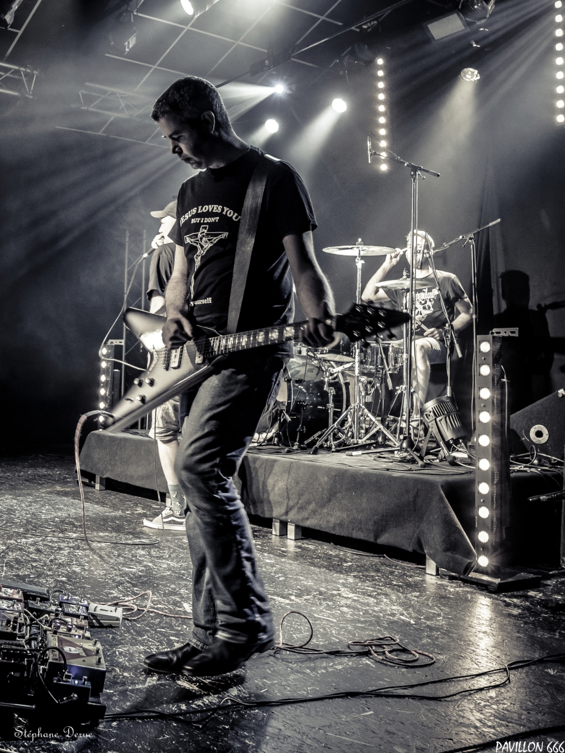 Je tiens d’ailleurs à remercier l’accueil réservé par Manon et l’équipe du SILO, et les techniciens, MAEL au son et SEB aux éclairages. Toujours un plaisir de travailler avec eux. Le premier groupe à se présenter sur les planches est « TALKY WALKIE » formé par Céline et Sylvain. Le peu d’expérience sur scène de ce duo n’a en rien entaché leur prestation qui a d’ailleurs conquis le public. Un rock électro acoustique subtil où les voix se marient parfaitement, distillant des compositions variées, en rythme et en ambiance, soutenues par la basse de Céline et la guitare de Sylvain. Une très belle découverte, pour un duo talentueux qui mériteraient de pouvoir présenter plus souvent au public leurs compositions. Que dire de la prestation de « MUGSLUG » !!! Super comme d’habitude. Une énergie incroyable, menée par trois musiciens accomplis, maitrisant de bout en bout leur set. Le public Le public ne s’y trompe pas, et reprends en cœur des titres qui sont maintenant des standards pour ceux qui suivent ce trio. « Strike » et « i’m not » ou encore « new world order » font bouger les premiers rangs dans des pogos bon enfant. « UFO division » reste un temps fort du concert tant ce titre vous prend aux tripes. Impossible de ne pas bouger sur un tel morceau. Pas toujours facile de faire des photos nettes dans ces conditions. Cyril, le fantasque bassiste, est en forme olympique ! Fred au chant et à la guitare dégage une énergie communicative et Bastien aux fût est tout simplement monstrueux. Le public, chauffé à vif, réservera un accueil survolté à « SUMMER OF VIOLENCE », groupe normand de Stoner. Un set énervé, où les plus chauds auront la possibilité d’investir la scène pour pogoter. Sous un déluge de guitare acérée et une batterie sur vitaminé, le chanteur hurle sa rage et harangue le public entre chaque titre par un discours qui sent la colère et la révolte. Une soirée pleine de bonnes vibrations et ça fait un bien fou. A bientôt ! |
