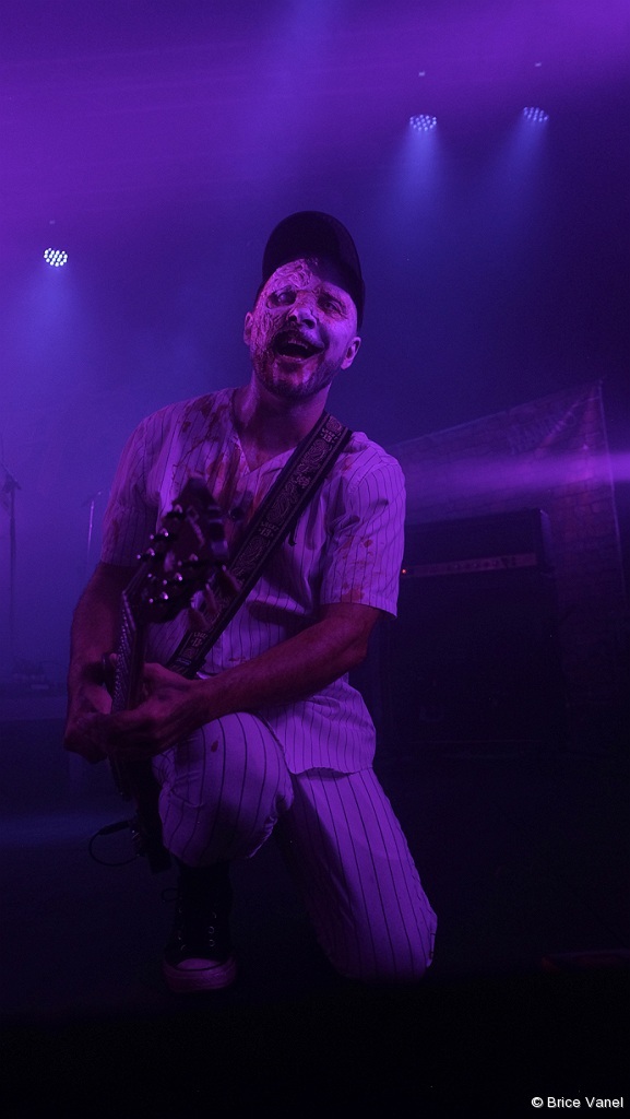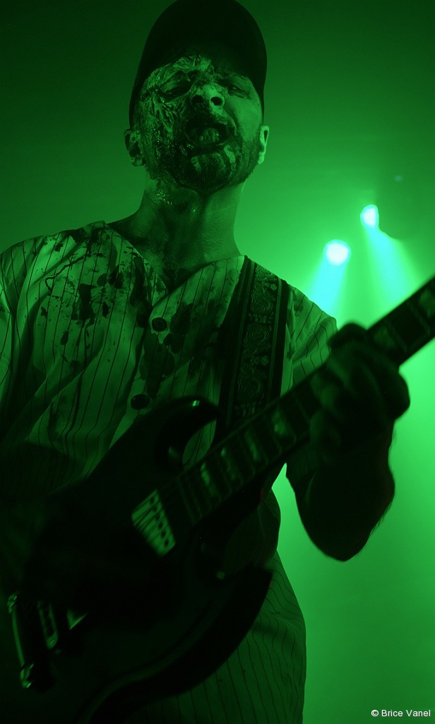 Puis ce fut au tour des Banane Metallik de clôturer ce 3 Metal Fest. Ce sont les fers de lance d’un style mélangeant le punk, le rock avec une ambiance horrifique, le fameux gore’n roll. Zombifiés par un maquillage très réaliste, les 4 banane métallik ont redoublés d’efforts pour électriser un public que j’ai trouvé un poil amorphe en fin de soirée. Les appels au circle pit et autres danses frénétiques n’ont pas soulevés les foules. Cela n’enlève en rien à l’énergie du set des Banane métallik et leur show sanguinolent !