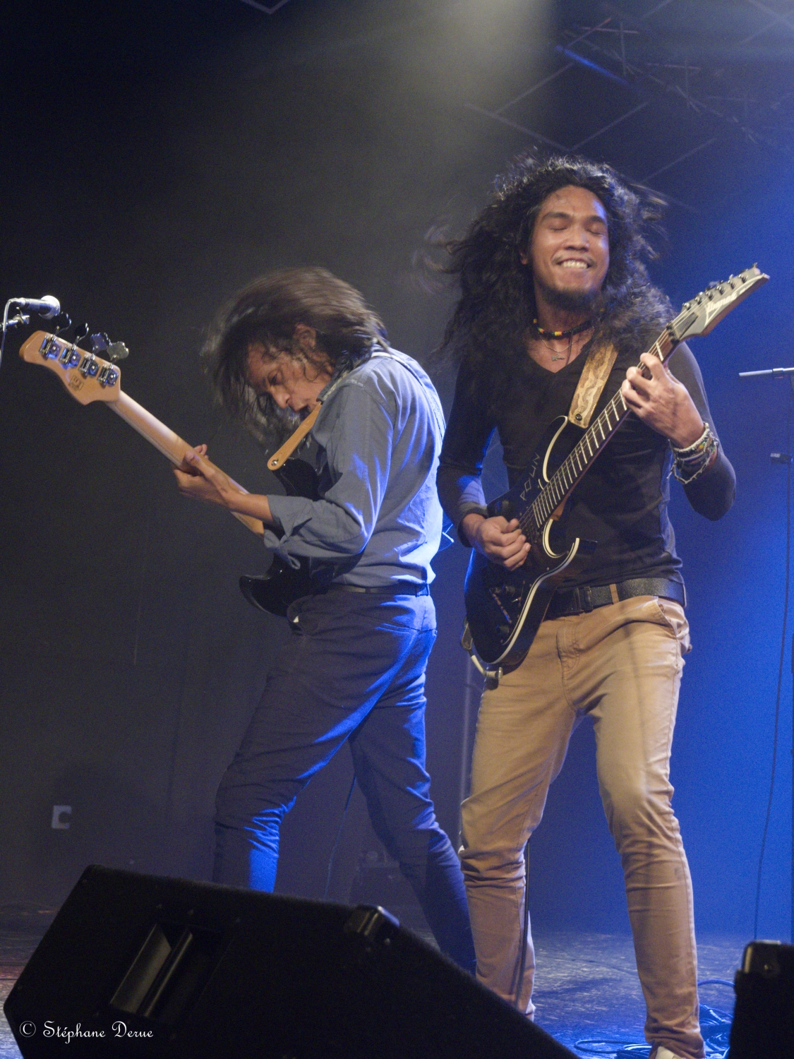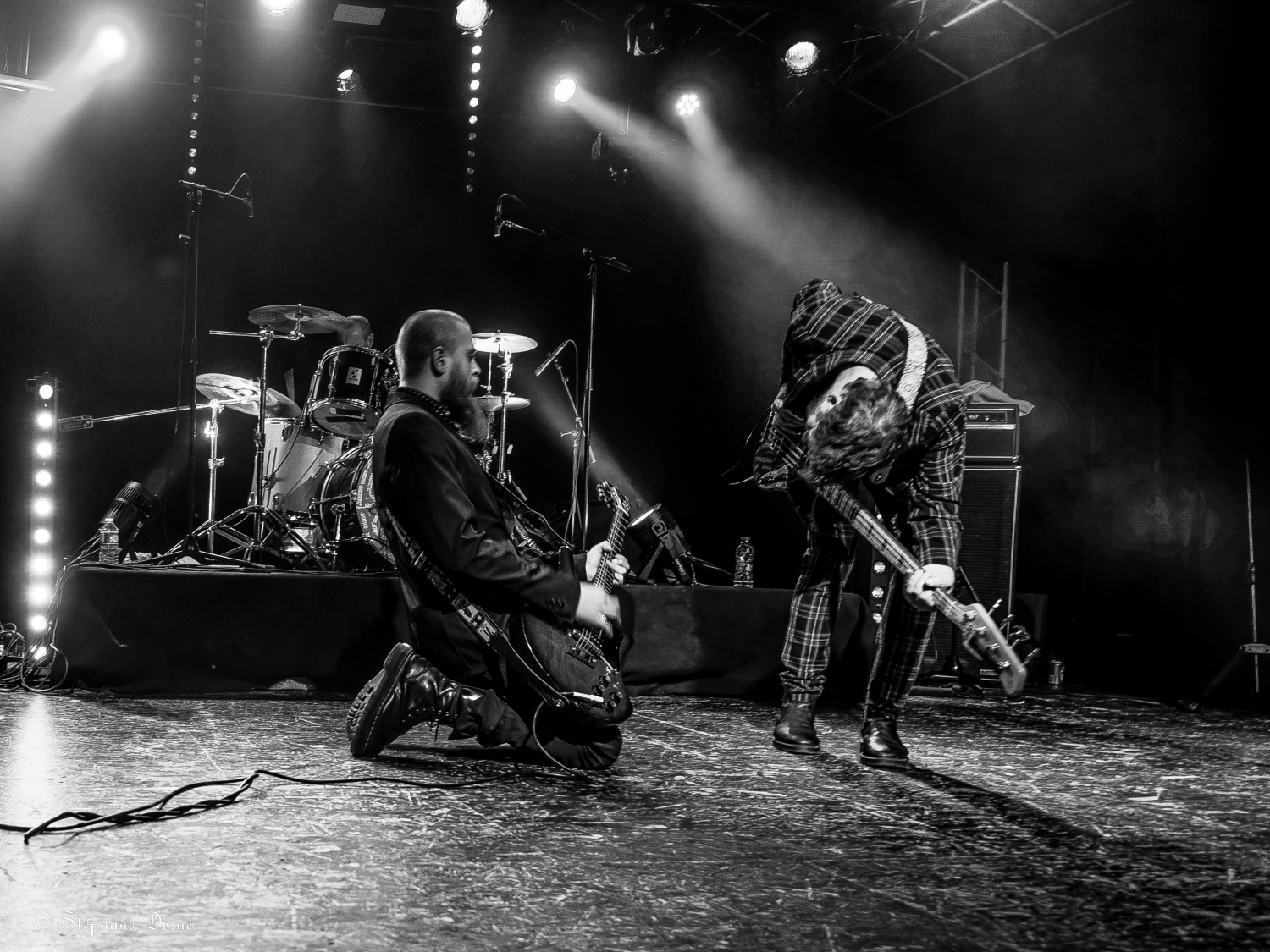 TENDRESSE : Originaire de l’Orne, ce trio est étonnant et détonnant. Il réussit à brouiller les pistes, tromper le public en se donnant de faux airs d’amateurs qui semblent s’excuser d’être là, sur la scène. Derrière la nonchalance et la désinvolture se cache pourtant un enthousiasme viscéral de jouer. Jouer avec les notes, les sons, les distorsions. Jouer avec les rythmes, les tempos, les expérimentations. Les compositions sont riches d’ambiances, dans un pur style rock-garage-grunge. Guitare saturée, malmenée et un chant alternant douceur et déchaînement. La batterie est puissante et la basse impeccable. Les trois musiciens sont heureux d’être là et ça se voit. Ils donnent au public ce qu’ils ont de meilleur ; l’énergie et la sincérité. Et quand on donne sans calcul, avec l’envie de surprendre voir de dérouter son auditoire, la technique pure n’a plus d’importance. Seul l’esthétisme de l’exploration musicale est primordial. TENDRESSE explore, recherche, semble même parfois découvrir en même temps que nous ce qu’il offre au public. Mais n’est ce pas encore un faux semblant. Ce groupe me paraît savoir ce qu’il veut et leur candeur n’est qu’un rideau de fumée pour cacher l’assurance de leur projet. Une belle découverte. THE DIZZY BRAINS : J’ai déjà eu l’occasion de dire tout le bien que je pense du dernier album « Dahalo » de ce groupe dans une chronique récente pour PAVILLON 666. Il ne manquait plus que de les découvrir sur scène. C’est chose faîte et c’est peu dire que je me suis pris une claque. Au-delà de la qualité des musiciens, tous excellents, la fougue et la folie du chanteur ont mis toute la salle en transe. Eddy est une bête de scène. Un front man hors pair qui joue avec le public, lui parle, le provoque. Les textes en anglais ou en malgache sont de vrais discours politiques qu’Eddy scande, hurle et explique au public. Non, Madagascar n’est pas un dessin animé. Il n’y a pas de lion et girafe sur cette île. Seulement un peuple qui souffre, opprimé, oppressé par des politiques corrompus et une violence endémique. Il est important d’ouvrir les yeux (et les oreilles) du public sur ce qui se passe là-bas. Il n’y a pas de temps mort dans le set des DIZZY BRAINS. Que du rock, du punk, de la sueur et de l’âme. POUN joue de la guitare avec une élégance rare, le sourire scotché aux lèvres du début à la fin. Même des aléas techniques n’altèrent pas sa bonne humeur. Le batteur et le bassiste imprime une rythmique infaillible. Un vrai bonheur que de voir ce groupe. 2HEADEDDOG : Après une belle tournée estivale, le chien à deux têtes nous revient plus en forme que jamais. Il vaut mieux avoir pris une grande respiration avant leur entrée sur scène car après c’est trop tard. Plus le temps. Leur set est nerveux et il se dégage une énergie communicative qui gagne la salle entière. Impossible de ne pas bouger en écoutant leur musique. Même votre serviteur à tortiller un peu du cul ! Si, c’est vrai ! On sent que l’enchaînement des concerts a donné une assurance au combien légitime au groupe et cela se ressent. Il y a une cohésion entre les membres du groupe et ce sentiment de puissance collégiale transpire sur chacun des titres. Au passage, quelques compositions récentes nous mettent l’eau à la bouche pour un prochain album. C’est toujours une joie immense de voir ce groupe et quand le show est fini, on se dit « vivement la prochaine date ». Et pour ceux qui aurait l’outrecuidance de ne pas connaître les 2HEADEDDOG, il est toujours temps de vous rattraper. Après ce sera la punition !!! Stef |