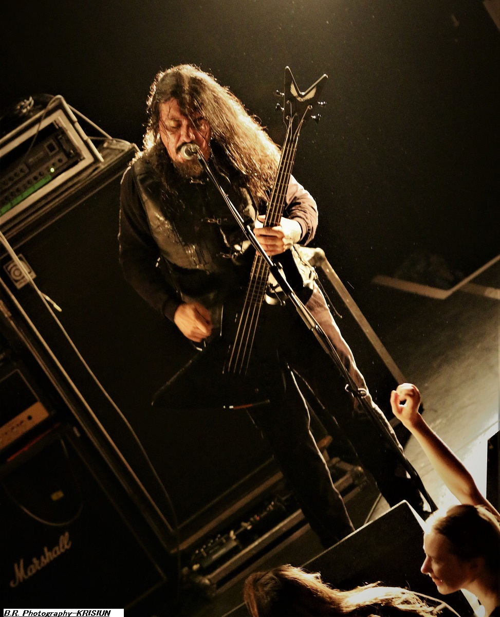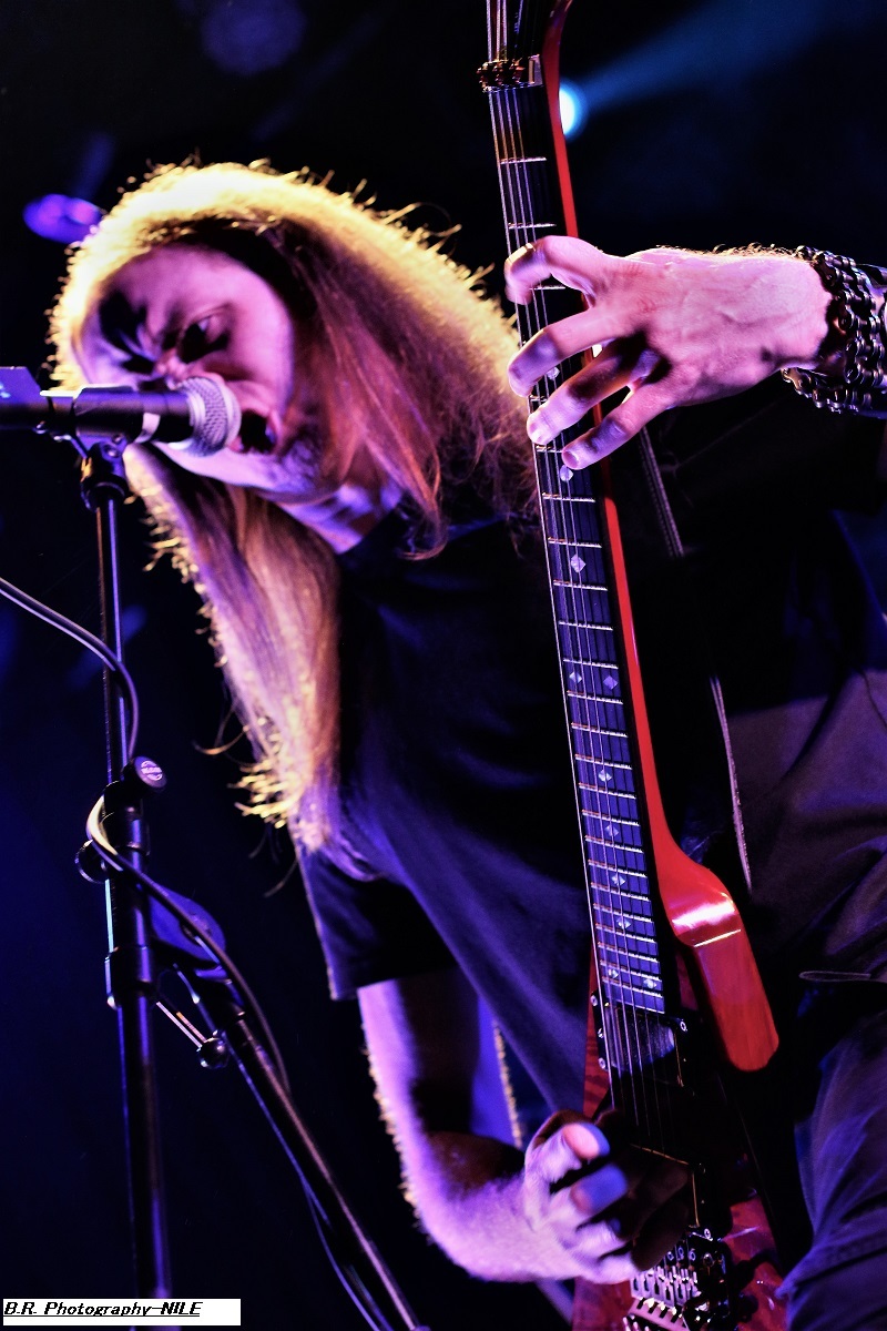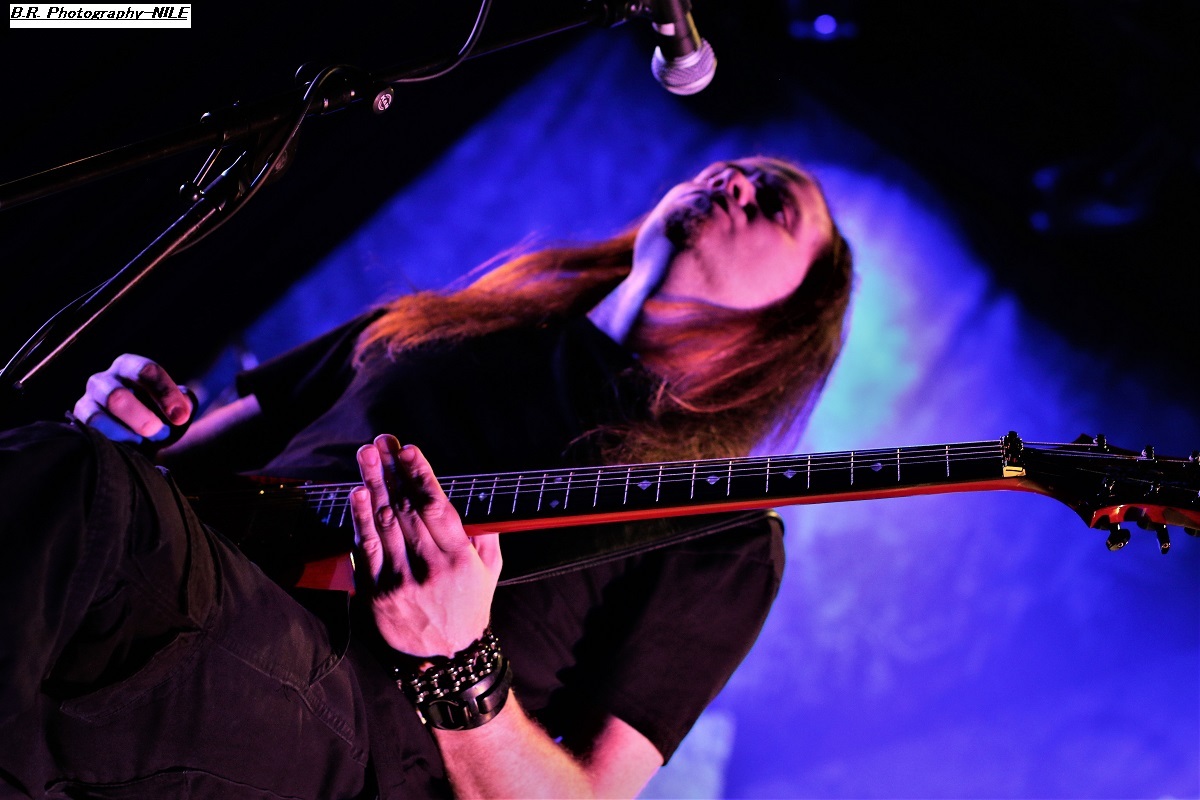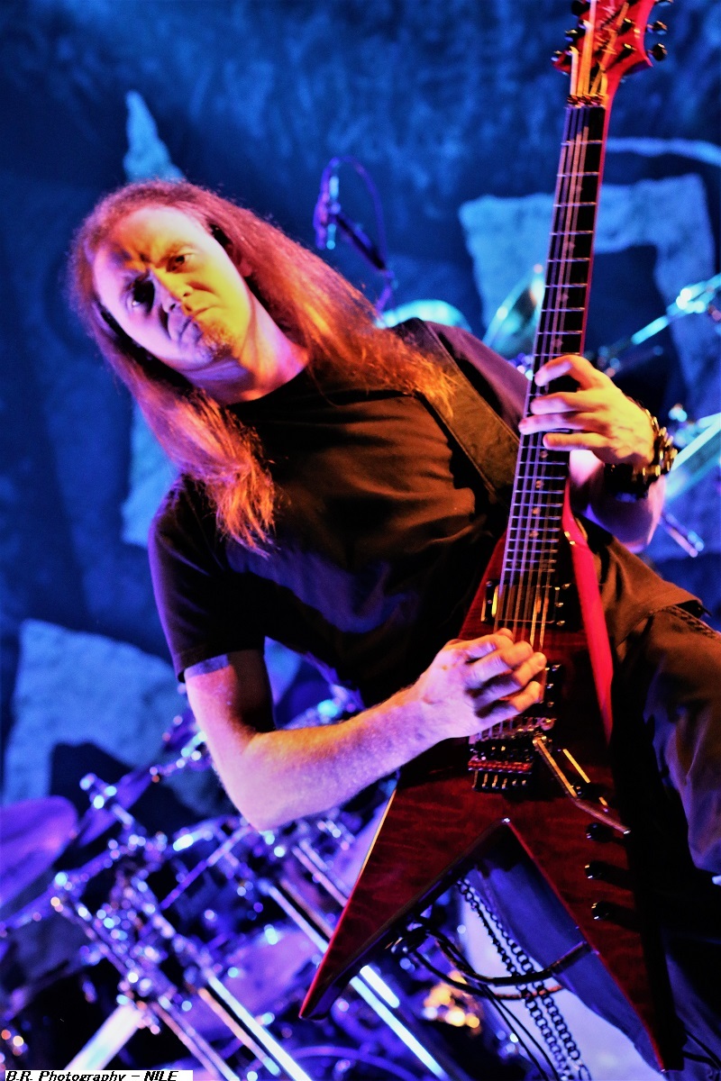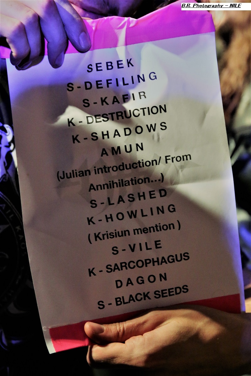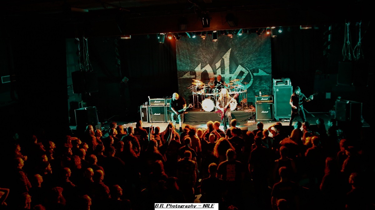 Il est 19heures lorsque les Parisiens de NARAKA entrent en scène devant un public pas encore arrivé. Mais qu’à cela ne tienne ils vont assurer. Nouveau venu sur la scène extrême frenchie le quatuor mixe beaucoup d’influences avec son brutal death qui se veut vraiment agressif en live tout du moins. Un premier album « In Tenebris » est à écouter avec attention si ce n’est déjà fait, on aime ! Que dire ensuite concernant le metal mélodique et par moment extrême, alambiqué et se voulant original de IN ELEMENT ? Ceux de Buenos Aires nous interpellent donc de par leur look particulier et leurs compositions qui nous sont proposées notamment celles de leur dernier album (le 6ème) intitulé « Victory or Defeat ». Leur prestation veut chaotique et déstructurée flirtant avec le metalcore et le goth aussi. Le public maintenant plus consistant adhère, ou pas, D’ailleurs certains quittent le devant de la scène en se demandant si c’est « du lard ou du cochon ». Bon, leur musique sort des sentiers battus et quelque part nous accroche forcément l’esprit, affaire à suivre ! Avec la venue de KRISIUN les fans se massent enfin devant la scène et l’on sent que ça va être brutal de chez brutal avec le trio Brésilien qui d’entrée de jeu nous envoie son metal extrême dans la figure, AARGh ! Krisiun s’est formé en 1990 à l’époque de leurs compatriotes de Sepultura. Et, à l’aide de 12 albums dont le petit dernier appelé « Mortem Solis » ils ont régulièrement ravagé les scènes metal de la planète. Leur son ne souffre d’aucun compromis, Krisiun c’est une machine de guerre bien huilée qui fait toujours mouche et les « tricotages » guitaristiques sèment la panique dans leurs titres au côté de dissonances bien placées. Bref, ce soir ce fus un tsunami violent à la Brésilienne qui nous est tombé dessus ! Set-List : Kings of Killing, Sword into Flesh, Combustion Inferno, Sote, Descending, Vengeance Revelation, Necronomical, Blood of Lions, Serpent Messiah et Hatred Inherit. ET puis, et puis, sur une intro d’ouverture de tombeau pharaonique, les « ricains » de NILE sont apparus devant nous et ont mis d’entrée les pendules çà l’heure. NILE n’a pas modifié sa recette tout au long de son importante discographie. C’est rapide, ça « tabasse », puis tout se calme dans des ambiances orientales lourdes et énigmatiques. Et bien entendu du côté guitares « ça miaule » à tout va, ça nous hérisse les neurones, quel doigté ! Alors, vrai, NILE maintient son cap sans dévier (ou si peu) du concept originel et monte encore d’un cran dans notre esprit avec leur dernier opus réussi « Vile Nilotic Rites ». Mais de toutes façons, et c’est personnel, j’ai hautement apprécié le titre « Sarcophagus » extrait de leur troisième album (le meilleur ?) « In Darkness Shrines » paru en 2022, il y a déjà 20 ans ! Belle affiche encore une fois proposée par Sounds Like Hell Productions bien entendu que nous remercions pour son « à propos », et merci aux 4 groupes en lice pour leurs prestations intéressantes au plus haut point ! |