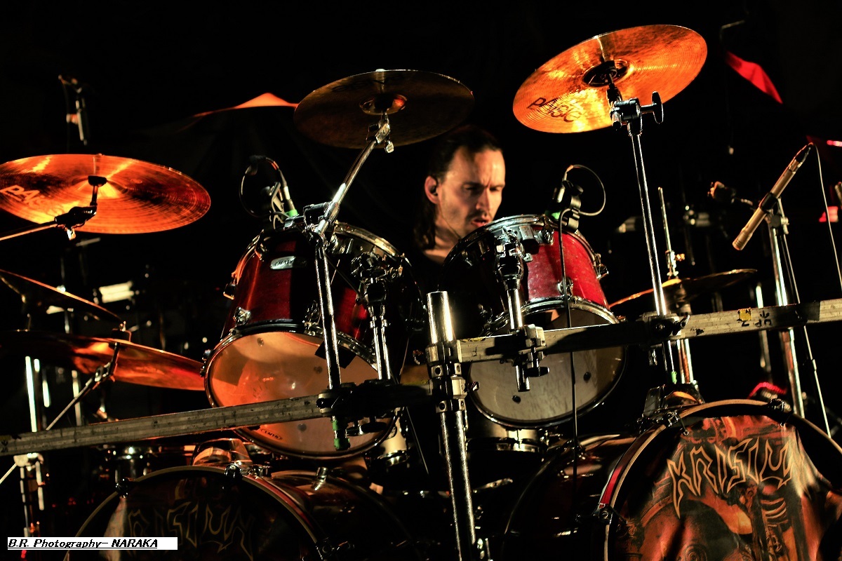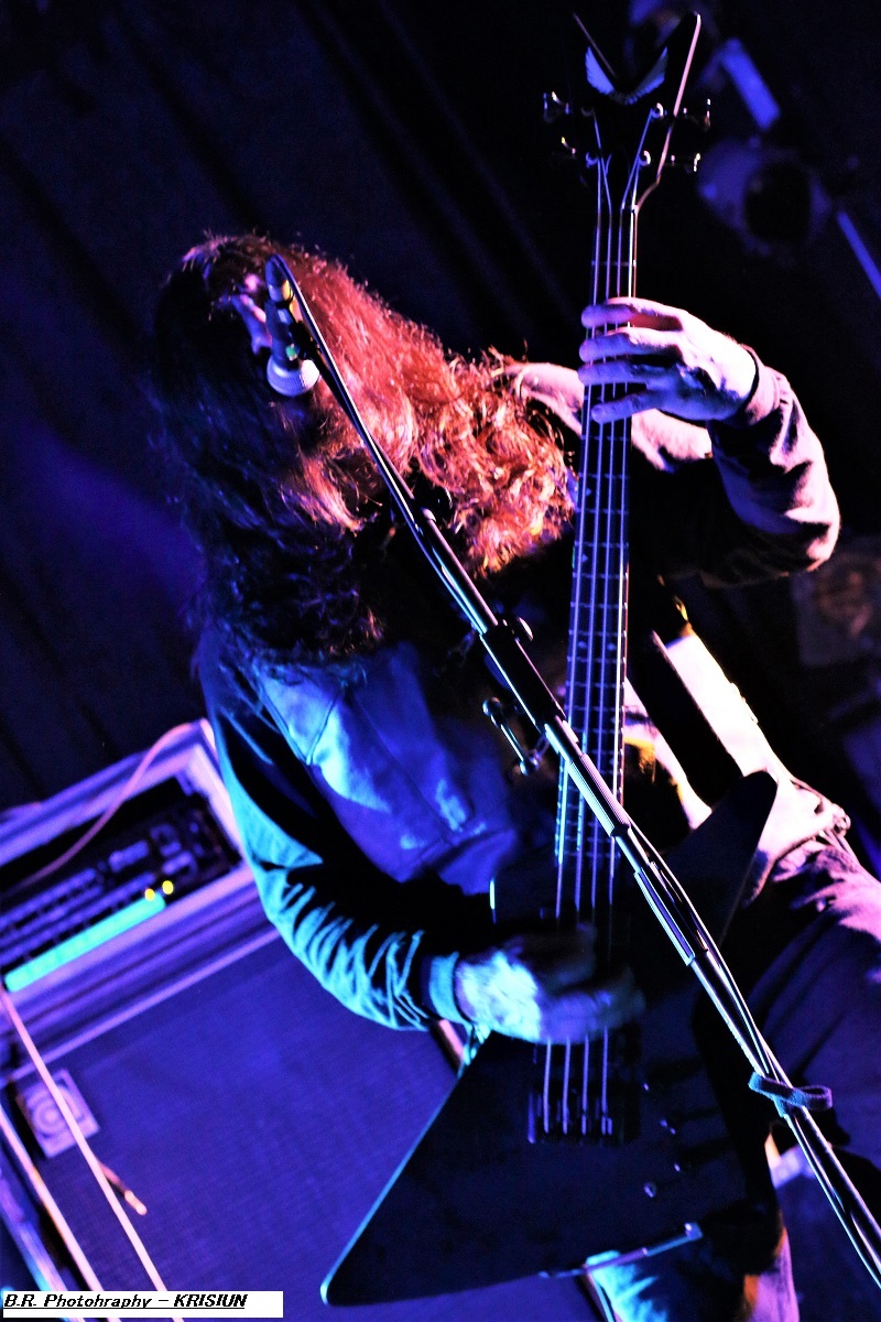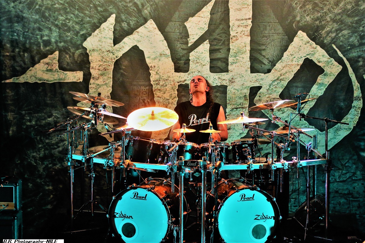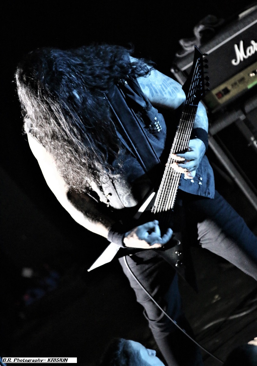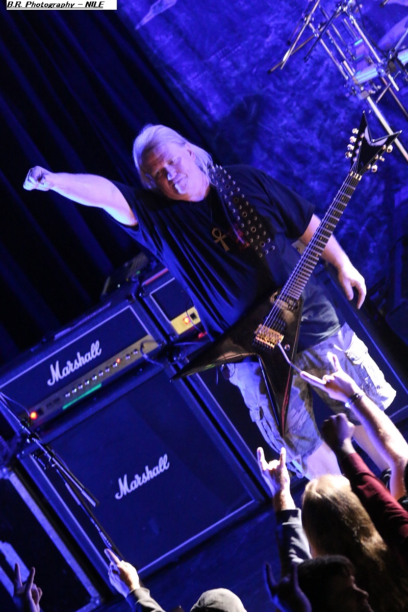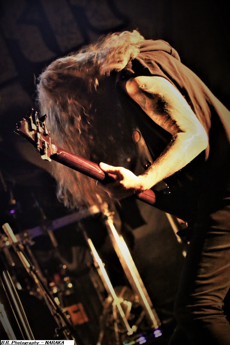 Il est 19heures lorsque les Parisiens de NARAKA entrent en scène devant un public pas encore arrivé. Mais qu’à cela ne tienne ils vont assurer. Nouveau venu sur la scène extrême frenchie le quatuor mixe beaucoup d’influences avec son brutal death qui se veut vraiment agressif en live tout du moins. Un premier album « In Tenebris » est à écouter avec attention si ce n’est déjà fait, on aime ! Que dire ensuite concernant le metal mélodique et par moment extrême, alambiqué et se voulant original de IN ELEMENT ? Ceux de Buenos Aires nous interpellent donc de par leur look particulier et leurs compositions qui nous sont proposées notamment celles de leur dernier album (le 6ème) intitulé « Victory or Defeat ». Leur prestation veut chaotique et déstructurée flirtant avec le metalcore et le goth aussi. Le public maintenant plus consistant adhère, ou pas, D’ailleurs certains quittent le devant de la scène en se demandant si c’est « du lard ou du cochon ». Bon, leur musique sort des sentiers battus et quelque part nous accroche forcément l’esprit, affaire à suivre ! Avec la venue de KRISIUN les fans se massent enfin devant la scène et l’on sent que ça va être brutal de chez brutal avec le trio Brésilien qui d’entrée de jeu nous envoie son metal extrême dans la figure, AARGh ! Krisiun s’est formé en 1990 à l’époque de leurs compatriotes de Sepultura. Et, à l’aide de 12 albums dont le petit dernier appelé « Mortem Solis » ils ont régulièrement ravagé les scènes metal de la planète. Leur son ne souffre d’aucun compromis, Krisiun c’est une machine de guerre bien huilée qui fait toujours mouche et les « tricotages » guitaristiques sèment la panique dans leurs titres au côté de dissonances bien placées. Bref, ce soir ce fus un tsunami violent à la Brésilienne qui nous est tombé dessus ! Set-List : Kings of Killing, Sword into Flesh, Combustion Inferno, Sote, Descending, Vengeance Revelation, Necronomical, Blood of Lions, Serpent Messiah et Hatred Inherit. ET puis, et puis, sur une intro d’ouverture de tombeau pharaonique, les « ricains » de NILE sont apparus devant nous et ont mis d’entrée les pendules çà l’heure. NILE n’a pas modifié sa recette tout au long de son importante discographie. C’est rapide, ça « tabasse », puis tout se calme dans des ambiances orientales lourdes et énigmatiques. Et bien entendu du côté guitares « ça miaule » à tout va, ça nous hérisse les neurones, quel doigté ! Alors, vrai, NILE maintient son cap sans dévier (ou si peu) du concept originel et monte encore d’un cran dans notre esprit avec leur dernier opus réussi « Vile Nilotic Rites ». Mais de toutes façons, et c’est personnel, j’ai hautement apprécié le titre « Sarcophagus » extrait de leur troisième album (le meilleur ?) « In Darkness Shrines » paru en 2022, il y a déjà 20 ans ! Belle affiche encore une fois proposée par Sounds Like Hell Productions bien entendu que nous remercions pour son « à propos », et merci aux 4 groupes en lice pour leurs prestations intéressantes au plus haut point ! |