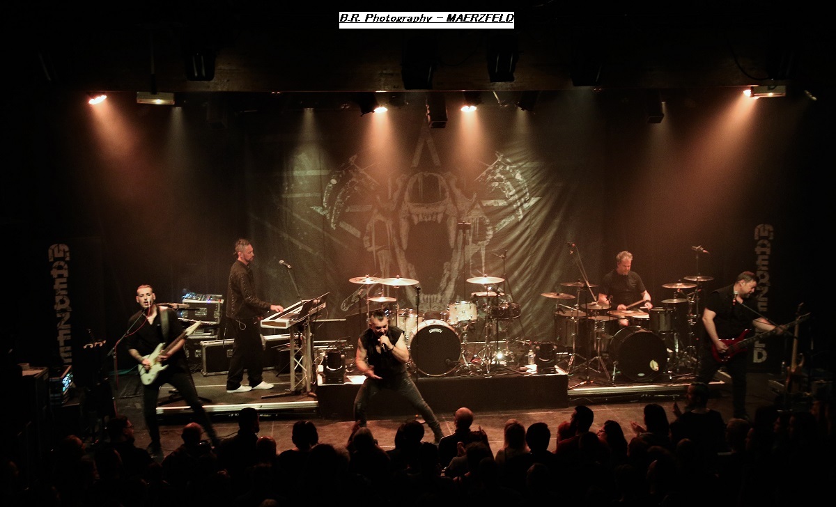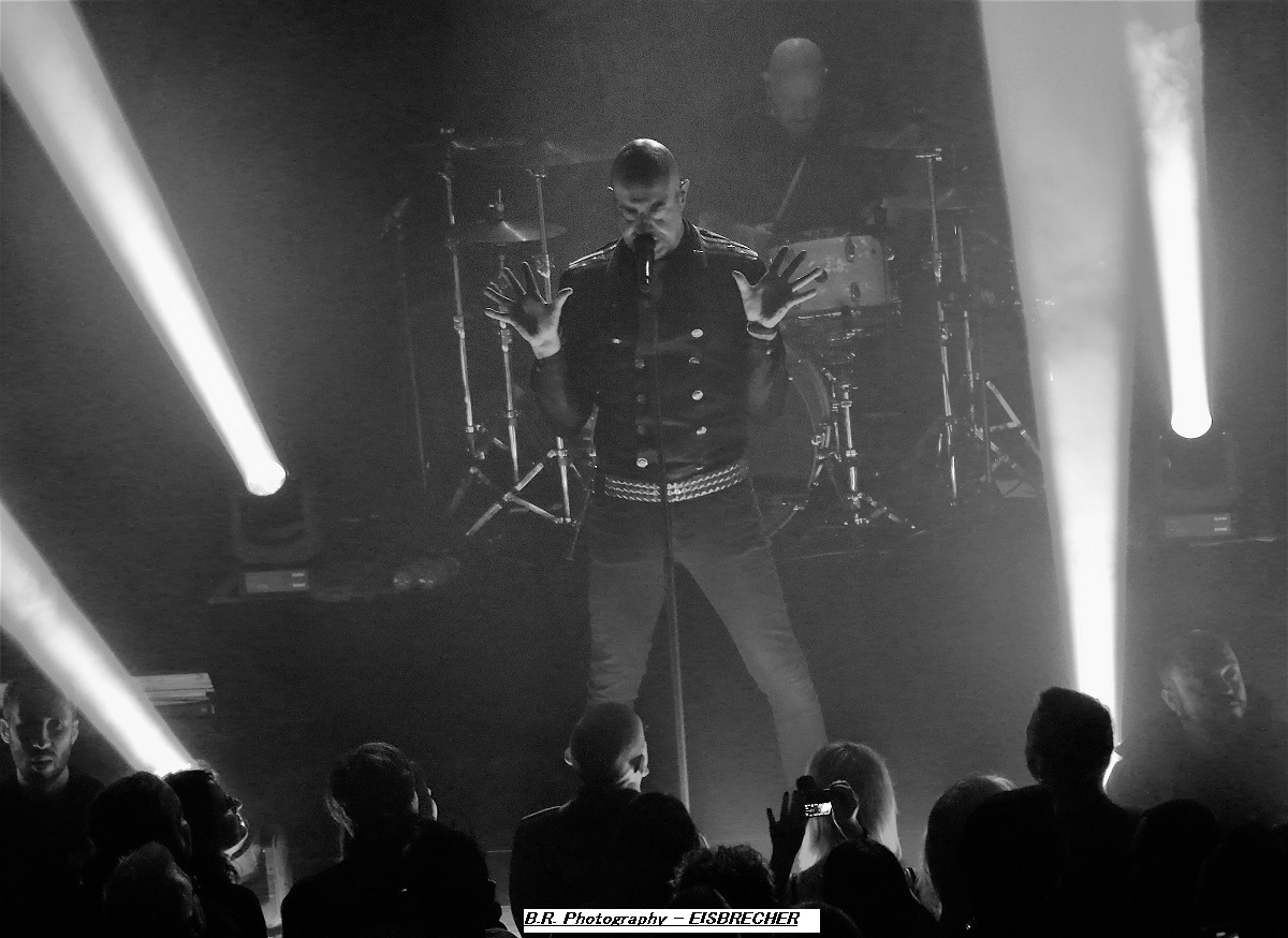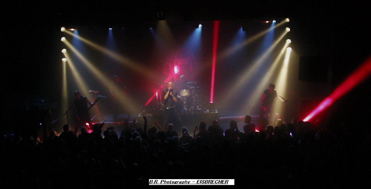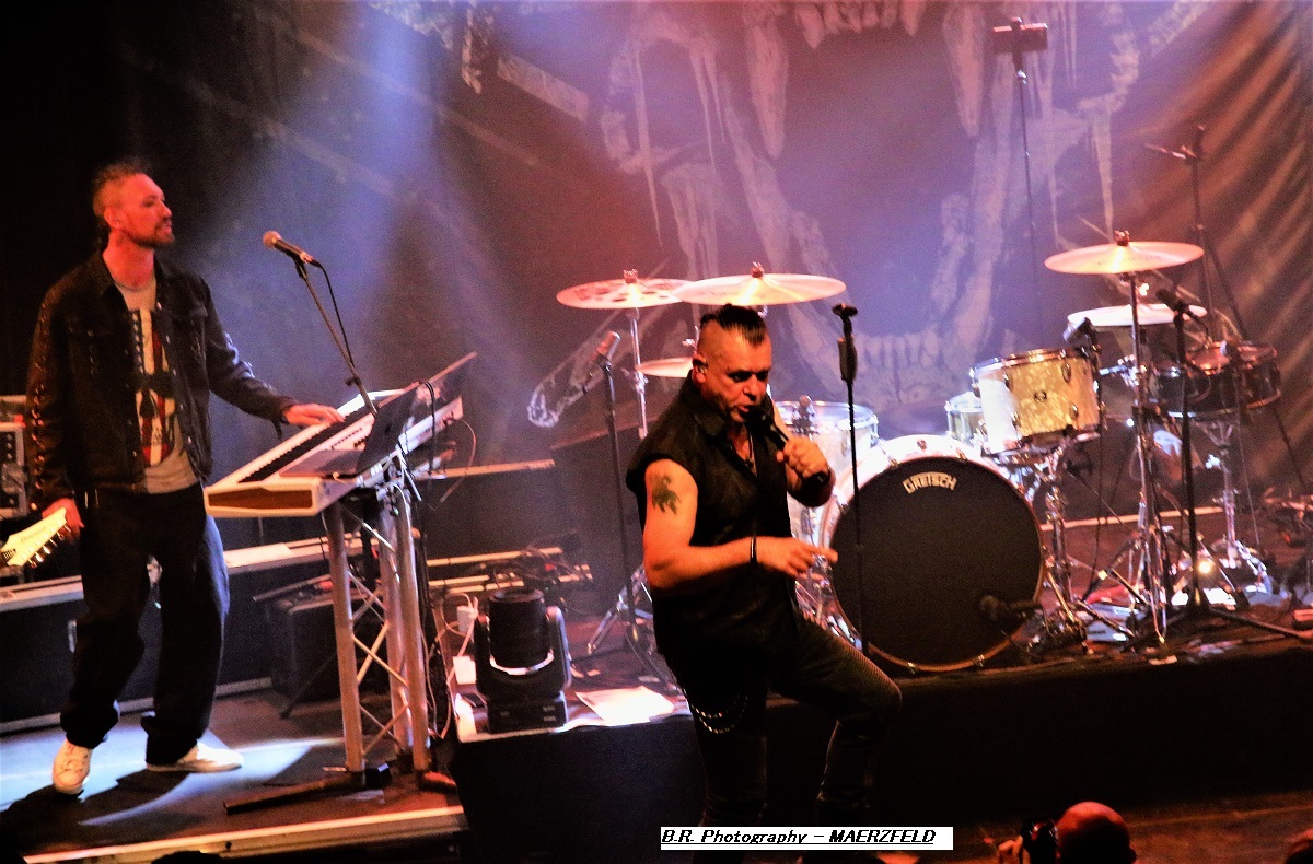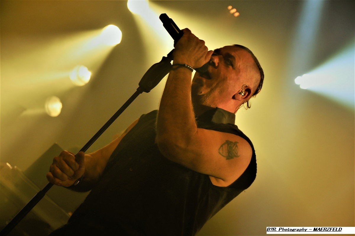 MAERZFELD lance en premier les débats de cette soirée qui s'annonce bien. Le groupe défend en live son nouvel album intitulé « Alles Anders » qui fait suite à « Zorn » paru en 2019. Pas de surprise avec ces rockeurs Allemands qui tiennent la scène en pros du metal indus avec le frontman Heli qui dirige le tout entre mid-tempos et envois musclés avec ce côté martial bien senti.. Maerzfeld marque les esprits depuis sa création en 2009 en digne héritier d'un certain Rammstein. Alors au final nous avons dégusté un bon set de 45 minutes bien apprécié par le public présent et nous avons bien aimé leurs riffs et leurs rythmiques sans concession accompagnant des textes inspirés du quotidien. C'est au tour maintenant d'apprécier le tant attendu combo teuton EISBRECHER qui depuis 2003 joui d'une grosse popularité en Europe et même aux Etats-Unis. Leur tournée « Eis Over Europe 20 th Anniversaire » reportée trois fois (covid oblige) nous,propose en live des titres de leur 8ème album intitulé « Liebe Macht Monster », mais pas que. Eisbrecher est donc une formation Allemande bien connue au sein de la vague « Neue Deutsche Art », formation fondée par des anciens de Megaherz, voilà pour les présentations. Et ce soir sur scène ici à Lyon, ça donne quoi ? Eh bien, avec notamment un leader charismatique (et très bavard,et bout en train NDLR) au travers de lights parfois glacés on nous envoie du lourd, du plombé, du metal indus dans toute sa splendeur quoi ! L'atmosphère créée par le combo est épaisse donc palpable, mais aussi percutante que ce soit au niveau de l'éclairage et au niveau du son métallurgique en diable. Inutile de vous préciser que les fans inconditionnels qui remplissent la salle sont aux anges se mouvant dans ce déluge sonore binaire qui vous glace parfois le sang. Bref cette démonstration de metal indus à l'allemande vibrera encore longtemps dans nos cages à miel c'est certain. Merci Eisbrecher vous revenez quand vous voulez ! Remercions également Maerzfeld dont la musique a marqué les esprits et merci à SLH Productions pour cette soirée hors du temps et de l'espace dans ce bon vieux CCO qui va déménager...plus loin prochainement. |