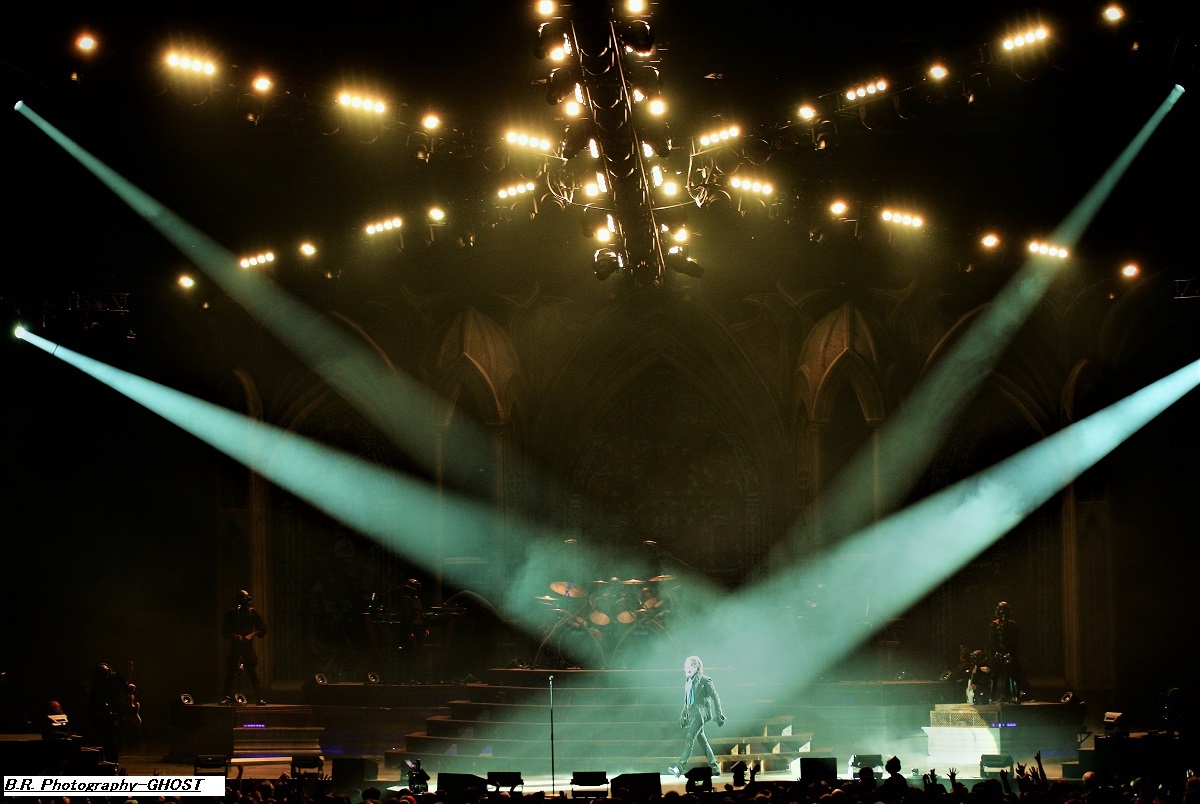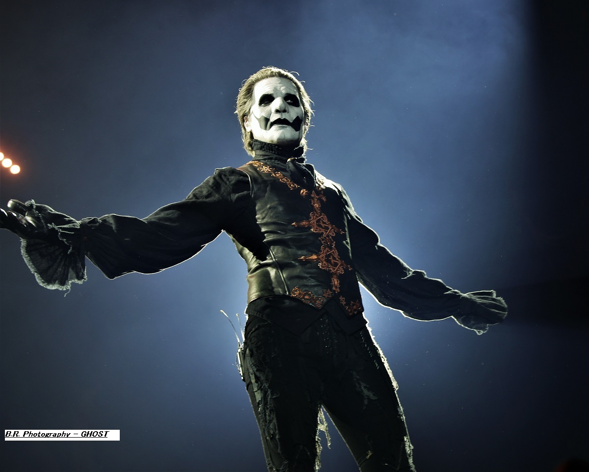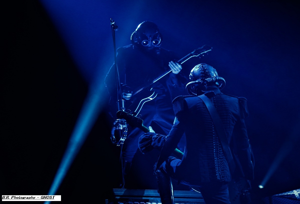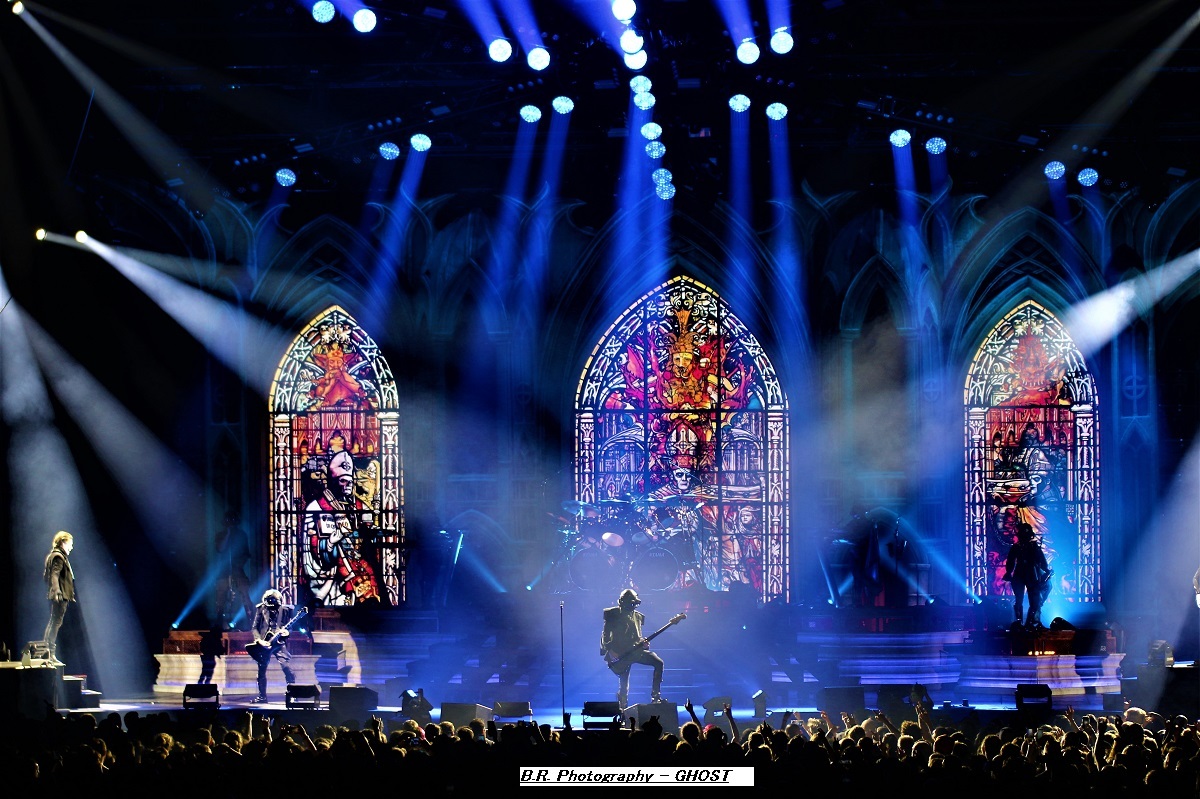 Et c'est un peu avant 20 heures que le concert/spectacle débute avec le quatuor de Vancouver Spiritbox et sa chanteuse Courtney LaPlante quelque peu survoltée sur scène. Ici ce ne sont pas les growls de Jinger pour la gente féminine du metal mais des voix claires que l'on supporte (ou pas) Alors, metalcore/pop ou pop/metalcore, à vous de choisir car il y a quand même du bon parmi le moins bon. En tous cas Spiritbox ne laisse pas indifférent, affaire à suivre donc ! Les dernières minutes d'attente avant 21 heures, l'heure fatidique où le rideau du théâtre de GHOST doit tomber, sont ponctuées par des cris stridents venant de la fosse, aie, vite mes bouchons d'oreilles ! Et le rideau tombe découvrant une scène impressionnante bardée de lights avec l'apparition du maître de cérémonie entouré de ses « nameless ghouls ». C'est donc parti pour presque 2 heures d'une cérémonie de l'église du diable avec pour débuter le titre « Kaisarion » et en milieu de set le fameux « Jesus He Knows Me » (reprise de Genesis). Oui, une reprise tirée du tout récent EP « Phantomime » où Tobias se fait plaisir en exorcisant ses vieux démons de jeunesse. Bien sûr nous aurons droit à des titres du dernier album en date « Impera » qui justifie la tournée actuelle du groupe. La machine infernale est bien huilée entre passages hard/heavy et sucrerie plus pop. Pop, le mot est lâché et le débat entre métalleux de tous poil est lui aussi lancé. En ce qui me concerne je retiens la grandiloquence de la mise en scène avec ses décors et le « dress code » des musiciens qui évoluent dans un show à l'américaine. Alors, Ghost c'est du macabre ? Yes, mais avec un côté « soft » que le groupe ne connaissait pas à ses débuts où il était classé plutôt doom/acide/occulte entre par exemple Black Sabbath et St-Vitus, vous voyez ! Nous allons donc dire que niveau spectacle on en prend plein les mirettes et plein les oreilles, avec juste ce qu'il faut pour faire frissonner un public aux anges (au diable pardon) A vous de juger, mais je suis sûr que tout le monde ici présent ce soir est reparti heureux à la fin du show, et c'est tant mieux ! Merci donc aux organisateurs de la tournée et merci à Eldorado pour le pass photo accordé à Pavillon666, belle soirée en tous cas ! SET-LIST : Kaisarion,Rats, Faith, Spillways, Cirice, Hunter's Moon, Jesus He Knows Me, Rituak, Call Me Little Sunshine, Con Clavi Con Dio, Watcher in the Sky, Year Zero, He is, Miasma, Mary on a Cross, Mummy Dust, Respite on the Spitafileds, Kiss the Go-Goat, Dance Macabre, Square Hammer. |