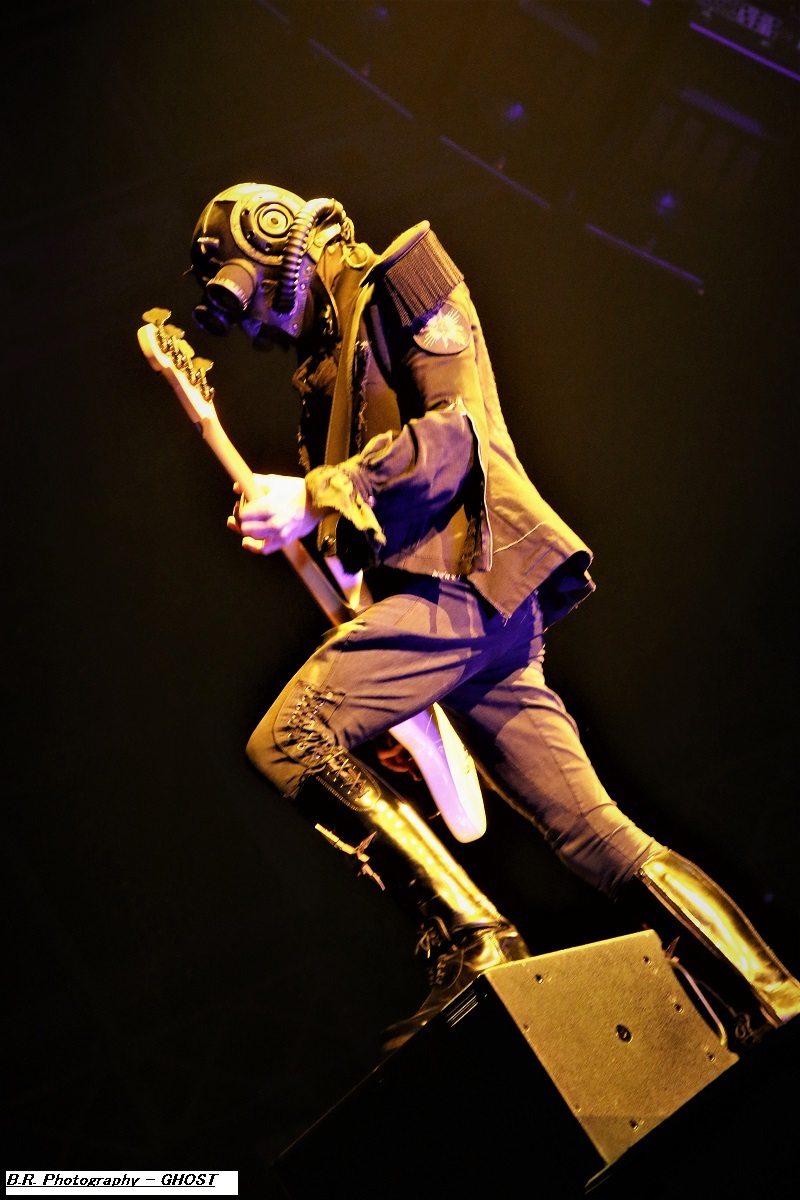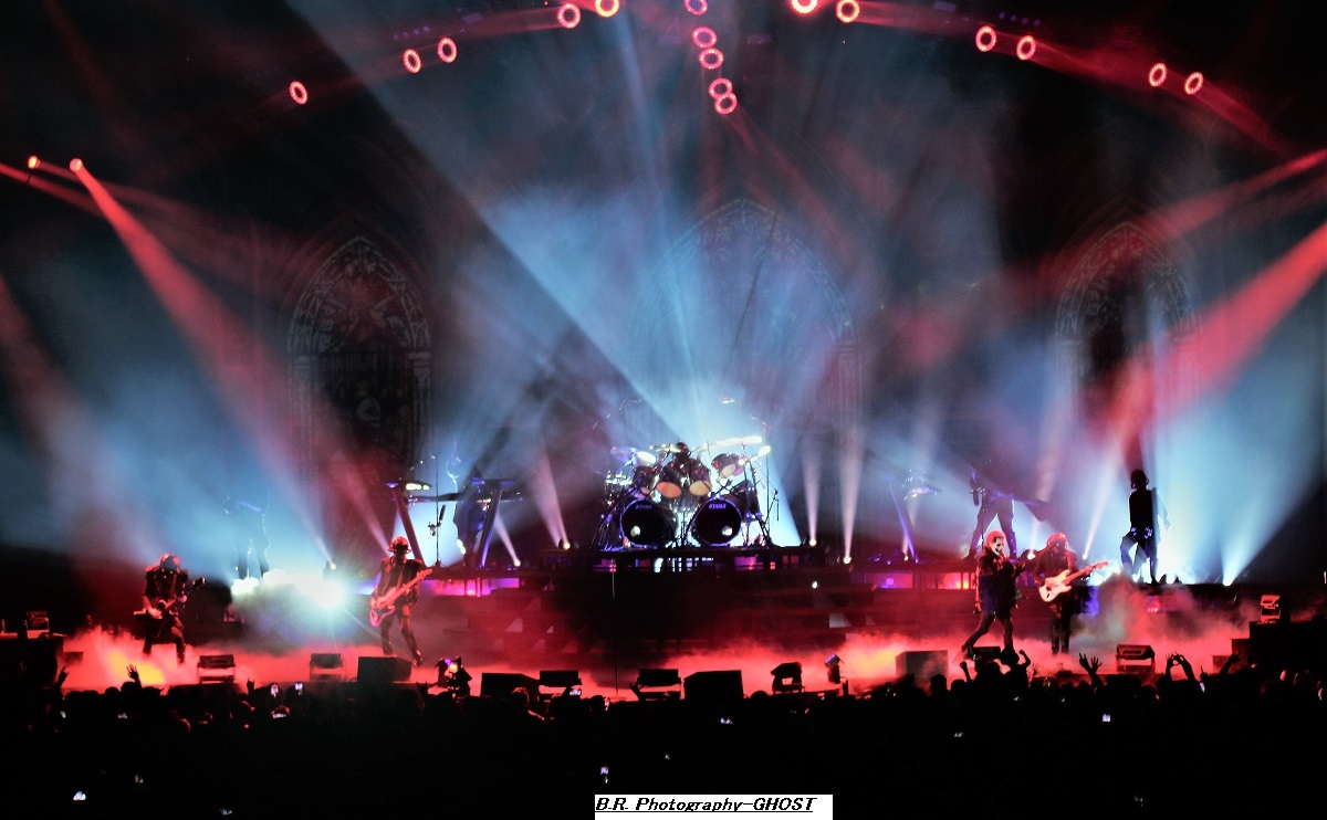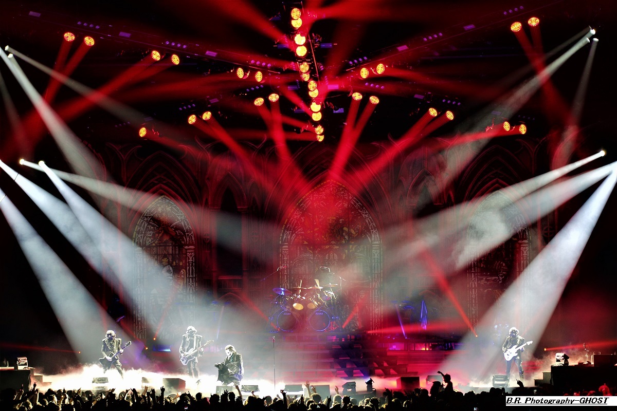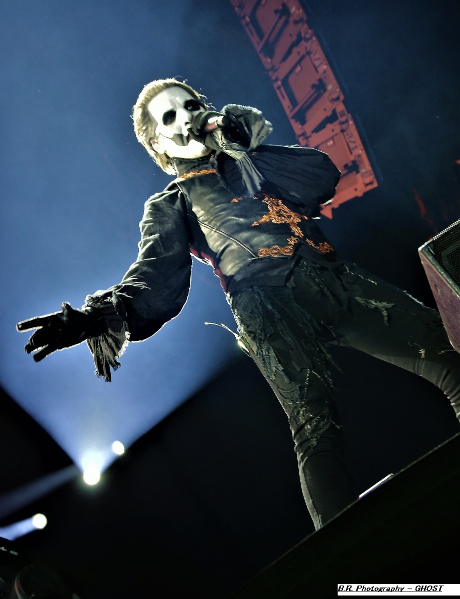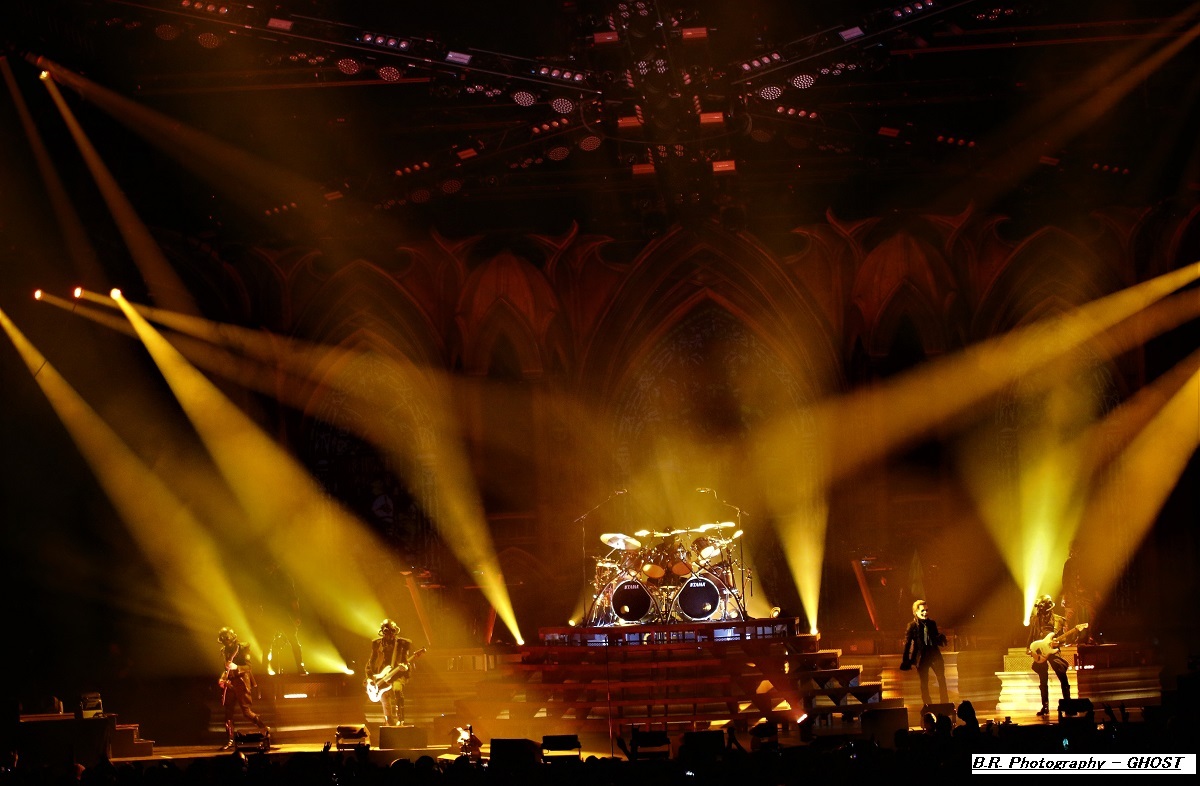 Et c'est un peu avant 20 heures que le concert/spectacle débute avec le quatuor de Vancouver Spiritbox et sa chanteuse Courtney LaPlante quelque peu survoltée sur scène. Ici ce ne sont pas les growls de Jinger pour la gente féminine du metal mais des voix claires que l'on supporte (ou pas) Alors, metalcore/pop ou pop/metalcore, à vous de choisir car il y a quand même du bon parmi le moins bon. En tous cas Spiritbox ne laisse pas indifférent, affaire à suivre donc ! Les dernières minutes d'attente avant 21 heures, l'heure fatidique où le rideau du théâtre de GHOST doit tomber, sont ponctuées par des cris stridents venant de la fosse, aie, vite mes bouchons d'oreilles ! Et le rideau tombe découvrant une scène impressionnante bardée de lights avec l'apparition du maître de cérémonie entouré de ses « nameless ghouls ». C'est donc parti pour presque 2 heures d'une cérémonie de l'église du diable avec pour débuter le titre « Kaisarion » et en milieu de set le fameux « Jesus He Knows Me » (reprise de Genesis). Oui, une reprise tirée du tout récent EP « Phantomime » où Tobias se fait plaisir en exorcisant ses vieux démons de jeunesse. Bien sûr nous aurons droit à des titres du dernier album en date « Impera » qui justifie la tournée actuelle du groupe. La machine infernale est bien huilée entre passages hard/heavy et sucrerie plus pop. Pop, le mot est lâché et le débat entre métalleux de tous poil est lui aussi lancé. En ce qui me concerne je retiens la grandiloquence de la mise en scène avec ses décors et le « dress code » des musiciens qui évoluent dans un show à l'américaine. Alors, Ghost c'est du macabre ? Yes, mais avec un côté « soft » que le groupe ne connaissait pas à ses débuts où il était classé plutôt doom/acide/occulte entre par exemple Black Sabbath et St-Vitus, vous voyez ! Nous allons donc dire que niveau spectacle on en prend plein les mirettes et plein les oreilles, avec juste ce qu'il faut pour faire frissonner un public aux anges (au diable pardon) A vous de juger, mais je suis sûr que tout le monde ici présent ce soir est reparti heureux à la fin du show, et c'est tant mieux ! Merci donc aux organisateurs de la tournée et merci à Eldorado pour le pass photo accordé à Pavillon666, belle soirée en tous cas ! SET-LIST : Kaisarion,Rats, Faith, Spillways, Cirice, Hunter's Moon, Jesus He Knows Me, Rituak, Call Me Little Sunshine, Con Clavi Con Dio, Watcher in the Sky, Year Zero, He is, Miasma, Mary on a Cross, Mummy Dust, Respite on the Spitafileds, Kiss the Go-Goat, Dance Macabre, Square Hammer. |