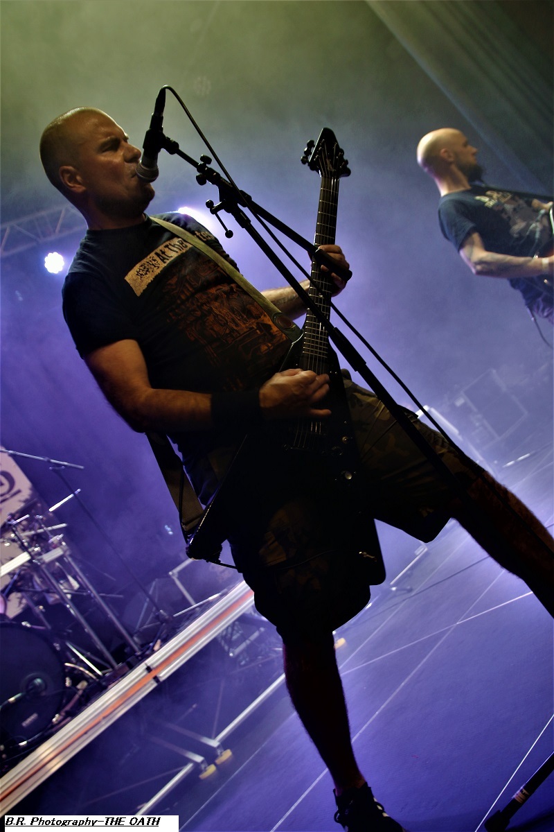 Il est 12 heures 30 à la pendule de Montagny lorsque la légion Romaine DEOS envahit la grande scène du Trait d'Union. La bannière SPQR est plantée et Deos-Legio a su conquérir un public venu en nombre avec son metal épique ¨C'est « Furor Belli » si vous voulez comme l'indique le titre de leur troisième album qui a marqué les esprit. Ce fus bien bon avec ces riffs guerriers venus de Boutae (Annecy) qui nous ont fait entrer dans le festival à l'aide d'un black-death authentique et tranchant comme un glaive Roamain cela va de soi ! S'en suit maintenant THE OATH en trio cette fois-ci qui avait débuté sa carrière en 1999 (1666?) à Lyon. Pierre a toujours la rage black-death et son surnom de « destructeur » n'est pas usurpé. Et ce fus violent dans tous les sens du ,terme avec ces compositions parfois alambiquées et dissonantes, mais toujours acérées comme les griffes d'un lion (sic). Merci beaucoup les gars nous avons aimé ! LODZ nous emmène ensuite sur les chemins tortureux et torturés d'un metal mixant habilement le post-rock, le post-metal, c'est disons-le du post quelque-chose avec des ambiances inattendues et des envolées lame de rasoir. Lodz a fait sa place dans la sphère du metal/prog etl'on aime (ou ,pas). En tous cas aujourd'hui à Montagny leur set fus apprécié ,à sa juste valeur, amen ! Le black d'AORLHAC s'est inspiré d'une certaine culture, la culture occitane pour être précis. Et, comment dire, leurs compositions maintenant bien connues et leur interprétation en live sont toujours de haut-niveau . Alors en cet après-midi orageux de Juin nous avons été encore une fois surpris par la qualité de leur prestation incroyablement émotionnelle. La fin d'après-midi va être de plus en plus agitée avec notamment la venue des death-metalleux Allemands NECROTTED, un death flirtant allègrement avec le « core », alors deathcore si vous voulez ! Alors ce fus mouvementé et abrasif, tout ce que l'on aime quand c'est bien « rentre dedans ». Et aujourd'hui, cerise sur le gâteau, c'est Julien Truchan de Benighted qui rejoindra le groupe sur le titre « Asocial Media Whore », que du bonheur donc ou du malheur pour nos conduits auditifs si vous voulez. Set imparable donc qui a fait monter d'un cran la température dans la salle. Et maintenant place à CYTOTOXIN qui selon le slogan « inactif aujourd'hui, radioactif demain » va nous irradier avec une prestation incroyable qui va marquer les esprits et les corps. Le brutal death technique de nos cousins Germains que la critique a nommé le « Tchernobyl death-metal » ne fait pas dans le yaourt nucléaire mais c'est du solide et du très imagé. Le public va se défouler entre les fûts de déchets et va être atomisé pour de bon. Quelle prestation ; , et quelle ambiance dans ces « circle-pits » infernaux ! Mais ne partez pas, car maintenant en ce début de soirée agitée, les Allemands de PARASITE INC. Vont nous « plomber » la cervelle à l'aide d'un death-metal biberonné au heavy, vous me suivez ? Non, eh bien vous n'aviez qu'à être présent à Montagny ce soir orageux. Mais mince c’était sold-out, normal me direz-vous pour beaucoup de raisons diverses. Bon, et bien Parasite Inc. Nous en à mis plein la « g...le » comme dirait mon ami le keupon fou. A l'aide d'une rythmique infernale lourde et saccadée et d'une bonne dose d'agressivité toute la salle fus retournée, excellent ! On ne présente plus PESTILENCE, les vétérans du thrash/death Néérlandais, et après moult changement de line-up et une discographie longue comme le bras ils sont venus ce soir à Montagny nous détruire ce qu'il nous reste de neurones. Après des déviances relativement prog, le groupe en revient à ses premières amours à savoir un bon death-metal brut de décoffrage avec toujours un côté dissonant pour pimenter le tout. Et ça marche car Pestilence est toujours bien vivant au royaume du metal-de-la-mort-qui-tue ! Cette journée du Samedi nous a offert le monde des Romains avec Deos et maintenant nous allons la terminer avec les Grecs de ROTTING CHRIST, retour dans une certaine antiquité donc. ROTTING CHRIST qui fondé en 1987 possède une discographie imposante initialement tournée vers le black-metal mais qui a ensuite évolué dans une veine plus dark, plus gothique, plus atmosphérique, plus occulte, plus mythologique dans les inspirations. Et nous avons toujours à apprécier leur énergie quasiment religieuse, leurs riffs incontournables, leurs envolées épiques avec des chorus bien placés. Bref, dire que ce soir les Athéniens étaient très attendus relève d'un doux euphémisme. Les frères Tolis, Sakis et Them, Van Ace et George Emmanuel ont remplit leur contrat ce soir en nous emmenant loin, très loin dans un certain rituel mythique hors du temps et de l'espace, et ce fus bien ! Fin de la première journée du Lions Metal Fest, à suivre la seconde, même lieu prochainement sur Pavillon666. |