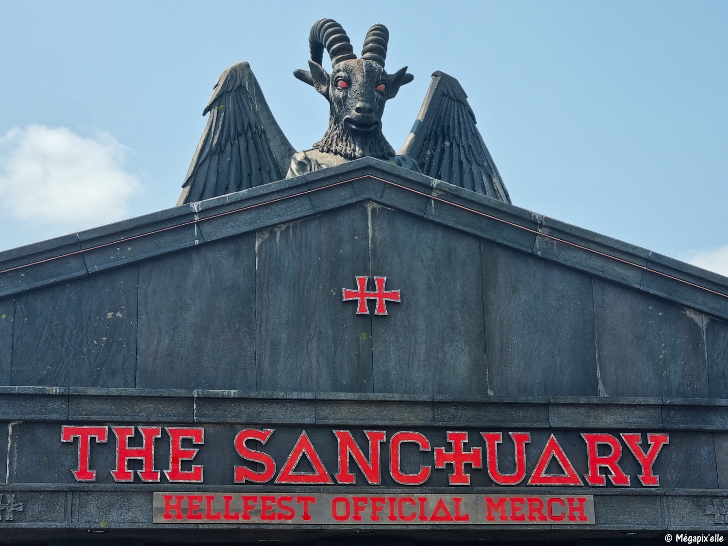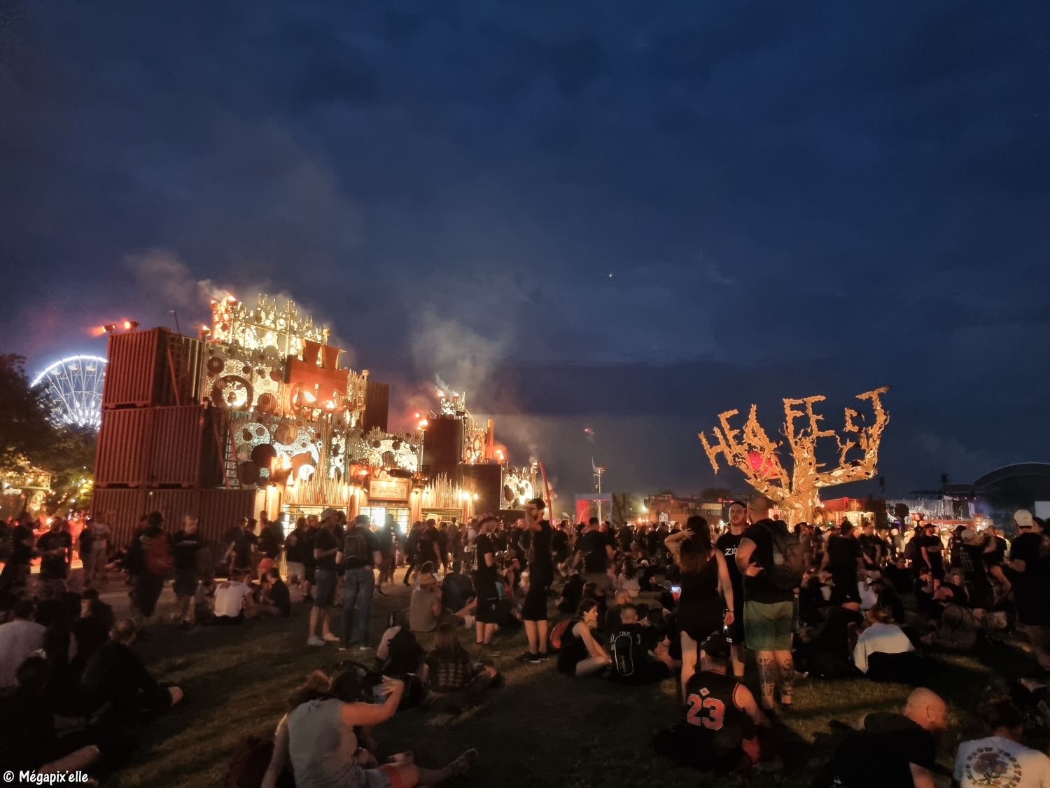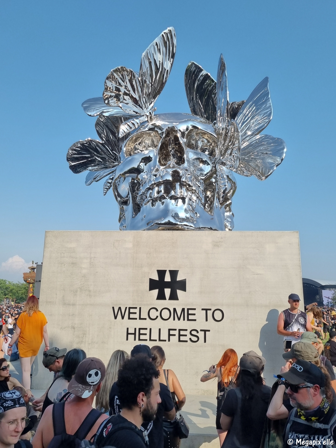 Passé l’entrée, la cathédrale, il y a un chouette spot Instagram avec le crâne à papillons tout chromé posé sur un socle avec le « Welcome to Hellfest » qui m’a laissé froid. En revanche, ils ont légèrement découpé la zone PMR (ou réaménagé) ce qui fait qu’il n’y a plus cet effet de goulot quand on arrive sur la mainstage 01, ça, c’est bien vu.