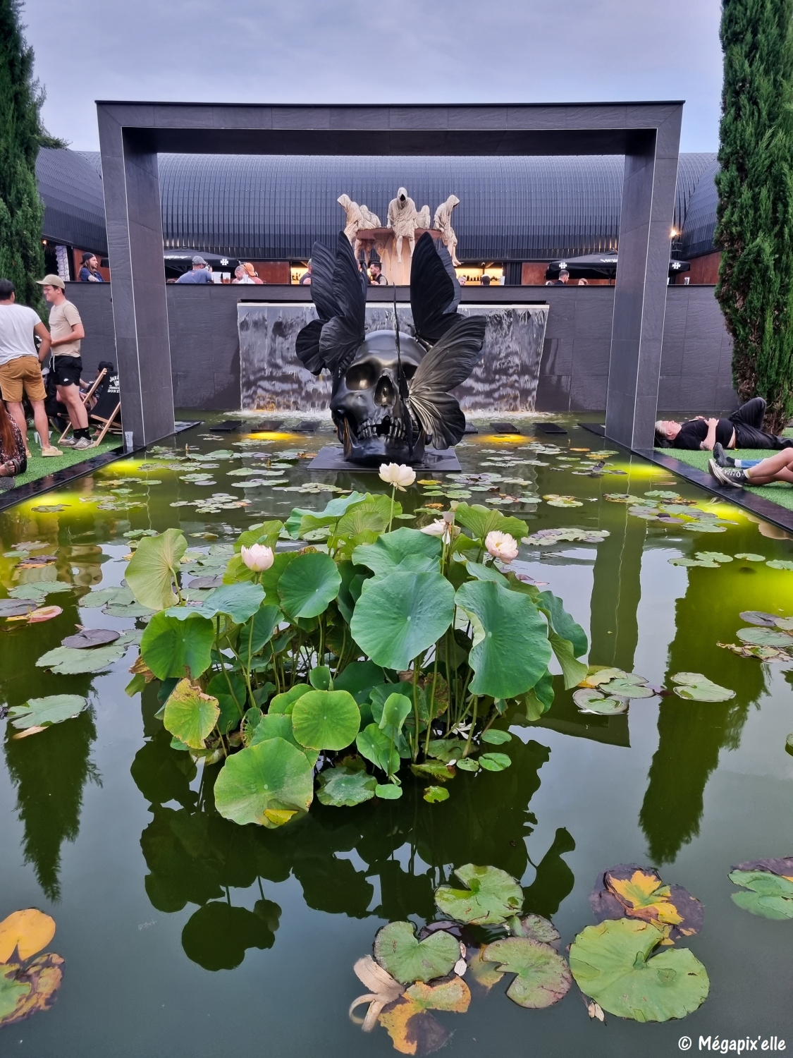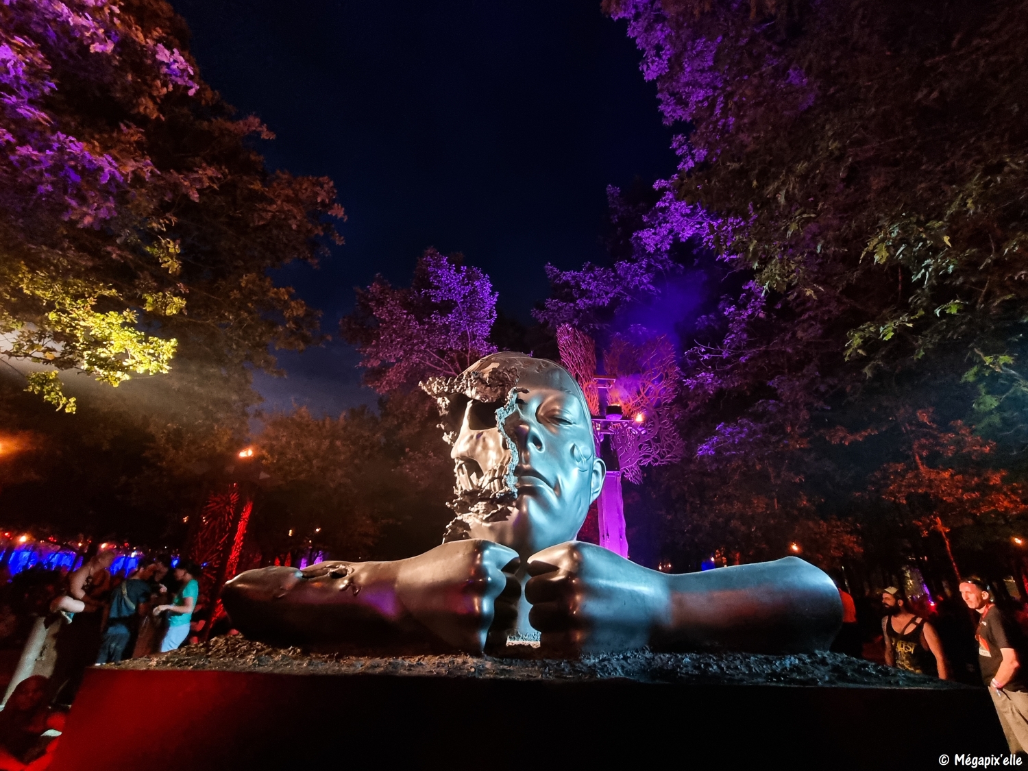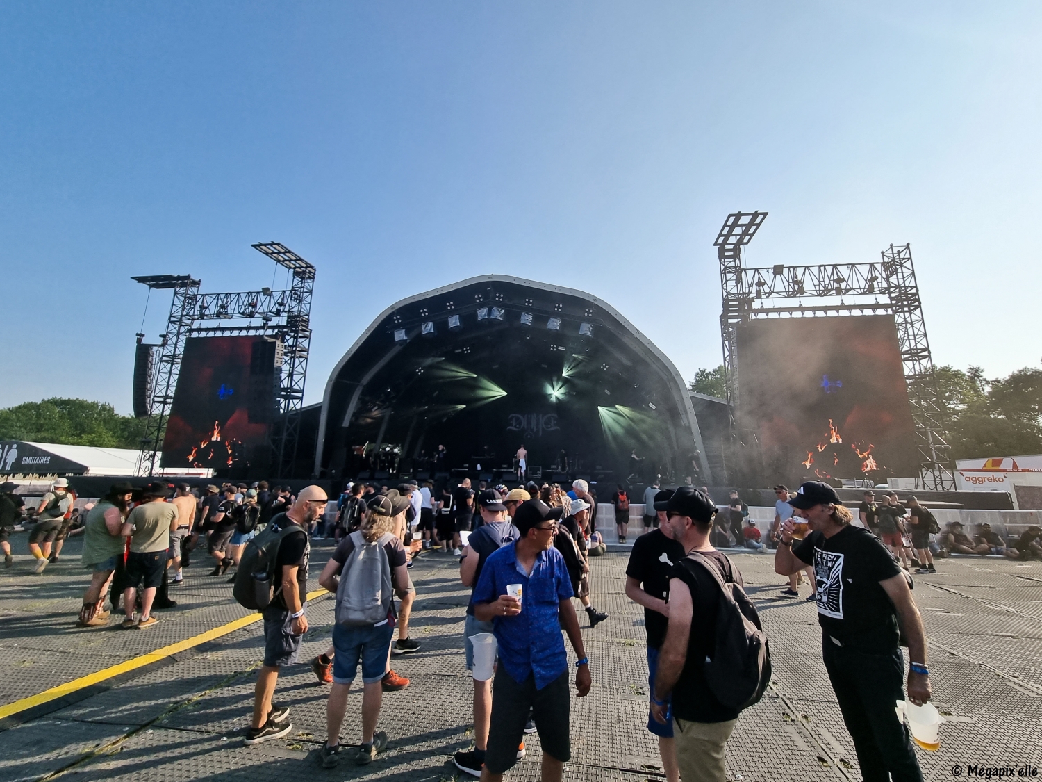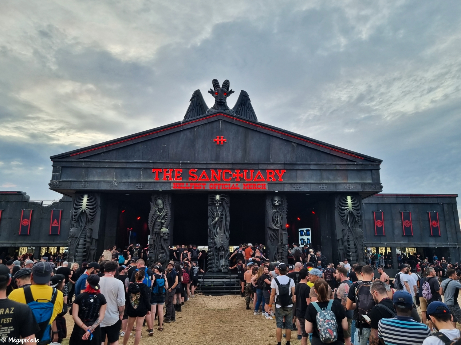 Passé l’entrée, la cathédrale, il y a un chouette spot Instagram avec le crâne à papillons tout chromé posé sur un socle avec le « Welcome to Hellfest » qui m’a laissé froid. En revanche, ils ont légèrement découpé la zone PMR (ou réaménagé) ce qui fait qu’il n’y a plus cet effet de goulot quand on arrive sur la mainstage 01, ça, c’est bien vu.