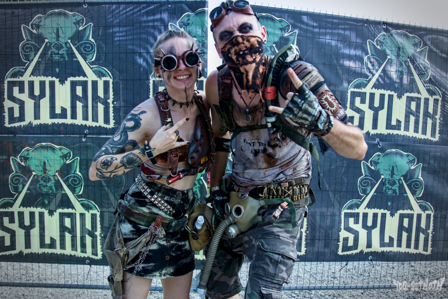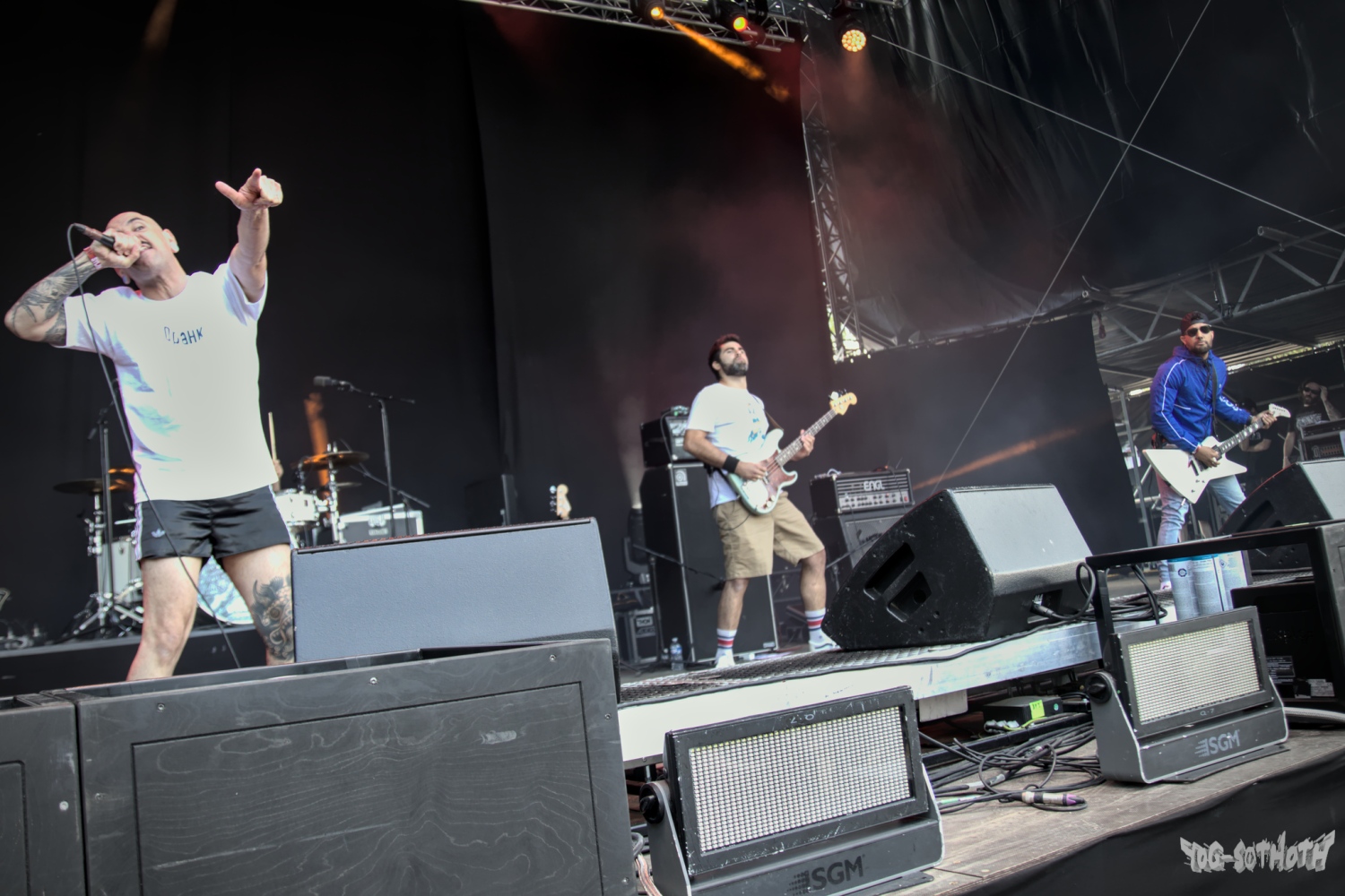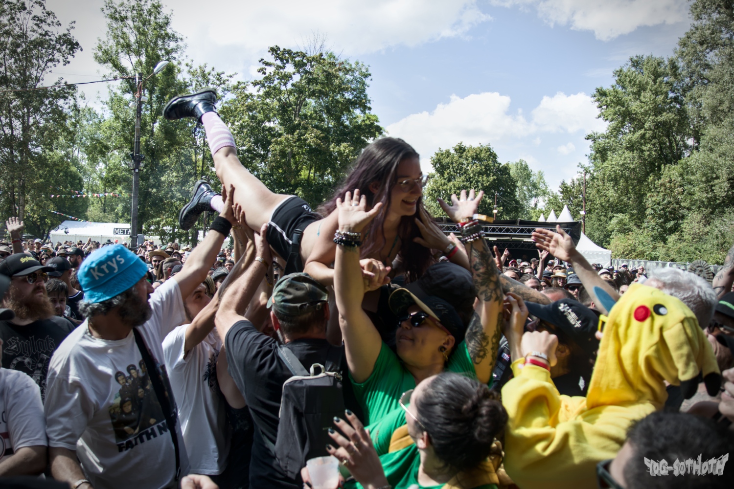 11h30 : Ce sont les Lyonnais de Buy Jupiter qui montent sur scène les premiers en cette fin de matinée, bien décidés à réveiller le public déjà présent. Créé en 2012 ce groupe distille un death métal progressif légèrement teinté de punkcore, un son vraiment particulier qui n’appartient qu’a eux. Le public accroche d’entrée, PY le frontman fait à lui seul le show escaladant les enceintes, les piliers de scène, il n’hésite pas à franchir les crash barrières et descendre pour évoluer directement dans le pit au milieu des mosheurs ravis. Le bassiste, le batteur et les deux guitaristes s’en donnent également à cœur joie pour nous livrer un set intense de 30mn à vous ronger le cortex préfrontal. 12h30 : Beyon The Styx formation de Tour frappe fort dès le premier titre. Les gaillards ne sont pas venus pour ramasser des pâquerettes mais plutôt pour nous foutre une bonne branlée à grand coups de rythmiques assassines et de vocal corrosif, ils nous balancent un métal hardcore plutôt groovy extrêmement efficace et ravageur, le chanteur est vraiment habité par sa musique et ses paroles. Leur set finira par faire émerger les plus comateux ! 13h30 : Changement complet de décor avec Krav Boca, un collectif d’artistes français, grec et marocain formé à Toulouse en 2014. Ils nous présentent un spectacle complet avec deux performeurs sur une musique plutôt orientée Punk Rap Métal hyper rythmé et festif, on en prend plein les yeux et les oreilles, tout cela n’est pas sans évoquer les shows de Punish Yourself, Ludwig Von 88 sur fond de Moscow Death Brigade. Un excellent moment et une très belle découverte. 14h40 : C’est au tour de Grade 2. Originaires L'île de Wight, les trois musiciens évoluent dans un style old-school mixant le punk Oï et Punk Rock Californien. Efficace et rythmé leur instru frénétique et leur compos variées vont entraîner le public dans des pogos et slams effrénés ça remue dans le pit, ça jump, un véritable tourbillon à tel point que le set passe à la vitesse de l’éclair. Dommage, on en aurait bien repris encore ! 15h50 : On reste dans le punk mais cette fois du punk celtique avec les Canadiens de The Real McKenzies qui mettent instantanément la fièvre au pit, une ambiance de fête s’installe et tout le monde se met à danser au son de la cornemuse et des riffs de guitare. Même si Paul McKenzie, fondateur et chanteur du groupe semble un peu fatigué derrière ses lunettes jaunes, il envoie le bois pendant tout le show pour la plus grande joie des festivaliers et slammeurs en liesse ! 17h00 Place au Hard rock Sudiste maintenant avec les fameux américains de Nashville Pussy. Le groupe se compose de Blaine Cartwright au chant et à la guitare, sa femme Ruyters Suys à la guitare, de l’excellente bassiste Bonnie Buitrago, ils sont accompagnés par un nouveau batteur, enfin nouveau dans le groupe depuis cette tournée européenne car il s’agit du talentueux Dusty Watson (Dick Dale, Agent Orange, Sonics, Supersuckers, Lita Ford, Rhino Bucket, Concrete Blonde, The Bellrays… et des bien d'autres) il connaît d’ailleurs très bien Bonnie Buitrago puissent qu’ils ont joué ensemble il y a bien longtemps dans son ancien groupe Bloodhook. C’est parti pour 45 mn d’un show incendiaire qui ne nous laisse pas une minute de répit, les titres se suivent à la vitesse d’un cheval au galop.Derrière les riffs ravageurs de Ruyter, la voix rauque et puissante de Blaine, les lignes de basse ensorcelées de Bonny et les rythmes effrénés de Dusty on ressent une véritable symbiose entre les 4 musiciens qui fait mouche à tous les titres et nous entraîne dans un véritable tornade de rock'n'roll fun, crasseux et bien burné. 18h15 Ce n’est pas aux sons des trompettes que les Walls of Jericho investissent la scène mais sous les acclamations du public prêt à faire tomber les murs. La charismatique frontwoman Candace Kucsulain donne d’entrée le tempo et c’est parti pour la boucherie, on se prend un TGV complet dans la tronche. Les titres s'enchaînent, tous plus puissants les uns les autres et c’est à présent un énorme nuage de poussière qui s’élève depuis le pit sous les pas des mosheurs. Candace arpente la scène de long en large tout en interagissant avec le public conquit, sa voix dévastatrice colle parfaitement au hardcore punk violent et énergique qu’envoie le groupe, les morceaux percutent à chaque fois. Ce sera certainement pour moi un des meilleurs moments de la journée. ------------------------------------------------------------------------------------------------------- MOONSPELL Le groupe portugais que j’ai eu l’occasion et le plaisir de suivre plusieurs fois est heureux de se produire au SYLAK. Cela se voit. Fondé en 1989, à l’origine groupe de metal gothique, parfois proche du black metal, plus souvent du death metal, avec Fernando Ribeiro au chant, leader de la formation, MOONSPELL aura conquis le public de Saint-Maurice. Le spectacle n’était pas que sur scène, mais aussi dans la fosse, on ne comptait pas les pogos et autres slams. L’intervention des Portugais aura duré 50 minutes (seulement !) Les Islandais de SOLSTAFIR sont moins connus. On les a vus en mars dernier au Ninkasi Kao de Lyon et même dans les cloîtres de Brou à Bourg-en-Bresse il y a plusieurs années. Ils évoluent dans un univers assez sombre, le chanteur est reconnaissable à sa voix légèrement rauque. Le public, intéressé mais pas déchaîné, aura, pour certains, découvert un groupe du Nord assez particulier mais plein de qualités et d’originalités. Une tournée en Allemagne est prévue pour l’automne qui s’annonce. Nous aurons maintenant, durant une heure, le plaisir de voir ou revoir l’un de mes groupes favoris, à savoir les Brésiliens de SEPULTURA. Je les ai vus cinq ou six fois, en France et en Allemagne. Fondé par les frères Cavalera en 1984, SEPULTURA est 