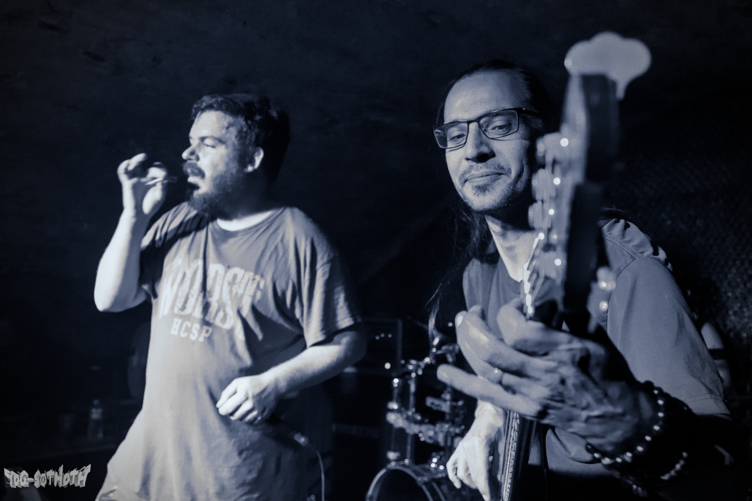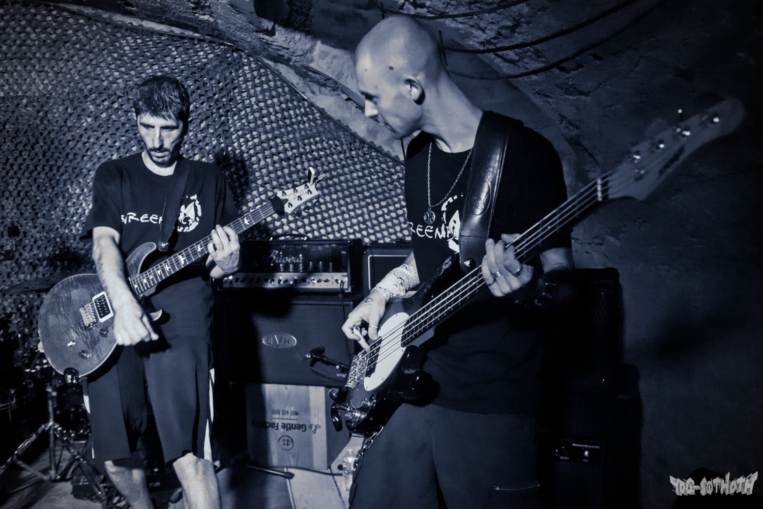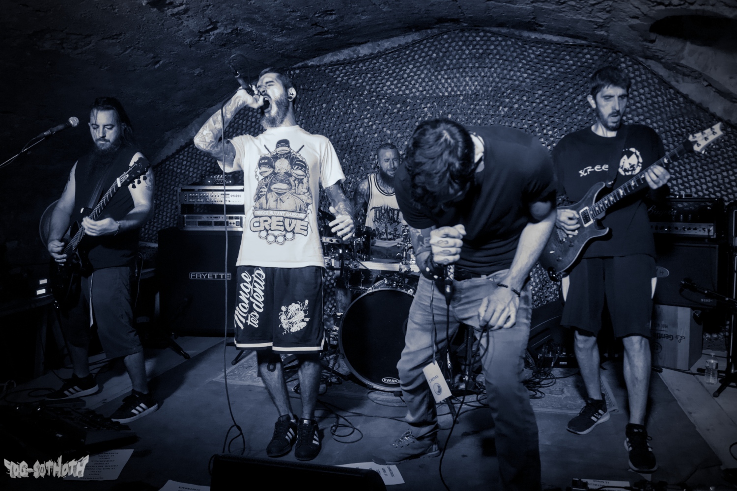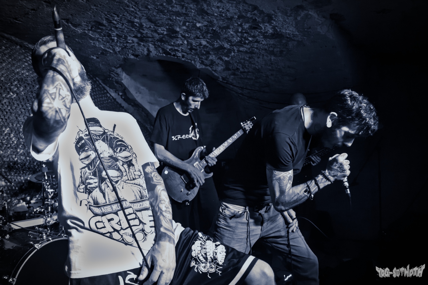 Public festif, ambiance familiale, assiette de diots patates à tomber, boissons houblonnées en abondance tout est réuni pour une soirée réussie. Il est juste 19h30 quand les Bacon Fury arrivent sur scène, pour ouvrir ce festival. C’est un groupe formé il y a peu par une bande de potes. Ils vont très vite dépoussiérer la noise cave area avec leur brutal death métal ravageur, le public un peu timide au début se laisse vite prendre au jeu et ça commence à remuer grave dans la cave ! Leur set m’a semblé un peu court et m’a complètement convaincu, à suivre de très près donc ! Après un cour changement de plateau c’est aux Screenback d’investir la cave. Ces Isérois jouent ce soir à domicile si on peut dire. Formés en 2019, ils évoluent dans style néo métal plutôt axé 90, d’ailleurs on retrouve dans leur compos des inspirations de groupes tel que Pleymo Smash It Combo, Mass Hysteria et bien d’autres. Son duo de chanteurs alternant entre growl et chant clair et ses textes écrits en français confèrent à ce groupe toute son identité. Ce soir pour leur premier concert en compagnie de leur nouveau bassiste Flo ils vont nous livrer un set carré et persuasif qui ne laissera personne indifférent ! Place maintenant à Sharked que l’on ne présente plus. Ils vont mettre le feu aux poudres avec leur brutal thrash death des enfers. TomRoger et ses compères ne vont pas faiblir de tout le set. L’abbé Sm dans une forme olympique va donner la voix à faire trembler les murs de la cave et Hervé leur nouveau bassiste va nous détruire les neurones. Nous aurons également le privilège de découvrir en exclusivité 3 morceaux issus de leur nouvel Ep dont la sortie est imminente. Un excellent moment qui en a fait transpirer plus d’un ! La fièvre va encore monter de quelques degrés à présent avec le trio Grenoblois de Wardogs. Ils vont nous botter le cul pendant 45mn avec leur death black punk groovy à souhait. Ça slame ça pogote, ça mosh dans tous les sens, les cervicales craquent, aucun répit, le public ravi se défoule à fond et en redemande. Énorme coup dur pour Festering Process qui a fait la release party la semaine dernière au Rock N Eat pour la sortie de leur nouvel EP Folkgore, leur chanteur vient de tomber malade et n’est absolument pas en mesure d’assurer le set ce soir. C’est donc Boris qui le remplacera au pied levé. Leur brutal death- grind technique extrêmement rythmé va finir de nous ruiner le cerveau et va clôturer cette soirée en beauté. Cette onzième édition fut donc des plus brutales dans la Noise Cave Area une ambiance hors du commun ! Un immense merci aux organisateurs Norbert et Tom Roger pour leur accueil, leur sympathie et l’ensemble de ce festival, mais également à tous les bénévoles qui assurent le côté technique et intendance en ayant toujours le sourire. Merci également aux groupes présents qui ont tout donné pour nous ce soir et merci au public venu mettre le feu en masse ! |