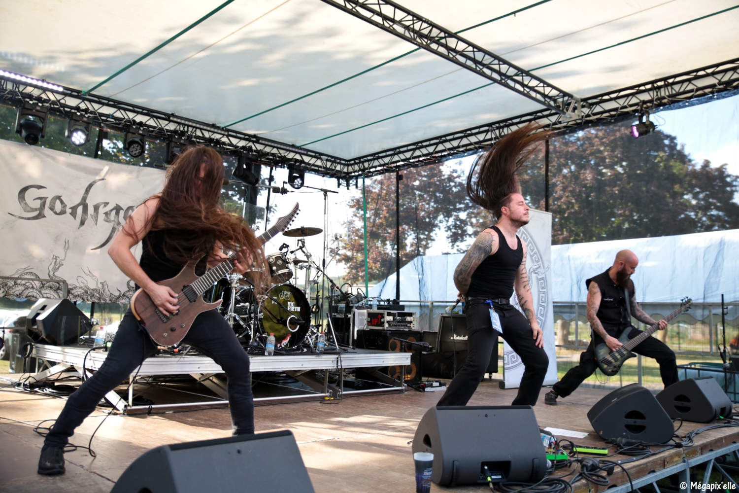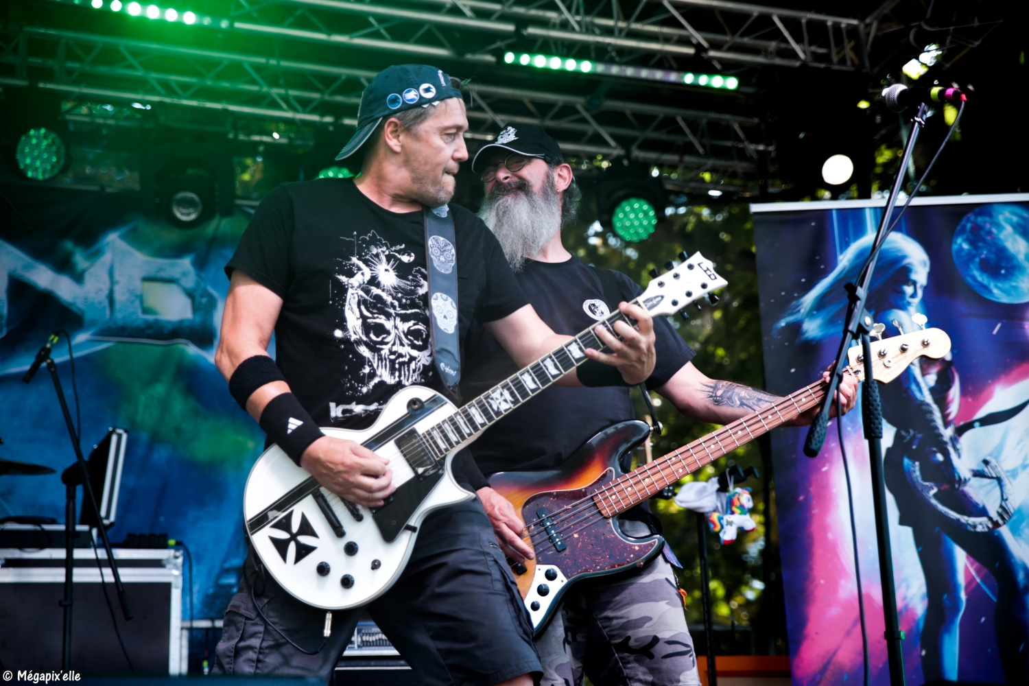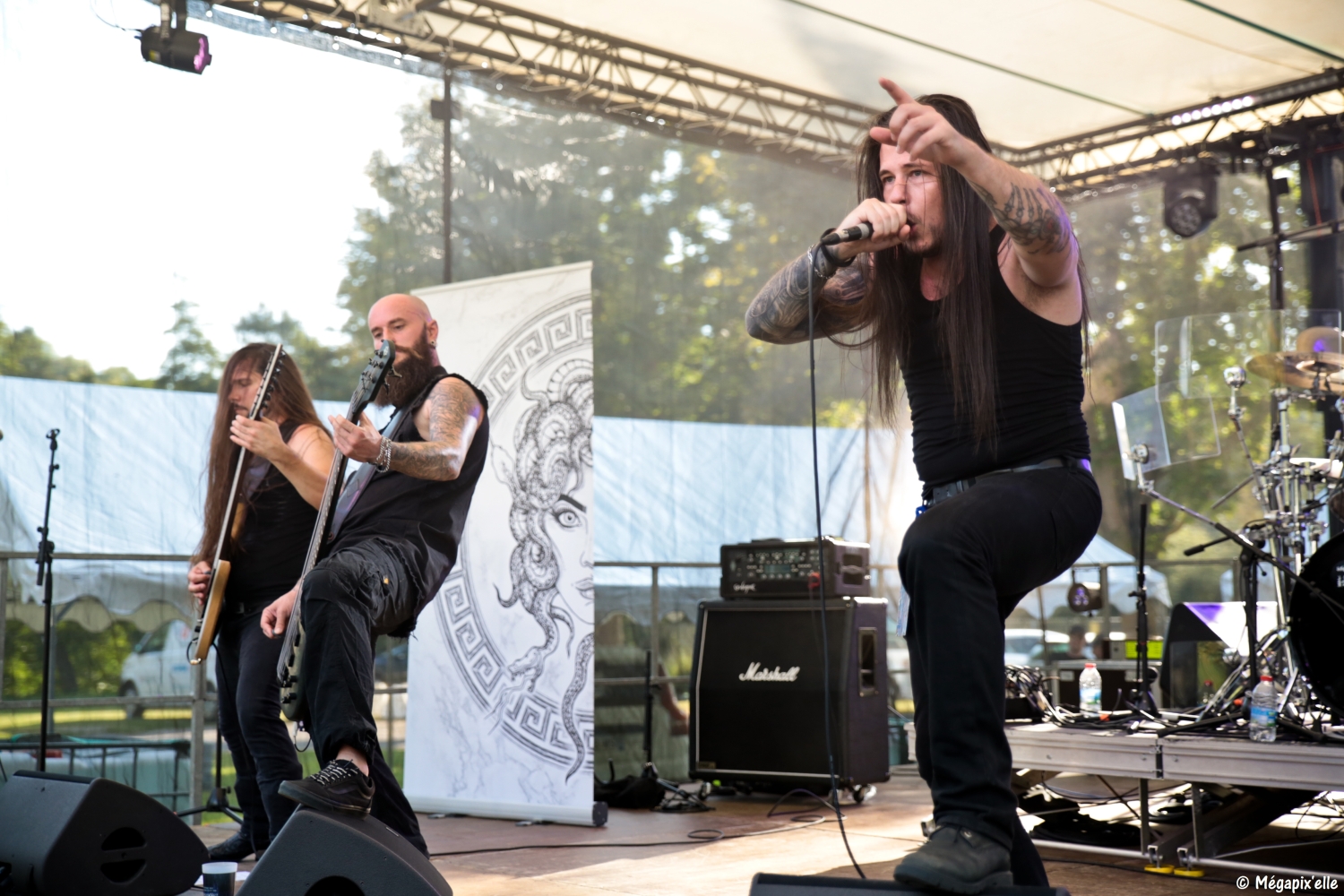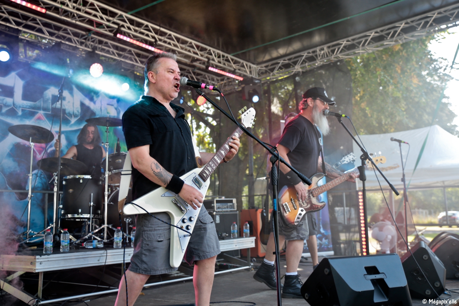 Organisé par une équipe familiale et extrêmement bon enfant, ce Fertois Metal Fest est une vraie bouffée d’air et sans doute un rappel de ce que doit être un festival bien organisé et à taille humaine. Deux scènes disposées à 90° l’une de l’autre pour des enchaînements rapides, parfait ! Bref, coté organisation et malgré une chaleur écrasante, nous avons passé un excellent moment. Musicalement, l’affiche avait de la gueule et était très variée. À noter que nous ne pouvions assister qu’a la première journée. STRUGGLEHEAD Un groupe qui porte bien son nom… Un ampli qui déconne, une corde de cassée, les Strugglehead (galériens) ont eu leur lot d’embûches, cela n’a pas altéré leur performance. Un rock poilu et bien gras mené par un trio communicatif qui a facilement acquis l’adhésion du public. MARCH OF SCYLLA Ah !! Le groupe de metalcore incontournable de tout festival. Qu’en est-il ? Implacables, les musiciens sont très efficaces et les compos sont tendues à l’extrême, c’est brut, carré et prenant. Je ne me suis pas ennuyé. Mon seul regret viendra des lignes de chants trop souvent sur la même tonalité, les rendant un peu lassantes. En revanche, scéniquement, c’est bien en place. ICELAND De vieux loups qui thrashent et qui collent des mandales aux minots ? C’est Iceland. Quel pied, merci les gars, c’est carré, bien composé et efficace, well done !! GOHRGONE Une valeur sûre du Death (deathcore ?), Gohrgone à roulé sur le Fertois, le réveillant à grand coup de circle pit et wall of death. Les petits gars étaient en grande forme et j’ai vraiment apprécié cette énergie, cette violence et malgré tout cette bonne humeur. Un groupe à voir absolument. LES PROJETS D'ATHÉNA Quel dommage de jouer si tôt, j’ai l’impression qu’on aurait pu avoir un spectacle encore plus dantesque !! Les Projets d’Athéna, c’est un concept. Le groupe est composé d’Antoine, alias « le technologue », guitariste et ingénieur technicien multifonction du projet ; Audrey, la chanteuse et hôte de la déesse Athéna ; et de l’imposant « Droïdrummer » HADES-06, le batteur du groupe. Oui, un robot, j’adore ! Le trio crée un univers cyberpunk brutal et poétique qui se rapproche plus d’une performance artistique que d’un concert, mais qui m’a ébloui. Une esthétique soignée et détaillée qui aurait mérité de jouer de nuit pour être plus immersif. BLASPHEME Voilà pourquoi il faut aller dans de petits festivals, pour ce faire cueillir par un groupe comme Blasphème. Moi, le Heavy, ce n’est pas trop mon truc, mais … Et bah, j’ai été conquis. Quelle présence, quelles compos magnifiques et quelles voix des deux chanteurs, c’est impressionnant (vraiment, je n’en rajoute pas.). Les gars ne sont plus les perdreaux de l’année, mais ils ont toujours 20 ans dans les veines. De nombreux fans étaient présents et reprenaient en cœur les tubes de Blasphème donnant une belle ambiance au set. PORNO GRAPHIC MESSTAH La claque du Fertois ! Rien à redire en fait, c’était parfait de bout en bout. Des maquillages, des tenues et un décor étudiées et réfléchies, un chanteur charismatique, un show bien écrit et des compos catchys, c’est bon, j’ai bien résumé ? En plus, on a eu de jolies filles venues jouer avec le feu pendant le set. Vous voulez des détails ? Il fallait être présent. Musicalement, c’est du metal indus bien foutu à la Nine Inch Nails ou Rob Zombie. LAST TEMPTATION Je suis un peu le cul entre deux chaises avec Last Temptation. C’est un vrai groupe ou un truc à la Steel Panthers ? Je me suis demandé tout le concert si les gars nous faisaient un petit spectacle ou si… ils étaient bourrés ou les deux !! Musicalement, on est sur du bon gros hard rock à la Black Sabbath bien riffé et emmené par un chanteur virtuose qui s’agite comme Steven Tyler, du tout bon. Mais l’attitude, faut choisir les gars, déconne assumée ou le sérieux, là, je ne savais pas. J’ajouterai que j’avais l’impression que le gratteux Pierre Scheithauer, (ex-Stream, Belladonna, Killing Machine ou encore Temple Of Brutality) me semblait largué hyper souvent et ne jouait pas avec les autres. Malgré cela, il en ressort un plutôt bon moment, car la section rythmique (Fabio Alessandrini et Franz OA Wise) est incroyable de groove et de punch et que Loup Malevil au chant est impérial, donc, à revoir sûrement. Conclusion : Le Fertois Metal Fest est tout ce que l’on attend de ce genre d’événement, carré, pro mais familial dans une ambiance festive et bon enfant. Encore Merci pour les invits, on reviendra sûrement. Big Up à Yoann l’Ogre gentil et Grand Stratéguerre du Fertois. Pour des raisons de confidentialité YouTube a besoin de votre autorisation pour charger. Pour plus de détails, veuillez consulter nos Politique de confidentialité. |