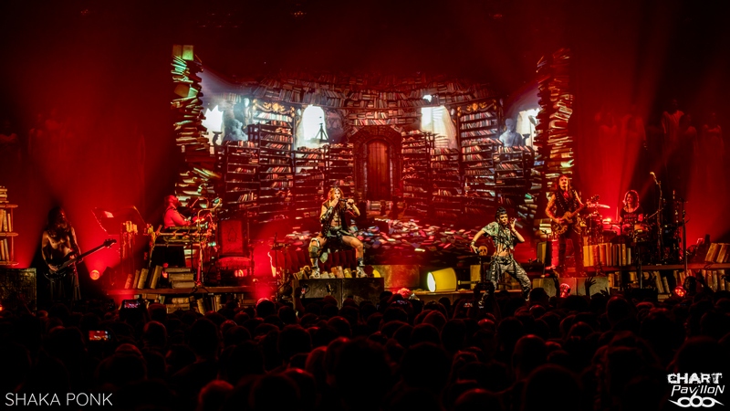 Ce soir, le trio de THE GLUTEENS a été désigné pour ouvrir le bal. Ni basse, ni batterie, mais des machines, une guitare et un chant. THE GLUTEENS se posent en chauffeurs de salle avec un son électro qui pourrait rappeler dans une certaine mesure ce que SHAKA PONK avait à proposer sur son premier album. L'ensemble se veut entraînant et fonctionne plutôt bien sur le public. La prestation est sympathique même si le groupe ne bénéficie évidemment pas d'un jeu de lumière extraordinaire et de toute la technique d'un groupe de tête d'affiche. Cyril, Ion, Steve, Mandris et évidemment Sam et Frah font leur apparition à 21h pétante dans les gradins du Zénith. On les voit descendre tranquillement toutes les marches de la salle en serrant des mains jusqu'à ce que le groupe se divise en deux parties. Steve, Mandris et Ion rejoignent la grande scène tandis que Frah, Sam et Cyril rejoignent une petite scène placée au centre du public. SHAKA PONK nous a habitués à des entrées fracassantes sur des « King Hallelujah » ou « Black Listed », mais le groupe a décidé de fonctionner différemment cette fois. C'est en acoustique que débute ce concert avec un premier set composé de 4 morceaux, « I'm Picky », « Gung Ho », « Run Run Run » et la reprise « The House Of The Rising Sun » qui permet la transition. Étonnant et peut-être un peu long à mon goût. L'idée est très intéressante. En effet, dans des conditions comme celles du pot de départ, il est malin de prendre le public à contre-pied de ce qu'il attend. Cela permet en plus d'avoir le trio au centre même de la salle, proche du public tandis que l'autre partie du groupe occupe déjà la grande scène derrière un voile. Je trouve personnellement que cela aurait pu être un poil plus court. Lorsque l'on va voir un groupe tel que celui-ci, on a vraiment envie de faire la fête avec eux, de voir la salle exploser et de sentir la sueur. OK, ça vient un peu plus tard et ces versions acoustiques ne sont pas inintéressantes, loin de là. C'est juste une question d'énergie un peu frustrée et de retenue avant de tout laisser sortir. Le show monte d'un cran avec « Je m'avance » que le groupe interprète sur la grande scène avant d'enchaîner avec un titre qui met tout le monde d'accord, « Wanna Get Free » suivi de « Twisted Mind ». Pour cette dernière, SHAKA PONK a sorti le grand jeu. Les décors, le son et les lumières sont absolument magnifiques. Les rois du bricolage et du « Do It Yourself » battent des records. Ce show est au-dessus de tout ce que le groupe a pu proposer dans sa carrière. À cela s'ajoute le 7ème membre du groupe, le groupe de gospel. Frah et sa bande n'ont plus qu'à cueillir le public à grands coups de « J'aime pas les Gens », « Tout le Monde Danse » et à nouveau « I'm Picky » dans toute sa splendeur. Comme à son habitude, Frah communie avec l'assemblée à grands coups de slam et du devenu mythique circle pit. On n'oublie pas la très belle reprise de « Smells Like Teen Spirit », la B.side pas du tout connue de NIRVANA interprétée majestueusement par Sam. La place est faite pour un « Sex Ball » d'anthologie avant de glisser doucement vers le rappel avec « Dad'Algorhythm » et « 13000 Heures ». La conclusion se fait avec « Killing Hallelujah » entrecoupé par « Rusty Fonky ». Après un long au revoir par le groupe de gospel et les musiciens, Cyril, Ion, Mandris et Steve, Sam et Frah viennent à leur tour saluer la foule. On sent Sam particulièrement touchée par ce concert et son émotion dans cet au revoir/adieu. On ne peut que la comprendre et compatir. Comment lâcher la scène ? Comment lâcher son bébé lorsque celui-ci prend une telle ampleur ? Pas facile effectivement de se dire qu'il y a une date de péremption alors que le public est là et présent comme jamais même s'il reste quasiment une année avant la der des ders. Je n'aime pas les adieux et les au revoirs, pas plus que Sam au final. SHAKA PONK est arrivé à un stade que tellement de groupes aimeraient atteindre. Le public est là. Il a été annoncé par Frah que l'écologie prendrait une place importante dans sa vie après le groupe. Cette idée est bonne et nécessaire à notre époque. On ne peut pas ne pas être d'accord avec lui car cela coule sous le sens. Mais est-ce si incompatible avec le statut de rockstar dont le groupe bénéficie actuellement et lorsque l'on a autant d'oreilles à sa disposition ? Le message passe très bien lors des concerts. Pouvoir exprimer ses idées sur un disque ou dans un concert, c'est une chance et une opportunité qui ne sont pas données à tout le monde. King Ju de STUPEFLIP a trouvé un moyen bien à lui de faire dans l'écologie en supprimant totalement les concerts ! Bref, je ne sais de quoi sera fait l'avenir de ces musiciens, on verra bien. En attendant, profitez bien de ces derniers instants car ce groupe sur scène a toujours été exceptionnel et l'a encore une fois prouvé. |