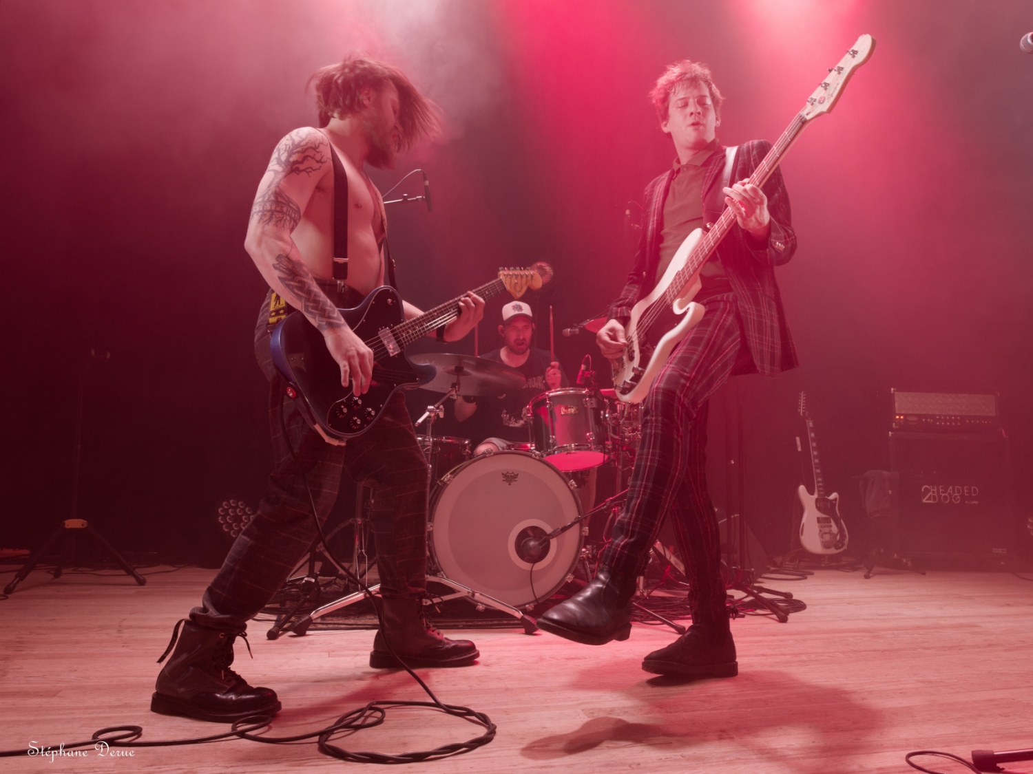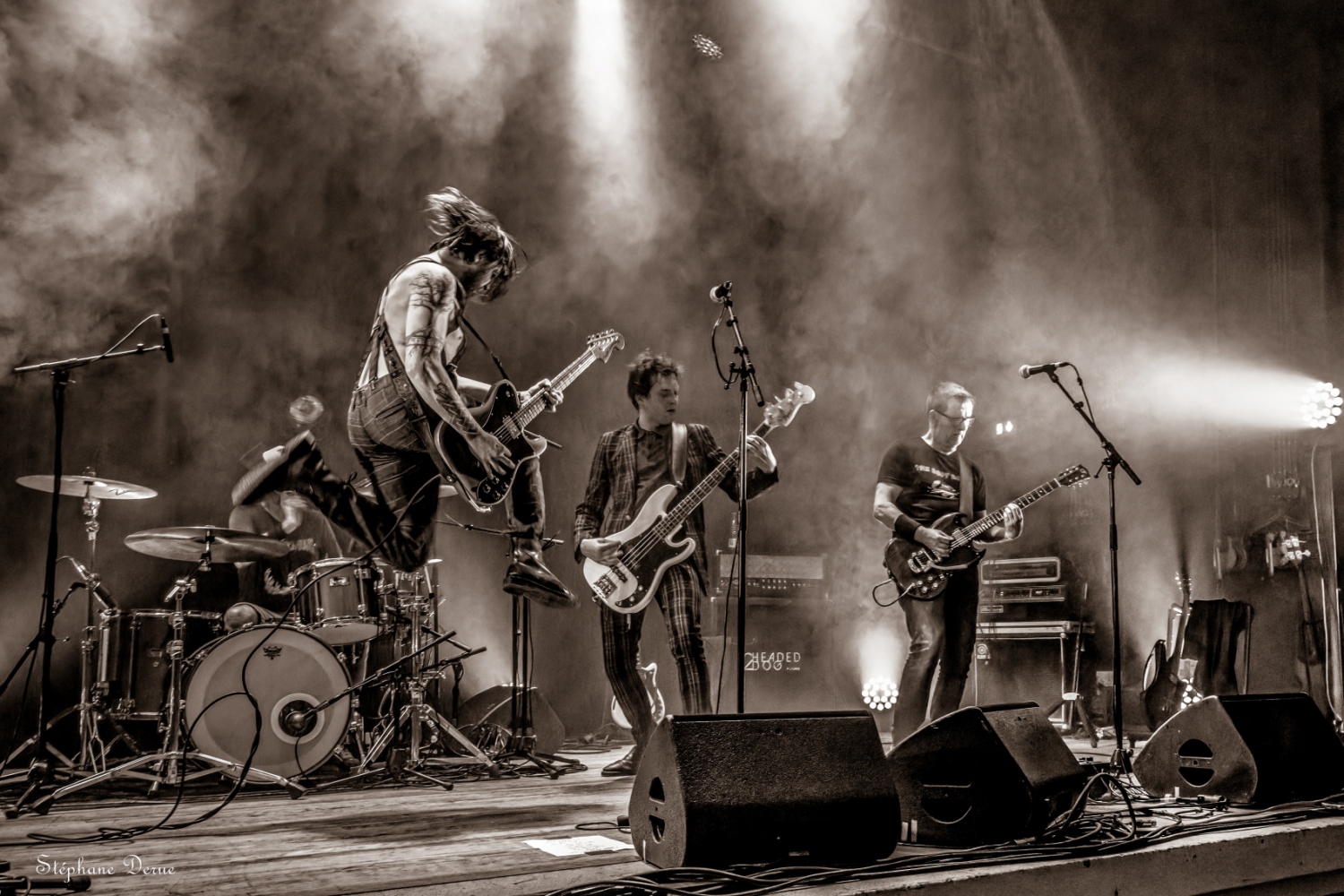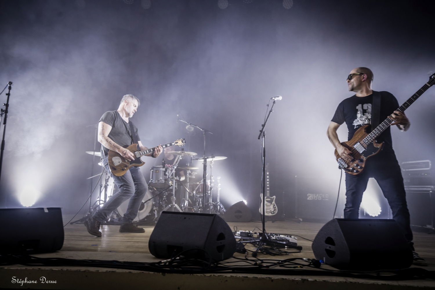 La Ville de Vernouillet avait mis à disposition samedi 06 avril la salle de l’Agora pour une soirée dédiée au punk-rock. Malgré une affluence décevante, le spectacle a été au rendez-vous et le public présent a pu passer une excellente soirée. Pour commencer, je tiens à féliciter les techniciens pour la grande qualité du son et des lumières. Les 2HEADED DOG ont eu l’honneur d’ouvrir le bal et avec eux, on est sûr de ne pas avoir de round d’observation. Dès les premières notes on est dans le vif du sujet. Les nouvelles compositions ont tout pour plaire au public ; du rythme, de la rage et une technique toujours aussi implacable. Les anciens titres ont été retravaillés ce qui permets de les redécouvrir sous un angle différent. Les trois voix parfaitement harmonisées, la marque de fabrique des 2HD, donnent une profondeur et une richesse incroyable. Anthyme à la basse et Julien à la batterie assurent une section rythmique sans faille qui pose sur chaque titre une empreinte titanesque. C’est puissant, intense et très technique. Olivier et Djess aux guitares, alternent riffs rageurs, solos décoiffant et rythme frénétique. Un set d’une grande maîtrise. MUGSLUG, qui vient tout juste de sortir son excellent deuxième album « when people eat people », prend le relais sur scène. Le trio n’est pas venu pour chanter des berceuses. Le rouleau compresseur est lancé. Avec un Bastien des grands jours à la batterie et un Cyril survolté à la basse, les vibrations vont secouer les carcasses du public. Pas vraiment ambiance bol tibétain avec eux, mais plutôt orgue de Stallone (oui j’ai préféré changer subtilement le nom pour éviter toute récupération politique). Mister Fred Charp à la guitare et au chant, c’est du lourd ! du très lourd !! La voix est puissante, la bouche tordue, les yeux révulsés, Fred hurle sa colère avec une sincérité touchante. Là encore, les nouveaux titres se mêlent aux anciens pour le bonheur du public. Une décharge d’adrénaline pendant près d’une heure. Le bonheur quoi ! Pour finir cette belle soirée, ECHO LOGIC All investit les planches pour proposer un punk trash-core explosif. Aurélie ne fait pas dans la dentelle. Sa voix est percutante, d’une puissance incroyable. A côté, j’ai l’impression de ne pas avoir muer, un coup à choper des complexes. Elle arpente la scène de long en large, saute, virevolte, s’amuse et c’est vraiment agréable la voir se donner sans retenue à son public. Les deux guitares forment un duo de choc plein de force et de talent. La basse bastonne férocement dans une sorte de combat épique avec une batterie monstrueuse. Le bilan de la soirée se résume en un mot : Bonheur ! Les sourires des spectateurs comme ceux des musiciens montrent à quel point le plaisir est partagé. Le public était chaud patate et les groupes ont donné le meilleur d’eux-mêmes. Une recette simple mais ô combien efficace. Hâte de revivre une soirée de cette qualité, merci aux organisateurs et la Ville de Vernouillet de permettre aux talents locaux de pouvoir s’exprimer. Stef |