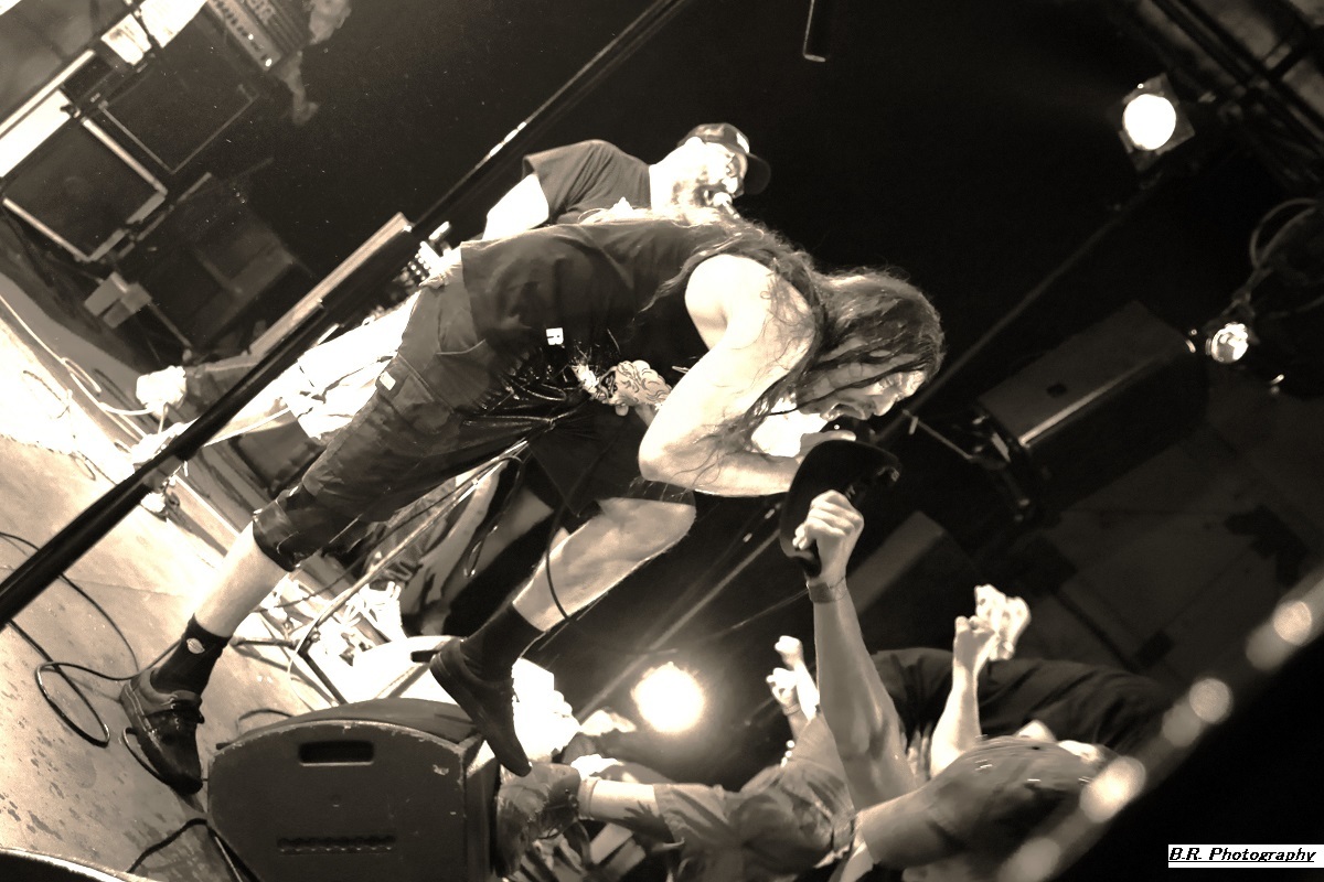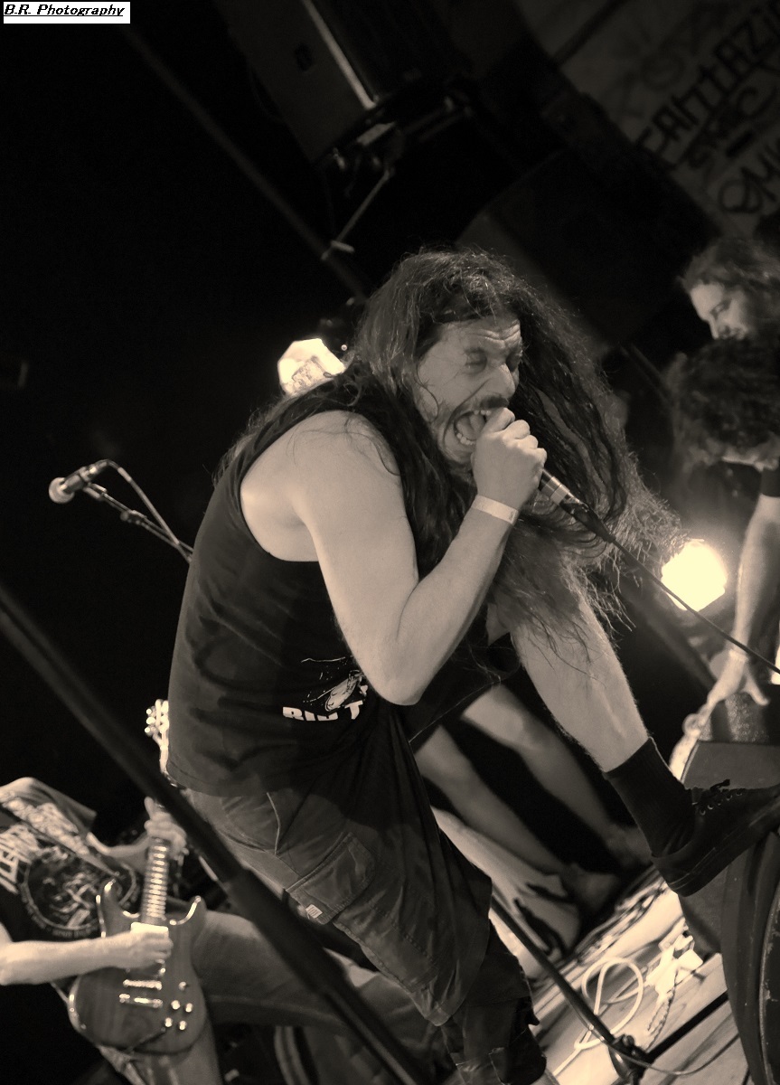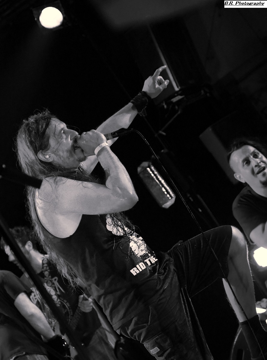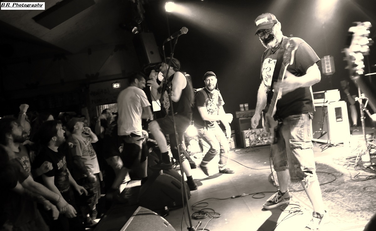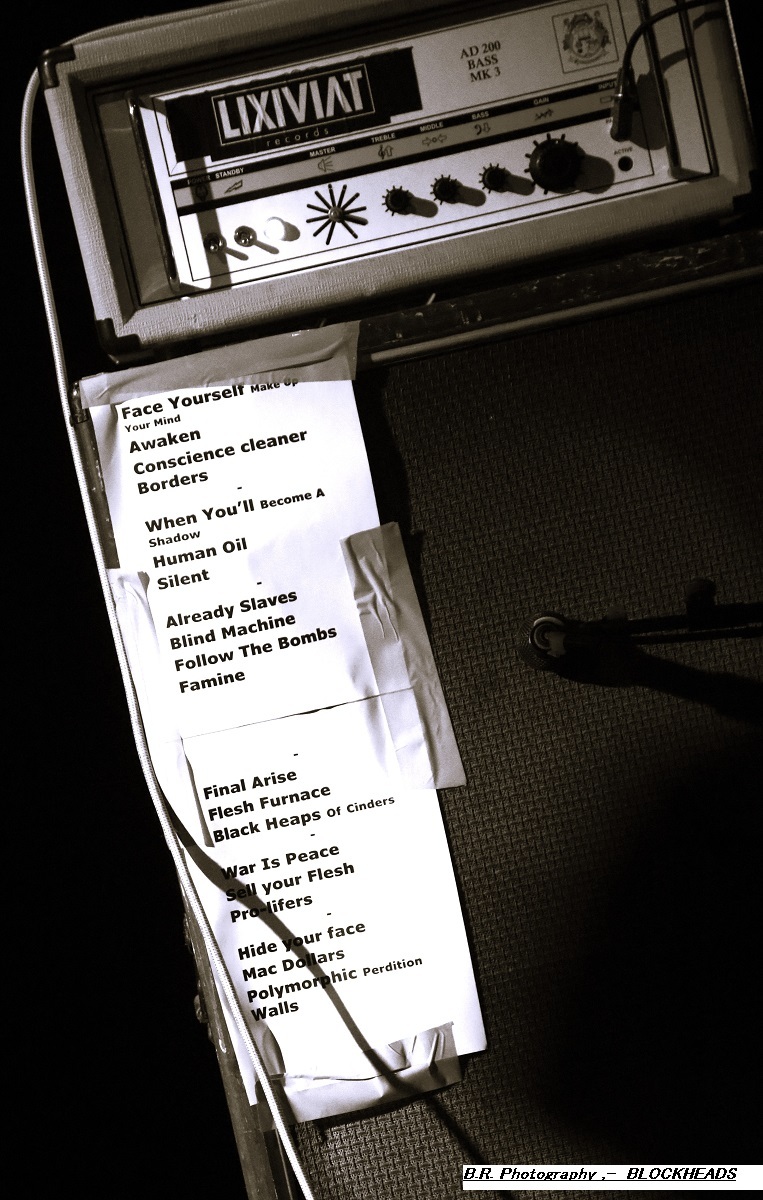 Ce sont les tchèques d'INTERPUNKCE qui nous interpellent dès 17 heures 30 avec leur punk-hardcore sur vitaminé. Ceux de Prague placent la barre bien haute cet après-midi dans un Grrrnd Zero déjà en ébullition. Leur punk se révèle simple mais très agressif comme la haine avec le cœur et l’amour avec le couteau, comme ils le disent ! Et hop encore des Tchèques sur les planches avec la venue de BRÜNNER TODESMARSCH. Ce quatuor de Brno prône la rébellion à l'intérieur et l’extérieur avec son crust punk bien buriné qui sévit depuis l'an 2012 et en live, ce n'est pas un pétard mouillé ! La power-violence des Lillois de MARTO nous tombe dessus sans crier gare en ce début de soirée. Et sur scène ils sont complètement marteaux (sic). Ça part dans tous les sens avec des envois propulsé par deux hurleurs et des musicos déchaînes. Ils prônent la lutte et la fiesta, aargh ! Les petits Suisses de Lausanne KAKOTHANASY sont remontés comme des coucous (Suisses !) et ils vont nous blaster la cervelle à l'aide d'un brutal death bien froovy. Le trio du bord du lac Léman ne fait pas dans la dentelle poussant leur death dans les recoins techniques sans compromis et leur dernier méfait « Initiating The Primal Cognising Display of Intrinsic Tangible Affliction est a écouter dans votre salon de toute urgence après le concert, conseil d'ami. Les Tchèques (encore !) de LICKSPIT pratiquent non pas le thrashcore des familles mais son ancêtre le « bandana thrash ». Mais finalement ces cousins de l'Est sont des punks tout simplement et envoient, la sauce keupone avec conviction sans se « masturber le cerveau » ou si peu, on aime ! SHEEVA YOGA nous vient d'Ostrava en République Tchèque (ah bon !) et il nous défonce ce qu'il nous reste de neurones à l'aide de leur fastcore, grindcore, power-violence et plus si affinité. Après une pause partielle de presque un an ces musiciens ont repris la route et ce soir nous les accueillons à Lyon pour un set semble-t-il très attendu. Et du coup ce fus très apprécié vu l'ambiance devant la, scène. À la suite de leur impossibilité de venir ici au fest ceux THE ARSON PROJECT seront remplacés par ceux de Nancy les incontournables BLOCKHEADS qui vont nous démolir, que dis-je, nous pulvériser la tête et les jambes (ou, autre !) avec leur grindcore tranchant comme une lame de rasoir et rebelle sur des rythmes hystériques. Ils sont toujours énervés, mais passionnés, content de retrouver devant eux les, amis du blast et de la rage, défouloir, garanti donc ! Depuis plus de trente ans, Blockheads n'a pas baissé la garde et leur brutal grindcore pimenté par des déviances punks fait toujours des ravages là où le groupe passe. Alors nous avons dégusté dans tous les sens du terme (qui a dit comme d’habitude ?), amen ! Plus de 30 ans d’activité aussi pour les Finlandais de ROTTEN SOUND qui ont influencé plein de groupes se réclamant du grindcore dans le monde entier. Avec une discographie longue comme le bras et des tournées pratiquement non-stop ceux de Vaasa blastent à nouveau comme des sauvages après une période aux envois un peu plus lourds et groovy. Rotten Sound remonte donc au créneau du grindcore pur et dur sans concession. Alors ça fait mal, très mal même, mais figurez-vous que l'on aime ça. Leur dernier album en date porte le joli nom d’« Apocalypse », alors tout est dit ! Après cette effusion sonore et physique, il est tard, mais nous ne partons pas car GROSSEL de Guérande (ça ne s'invente pas !) se présente à nous. Grossel nous propose son mince-core (si, si ça, existe), un « core » mariné dans la sauce punk des marais salants. Auteur d'un album « Mince Grind Conférence » et de splits avec divers combos comme Ghetto, Insect Terror et Agathocles, ce groupe dont les membres viennent de divers horizons du grindcore, nous a bien surprit dans le bon sens du terme, mention très bien. Il convient de remercier les organisateurs Lixiviat Records et toutes les formations qui nous ont blasté durant deux jours. Ce festival a confirmé la bonne impression que l'on avait pu avoir en 2023 et cette édition 2024 fut un succès que l'on se le dise dans les chaumières du grindcore. Nous attendons donc maintenant une troisième édition pour l'an prochain. Évidemment nous seront laà toujours plus nombreux ! |