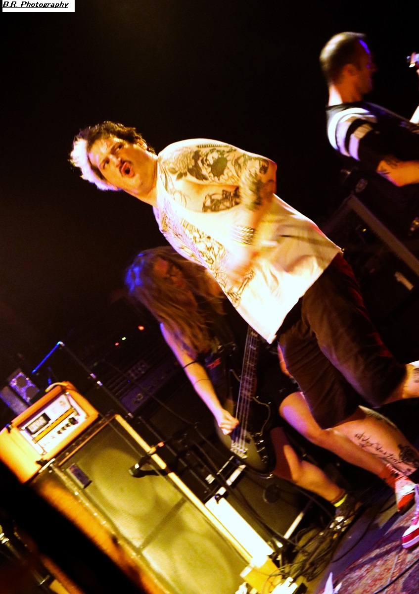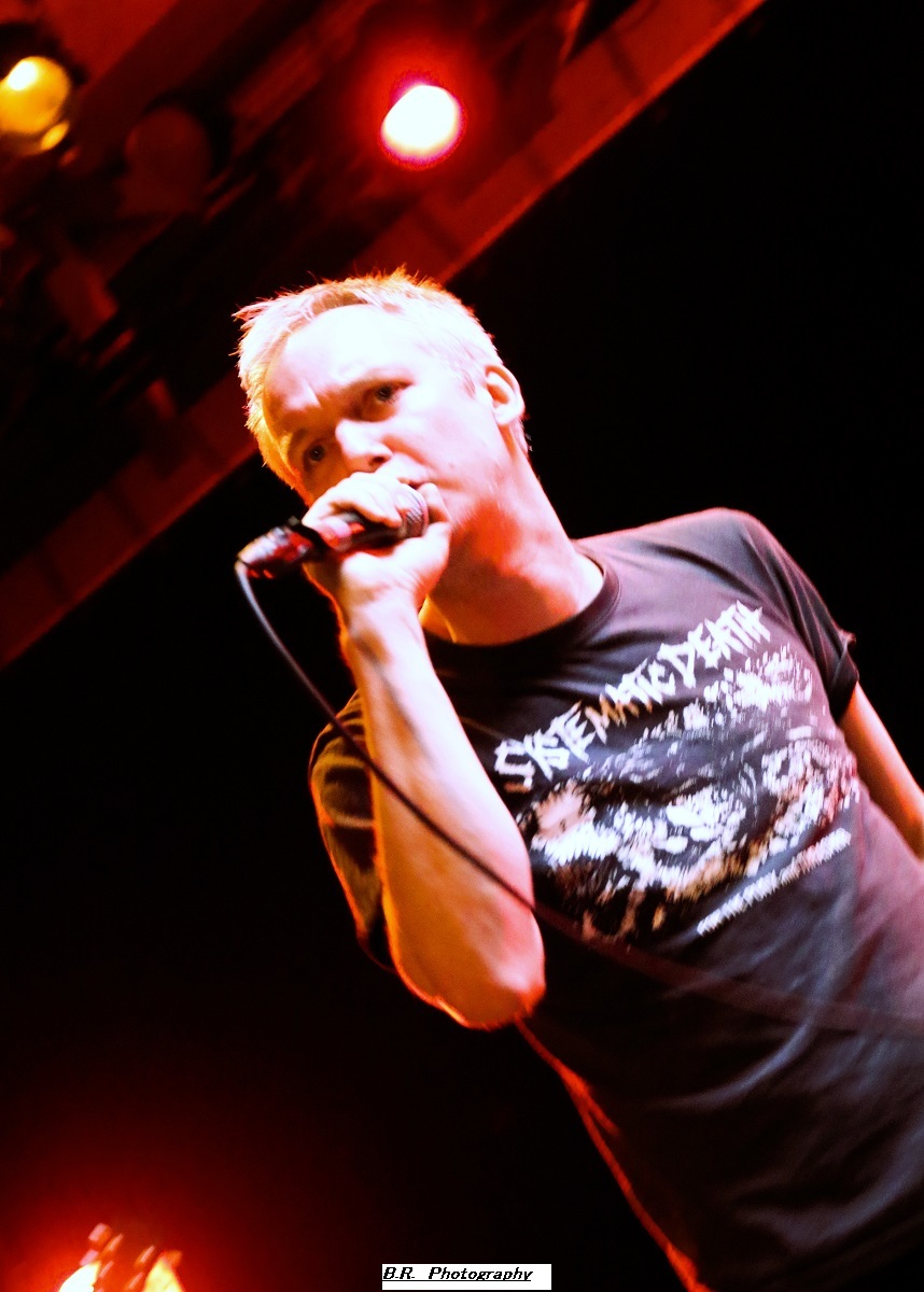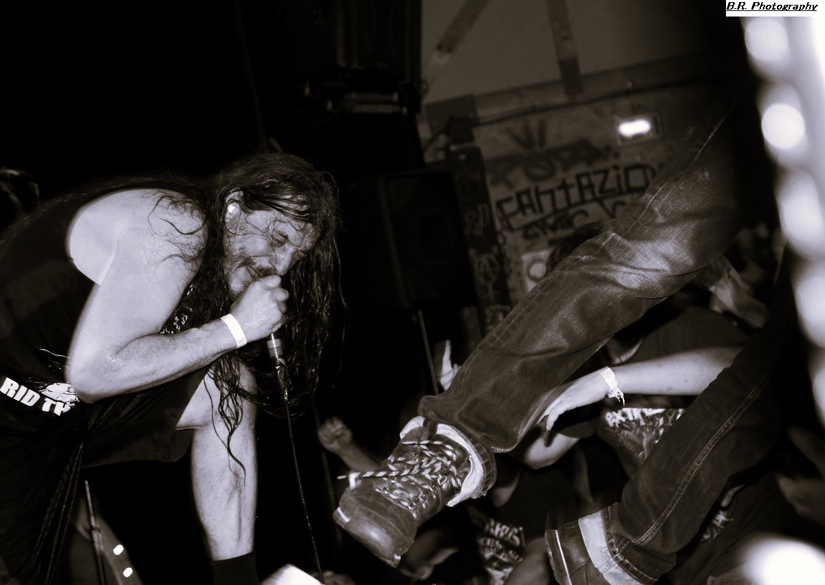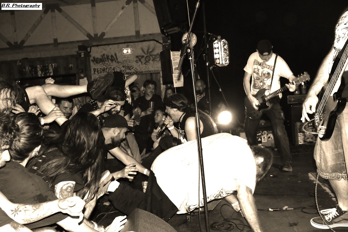 Ce sont les tchèques d'INTERPUNKCE qui nous interpellent dès 17 heures 30 avec leur punk-hardcore sur vitaminé. Ceux de Prague placent la barre bien haute cet après-midi dans un Grrrnd Zero déjà en ébullition. Leur punk se révèle simple mais très agressif comme la haine avec le cœur et l’amour avec le couteau, comme ils le disent ! Et hop encore des Tchèques sur les planches avec la venue de BRÜNNER TODESMARSCH. Ce quatuor de Brno prône la rébellion à l'intérieur et l’extérieur avec son crust punk bien buriné qui sévit depuis l'an 2012 et en live, ce n'est pas un pétard mouillé ! La power-violence des Lillois de MARTO nous tombe dessus sans crier gare en ce début de soirée. Et sur scène ils sont complètement marteaux (sic). Ça part dans tous les sens avec des envois propulsé par deux hurleurs et des musicos déchaînes. Ils prônent la lutte et la fiesta, aargh ! Les petits Suisses de Lausanne KAKOTHANASY sont remontés comme des coucous (Suisses !) et ils vont nous blaster la cervelle à l'aide d'un brutal death bien froovy. Le trio du bord du lac Léman ne fait pas dans la dentelle poussant leur death dans les recoins techniques sans compromis et leur dernier méfait « Initiating The Primal Cognising Display of Intrinsic Tangible Affliction est a écouter dans votre salon de toute urgence après le concert, conseil d'ami. Les Tchèques (encore !) de LICKSPIT pratiquent non pas le thrashcore des familles mais son ancêtre le « bandana thrash ». Mais finalement ces cousins de l'Est sont des punks tout simplement et envoient, la sauce keupone avec conviction sans se « masturber le cerveau » ou si peu, on aime ! SHEEVA YOGA nous vient d'Ostrava en République Tchèque (ah bon !) et il nous défonce ce qu'il nous reste de neurones à l'aide de leur fastcore, grindcore, power-violence et plus si affinité. Après une pause partielle de presque un an ces musiciens ont repris la route et ce soir nous les accueillons à Lyon pour un set semble-t-il très attendu. Et du coup ce fus très apprécié vu l'ambiance devant la, scène. À la suite de leur impossibilité de venir ici au fest ceux THE ARSON PROJECT seront remplacés par ceux de Nancy les incontournables BLOCKHEADS qui vont nous démolir, que dis-je, nous pulvériser la tête et les jambes (ou, autre !) avec leur grindcore tranchant comme une lame de rasoir et rebelle sur des rythmes hystériques. Ils sont toujours énervés, mais passionnés, content de retrouver devant eux les, amis du blast et de la rage, défouloir, garanti donc ! Depuis plus de trente ans, Blockheads n'a pas baissé la garde et leur brutal grindcore pimenté par des déviances punks fait toujours des ravages là où le groupe passe. Alors nous avons dégusté dans tous les sens du terme (qui a dit comme d’habitude ?), amen ! Plus de 30 ans d’activité aussi pour les Finlandais de ROTTEN SOUND qui ont influencé plein de groupes se réclamant du grindcore dans le monde entier. Avec une discographie longue comme le bras et des tournées pratiquement non-stop ceux de Vaasa blastent à nouveau comme des sauvages après une période aux envois un peu plus lourds et groovy. Rotten Sound remonte donc au créneau du grindcore pur et dur sans concession. Alors ça fait mal, très mal même, mais figurez-vous que l'on aime ça. Leur dernier album en date porte le joli nom d’« Apocalypse », alors tout est dit ! Après cette effusion sonore et physique, il est tard, mais nous ne partons pas car GROSSEL de Guérande (ça ne s'invente pas !) se présente à nous. Grossel nous propose son mince-core (si, si ça, existe), un « core » mariné dans la sauce punk des marais salants. Auteur d'un album « Mince Grind Conférence » et de splits avec divers combos comme Ghetto, Insect Terror et Agathocles, ce groupe dont les membres viennent de divers horizons du grindcore, nous a bien surprit dans le bon sens du terme, mention très bien. Il convient de remercier les organisateurs Lixiviat Records et toutes les formations qui nous ont blasté durant deux jours. Ce festival a confirmé la bonne impression que l'on avait pu avoir en 2023 et cette édition 2024 fut un succès que l'on se le dise dans les chaumières du grindcore. Nous attendons donc maintenant une troisième édition pour l'an prochain. Évidemment nous seront laà toujours plus nombreux ! |
