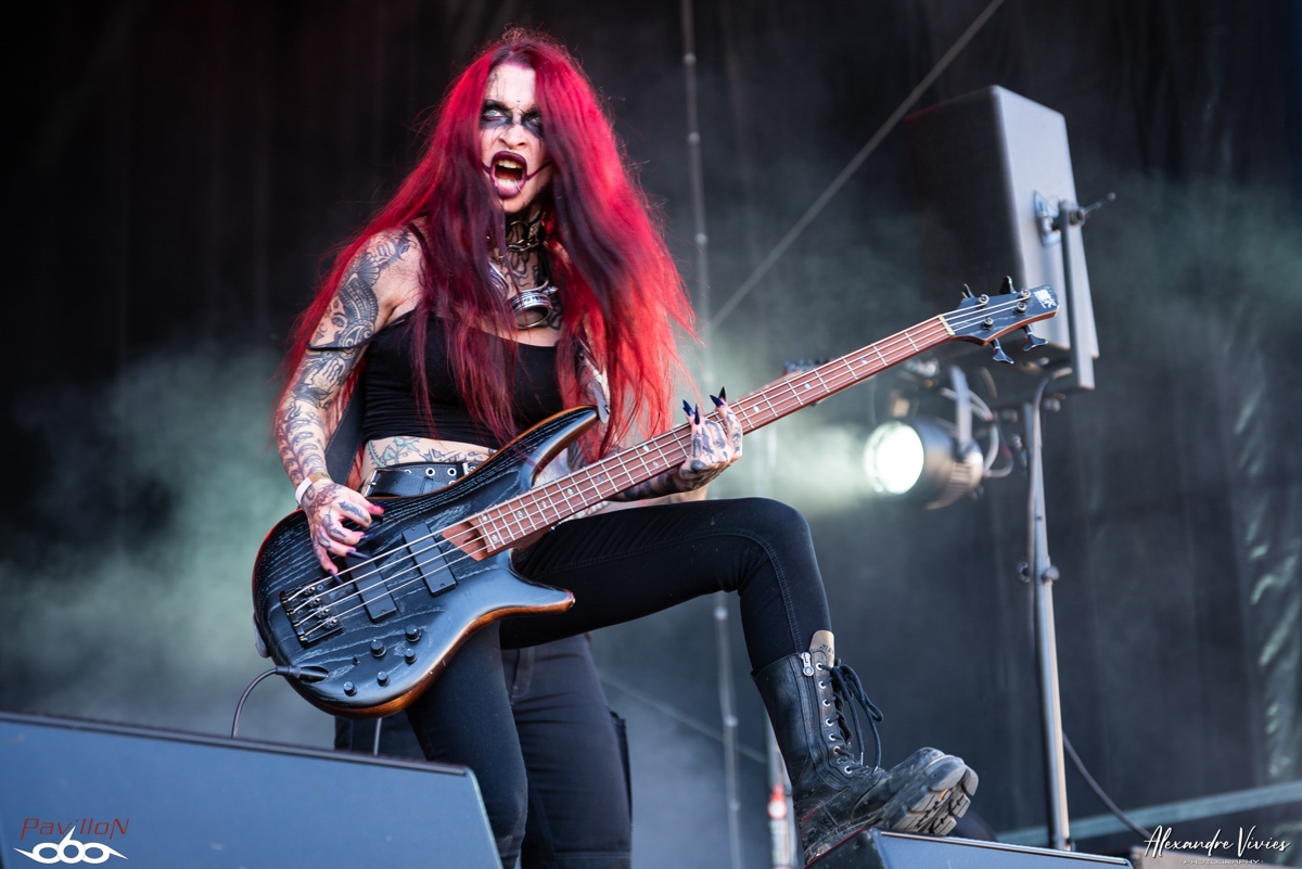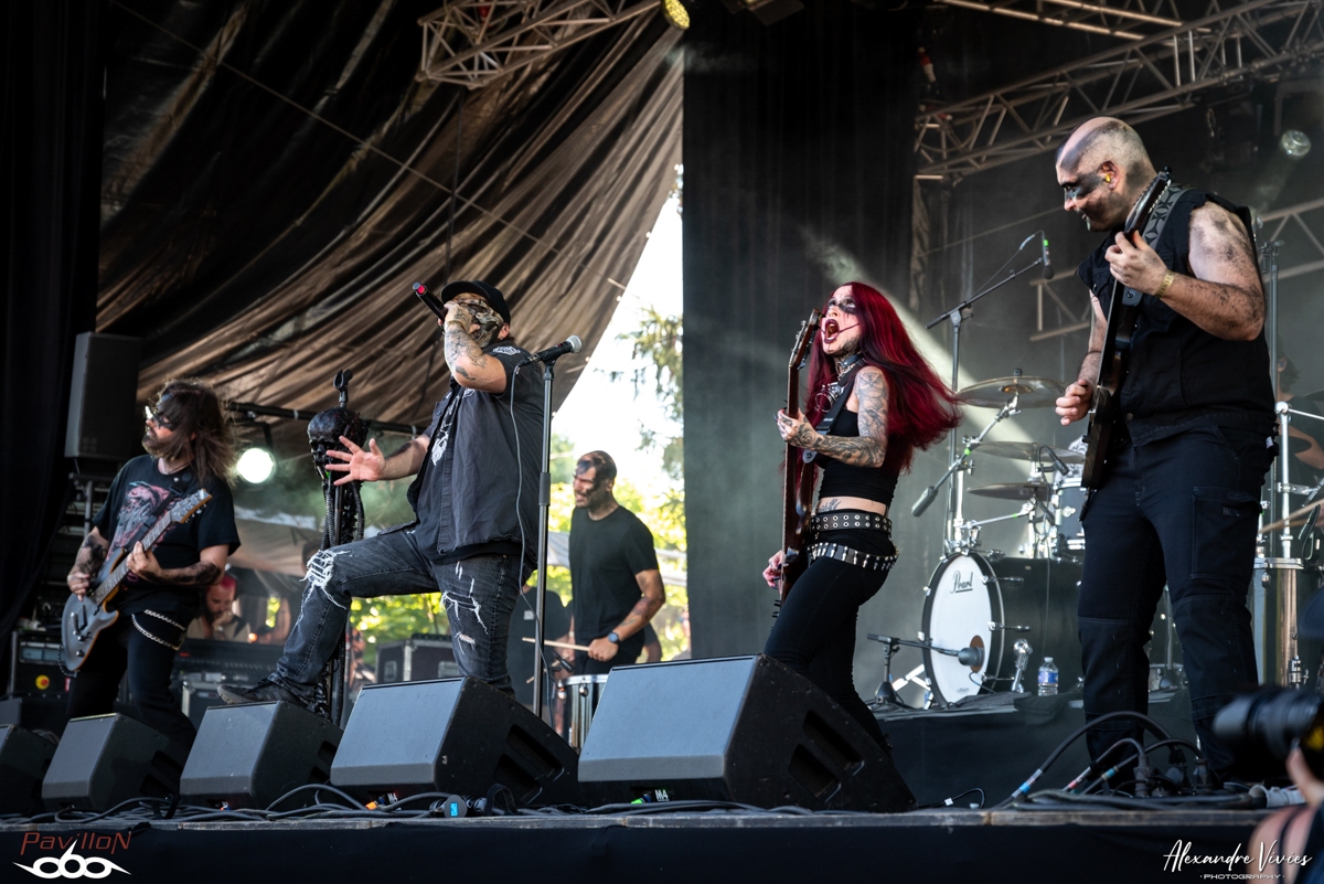 Le changement de style est radical avec l’arrivée de SUN sur les planches du festival. Véritable ovni musical de cette première journée, la chanteuse et guitariste, accompagnée d’un bassiste et d’un batteur dissimulant tous deux leur visage sous une capuche noire, définit son style comme « Brutal Pop ». Et l’appellation est choisie à merveille. Entre reprises de classiques de la pop et compositions originales, SUN brille par le contraste qu’elle crée entre cet univers et toute la puissance du metal qu’elle y instille. Saisissante de charisme et à travers son univers artistique singulier, nul doute que la chanteuse a su séduire une grande partie du public qui ne la connaissait peut-être pas et pour qui la surprise fut des meilleures !
