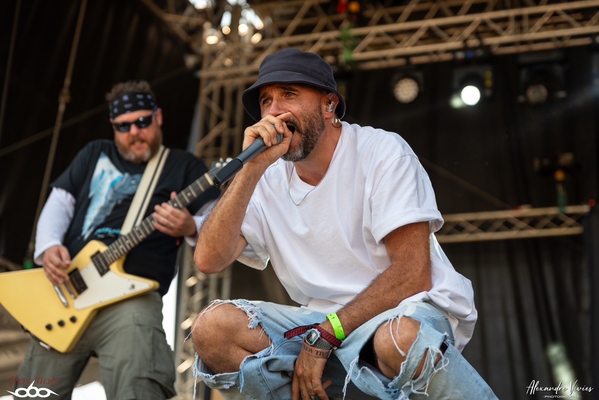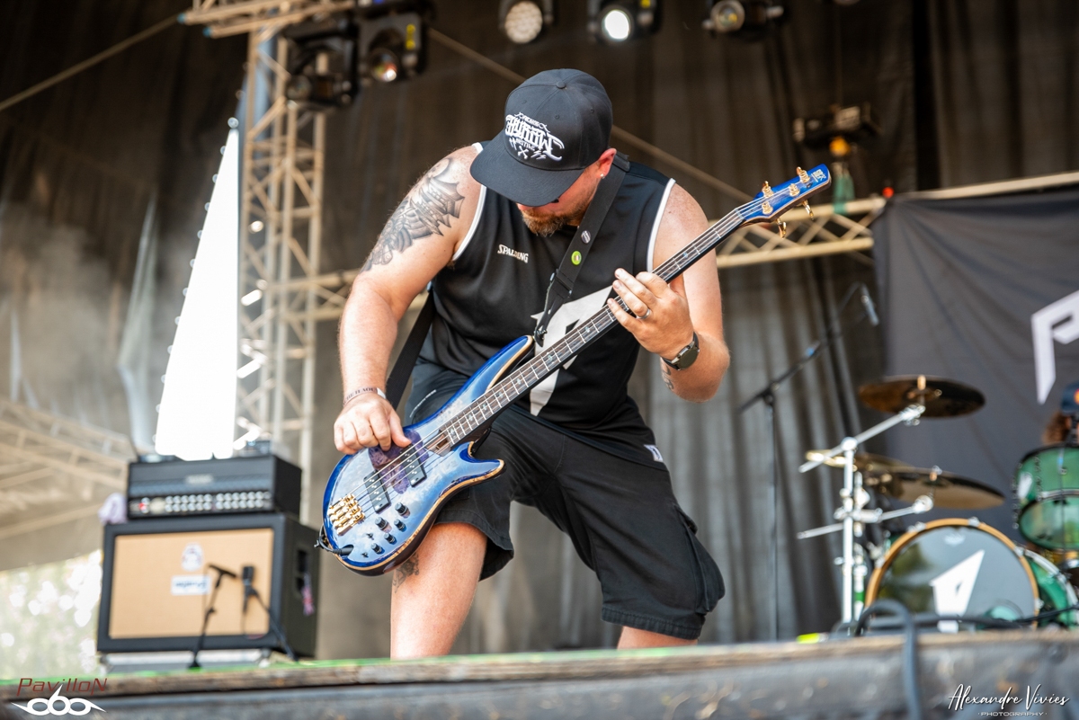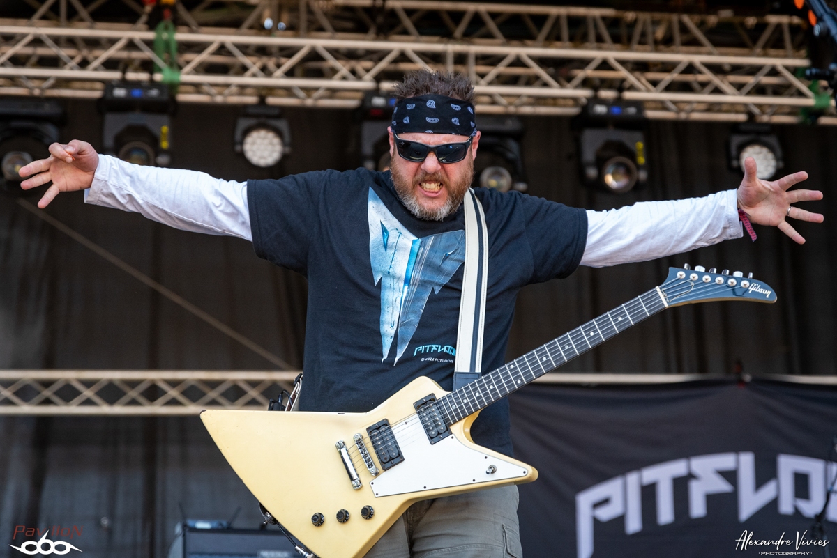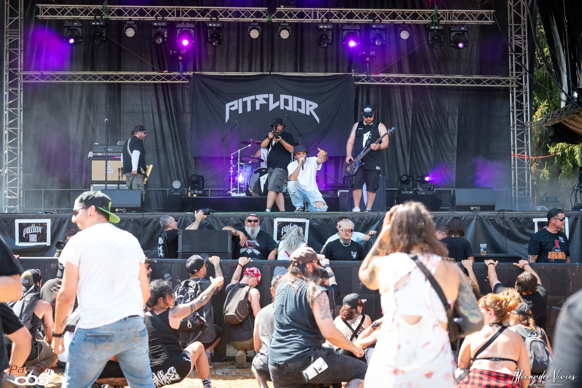 La journée démarre fort avec PITFLOOR ! Sous un soleil de plomb, le combo parisien ne fait pas dans la dentelle avec son crossover metal/hardcore/punk et lance les hostilités avec l’art et la manière ! Alors que les plus courageux s’en donnent déjà à cœur joie dans le pit, régulièrement arrosés par la lance à eau de la sécurité, beaucoup observent d’un peu plus loin sous l’ombre de la tonnelle du bar. Qu’à cela ne tienne, le chanteur Sly, après avoir été porté par le public de la scène jusque là-bas, y assurera quelques minutes le show pour le plus grand plaisir des festivaliers. Débordant d’énergie, le groupe ouvre parfaitement la journée et le concert se terminera dans un joyeux bordel sur les planches après l’invitation lancée au public à envahir la scène.