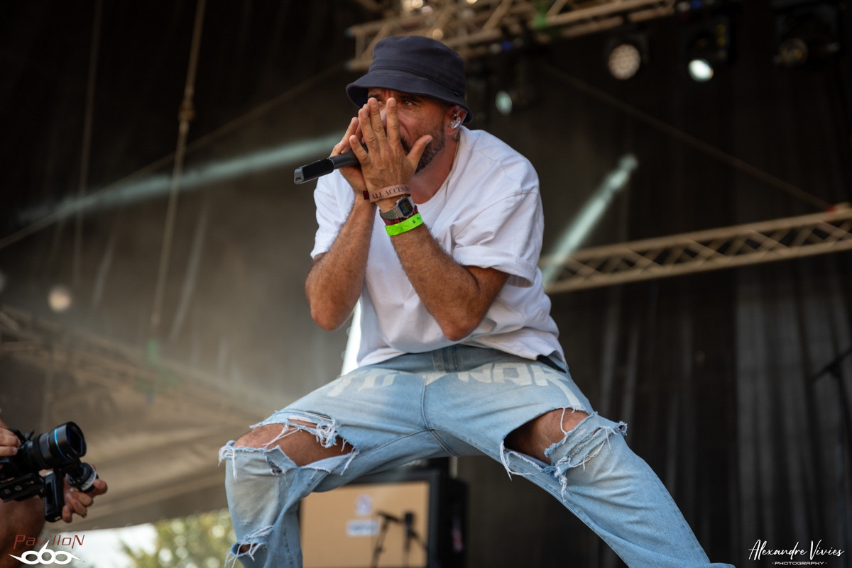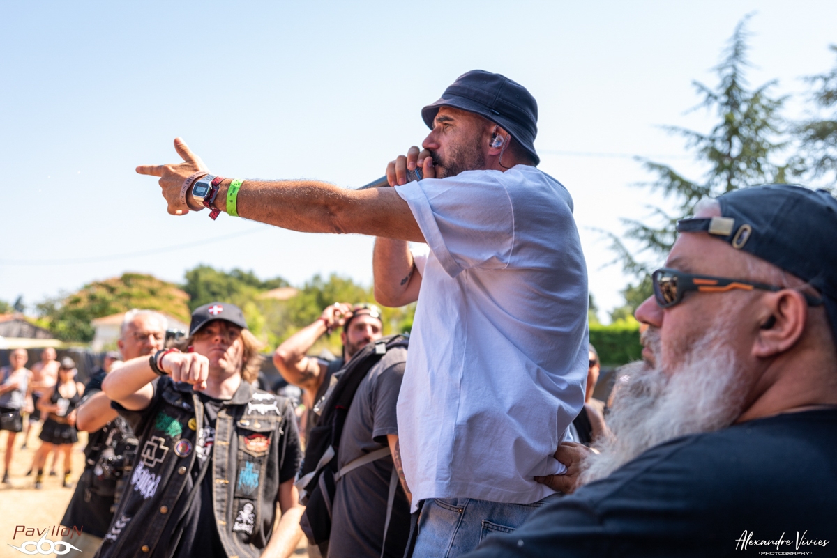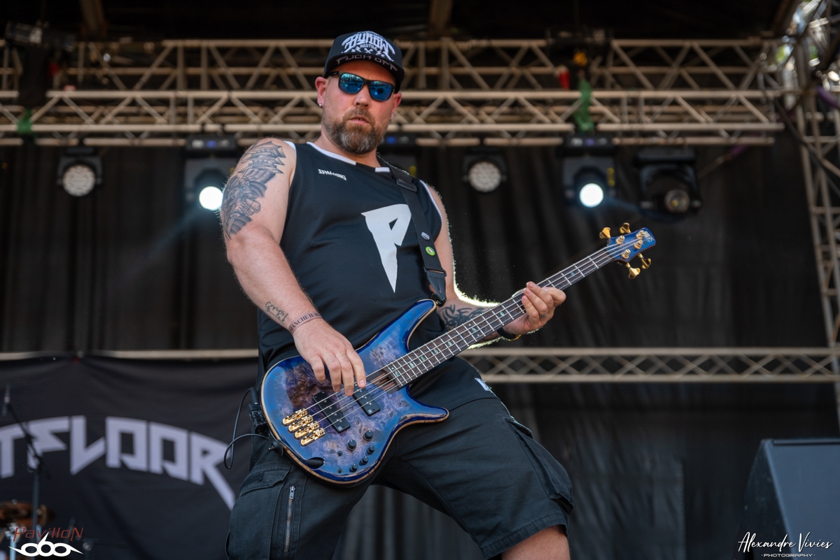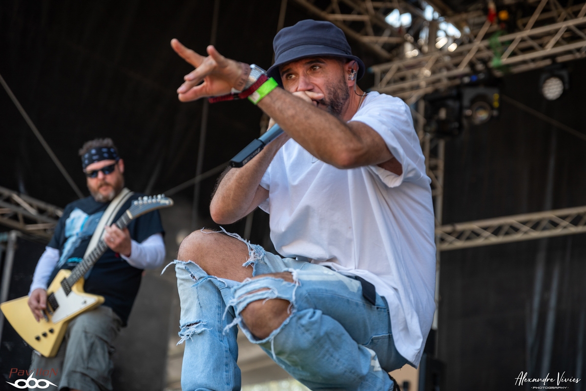 La journée démarre fort avec PITFLOOR ! Sous un soleil de plomb, le combo parisien ne fait pas dans la dentelle avec son crossover metal/hardcore/punk et lance les hostilités avec l’art et la manière ! Alors que les plus courageux s’en donnent déjà à cœur joie dans le pit, régulièrement arrosés par la lance à eau de la sécurité, beaucoup observent d’un peu plus loin sous l’ombre de la tonnelle du bar. Qu’à cela ne tienne, le chanteur Sly, après avoir été porté par le public de la scène jusque là-bas, y assurera quelques minutes le show pour le plus grand plaisir des festivaliers. Débordant d’énergie, le groupe ouvre parfaitement la journée et le concert se terminera dans un joyeux bordel sur les planches après l’invitation lancée au public à envahir la scène.