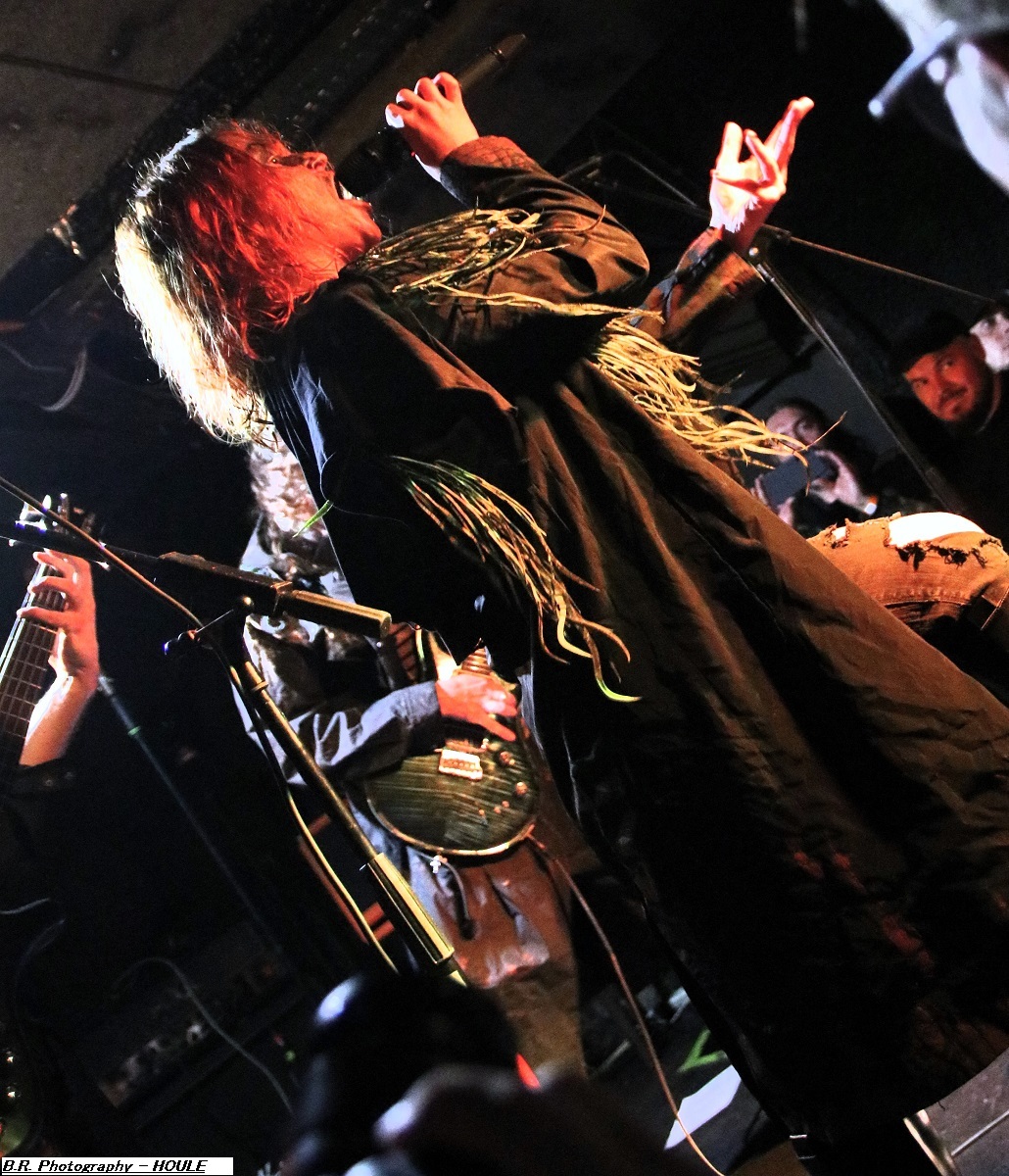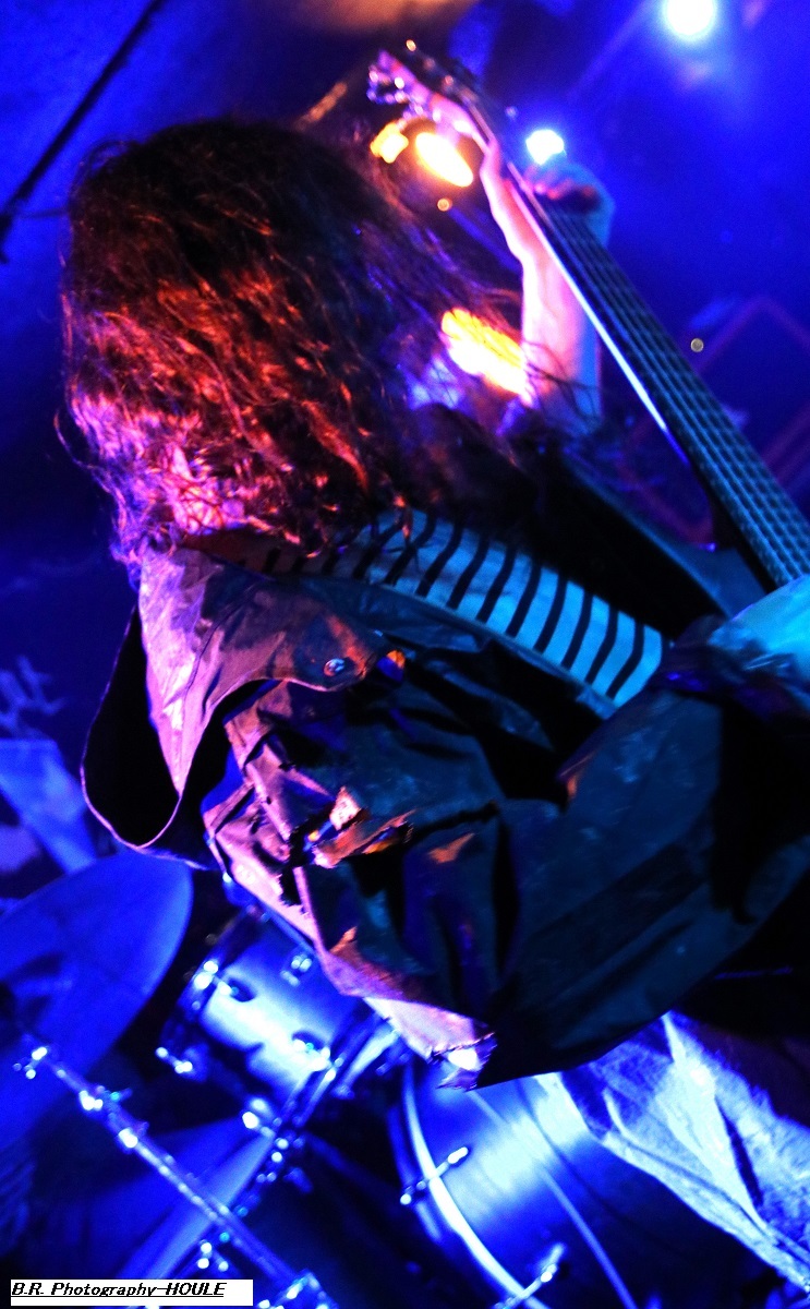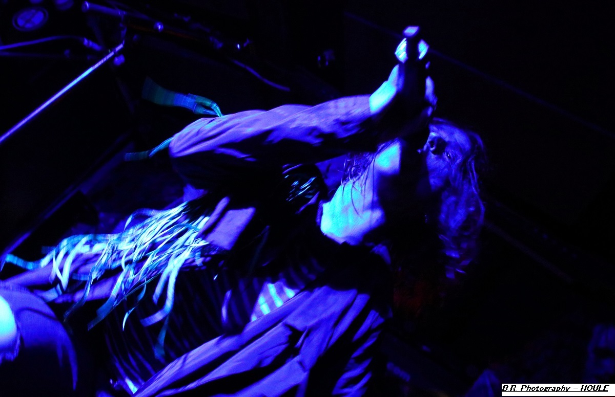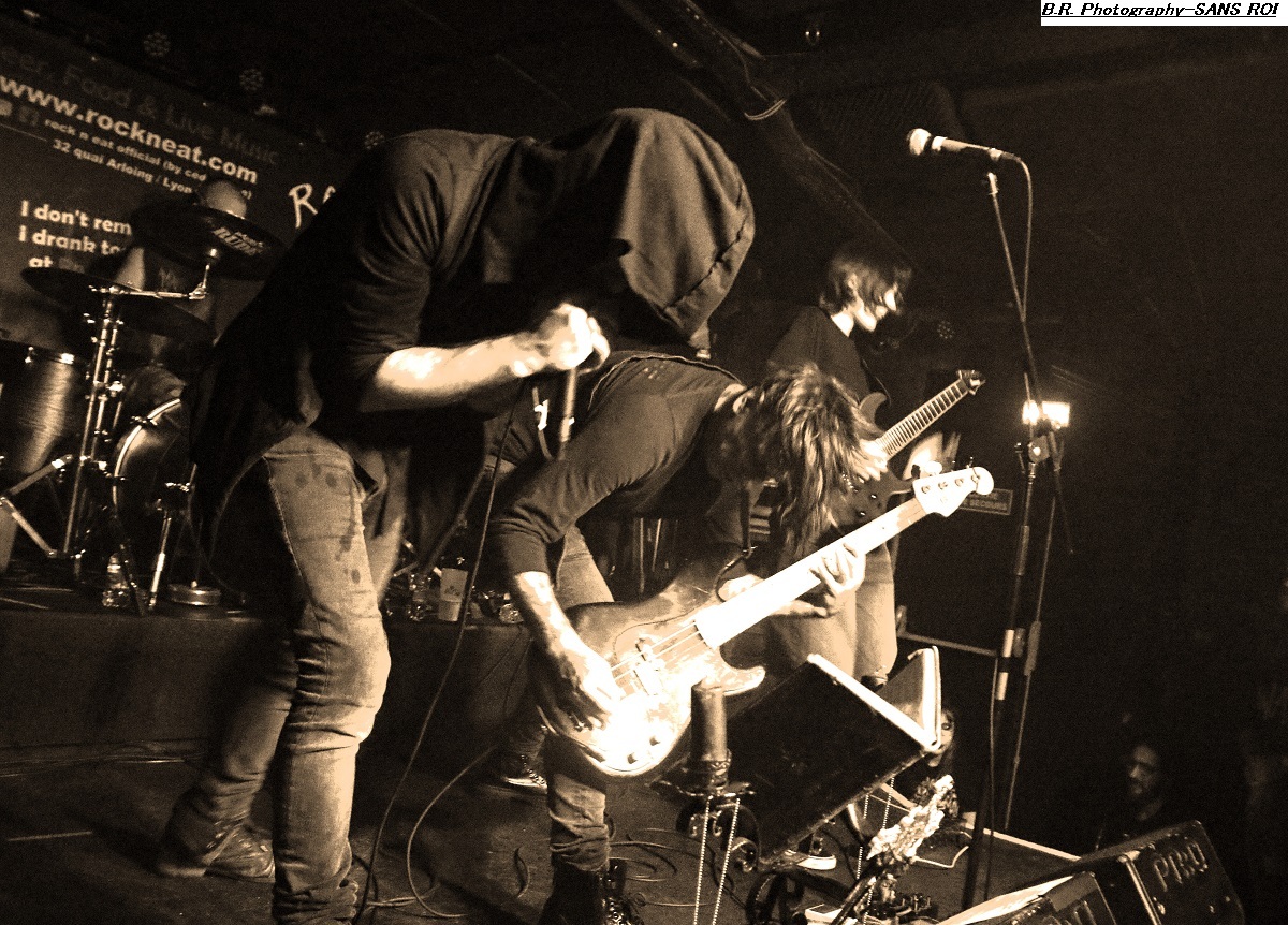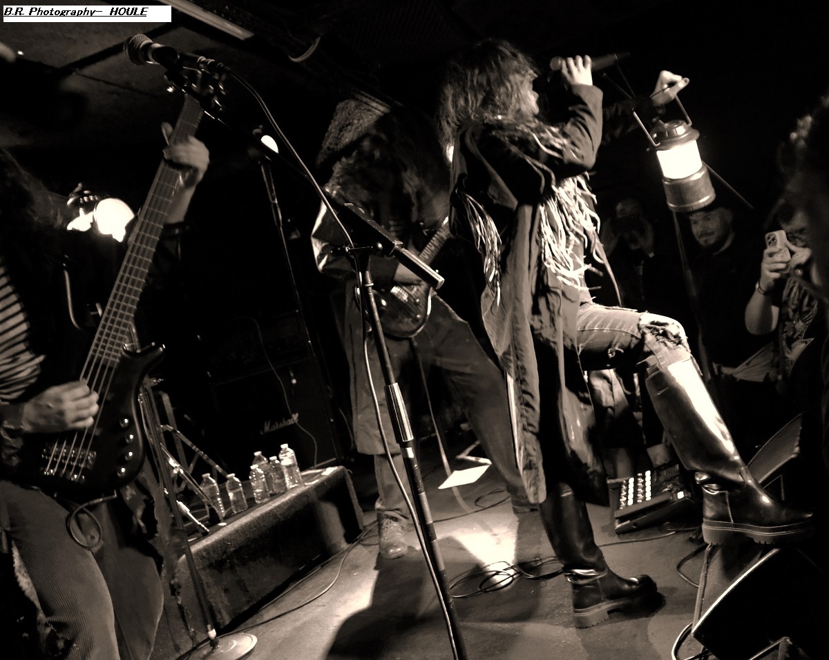SANS ROI ouvre son livre sacré dès 20heures afin de nous faire partager son engouement pour un black-metal aux influences multiples dans un registre souvent mélancolique et inquiétant mais carrément brutal dans les envois. Ce soir ils nous présentent en outre leur nouvel opus intitulé « Alchimie du Scorpion » qui donne une suite à l'inspiration, sans borne de ces Clermontois dans des ambiances oh combien occultes et passionnées. Sur scène les musiciens de Sans Roi nous prouvent qu'ils maîtrisent vraiment leur sujet et l'on adhère pleinement à leur aventure très sombre mais au final très passionnante, on aime ! C'est maintenant SILHOUETTE qui prend possession de la scène. Le groupe se base sur la présence vocale d'Ondine et ses voix claires contrebalancées par celles de Yharnam plus rugueuse et écorchée. Noirceur, riffs hypnotiques, explosions malsaines sont au menu de ce sextet Montpelliérain à l'aide de compositions enregistrées sur deux albums, à savoir « les Retranchements » de 2022 et les « Dires de l’Âme » de 2024. Leur black atmosphérique a donc tout pour nous ensorceler, mais en ce qui me concerne j'ai retrouvé au fil du concert une certaine linéarité malgré l'attention assidue à laquelle j'ai pu consacrer mon écoute. Bref, je l'avoue, j'ai un peu été déçu par leur prestation, mais beaucoup de monde dans la salle semblent avoir apprécié cette démonstration symphonique sombre aux paysages sonores déconcertants, et c'est bien là le principal n'est-ce-pas ? La suite va se révéler plus agitée plus théâtrale aussi avec l'arrivée du bateau de HOULE qui accoste la scène du Rock n'Eat avec perte et fracas. Et ce fut le déclenchement d'une tempête où les marins Parisiens se sont accrochés à la voilure de leurs instruments et au bastingage de leurs vocaux bien arrachés aux vents mauvais ! Alors, leur black-metal marin a ravagé le pont (le scène et la salle) de notre Rock n'Eat avec les mouvements « houleux » du public. Sur fond de heavy metal et de black Nordique ces « parigots » ont composé des titres incroyables taillés pour la scène, c'est original en diable, énergique avec des voix hurlées à décorner un troupeau de bisons en rut. Et si vous avez écouté leur premier album phare intitulé « Ciel Cendres et Misère Noire », vous avez dégusté ce soir devant la scène dans tous les sens du terme, amen ! Alors merci aux organisateurs de cette petite sauterie black-metal « made in France » Eclosion Booking et notre cher club du quai Arloing à Vaise-city-Lyon. Sans oublier les 3 formations en lice et le public qui a créé une sacrée ambiance. |