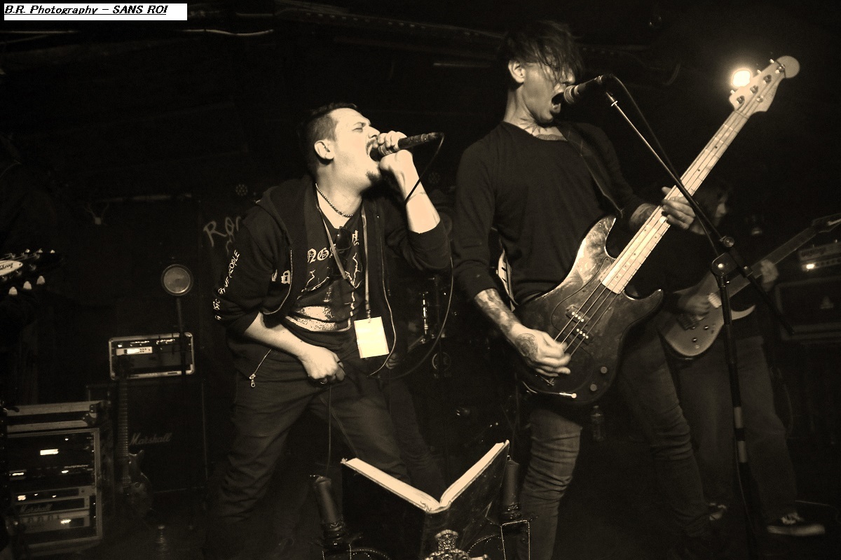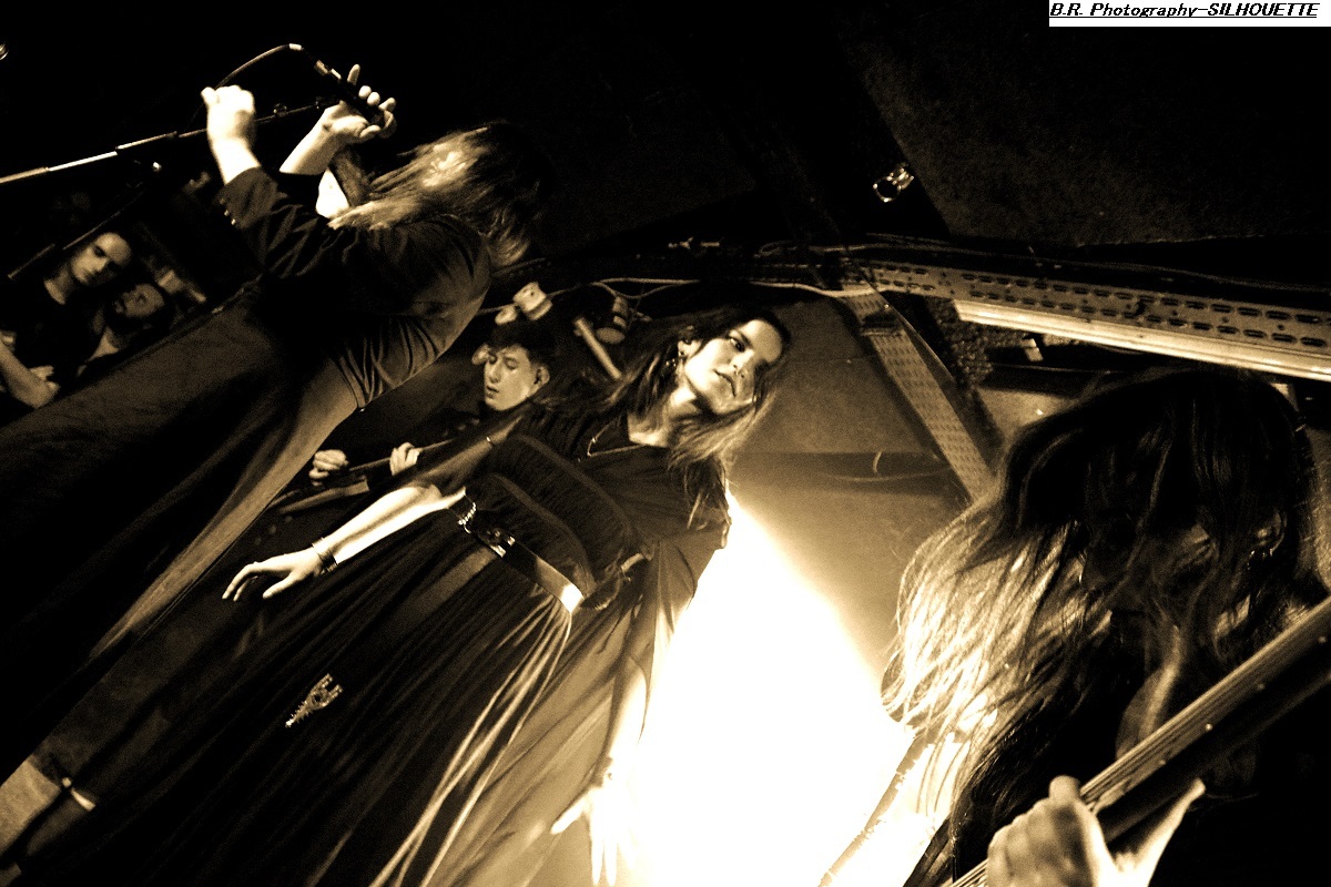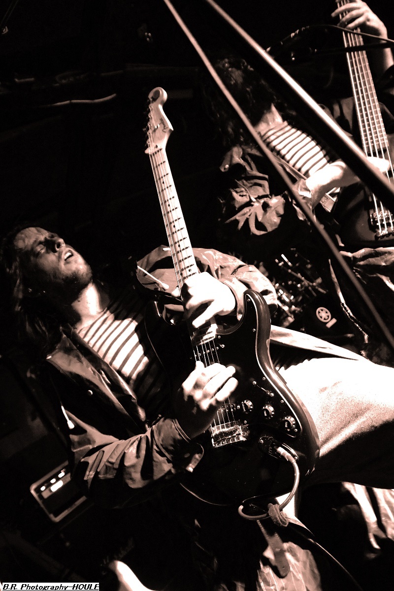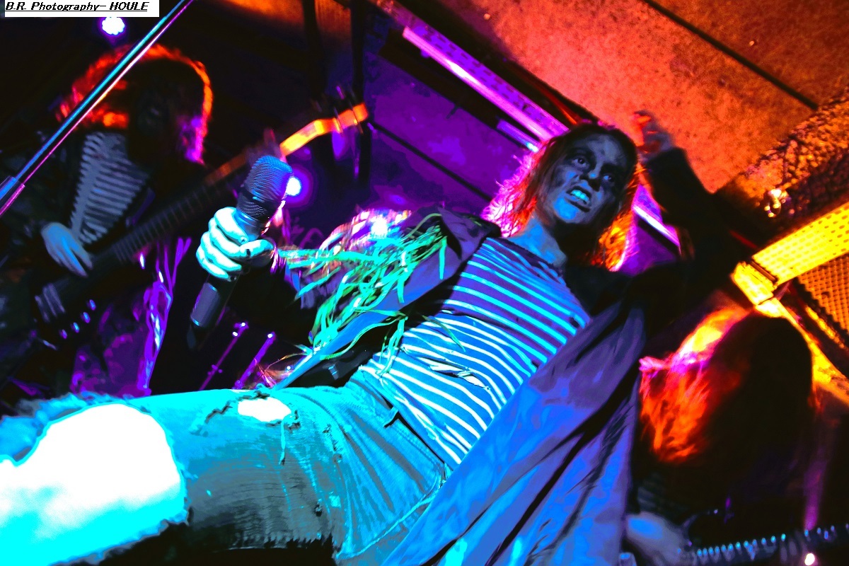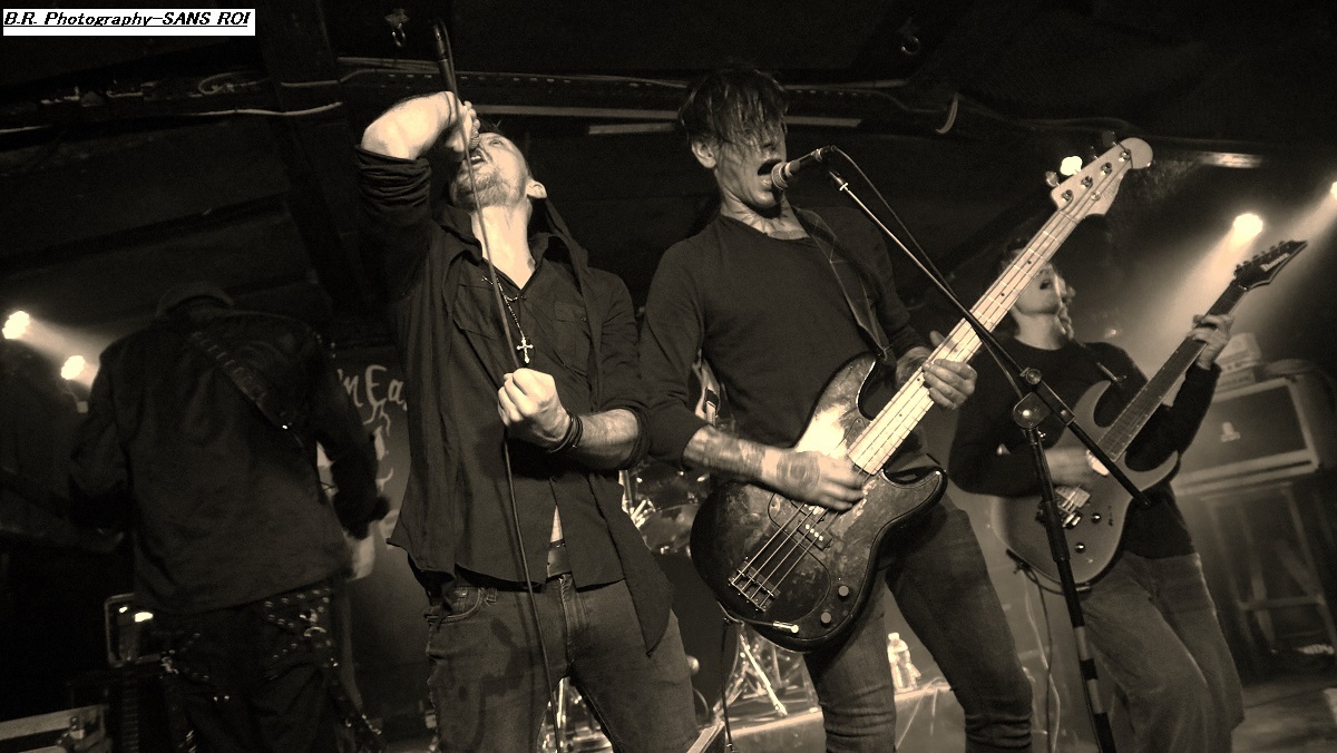 SANS ROI ouvre son livre sacré dès 20heures afin de nous faire partager son engouement pour un black-metal aux influences multiples dans un registre souvent mélancolique et inquiétant mais carrément brutal dans les envois. Ce soir ils nous présentent en outre leur nouvel opus intitulé « Alchimie du Scorpion » qui donne une suite à l'inspiration, sans borne de ces Clermontois dans des ambiances oh combien occultes et passionnées. Sur scène les musiciens de Sans Roi nous prouvent qu'ils maîtrisent vraiment leur sujet et l'on adhère pleinement à leur aventure très sombre mais au final très passionnante, on aime ! C'est maintenant SILHOUETTE qui prend possession de la scène. Le groupe se base sur la présence vocale d'Ondine et ses voix claires contrebalancées par celles de Yharnam plus rugueuse et écorchée. Noirceur, riffs hypnotiques, explosions malsaines sont au menu de ce sextet Montpelliérain à l'aide de compositions enregistrées sur deux albums, à savoir « les Retranchements » de 2022 et les « Dires de l’Âme » de 2024. Leur black atmosphérique a donc tout pour nous ensorceler, mais en ce qui me concerne j'ai retrouvé au fil du concert une certaine linéarité malgré l'attention assidue à laquelle j'ai pu consacrer mon écoute. Bref, je l'avoue, j'ai un peu été déçu par leur prestation, mais beaucoup de monde dans la salle semblent avoir apprécié cette démonstration symphonique sombre aux paysages sonores déconcertants, et c'est bien là le principal n'est-ce-pas ? La suite va se révéler plus agitée plus théâtrale aussi avec l'arrivée du bateau de HOULE qui accoste la scène du Rock n'Eat avec perte et fracas. Et ce fut le déclenchement d'une tempête où les marins Parisiens se sont accrochés à la voilure de leurs instruments et au bastingage de leurs vocaux bien arrachés aux vents mauvais ! Alors, leur black-metal marin a ravagé le pont (le scène et la salle) de notre Rock n'Eat avec les mouvements « houleux » du public. Sur fond de heavy metal et de black Nordique ces « parigots » ont composé des titres incroyables taillés pour la scène, c'est original en diable, énergique avec des voix hurlées à décorner un troupeau de bisons en rut. Et si vous avez écouté leur premier album phare intitulé « Ciel Cendres et Misère Noire », vous avez dégusté ce soir devant la scène dans tous les sens du terme, amen ! Alors merci aux organisateurs de cette petite sauterie black-metal « made in France » Eclosion Booking et notre cher club du quai Arloing à Vaise-city-Lyon. Sans oublier les 3 formations en lice et le public qui a créé une sacrée ambiance. |
