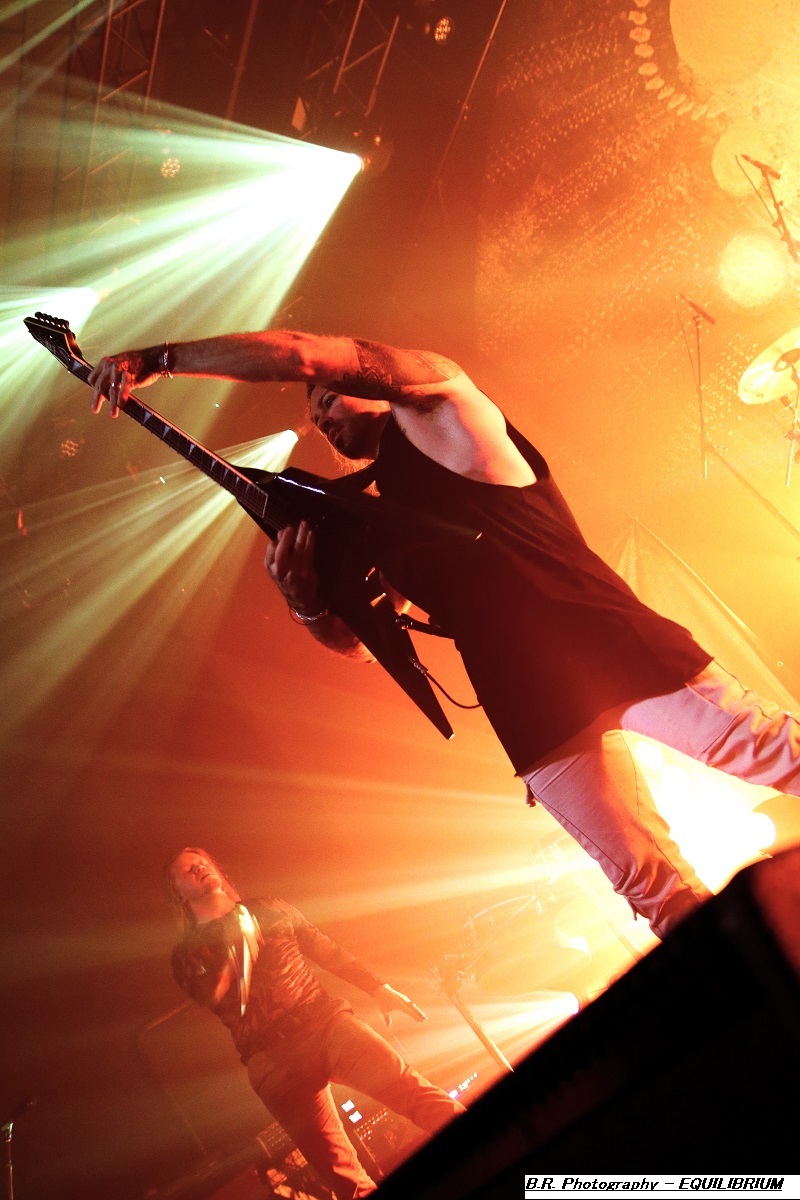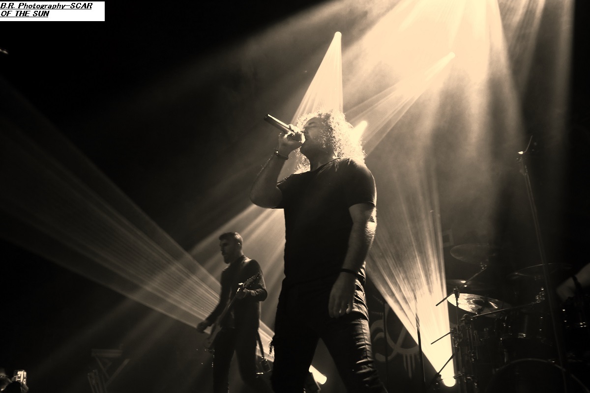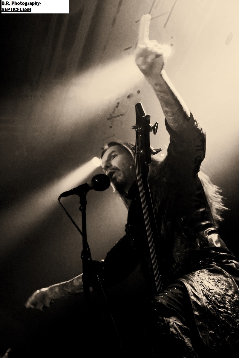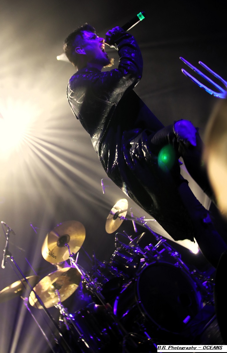 C'est SCAR OF THE SUN, groupe Grec mais formé à Londres en 2005 qui a la lourde tâche d’ouvrir le petit bal du Samedi soir dans la belle salle de la Rayonne, et ce dès 18heurs 45 devant un public pas encore totalement arrivé mais semblant bien chaud et pressé d'en découdre avec le metal bien personnel de cette formation qui possède un style très particulier mais abordable. Les Athéniens ne sont pas nés de la dernière pluie nu-metal et leur metal un brin progressif, parfois alambiqué, mais bien « rentre dedans », provoque déjà certains mouvements dans la foule, eh oui ! Mission accomplie pour eux, celle de « chauffer » la salle donc et ce fut bien. Avec OCEANS, la navigation va se faire sur les flots d'un metalcore/post-metal et nous allons voyager avec eux dans un univers chaotique fait de parties alambiquées entre groove et hurlements soudains. C'est lourd, c'est mélancolique voire dépressif, c'est parfois inattendu dans des parties vocales explosives. La tournée actuelle en ouverture d'Equilibriulm et de Septicflesh leur permet de promouvoir leur dernier opus en date paru fin Septembre 2024 intitulé « Happy » (ah bon!) afin d'enfoncer le clou d'un metalcore qui ne dit pas son nom mais cherche a innover dans un registre ultra-moderne. Bon, c'est pas mal, mais cela me semble pas simple pour eux et pour nous par la même occasion. Ça s'écoute musicalement parlant et en live le jeu de scène accroche quand même il fallait le dire . Changement de décor, changement de musique avec la venue d'EQUILIBRIUM qui met en avant un folk-metal plutôt musclé sur un rythme d'enfer. Formé en 2001 nos cousins Germains n'ont jamais fait dans la dentelle surtout avec les derniers albums en date, mais avec un line-up épuré et un nouveau frontman ils semblent vouloir ravager la scène avec perte et fracas à l'aide d'une chorégraphie imparable et avec des envoi plombés sur un binaire exacerbé. Et bien entendu le public réagit au quart de tour avec des démonstrations physiques quasiment non stop durant le set sauf pour le moment « briquets allumés », pardon maintenant c'est portables allumés ! Bien entendu le rapprochement des musiciens et chanteur avec ceux du premier rang provoque l'émoi dans ce public aux anges (au diable pardon ! Ce soir leur set-list comprendra bien sûr les titres « Gnosis » et « Cerulean Skies » enregistrés cette année avec le nouveau chanteur, mais aussi des titres issus de leur imposante discographie comme par exemple « Renegades » (2019), « Blust im Auge » (2008), et « One Folk » (2020). Bref, Equilibrium semble vouloir revenir avec force sur le devant de la scène avec cette tournée 2024 et le moins que l'on puisse dire, c'est qu'ils semblent y parvenir témoin ce « live » à Lyon de ce soir qui fut très démonstratif ! Les titans Grecs du death metal symphonique SEPTICFLESH sont de retour à Lyon ce 19 Octobre 2024 faisant étape de leur tournée « Modern Primitive » et ce sur la grande scène de la Rayonne afin de nous présenter bien sûr leur nouvel et 11ème album en nous interpellant comme d'habitude avec des « are you ready my friends ». Spiros « Seth » Antoniou et ses acolytes nous plongent dans le bain d'un death/black/dark mélodique et symphonique d'une puissance inégalée au fil des ans inspiré par les mythes et une certaine culture Grecque de l'antiquité. C'est violent souvent, imposant de maîtrise sur des orchestrations infernales où les musiciens tissent leurs riffs démoniaques, leurs vocaux monstrueux sur des rythmiques d'enfer (sic). Après toutes ces années passées à nous détruire notre matière grise, Septicflesh n'a rien perdu de sa superbe et ce soir encore une fois nous avons dégusté dans tous les sens du terme, quelle claque musicale et visuelle, quelle intensité démoniaque de leurs propos, on aime, que dis-je, on adore, amen ! Set-list : The Wampire from Nazareth, Noromancer, Pyramid God, Hirophant, Portrait of a Headless Man, Coming Storm, Prometheus, Martyr, A Desert Throne, Communion , The Collector, Persepolis, Anubis, Darkart. Après cette soirée métallique en diable il convient de remercier SOUNDS LIKE HELL Productions pour l'accréditation accordée à Pavillon666. Merci bien entendu aux 4 formations qui ont animé la Rayonne ainsi qu'au public pour l'ambiance folle instaurée durant le concert ! |