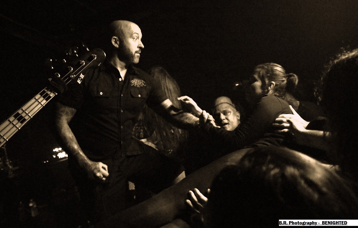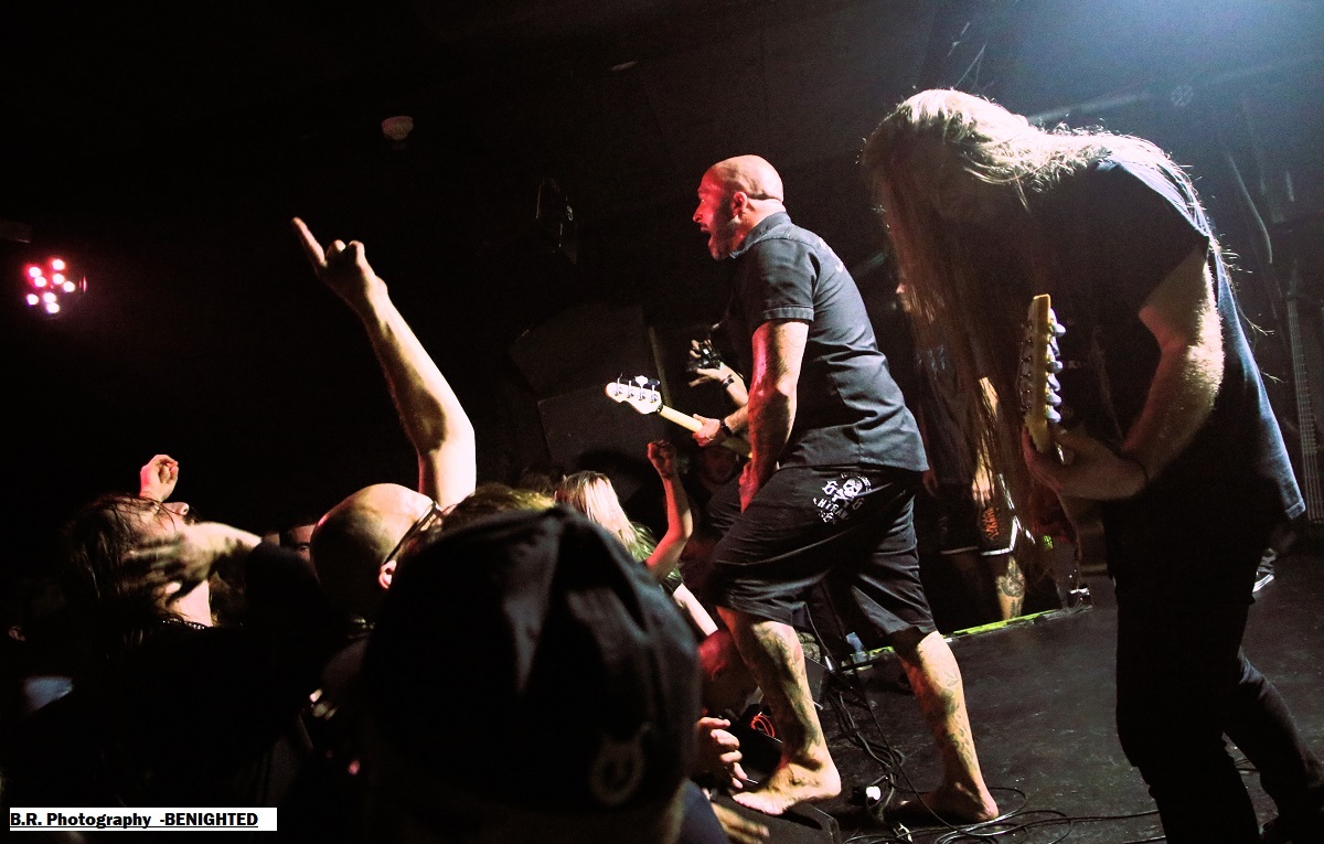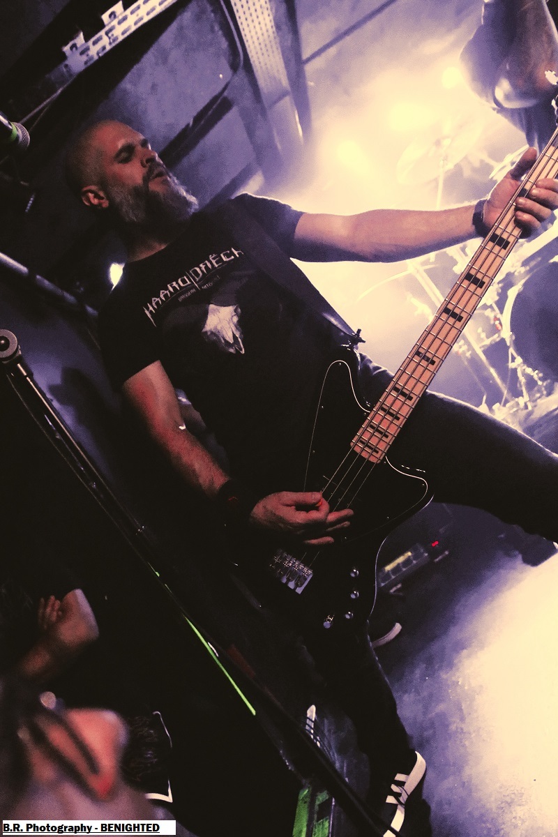 Dans les sous-sols du quai Arloing la foule des amis grandit au fur et à mesure dans ces lieux dès l'ouverture des portes vers 19heure, la soirée va être chaude il me semble, torride serait le mot le plus approprié. WARSIDE ouvre le feu dès 20heures 30 et d'emblée c'est la guerre dans le public. Évidemment le gang des Lyonnais ne fait pas dans la dentelle vous le savez et d'entrée de jeu nous en prenons plein la « g...le », c'est sans appel ! Les membres de ce groupe sont d'anciens briscards du death ayant œuvré dans d'autres formations auparavant et le metal extrême ils connaissent bien donc, ça se sent, ça se ressent dans leurs envois du metal-de-la-mort-qui-tue, envois qui font mouche ce soir excitant un public de connaisseurs qui ne tarde pas à se mettre en mouvement. Leur set se veut donc implacable de maîtrise dans le style c'est un fait indéniable ! D'ailleurs leur premier EP de 2018 intitulé « The Enemy Inside » nous avait prouvé qu'ils comptaient bien nous fracasser les conduits auditifs, mais avec doigté svp ! Bref, Warside a ravagé la scène durant 45 minutes dans notre club préféré rempli jusqu'à la gueule pour l'occasion avec en bonus l'intervention de deux « brutos » en guest, Julien de Benighted et Mat de Festering Process, nous avons aimé ! Après quelques mousses et le nettoyage de la scène (cqfd), la tension monte encore d'un cran avec l'arrivée sur scène de Julien Truchan, Pierre Arnoux, Emmanuel Dalle et Kevin Paradis, membres de BENIGHTED qui ne sont pas venus là ce soir dans ce Rock n'Eat qui est cher à leur cœur pour enfiler des perles, mais pour nous détruire ce qu'il nous reste de neurones (qui a dit comme d'habitude?). Et la salle de concert éclate sous les coups de boutoir des Stéphanois qui s’éclatent sur les planches, et nous aussi dans le pit. Quelle « kecla dans la chetron » comme dirait mon ami punk dérangé. Le son est au top, les murs vont-ils résister ? Le public n'en revient pas, ça « swingue » de partout, mais où, est donc passé ma godasse, mon portable, mon gobelet à moitié plein. Le reste des boissons houblonnées est sur le sol pour des dérapages incontrôlés, le public s’envoie donc en l'air ! La set-list de ce soir nous propose un savant mix de titres figurants dans l'importante discographie du groupe. Leur death/grind flirtant parfois avec du black se révèle donc violent, goûteux, imagé jusqu'au bassiste qui se frappe régulièrement le front, quelle ambiance torride depuis « Reptilian » jusqu'à 'Foetus » et « Let the Blood Spill Between my Broken Teeth » en passant par « Carnivore Sublime », « Morgue » et autre « Metastasis ». Que du bon au menu donc, du millésimé pour une formation qui continue à faire du « bruit » notamment avec leur nouvel album de 2024 « Ekbom » rempli de « pig squeals » mais avec une technicité hors norme dans ce style bien à eux. Alors ce soir leur set fut écrasant de dextérité, groovy à souhait et tout simplement incroyable remplit d'un monstrueux talent, stay brutal ! Comment faire pour ne pas remercier le Rock n'Eat qui fête, 7 années de bons et loyaux services à la cause du rock/metal ? Comment ne pas remercier les deux « gangs » brutaux qui ont explosé les sous-sols de Vaise-city ? Comment ne pas remercier ce public fan de metal, celui qui « tue » et qui ont instauré une ambiance de « ouf » ? Alors conclusion, on recommence quand ce genre de sauterie car on aime pardessus tout, c'est sans appel ! |