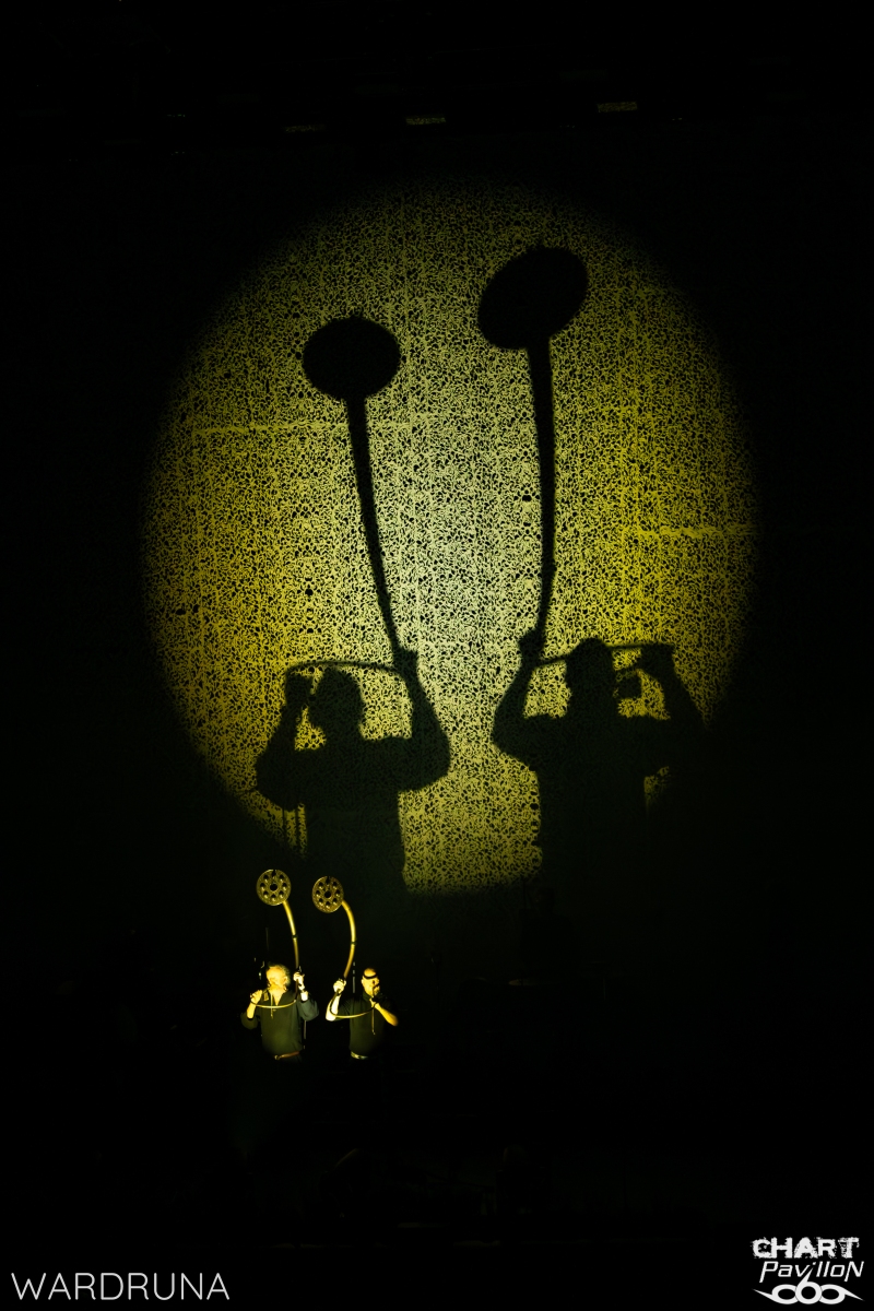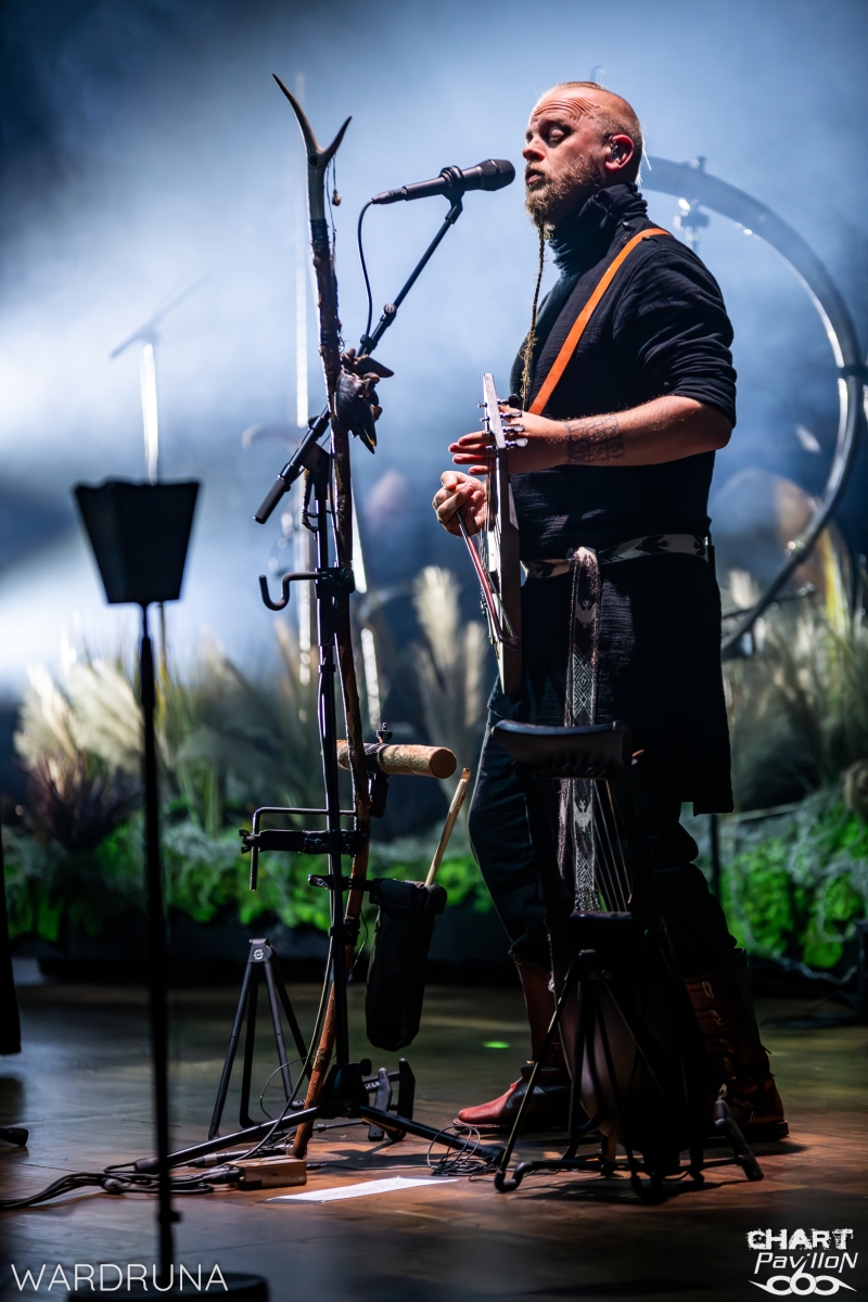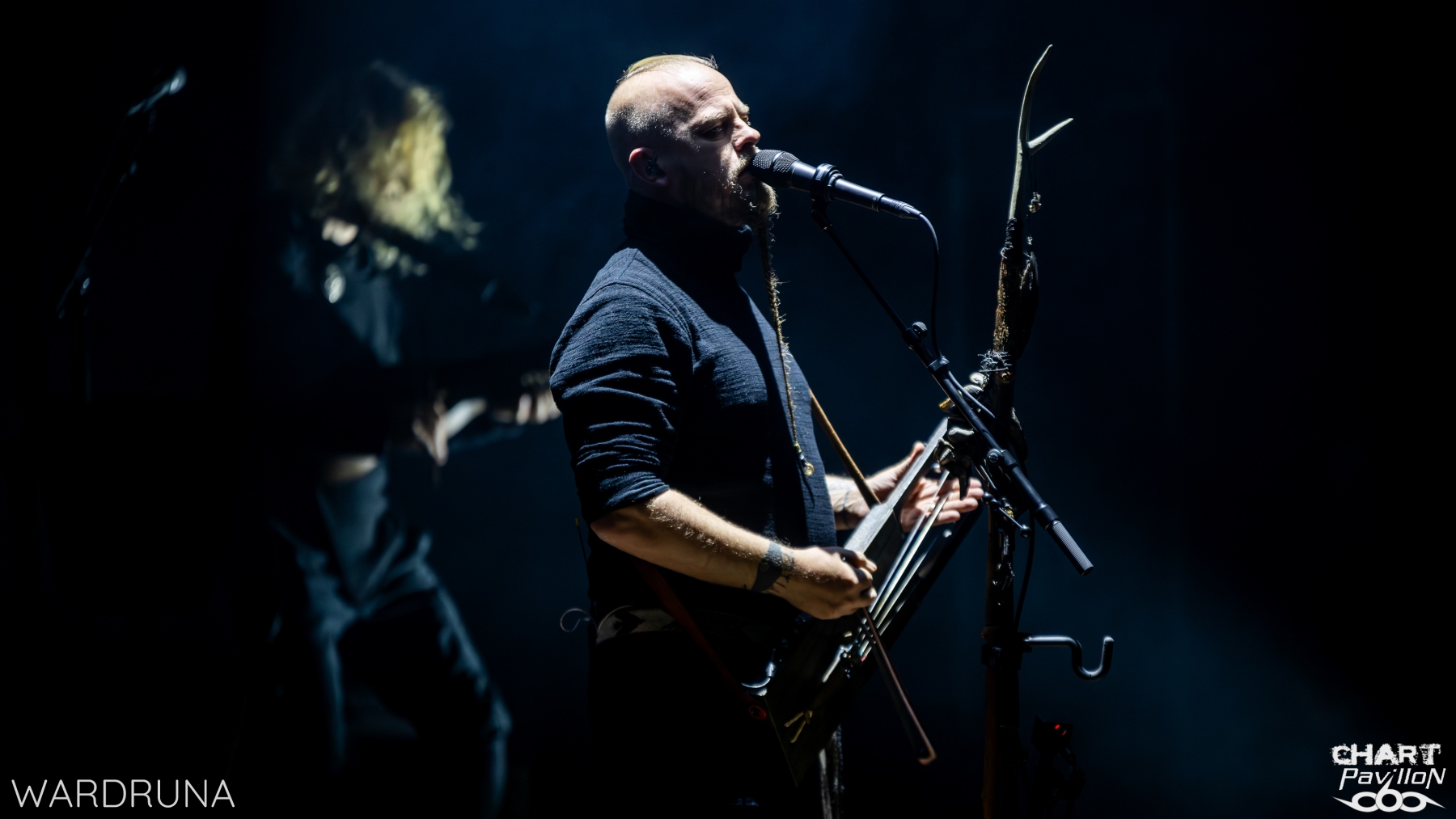 Pas de première partie cette fois. Pas de nouveau KALANDRA à découvrir en ouverture. Un peu dommage, car la soirée se fait plus courte, et l’ambiance si particulière des groupes de ce style nous donne toujours envie d’en profiter davantage. Cela ne nous empêchera pas de savourer une bonne heure et demie de WARDRUNA, qui fait son entrée au son des corbeaux avec « Kvitran » et « Skugge ». La magie opère instantanément. On se laisse très vite absorber dans cet univers musical empreint d’onirisme. Einar a raison lorsqu’il déclare que cette musique n’a pas de frontières. Elle est faite pour tout le monde, car elle puise ses racines dans une forme primitive, ce qui la rend si puissante et touchante. WARDRUNA fait partie de ces groupes qui vont chercher au plus profond de nous-mêmes pour provoquer des émotions rares, celles qui vous font frissonner intensément. Après, à chacun sa sensibilité, mais il est difficile de résister à un morceau comme « Voluspa », surtout lorsqu’il est mis en scène de manière aussi remarquable. Les décors de scène, mêlant végétation et filets de camouflage, apportent une dimension naturelle tout en donnant une ampleur grandiose aux fonds et côtés de scène. La projection des ombres, un procédé simple mais terriblement efficace, confère une puissance visuelle incroyable. Tout est minutieusement travaillé, avec une sobriété maîtrisée mais percutante. Il ne reste plus qu’à s’installer confortablement dans son fauteuil et se laisser emporter par la beauté et la puissance de titres tels que « Tyr », « Runaljod » ou l’incroyable « Fehu ». Impossible de conclure ce concert sans passer par « Helvegen », avant un rappel qu’Einar assume seul, armé de son jouhikko, pour une interprétation de « Snake Pit Poetry », morceau issu de la bande originale de la série Vikings. WARDRUNA nous a, une fois encore, transportés hors du temps avec un concert d’une beauté et d’une puissance absolues. On regrette un peu l’absence de première partie, qui aurait prolongé les festivités, mais cela n’enlève rien à la singularité et à la qualité du moment. Un grand merci à SOUNDS LIKE HELL pour votre travail et votre savoir-faire en matière d’organisation et de programmation. |