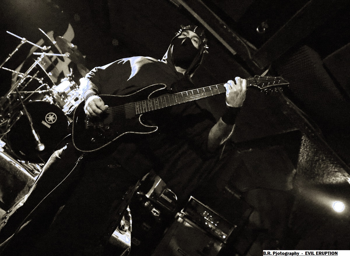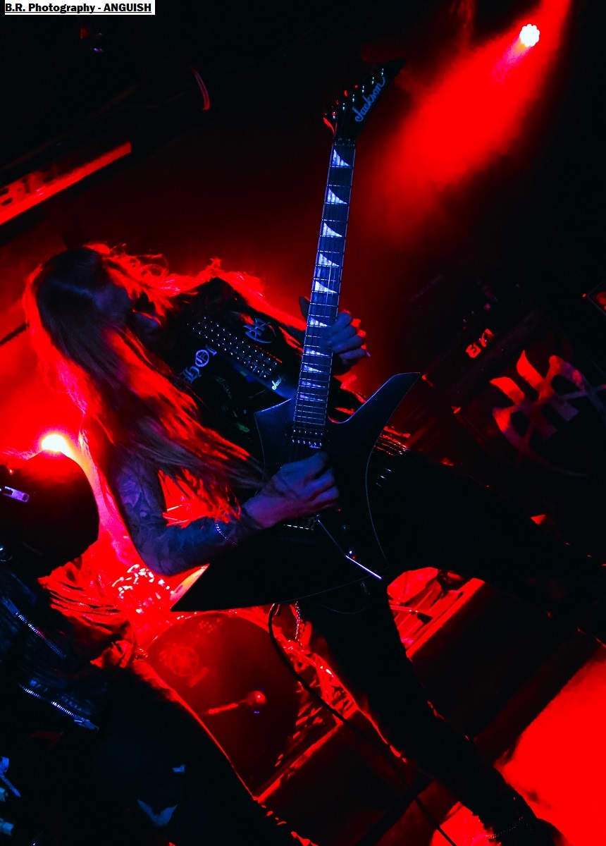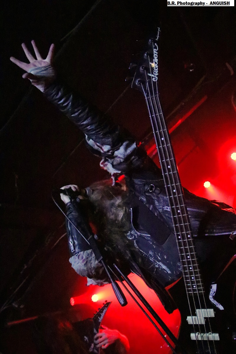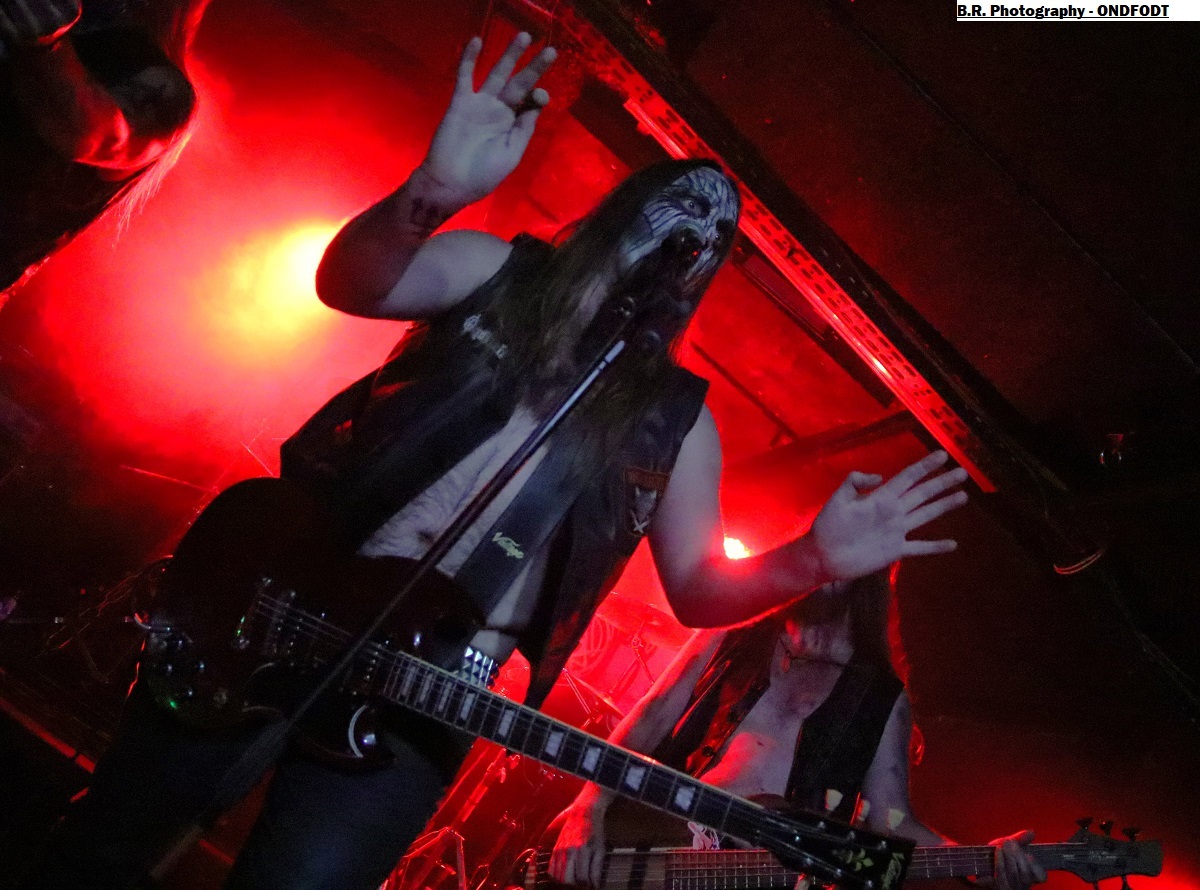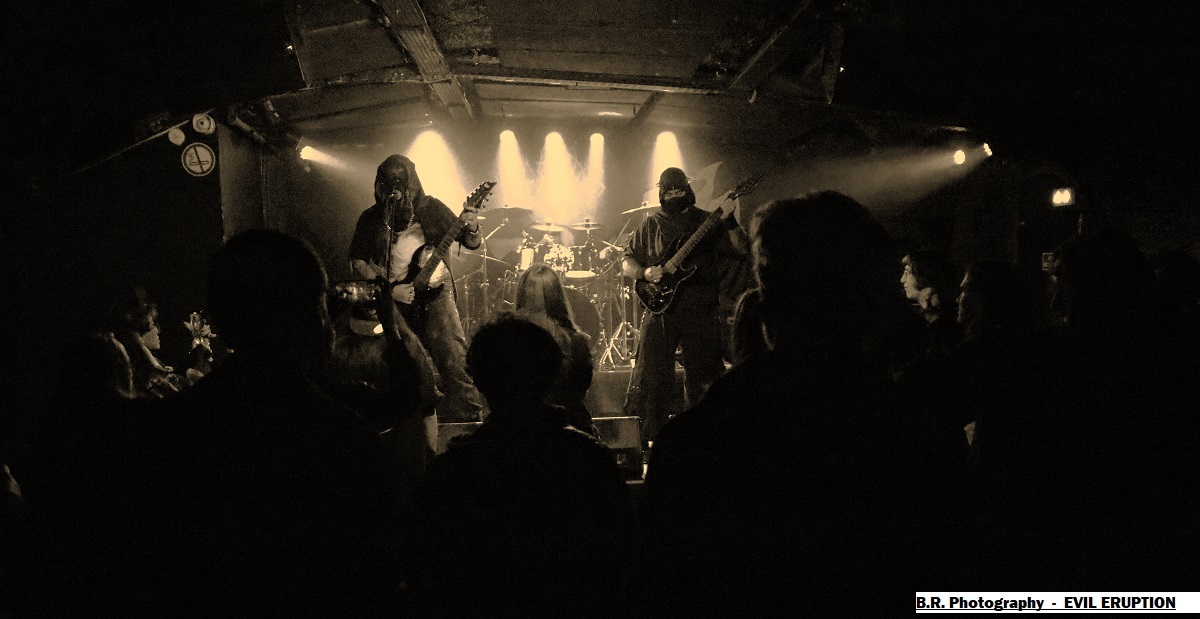 On ouvre le petit bal maudit avec un EVIL ERUPTION qui ne fait toujours pas dans la dentelle depuis sa création, il y a...longtemps déjà ! Ici, ces bourreaux de l’underground persistent et signent avec un « true » black sans compromis, sans faux semblants. D'accord c'est toujours dans une veine old-school avec des dérapages thrash mais on se complaît a toujours aimer les envois rapides et puissants de ce trio masqué, une éruption volcanique donc qui ne peut nous laisser indifférents, la classe quoi ! On calme le jeu (quoique) avec le necro-doom des Suédois d'ANGUISH au look burné et aux envies profondément puissantes et noires comme de l'encre. Alors on pense évidemment à du Black Sabbath survitaminé mais aussi aux premiers enregistrements d'un certain Cathedral. Leur son est pachydermique et leurs compositions nous font entrer dans une spirale infernale propre aux Helvètes de Celtic Frost par exemple. Mais ici c'est plus « sale », plus brut de décoffrage malgré une certaine technique relevant la sauce du doom. Seul inconvénient en ce qui me concerne, une certaine linéarité se fait jour (nuit?) au bout d'un moment. Mais les aficionados du style y ont sûrement trouvé leur compte et c'est bien là le principal n'est-ce pas ! Et puis, et puis, changement de décor avec un retour au black plutôt speed, au black n'roll si vous voulez avec les Finlandais d'ONDFODT qui vont déchaîner les passions au bout de quelques titres dans le public collé à la scène qui ne tardera pas à se mettre en mouvement. Ces « mal nés » utilisent à fond la manette (pas la canette!) binaire afin de propulser un metal, certes bien noir et occulte, mais emprunt de déviances parfois folk-metal créant du coup un style qui leur est propre, et ça marche ! Nous avons donc apprécié leur venue en terres Lyonnaise étape de leur tournée européenne actuelle intitulée « Nordiska Mörkret Tour ».. Merci donc à Hell Frog Promotion et au Rock n'Eat d'avoir programmé cette soirée haute en noirceur. Merci aux 3 hordes maléfiques qui ont brûlé les planches dans les sous sols du quai Arloing de Lyon. On recommence quand ce genre de soirée, nous sommes demandeurs ! |