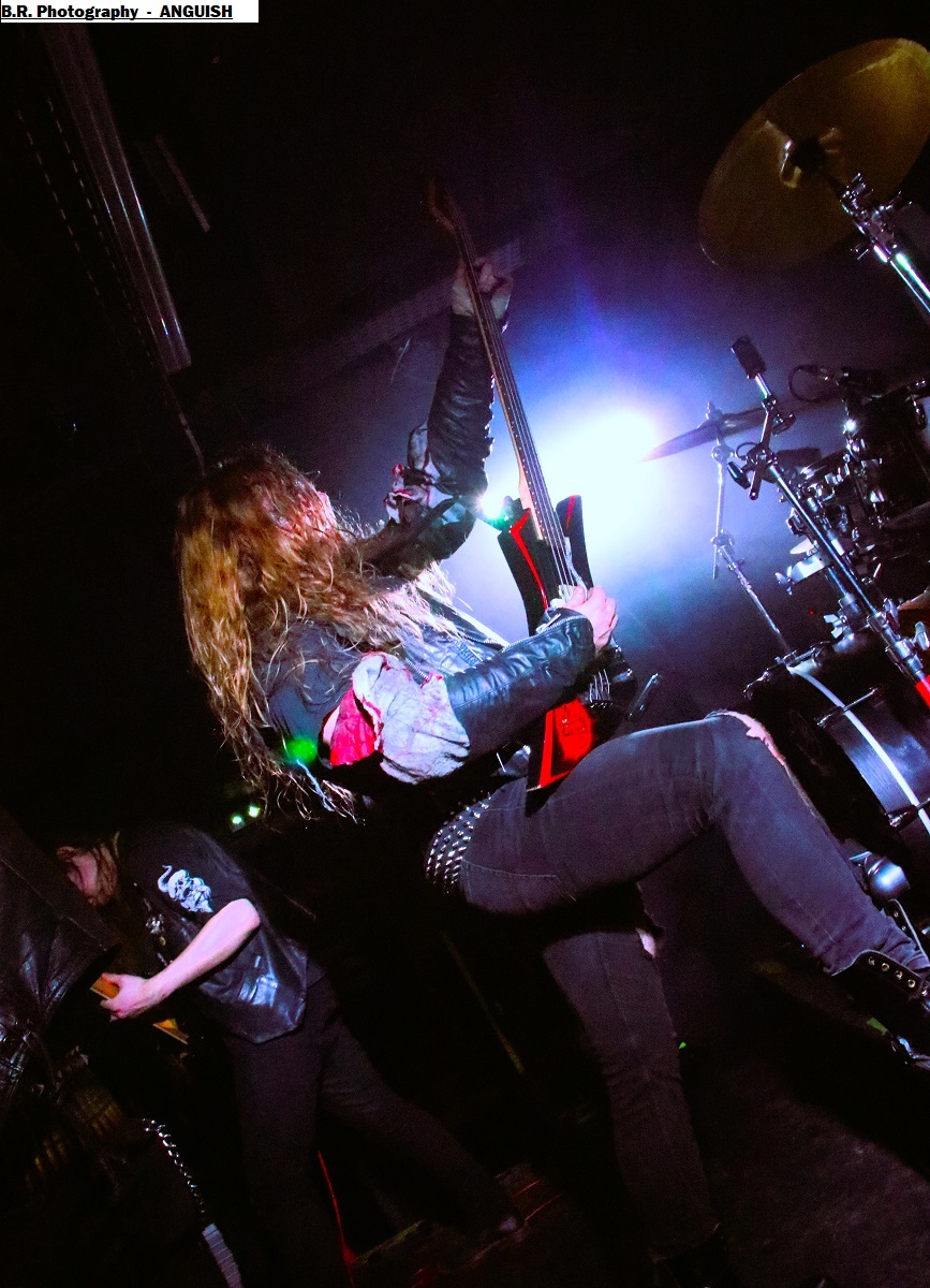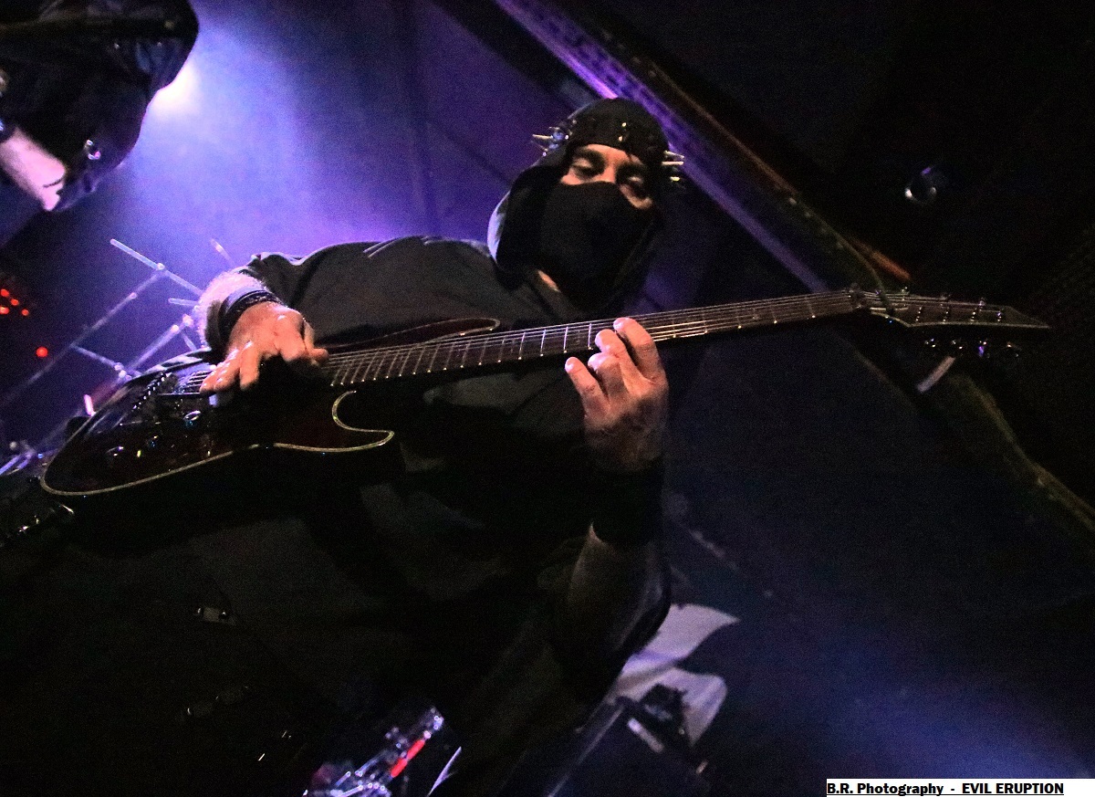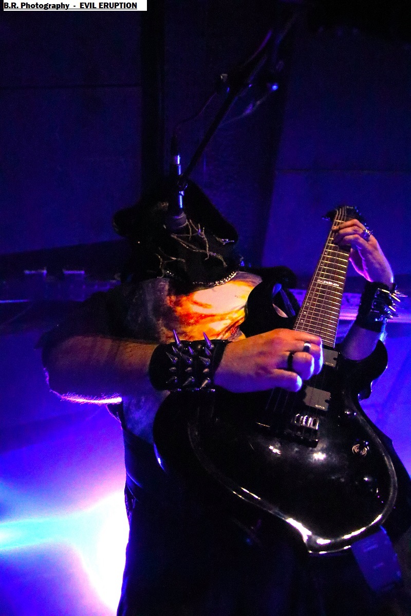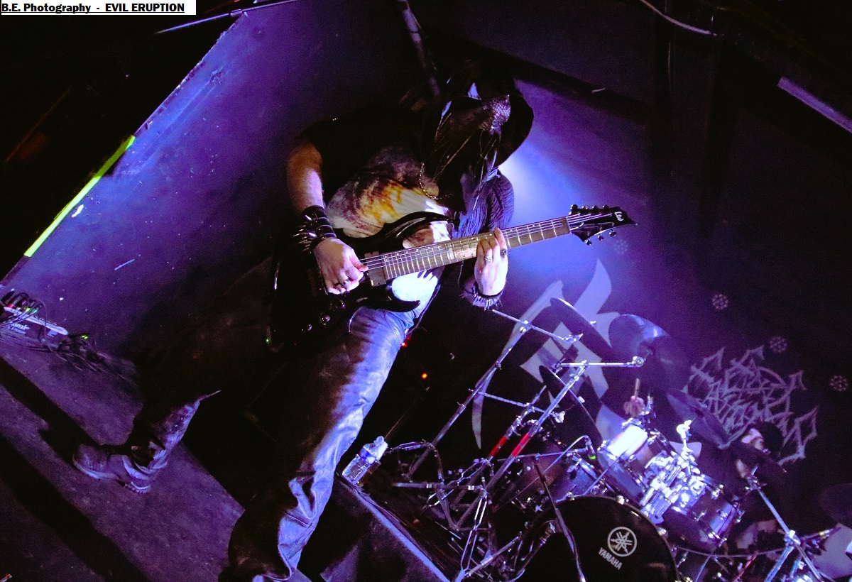On ouvre le petit bal maudit avec un EVIL ERUPTION qui ne fait toujours pas dans la dentelle depuis sa création, il y a...longtemps déjà ! Ici, ces bourreaux de l’underground persistent et signent avec un « true » black sans compromis, sans faux semblants. D'accord c'est toujours dans une veine old-school avec des dérapages thrash mais on se complaît a toujours aimer les envois rapides et puissants de ce trio masqué, une éruption volcanique donc qui ne peut nous laisser indifférents, la classe quoi ! On calme le jeu (quoique) avec le necro-doom des Suédois d'ANGUISH au look burné et aux envies profondément puissantes et noires comme de l'encre. Alors on pense évidemment à du Black Sabbath survitaminé mais aussi aux premiers enregistrements d'un certain Cathedral. Leur son est pachydermique et leurs compositions nous font entrer dans une spirale infernale propre aux Helvètes de Celtic Frost par exemple. Mais ici c'est plus « sale », plus brut de décoffrage malgré une certaine technique relevant la sauce du doom. Seul inconvénient en ce qui me concerne, une certaine linéarité se fait jour (nuit?) au bout d'un moment. Mais les aficionados du style y ont sûrement trouvé leur compte et c'est bien là le principal n'est-ce pas ! Et puis, et puis, changement de décor avec un retour au black plutôt speed, au black n'roll si vous voulez avec les Finlandais d'ONDFODT qui vont déchaîner les passions au bout de quelques titres dans le public collé à la scène qui ne tardera pas à se mettre en mouvement. Ces « mal nés » utilisent à fond la manette (pas la canette!) binaire afin de propulser un metal, certes bien noir et occulte, mais emprunt de déviances parfois folk-metal créant du coup un style qui leur est propre, et ça marche ! Nous avons donc apprécié leur venue en terres Lyonnaise étape de leur tournée européenne actuelle intitulée « Nordiska Mörkret Tour ».. Merci donc à Hell Frog Promotion et au Rock n'Eat d'avoir programmé cette soirée haute en noirceur. Merci aux 3 hordes maléfiques qui ont brûlé les planches dans les sous sols du quai Arloing de Lyon. On recommence quand ce genre de soirée, nous sommes demandeurs ! |