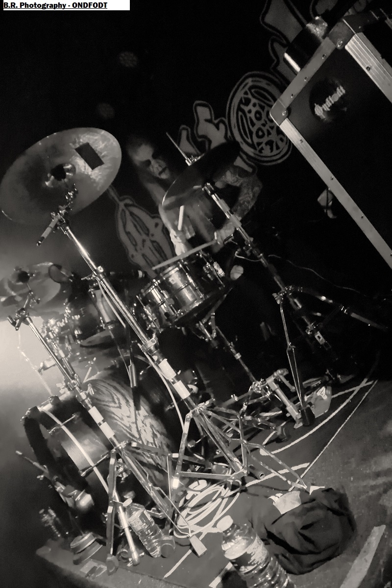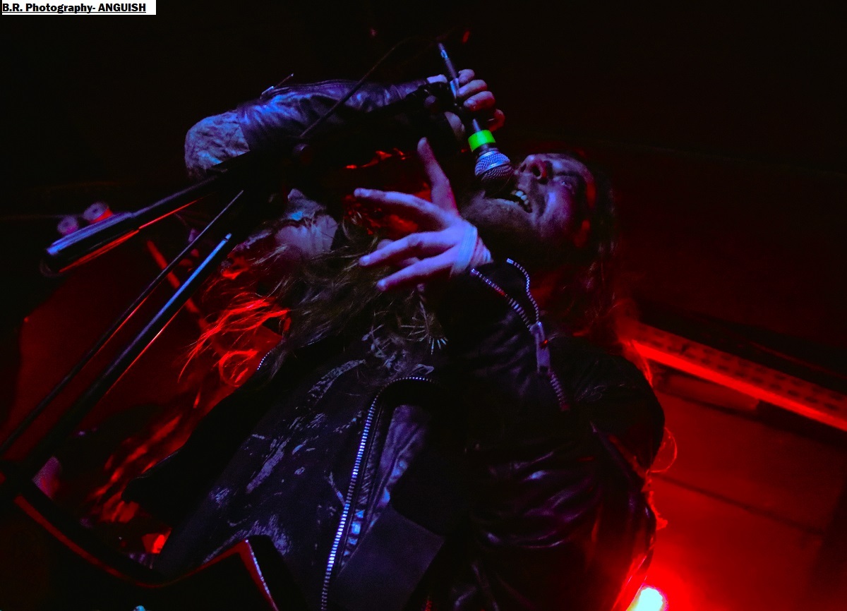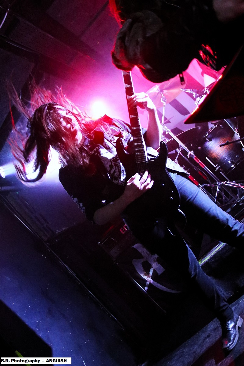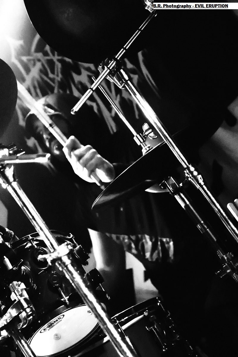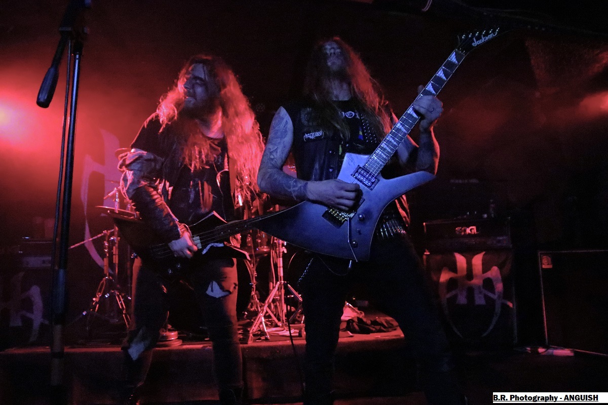 On ouvre le petit bal maudit avec un EVIL ERUPTION qui ne fait toujours pas dans la dentelle depuis sa création, il y a...longtemps déjà ! Ici, ces bourreaux de l’underground persistent et signent avec un « true » black sans compromis, sans faux semblants. D'accord c'est toujours dans une veine old-school avec des dérapages thrash mais on se complaît a toujours aimer les envois rapides et puissants de ce trio masqué, une éruption volcanique donc qui ne peut nous laisser indifférents, la classe quoi ! On calme le jeu (quoique) avec le necro-doom des Suédois d'ANGUISH au look burné et aux envies profondément puissantes et noires comme de l'encre. Alors on pense évidemment à du Black Sabbath survitaminé mais aussi aux premiers enregistrements d'un certain Cathedral. Leur son est pachydermique et leurs compositions nous font entrer dans une spirale infernale propre aux Helvètes de Celtic Frost par exemple. Mais ici c'est plus « sale », plus brut de décoffrage malgré une certaine technique relevant la sauce du doom. Seul inconvénient en ce qui me concerne, une certaine linéarité se fait jour (nuit?) au bout d'un moment. Mais les aficionados du style y ont sûrement trouvé leur compte et c'est bien là le principal n'est-ce pas ! Et puis, et puis, changement de décor avec un retour au black plutôt speed, au black n'roll si vous voulez avec les Finlandais d'ONDFODT qui vont déchaîner les passions au bout de quelques titres dans le public collé à la scène qui ne tardera pas à se mettre en mouvement. Ces « mal nés » utilisent à fond la manette (pas la canette!) binaire afin de propulser un metal, certes bien noir et occulte, mais emprunt de déviances parfois folk-metal créant du coup un style qui leur est propre, et ça marche ! Nous avons donc apprécié leur venue en terres Lyonnaise étape de leur tournée européenne actuelle intitulée « Nordiska Mörkret Tour ».. Merci donc à Hell Frog Promotion et au Rock n'Eat d'avoir programmé cette soirée haute en noirceur. Merci aux 3 hordes maléfiques qui ont brûlé les planches dans les sous sols du quai Arloing de Lyon. On recommence quand ce genre de soirée, nous sommes demandeurs ! |