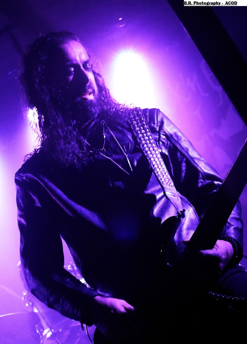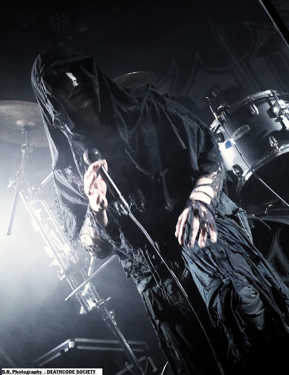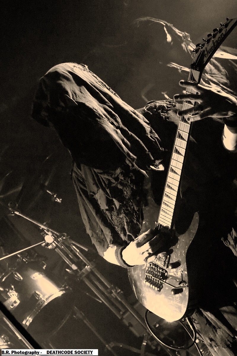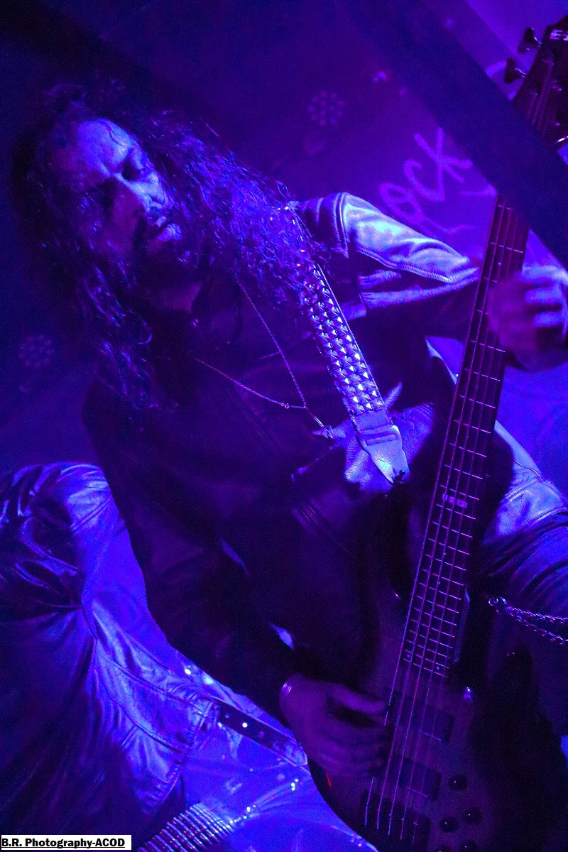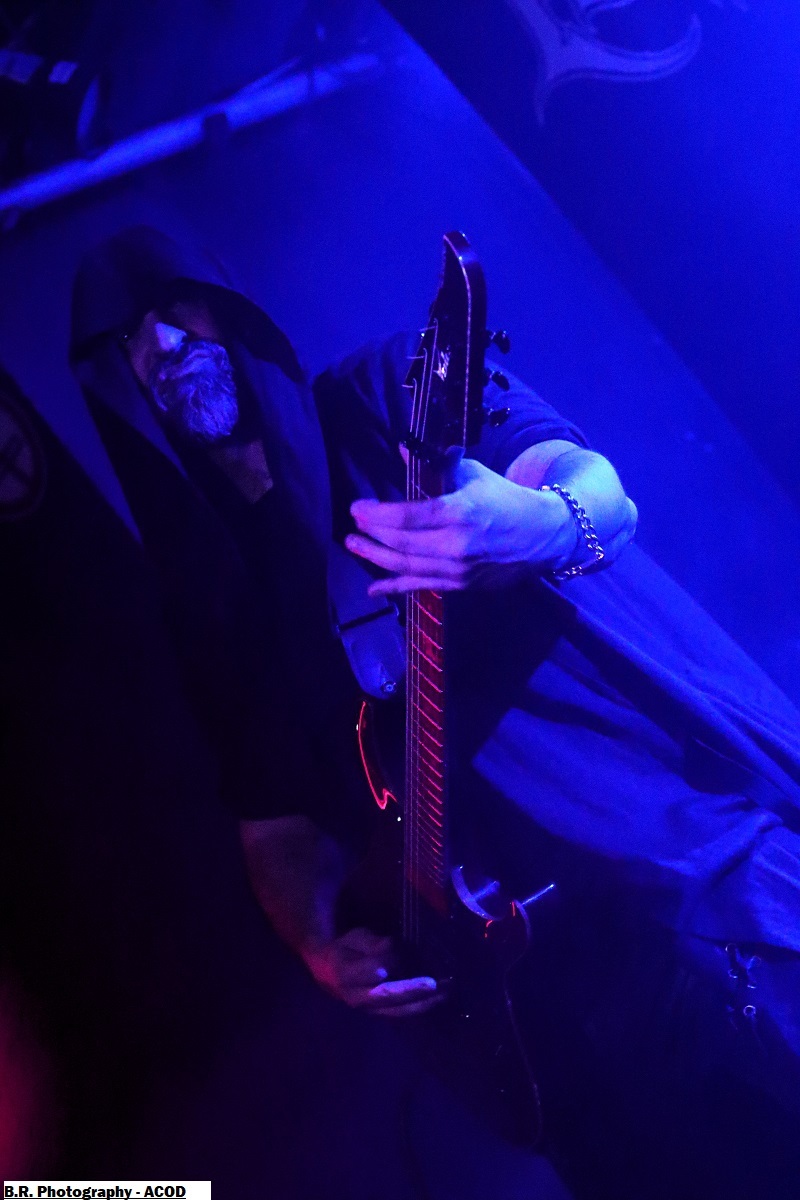 C'est DELIVERANCE qui se présente à nous en premier avec des musiciens cachés dans la pénombre entre candélabres électriques faiblement lumineux. Alors la soirée s'annonce bien sombre, c'est la « Fête des Lumières Éteintes » en somme. Deliverance navigue sur les eux troubles et marécageuses d'un black ancré de par ses racines dans un sludge boueux sur des riffs lents et lancinants. C'est chaotique à souhait, ça nous prend à la gorge et ça ne nous lâche plus, nous avons du, mal à respirer dans cette atmosphère étouffante. Du coup nous entrons dans un monde, certes old-school, mais aux avancées modernes, il fallait oser. Pour aller plus loin après ce concert bien enlevé je vous invite à vous pencher sur leur discographie, « CHRST » (2017), « Holocaust 26:1,46 (2019) et Neon Chaos in a Junk Sick Dawn (2022), Les haut-savoyards de DEATHCODE SOCIETY prennent la suite dans le bleuté d'une lumière froide et glacée. Fondé rn 2009 cette entité maléfique a enregistré deux albums à 8 ans d'intervalle, « Eschatonizer » en 2015 et « Unlightenment » en 2023, le groupe ayant peaufiné ses compositions. Des titres plus personnels s'écartant de leurs inspirations allant de Emperor à Dimmu Borgir en passant par Septicflesh. Ce soir, derrière leurs masques inquiétants ils vont nous donner un live bien maîtrisé, bien noir et bien épique dans des envolées souvent brutales mais néanmoins symphonique en fond d'écran. Ce fus donc bien majestueux malgré un son, celui des guitares notamment, un brin brouillon par moments. Bref, Deathcode Society se révèle puissant en live et nous aimons bien leur aventure, amen ! Les sudistes d'ACOD débarquent maintenant sur les planches avec la ferme intention de nous faire déguster en live des titres de leur nouveau « méfait » de 2024 intitulé « Versets Noirs », mais pas que ! En effet depuis « Point Zero paru en 2009 jusqu'à ce nouvel album, les Marseillais n'on t pas chômé en enregistrements et concerts. Et ce soir ça commence fort avec « May This World Burn » qui arrache en live. Leur black/death épique, mélodique mais agressif et vénéneux va encore une fois mettre tout le monde d'accord et nous ensorceler avec une puissance décuplée, une présence mortelle de tous les instants. Et pour souligner leur progression dans les méandres d'une brutalité aux mélodies acides, le groupe nous gratifiera d'une reprise bien sentie du titre « Black Trip » de Samael. Au final ,Acod gravit un a un les échelons d'une certaine reconnaissance dans le paysage maudit d'un black/death à la française ! Merci donc à Metallian Prod et au Rock n'Eat pour cette soirée noire comme de l'encre. Merci aux trois entités maléfiques qui ont hanté les lieux dans une ambiance passionnée, mélancolique et violente à la fois ! |