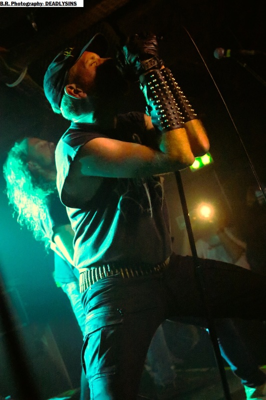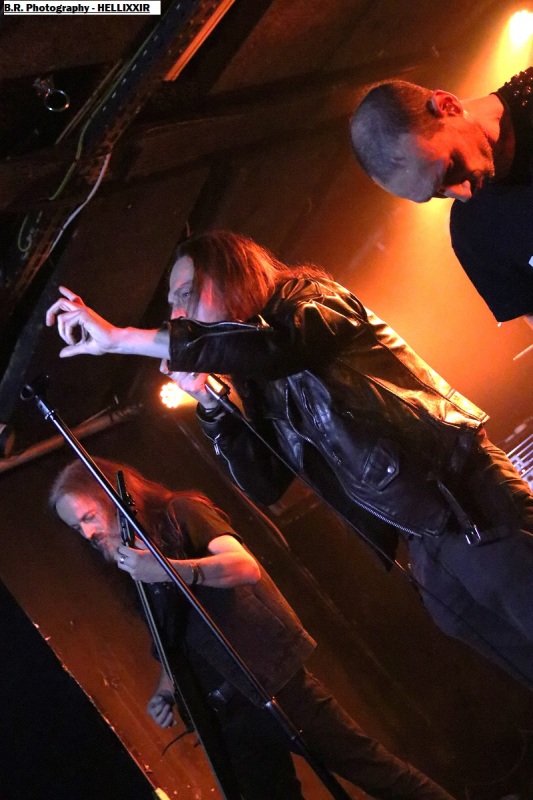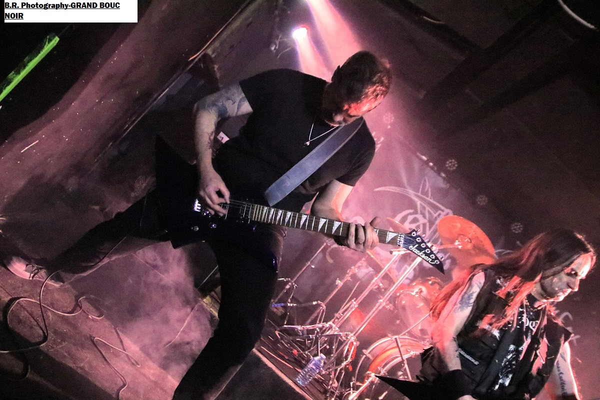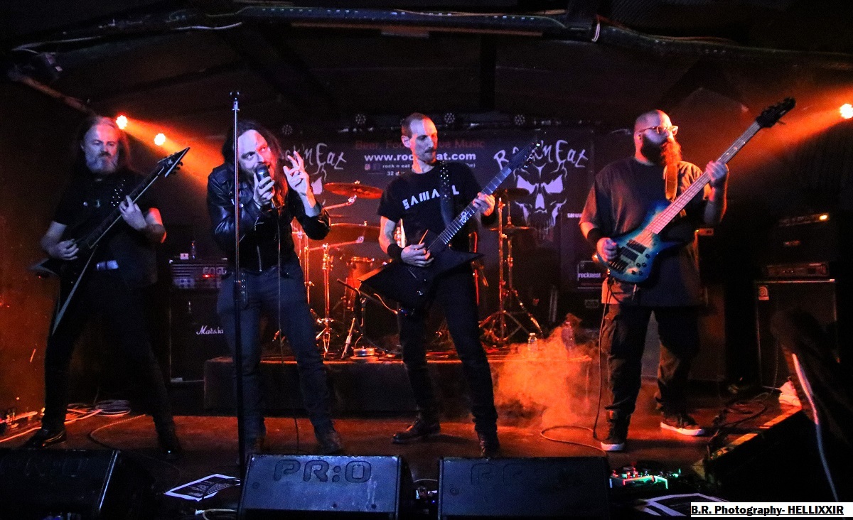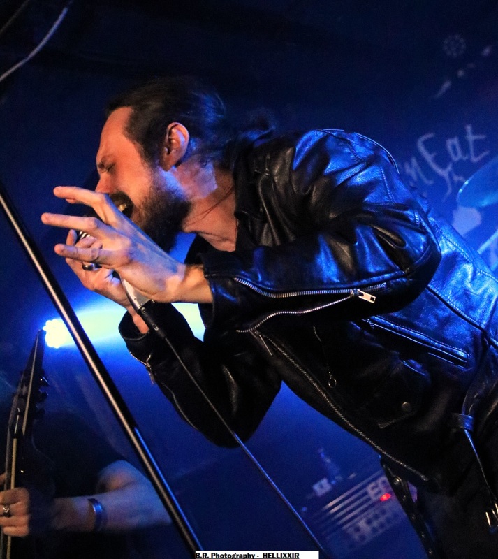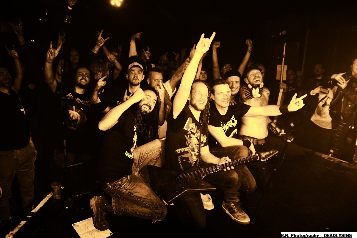 En effet, nous allons déguster dans tous les sens du terme les envois brutaux des Lyonnais de DEADLYSINS et des Grenoblois d'HELLIXXIR et de GRAND BOUC NOIR, alors musique ! Et quelle musique avec les Grenoblois du GRAND BOUC NOIR qui, à l'aide d'un nouveau line-up, nous invite à le suivre sur la route 666 ,avec perte et fracas diabolique. C'est malsain au possible ce mix réussi de thrash/black/death et plus si affinités. Donc, d'entrée de jeu la soirée est bien lancée dès 20heures 30 par ce quatuor qui fait parler la poudre dans une noirceur assumée qui nous prend aux tripes. Alors fatalement nous avons succombé à leur prestation qui en a surprit plus d'un de par cette offrande bien sentie au malin, amen ! Du black/thrash au thrash/black il n'y a qu'un pas que nous franchissons allègrement avec la venue sur scène d'HELLIXXIR originaire de l'Isère voisine qui nous emmènent eux-aussi sur les chemins « tortureux » de leurs compositions complexes et alambiquées. Ici, pas de thrash « rentre dedans », mais un ,thrash faisant la part belle aux tricotages guitaristiques dans des ambiances sombres propres au black-metal. Leur set- list principalement axée sur des titres de leur album de 2019 « The Black Fortress » nous a proposé aussi des compositions extraites de « Corrupted Harmony » de 2012 pour un voyage intemporel dans leur discographie. Malgré un début de set un peu laborieux, Hellixxir a ensuite mis dans sa poche le public du RNE, merci les gars ce fus un plaisir de vous apprécier de nouveau en live ! Les Lyonnais de DEADLYSINS ne sont pas venus ce soir dans notre club préféré pour « sucrer les fraises » mais pour nous présenter leur nouvel album intitulé « Age of Revelation » qui vient de paraître il y a peu de temps chez Adipoocère Records. Release party donc, mais surtout l'envie de ces musiciens burnés au thrash de nous brutaliser les neurones et le cou sur un rythme d'enfer. Avec un glorieux passé à son actif ces inconditionnels du brutal thrash qui tâche semblent vouloir bous rappeler à leur bon souvenir, et ça marche ! Inutile e vous dire que dès le premier envoi le public présent a tout défoncé dans les sous-sols du quai Arloing à Lyon. Si sur album DEADLYSINS nous accroche les neurones et nous donne des fourmis dans tout le corps, sur scène le groupe nous fait bénéficier d'une énergie incomparable et d'une présence thrash »lame de rasoir » sans équivalent dans le style. Alors ce soir dans un RNE en ébullition nos cinq gaillards ont allumé la lanterne rouge clignotante appelée « destruction totale » et envoyé une sauce thrash pimentée et métallique en diable. Et « Zombie », « In Plaise », « Anticlockwise », « Circle Pit », « Fallin' » et autre « Covid 666 » ont fait leur œuvre de destruction massive avant les rappels de rigueur, aargh ! Ce fus géant tout simplement, nous avons adoré, et vous ? Merci aux organisateurs, au Rock n'Eat, au trois formations en lice et bien sûr au public pour l'ambiance instaurée. |