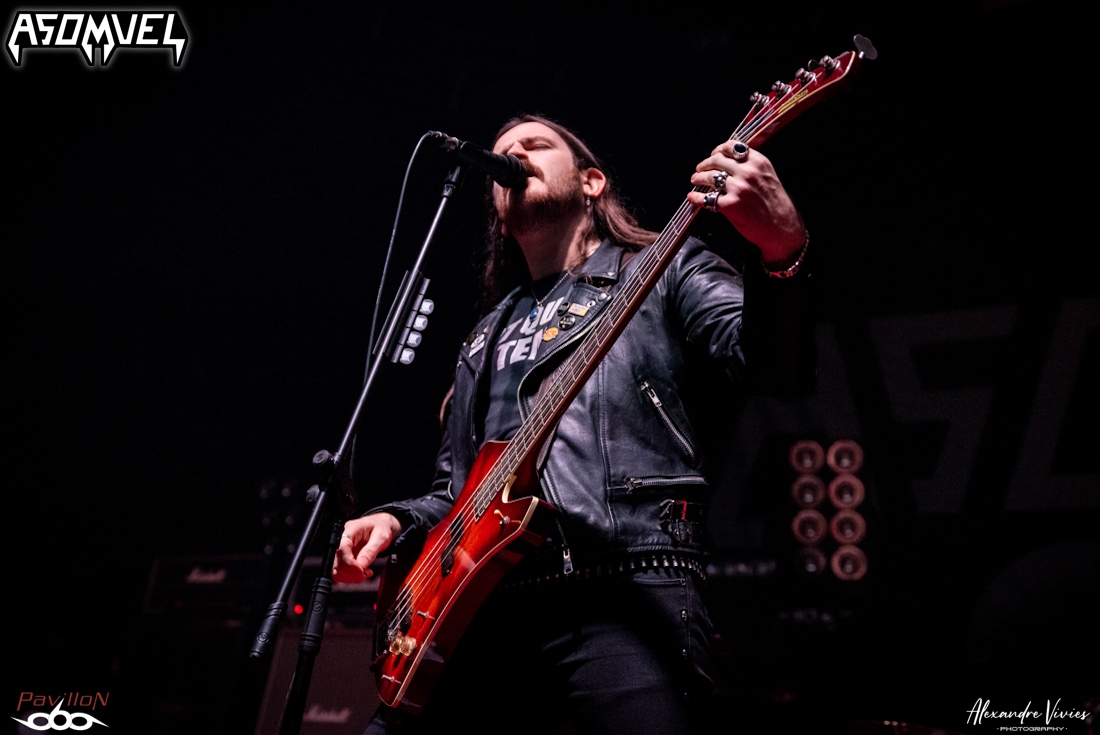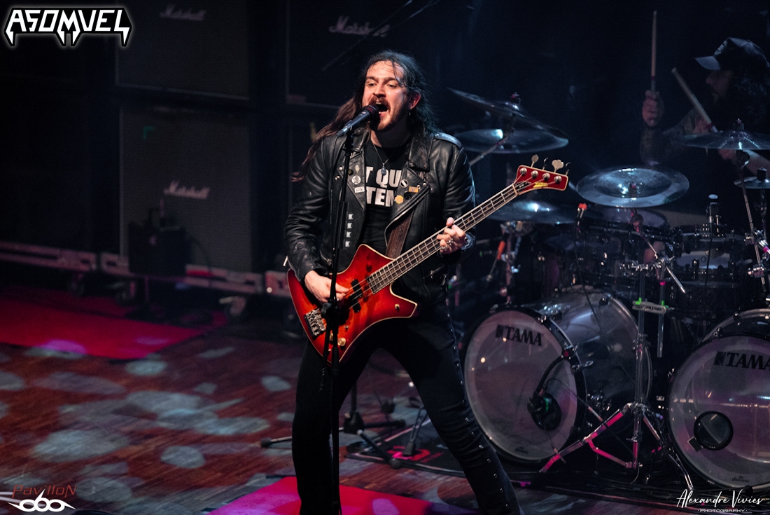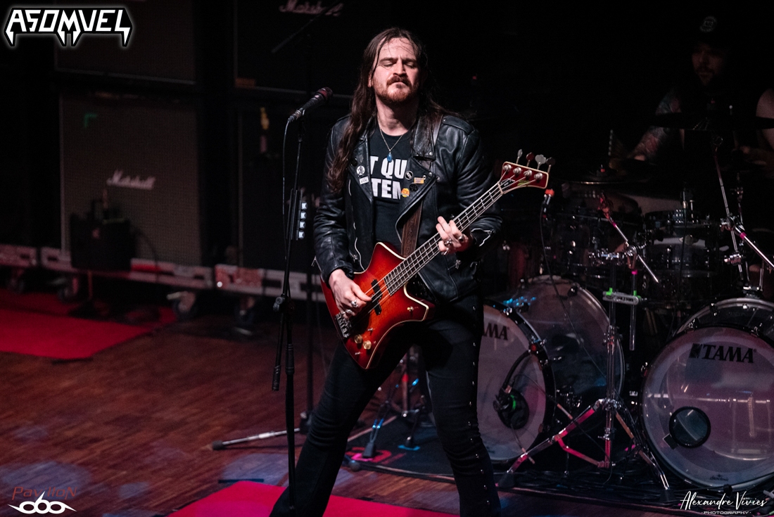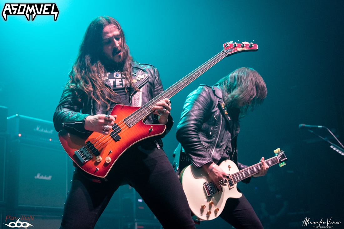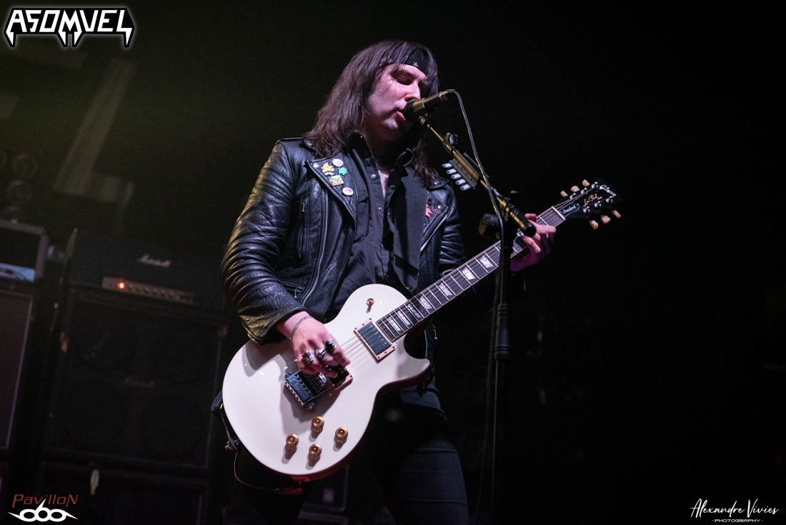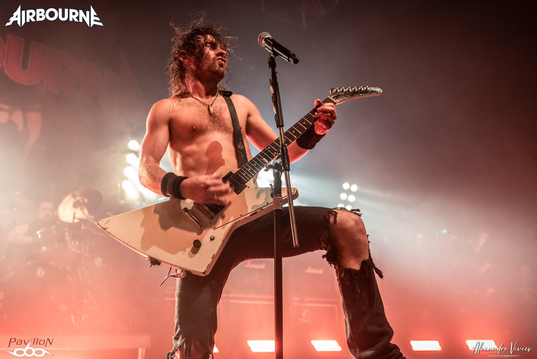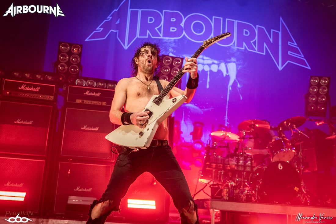 C'est aux britanniques d'Asomvel qu'est confiée la mission de chauffer tout ce beau monde, assoiffé de gros son et qui trépigne d'impatience. Le groupe joue un speed metal à la Motörhead bon pour affoler le compteur de décibels ! Forts de leur nouvel album « Born to Rock’n’Roll » paru l’année dernière et auquel la part belle sera faite ce soir, les quatre musiciens ne mettent pas longtemps à susciter l’adhésion d’un public qui ne demande qu’à se décrasser les oreilles à coups de riffs gras et lourds. On est en plein dans le mille avec ce set hargneux et sans temps mort qui nous fait passer un super moment. Voilà la salle échauffée avec la manière et maintenant prête pour la tête d’affiche du soir ! Setlist Asomvel : - Louder & Louder - Born to Rock’n’Roll - Beware the Full Moon - Payback’s a Bitch - Outside the Law - Into the Fire - Stone Cold Stare - World Shaker - Luck if for Losers - Light ‘Em Up - The Nightmare Ain’t Over C’est dans la joie et la bonne humeur que le public attend l’entrée en scène des Australiens alors que résonnent dans la salle Iron Maiden et autres classiques, dont les refrains repris à tue-tête déclenchent déjà quelques mini pogos et vols de gobelets. La tension monte lorsque les lumières s’éteignent et le show démarre à toute allure avec « Ready to Rock » ! Les musiciens sont, comme à leur habitude, surexcités et bourrés d’énergie ; ça court et ça saute partout, y compris dans la fosse, immédiatement transcendée ! De « Runnin’ Wild » à « Boneshaker » sorti en 2019, tous les albums sont représentés et il n’est laissé place à aucun flottement. La communion avec le public est totale et la sécurité a fort à faire avec les flots de crowdsurfers qui déferlent incessamment vers la scène. Le frontman Joel O’Keeffe honorera sa traditionnelle traversée de la foule à dos de roadie sur « Girls in Black », offrant par la même à ses fans et pour leur plus grand plaisir l’indémodable douche à la bière. Classique, certes, mais toujours du plus bel effet ! Toujours dans le volet rafraichissements, « It’s All for Rock’n’Roll » est l’occasion pour Joel de sortir le « Lemmy’s bar » et la bouteille de Jack pour servir au groupe et au public quelques whisky-cocas en hommage à la légende. Les titres s’enchainent avec une énergie et une bonne humeur toujours intacte, côté musiciens comme côté fans ; c’est une véritable messe du hard rock qui est donnée devant des fidèles en liesse qui entonneront en chœur le fameux riff de « Ready to Rock » alors que le groupe s’éclipse quelques instants, histoire de nous offrir le plaisir de scander un rappel. Et c’est reparti ! « Live It Up » est une dernière occasion d’arroser la foule en faisant voler quelques gobelets à travers la salle sous de festives acclamations, avant de conclure cette superbe soirée avec l’hymne « Runnin’ Wild » et un parterre en délire. Quel concert ! Setlist Airbourne : - Ready to Rock - Too Much, Too Young, Too Fast - Back in the Game - Burnout the Nitro - Girls in Black - Cheap Wine & Cheaper Women - Breakin’ Outta Hell - It’s All for Rock’n’Roll - Stand Up for Rock’n’Roll - Live It Up - Runnin’ Wild Un très grand merci à Éloïse et RIFF X Regarts pour l’organisation du concert et la possibilité donnée de le couvrir, ainsi qu’au Bikini et à ses équipes toujours au top ! |