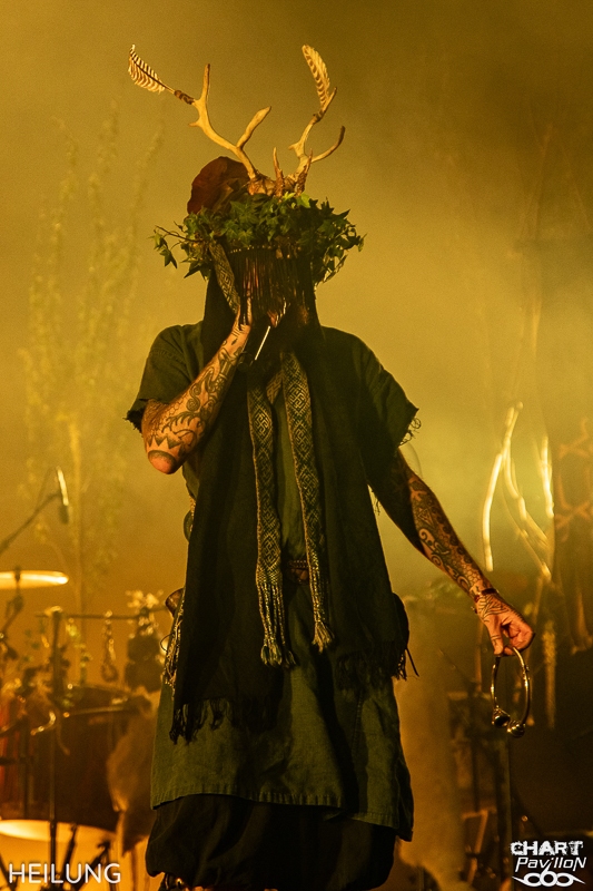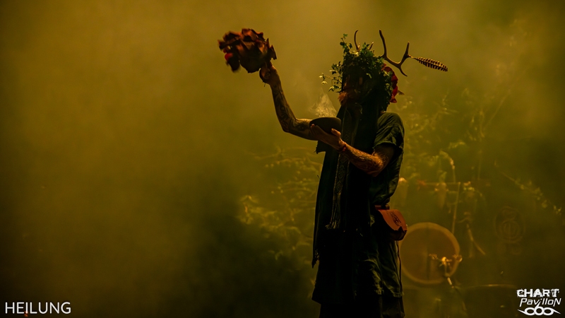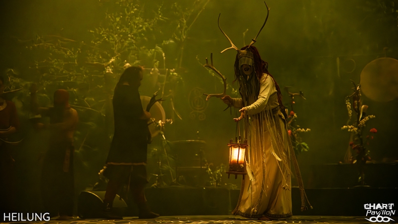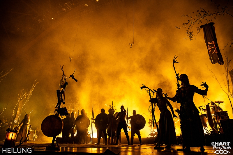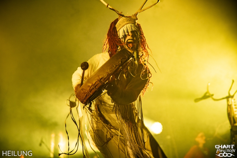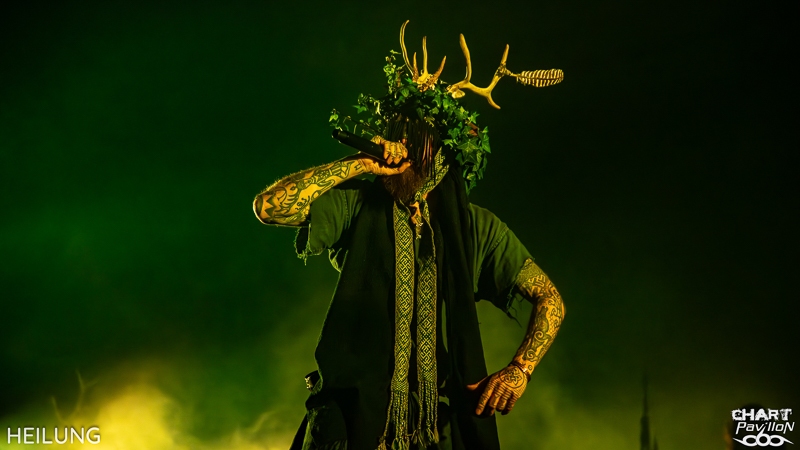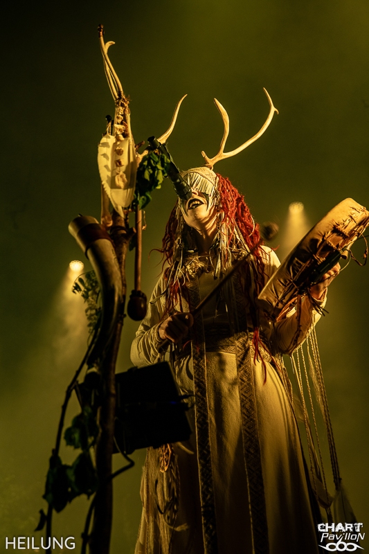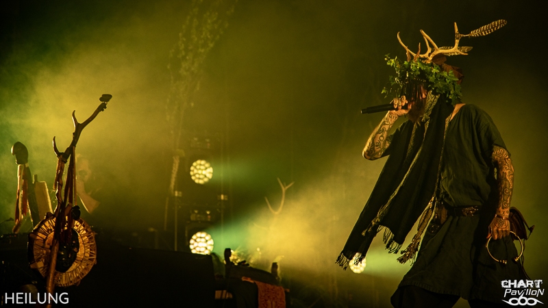 Que dire de HEILUNG ? Cette formation n'est pas comme les autres. Encore mal connu en France, HEILUNG remplit les salles en Allemagne et dans les pays scandinaves mais a encore une certaine tendance à la confidentialité en France. Les initiés sont cependant de plus en plus nombreux, sûrement grâce au bouche-à-oreille suite à des prestations quasiment hallucinogènes. HEILUNG va loin, mais alors très loin et vous emporte avec lui sans aucun problème. L'intro est une véritable cérémonie. Les décors végétaux sont absolument somptueux et il ne manque plus que résonne « In Midjan » pour que s'opère la magie. Et puis bien sûr la présence incroyable de Maria FRANZ au chant et aux percussions vous hypnotise totalement. C'est un set incroyable qui défile devant nos yeux ébahis. La mise en scène avec les guerriers ancestraux, les lumières maîtrisées, le son, le talent de chaque musicien ou chanteur(se) sont tout bonnement au-dessus de tout. Ce groupe allie la technique d'aujourd'hui (son et lumières) à un esprit ancestral et le tout fonctionne comme nulle part ailleurs. Ce groupe est un ovni chamanique qui ne peut laisser personne de marbre, surtout dans de pareilles conditions. On se laisse happer et transporter par « Asja », « Urbani » et tant d'autres jusqu'au dernier titre « Hamrer Hippyer » qui tout bonnement vous mettra en transe comme une partie du public qui semble avoir tout bonnement abandonné l'idée de réalité pour faire corps avec la musique avant que tout cela ne se termine par une cérémonie de clôture.