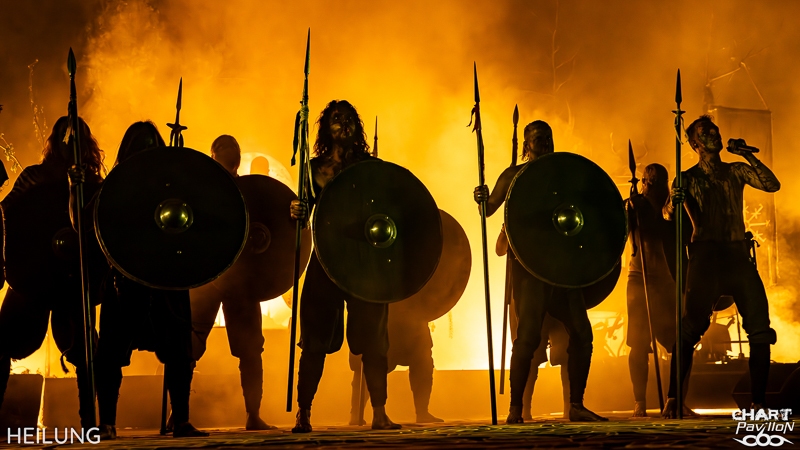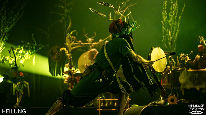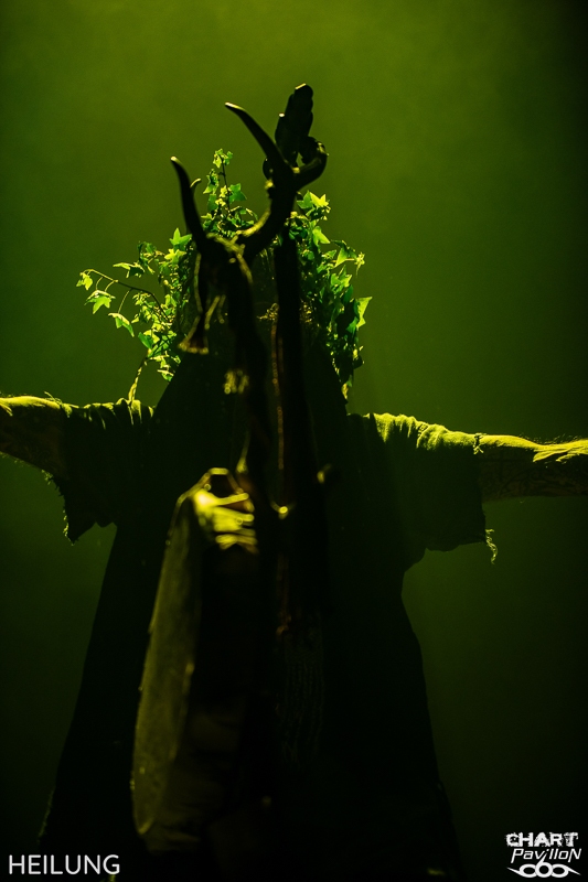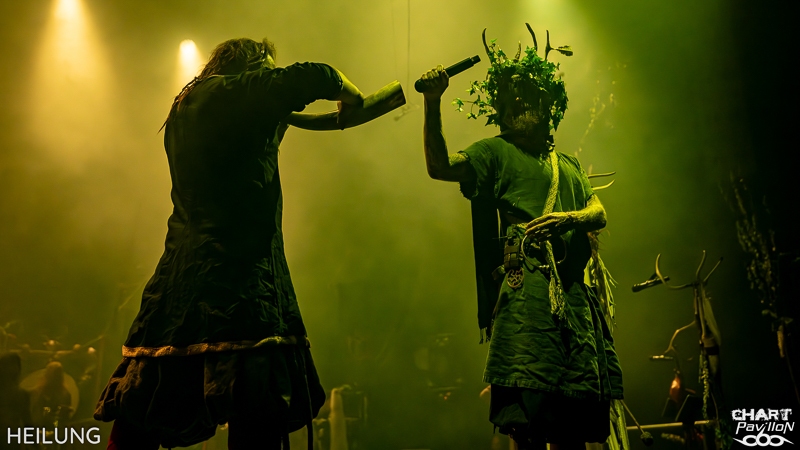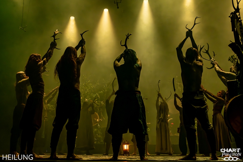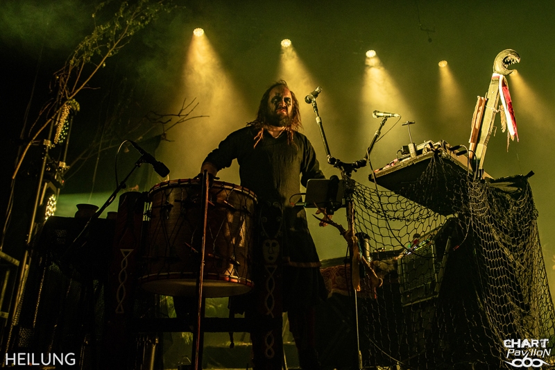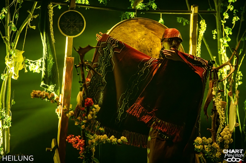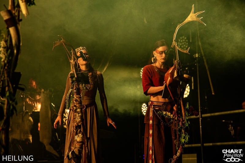 Que dire de HEILUNG ? Cette formation n'est pas comme les autres. Encore mal connu en France, HEILUNG remplit les salles en Allemagne et dans les pays scandinaves mais a encore une certaine tendance à la confidentialité en France. Les initiés sont cependant de plus en plus nombreux, sûrement grâce au bouche-à-oreille suite à des prestations quasiment hallucinogènes. HEILUNG va loin, mais alors très loin et vous emporte avec lui sans aucun problème. L'intro est une véritable cérémonie. Les décors végétaux sont absolument somptueux et il ne manque plus que résonne « In Midjan » pour que s'opère la magie. Et puis bien sûr la présence incroyable de Maria FRANZ au chant et aux percussions vous hypnotise totalement. C'est un set incroyable qui défile devant nos yeux ébahis. La mise en scène avec les guerriers ancestraux, les lumières maîtrisées, le son, le talent de chaque musicien ou chanteur(se) sont tout bonnement au-dessus de tout. Ce groupe allie la technique d'aujourd'hui (son et lumières) à un esprit ancestral et le tout fonctionne comme nulle part ailleurs. Ce groupe est un ovni chamanique qui ne peut laisser personne de marbre, surtout dans de pareilles conditions. On se laisse happer et transporter par « Asja », « Urbani » et tant d'autres jusqu'au dernier titre « Hamrer Hippyer » qui tout bonnement vous mettra en transe comme une partie du public qui semble avoir tout bonnement abandonné l'idée de réalité pour faire corps avec la musique avant que tout cela ne se termine par une cérémonie de clôture.