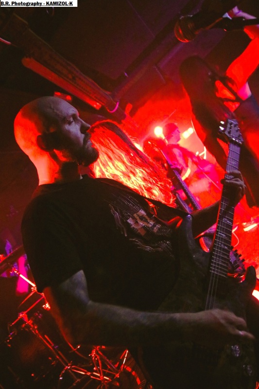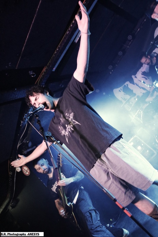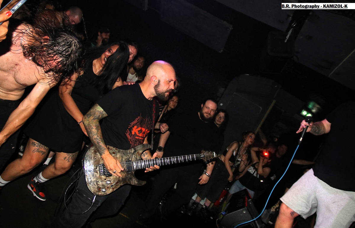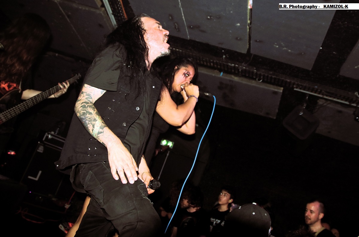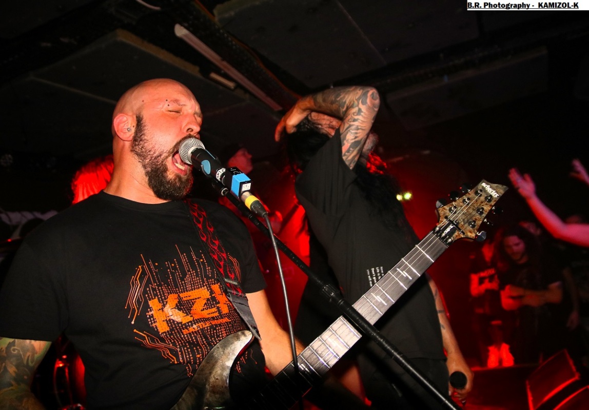 Alors, dégustation ce soir dès 20 heures 30 dans les sous-sols du quai Arloing où la chaleur et la sueur seront de mise durant le repas naturellement ! ANESYS nous propose un death-metal plutot alambiqué alternant le sucré et le salé, l\'ambiance calme et les débordements bruts de décoffrage bien speed. Bien sûr nos amis Rochellois sont venus afin de promouvoir leur nouvel enregistrement intitulé « Ice Age », un album qui nous offre toute la palette de leurs possibilités créatives. Et en live le rendu est à la hauteur de leurs ambitions. Objectif donc, varier les plaisirs en se faisant plaisir, en nous proposant du groove, des ambiances planantes sombres et émotives suivies de déferlantes sauvages à l’envi. Bref, ce groupe a marqué des points ce soir rien qu\'à voir l\'activité d\'un public déjà bien agité, ça promet . La tension va encore monter d\'un cran avec les Bourguignons de DEATH DECLINE qui vont nous faire monter la moutarde au nez (facile celle-là!). En effet les Dijonnais ne sont pas venue ce soir à Lyon pour nous offrir un menu fade, sans aucune saveur mais pour nous faire avaler leur thrash- death bien épicé. Avec eux, ça passe ou ça casse, mais au bout du compte ça passe très bien avec leur mix enragé de thrash, de death, voire de, heavy metaaal. Le public ne s\'y trompe pas en noyant la piste et la scène en balançant dans son agitation ses boissons houblonnées. Ce groupe n\'est pas né de la dernière pluie metal qui tâche et avec sous leurs bras une discographie importante, dont le petit dernier « Pattern of An Imminent Collapse » il va nous envoyer en continu des tartes dans la « g...le » mais avec doigté SVP. Le groupe voulait nous faire remuer donc et ce fus un pari gagné ce soir ! Du death au hardcore il n\'y a qu\'un pas que nous franchissons allègrement avec la venue de lyonnais de KAMIZOL-K Alors en guise d\'intro nous dirons que là où Kalizol-K passe l\'herbe ne repousse pas, c\'est tout ce que j\'ai trouvé pour vous dire que ce soir leur live fut remarquable en diable. Ils sont venus gentiment nous présenter leur nouvel album \'Diary » à pataitre le 27 Juin prochain et ce soir dans l\'attente du set le public piaffait d\'impatience lors des derniers réglages techniques, c\'était le calme avant l\'orage car dès le premier titre « Battle Royal le public, déjà chaud comme la braise, s\'est envoyé en l\'aire sous les coups de boutoir hardcore prodigués par le sextette. Alors, de titre en titre la tension est encore montée d\'un cran, le duo chant féminin, chant masculin accompagné de musiciens au top niveau nous ont détruit ce qu\'il restait de nos neurones Et ce jusqu\'au dernier titre, le fameux « Get Away » avec les rôles inversés, public sur scène et musiciens dans la fosse pour une fin de set conviviale et un brin chaotique, quelle claque, le Rock n\'Eat n\'en revient toujours pas, amen ! Merci donc au Rock n\'Eat et à tous, les musiciens qui ont foulé la scène de Vaise-City pour une soirée apocalyptique dont on se souviendra encore longtemp |