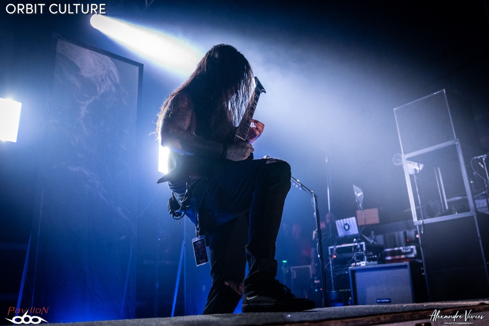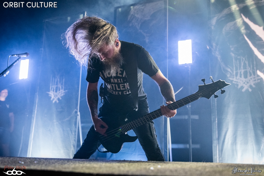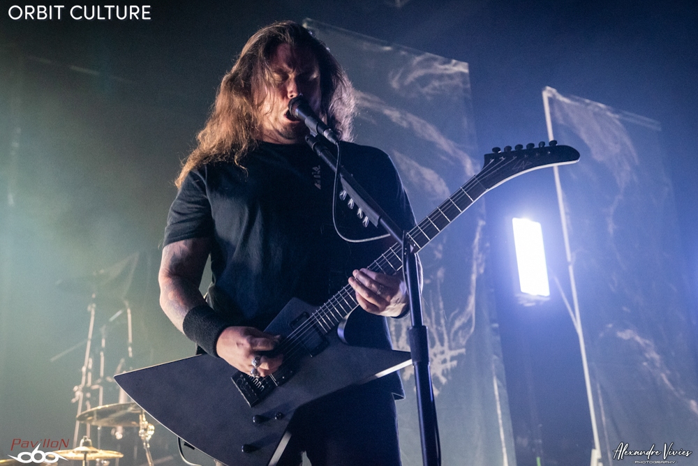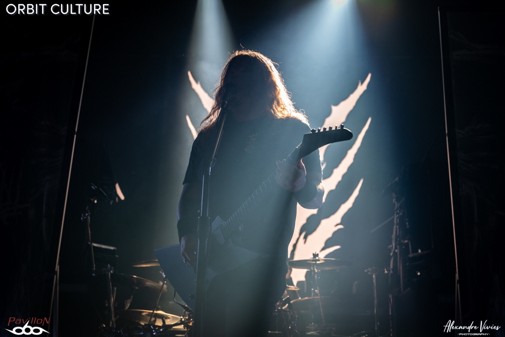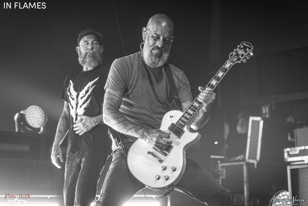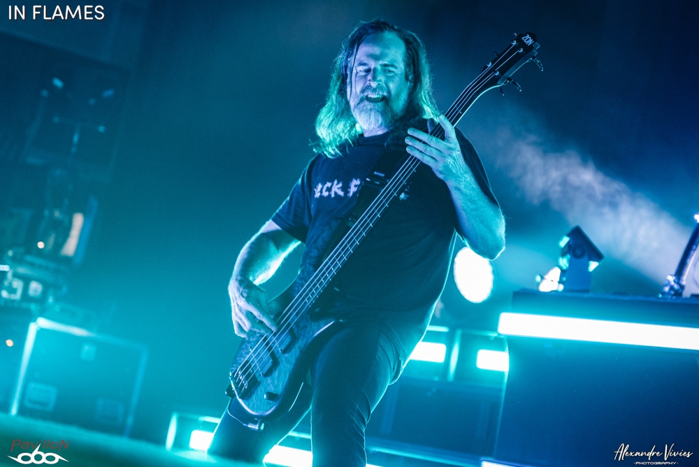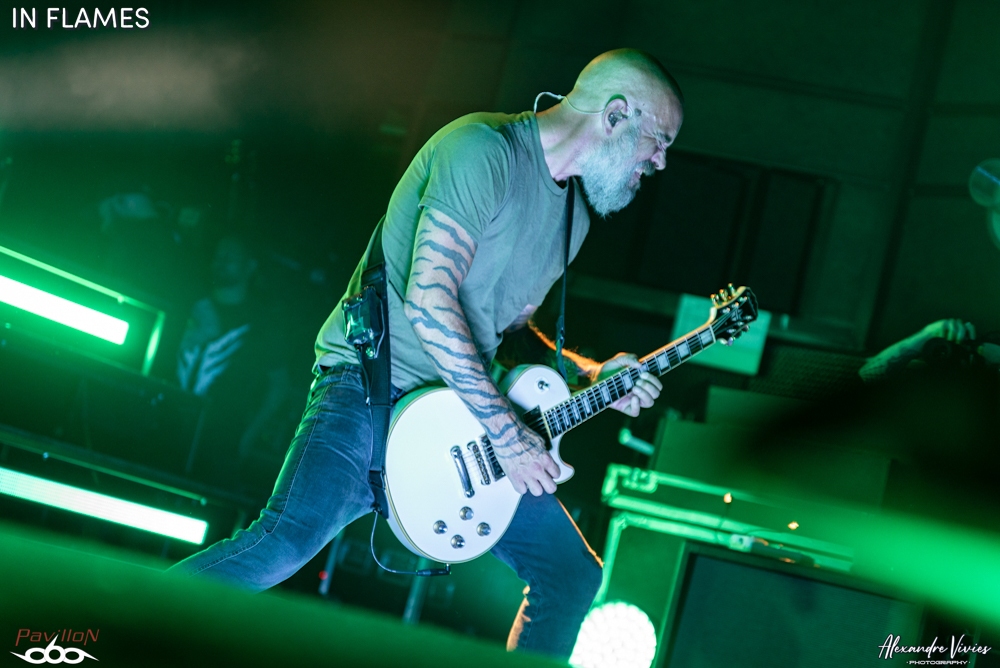 C’est aux excellents ORBIT CULTURE qu’est donné l’honneur d’ouvrir le bal dans un Bikini déjà très bien rempli. Fondé en 2013 et fort de quatre albums, le groupe, qui cite Gojira et Metallica parmi ses plus grandes influences, propose un death mélodique aussi lourd que percutant et ne tarde pas à accrocher la foule avec ses riffs à la fois puissants et groovy, particulièrement efficaces. Le chanteur Niklas Karlsson est impressionnant de présence et de maîtrise, tout aussi bon sur sa voix claire, qui n’est justement pas sans rappeler le chant d’un certain James Hetfield, que sur ses growls. Il fait chaud, très chaud, et la performance des Suédois ne laisse aucun répit à la fosse transcendée. Entre circle pits et walls of death, les corps sont mis à l’épreuve mais l’intensité ambiante, alimentée par la monstrueuse prestation du quatuor, ne baissera pas d’un iota jusqu’à la fin du show. Première partie oblige, le concert passe bien trop vite tant ORBIT CULTURE frappe fort et, s’il tient déjà une petite réputation, le groupe prouve ce soir qu’il n’est pas prêt de ralentir son ascension ! Setlist ORBIT CULTURE : - The Tales of War - North Star of Nija - From the Inside - Alienated - While We Serve - Death Above Life - Vultures of North Le public est bouillant alors qu’IN FLAMES s’apprête à faire son entrée. Voilà six ans que le groupe n’avait pas foulé nos terres toulousaines et il ne fait nul doute que ce concert était très attendu par les fans présents ce soir. Défendant son très bon dernier album « Foregone », le combo de Göteborg compte bien en mettre plein les yeux et les oreilles à un Bikini plein à craquer ! Les musiciens semblent en grande forme et sont, pour notre plus grand plaisir, particulièrement communicatifs. La foule s’embrase immédiatement sur l’incontournable « Pinball Map » et, dès l’instant où nous autres photographes quitterons le pit photo à l’entame d’« In the Dark », le flux de crowdsurfers s’échouant à la barrière sera presque ininterrompu ! Le morceau, issu du dernier-né du groupe, fait tout comme « State of Slow Decay » son petit effet, mais de « Foregone », ce sera bien la déjà culte « Meet Your Maker » qui soulèvera le mieux tout le beau monde déchaîné en fosse. Nous profitons de quelques échanges entre deux chansons avec Anders Fridén pour reprendre un peu de souffle, mais l’ambiance ne retombe jamais. Le plaisir que prend le groupe à jouer lui est bien rendu par le public aux anges et, là encore, le set de dix-sept titres semble passer en quelques minutes tant chacun s’amuse. La sécurité a fort à faire mais veille remarquablement, distribuant même de nombreuses bouteilles d’eau aux premiers rangs, particulièrement suffocants. IN FLAMES signe une performance des grands soirs et terminera de mettre les fans KO avec le terrible enchaînement « I Am Above » - « Take This Life » - « My Sweet Shadow ». Que la soirée fût belle et que la Suède continue de prouver qu’elle règne sur le genre qui a fait sa renommée : peut-être déjà la soirée death mélodique toulousaine de l’année ! Setlist IN FLAMES : - Pinball Map - The Great Deceiver - Deliver Us - In the Dark - Voices - Coerced Coexistence - Cloud Connected - Trigger - Only for the Weak - Meet Your Maker - The Quiet Place - State of Slow Decay - Alias - The Mirror’s Truth - I Am Above - Take This Life - My Sweet Shadow Un très grand merci à Regarts pour l’organisation de cette date et pour la possibilité donnée de la couvrir, ainsi qu’à toutes les équipes du Bikini, au top comme à leur habitude ! |