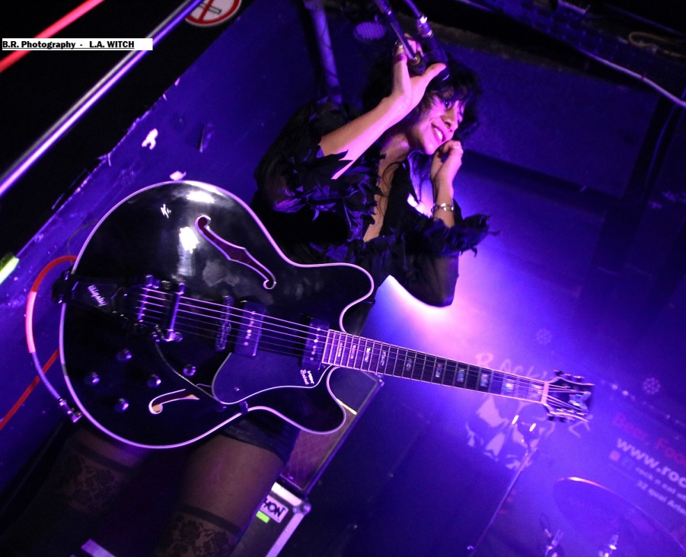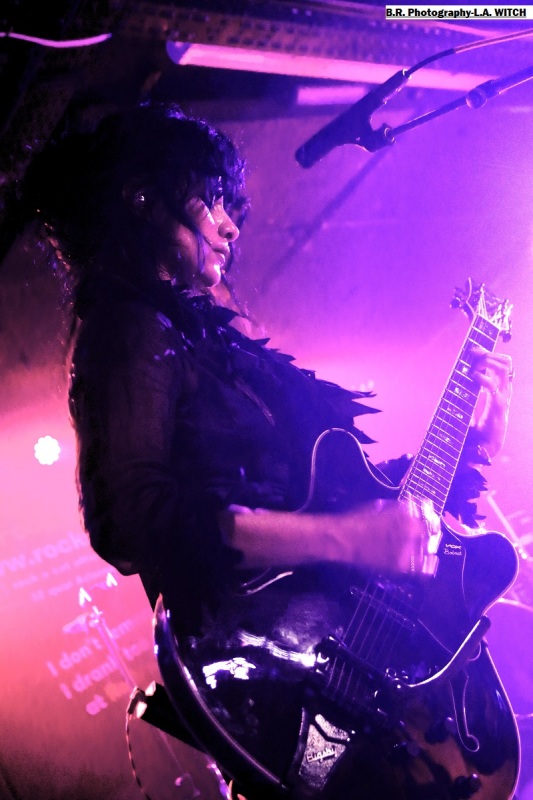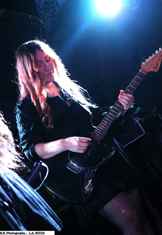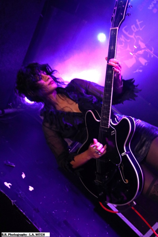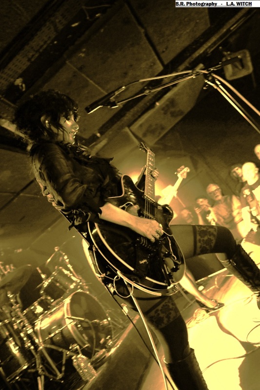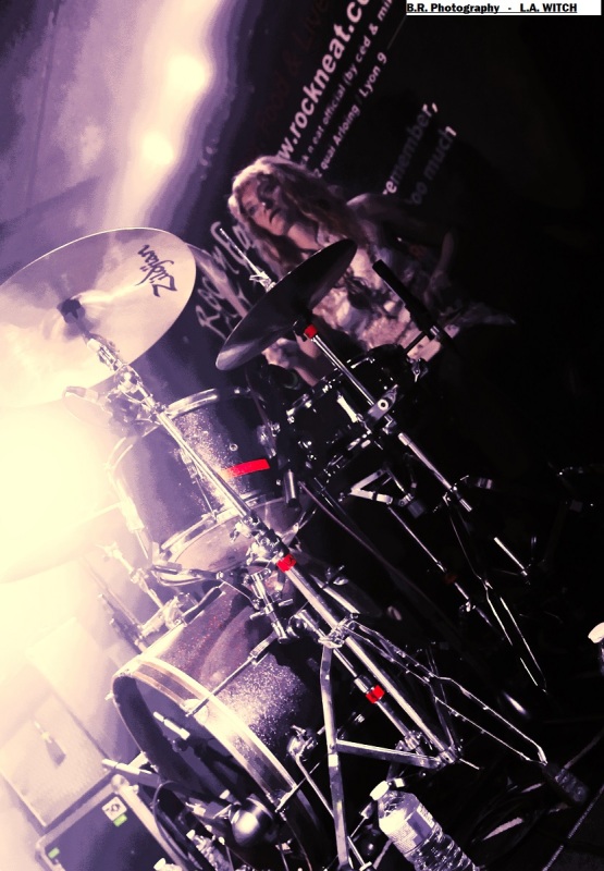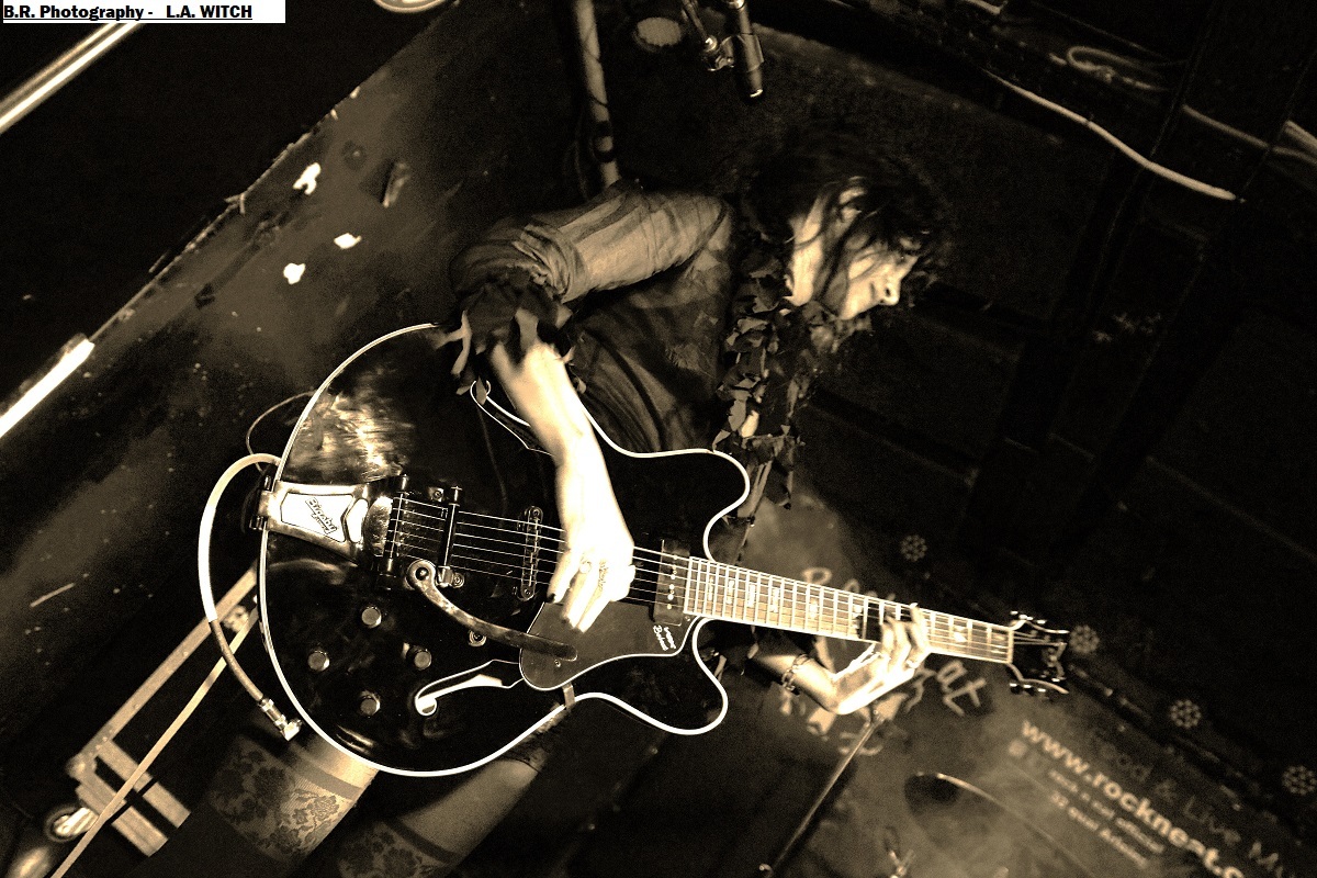 Avec « one two three » FROM KITTENS TO LIONS démarre fort la soirée à l'aide d'un binaire en folie, il est 20 heures 30 et la soirée s’annonce intéressante. Alors, est-ce de l'alternative rock, du garage rock ou bien de l'indie rock ? Eh bien c'est tout simplement du « rock & roar » comme les deux filles aiment à appeler, leur démarche. La guitare miaule, la batterie ne faiblit pas et les vocaux font « tilt », quelle énergie, on a aimé tout simplement ce « female rock band ». Allez, on se presse un peu plus contre la scène dans l'attente de la venue du trio, quatuor ce soir, de Los Angeles L.A. WITCH. Les filles nous rendent visite en France actuellement et ce soir ce sera Lyon donc afin de nous présenter leur nouvel album intitulé « Doggod », mais pas que ! Avec un look d'enfer (normal pour ces sorcières), ces filles nous font progressivement entrer dans leur jeu, dans leur monde mystique aux dérives krautrock et aux envies punk/new wave. La guitare se joue de nous avec des effets virevoltants, la voix reste suave mais bien « cold » pour un certain romantisme noir exacerbé. Et si parfois le groupe flirte avec le stoner psyché d'anthologie avec une basse omniprésente sortie du désert rock, force est de constater que L.A Witch entre dans une phase plus mélancolique avec leur nouvel album. Alors on adhère forcément à cette mélancolie ponctuée de soubresauts plus marqués avec à certains moments des nappes de clavier nous montrant un chemin bien obscur. L.A. Witch se démarque donc d'une scène rock au sens large du terme afin de nous inoculer sa (ses) différences et ce fus ce soir un moment particulièrement intense remplit d»'émotion passé en leur compagnie, amen ! Merci au Rock n'Eat pour cette soirée pas comme les autres et bien sur merci aux musiciennes qui nous ont démontré ce soir que le rock pouvait se réinventer sans cesse ! |