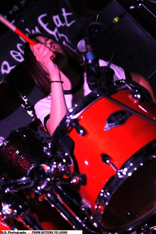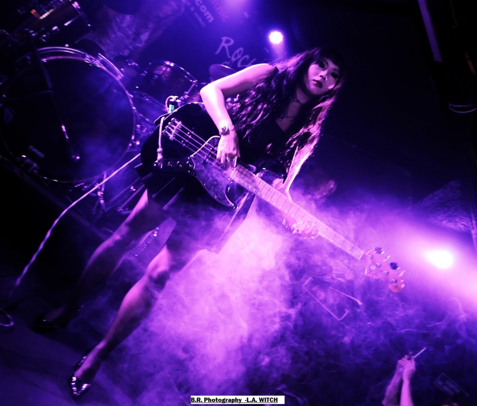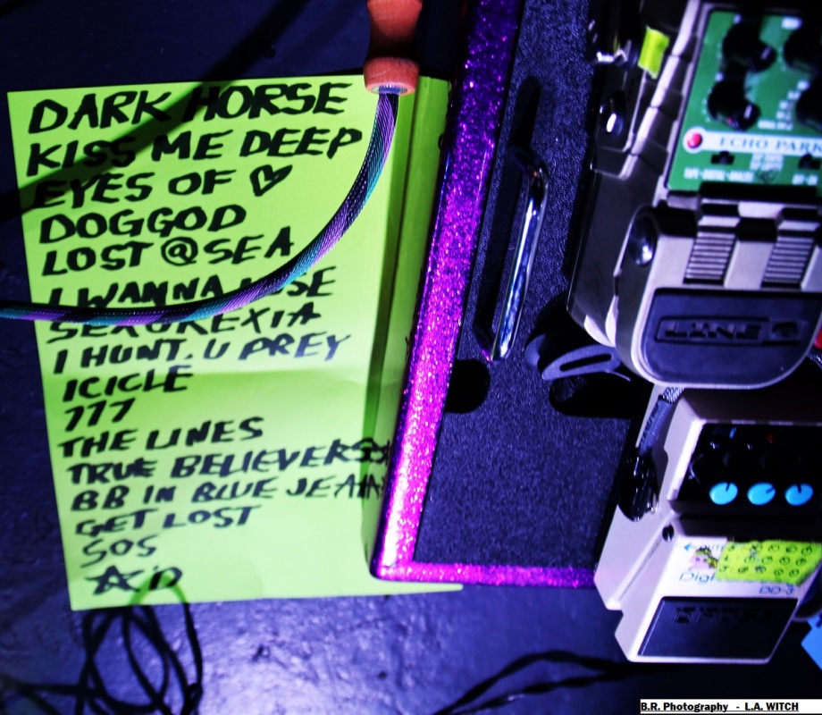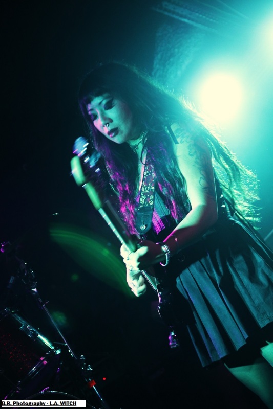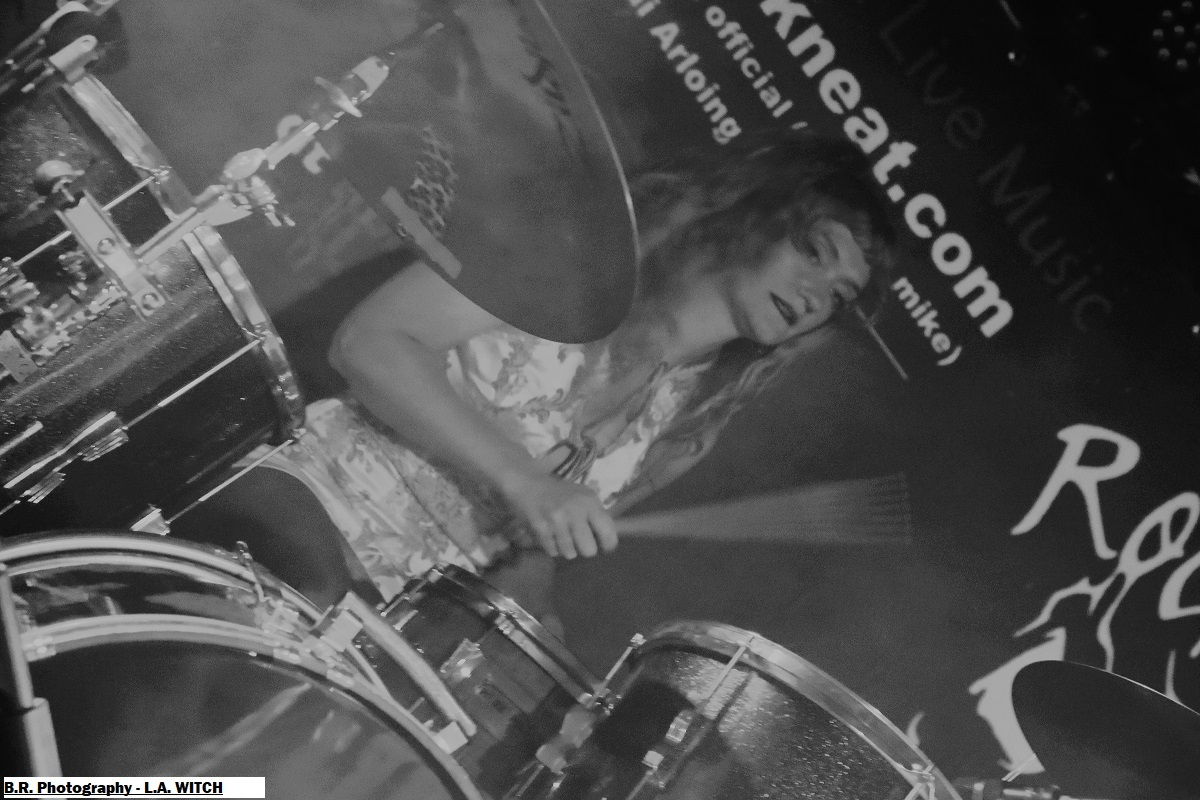 Avec « one two three » FROM KITTENS TO LIONS démarre fort la soirée à l'aide d'un binaire en folie, il est 20 heures 30 et la soirée s’annonce intéressante. Alors, est-ce de l'alternative rock, du garage rock ou bien de l'indie rock ? Eh bien c'est tout simplement du « rock & roar » comme les deux filles aiment à appeler, leur démarche. La guitare miaule, la batterie ne faiblit pas et les vocaux font « tilt », quelle énergie, on a aimé tout simplement ce « female rock band ». Allez, on se presse un peu plus contre la scène dans l'attente de la venue du trio, quatuor ce soir, de Los Angeles L.A. WITCH. Les filles nous rendent visite en France actuellement et ce soir ce sera Lyon donc afin de nous présenter leur nouvel album intitulé « Doggod », mais pas que ! Avec un look d'enfer (normal pour ces sorcières), ces filles nous font progressivement entrer dans leur jeu, dans leur monde mystique aux dérives krautrock et aux envies punk/new wave. La guitare se joue de nous avec des effets virevoltants, la voix reste suave mais bien « cold » pour un certain romantisme noir exacerbé. Et si parfois le groupe flirte avec le stoner psyché d'anthologie avec une basse omniprésente sortie du désert rock, force est de constater que L.A Witch entre dans une phase plus mélancolique avec leur nouvel album. Alors on adhère forcément à cette mélancolie ponctuée de soubresauts plus marqués avec à certains moments des nappes de clavier nous montrant un chemin bien obscur. L.A. Witch se démarque donc d'une scène rock au sens large du terme afin de nous inoculer sa (ses) différences et ce fus ce soir un moment particulièrement intense remplit d»'émotion passé en leur compagnie, amen ! Merci au Rock n'Eat pour cette soirée pas comme les autres et bien sur merci aux musiciennes qui nous ont démontré ce soir que le rock pouvait se réinventer sans cesse ! |