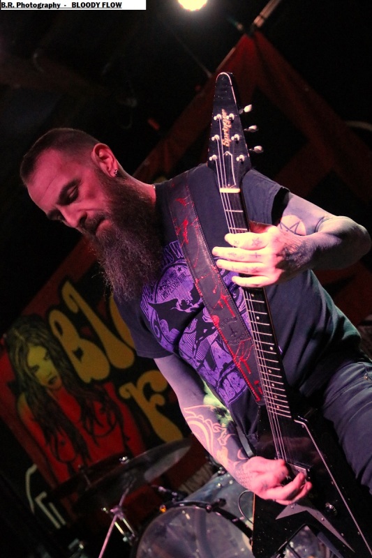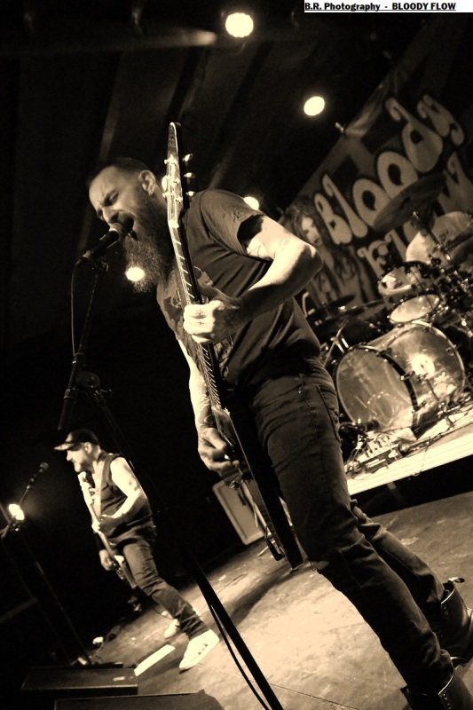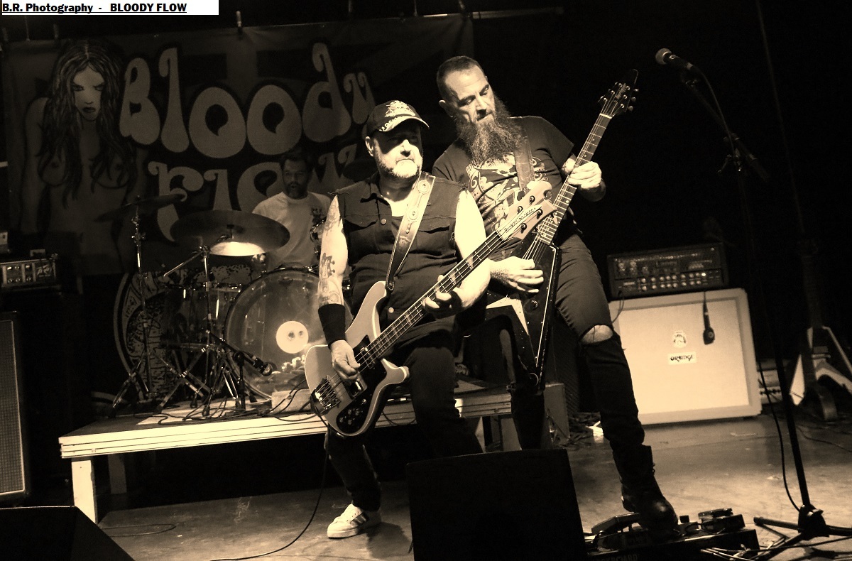 Dès 20heures 15, ceux de BLOODY FLOW lancent les débats, des débats musclés avec la puissance d'un Rock n'Roll implacable comme l'annonce ce premier titre interprété en ouverture de leur set. Un set brûlant comme un stoner venu du désert qui nous est proposé par ce power-trio cherchant sa voie entre blues-rock, heavy-metal et plus si affinités.
